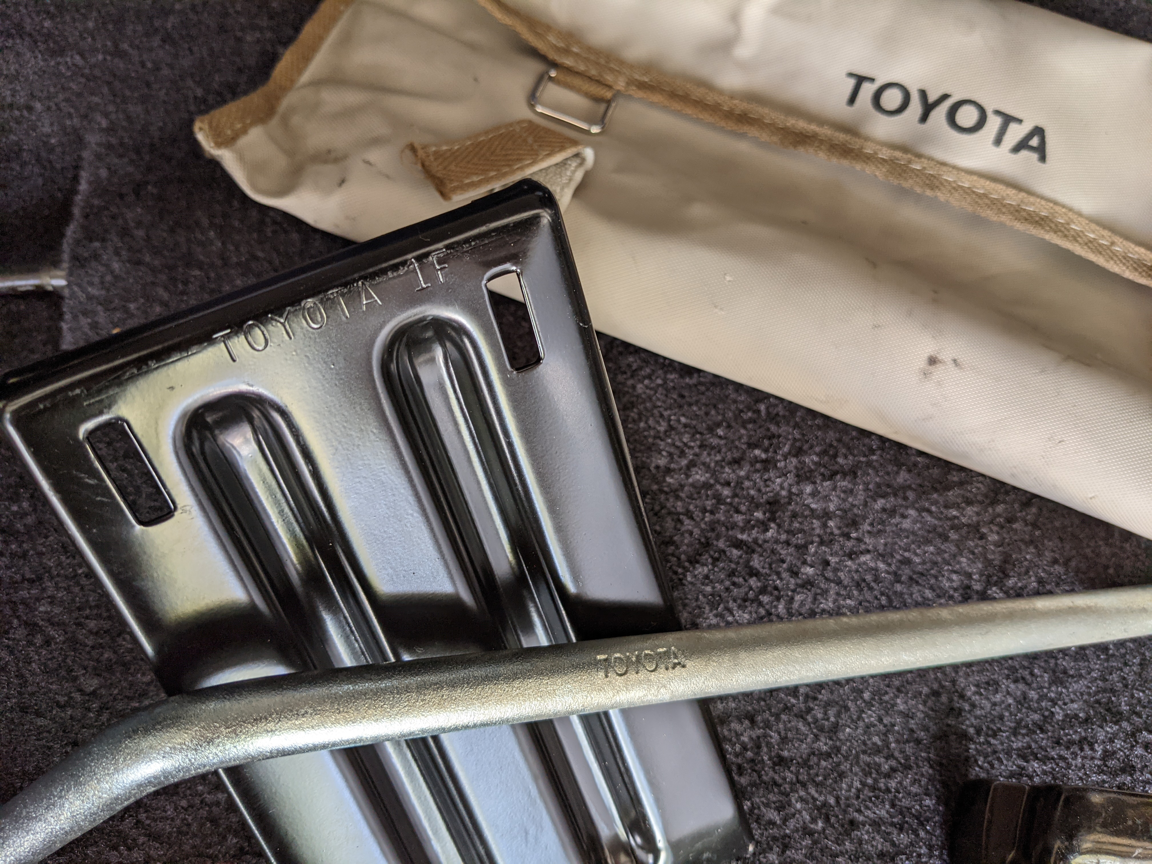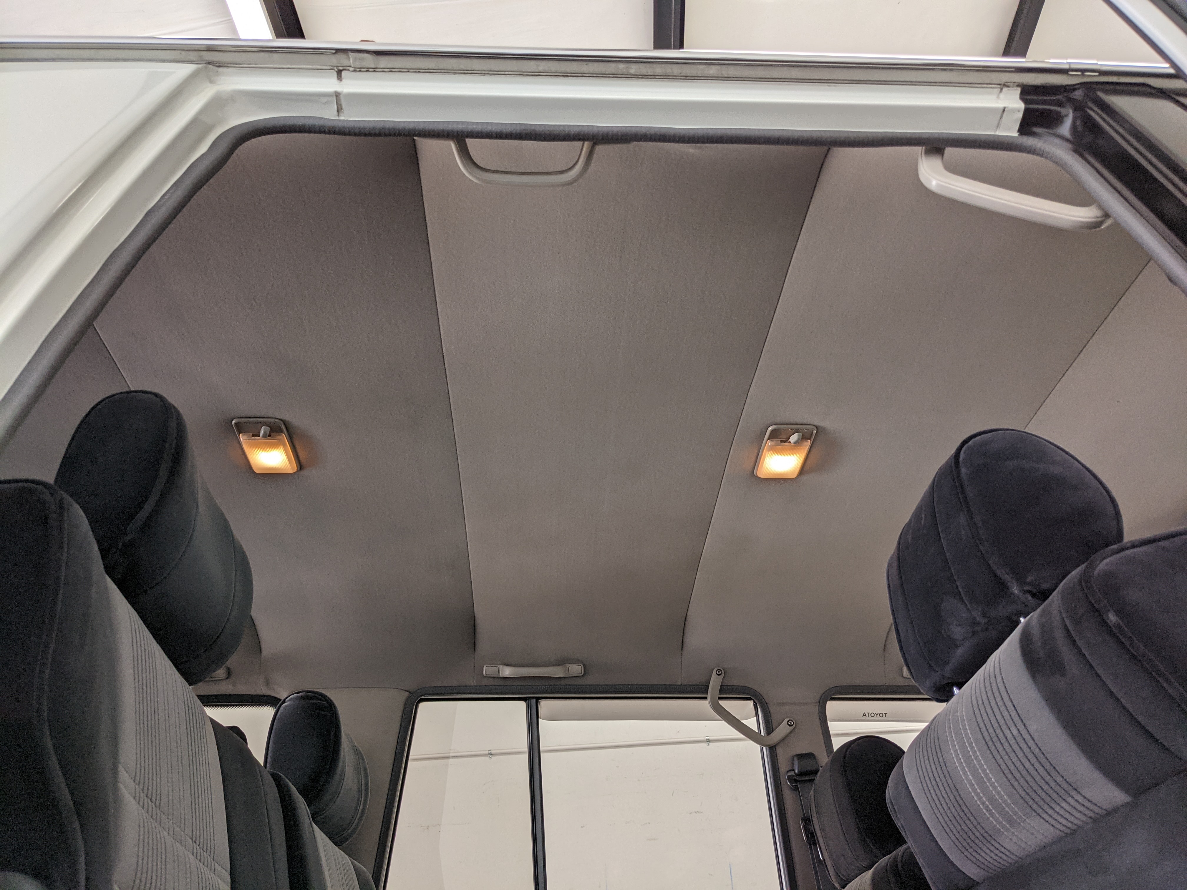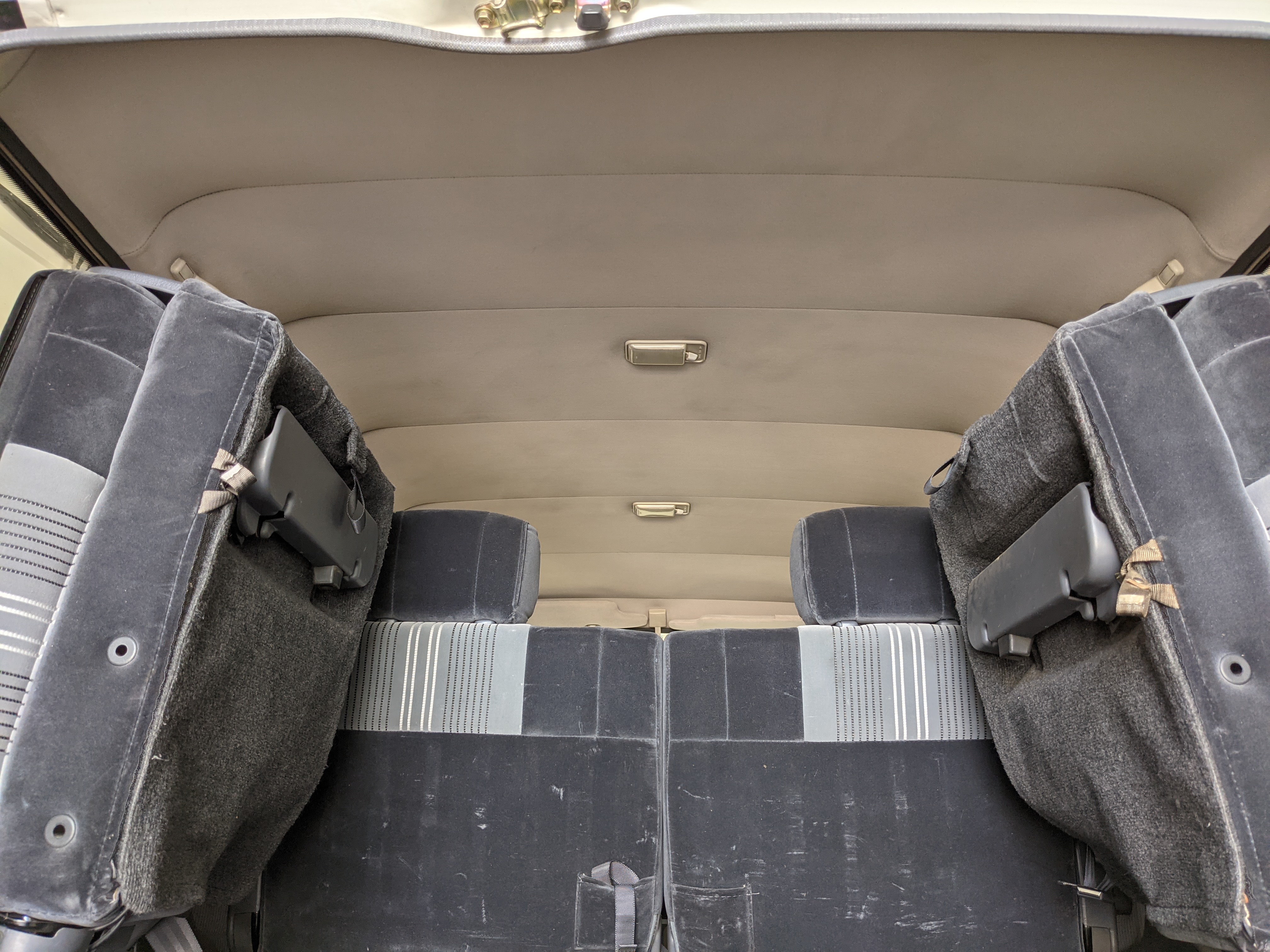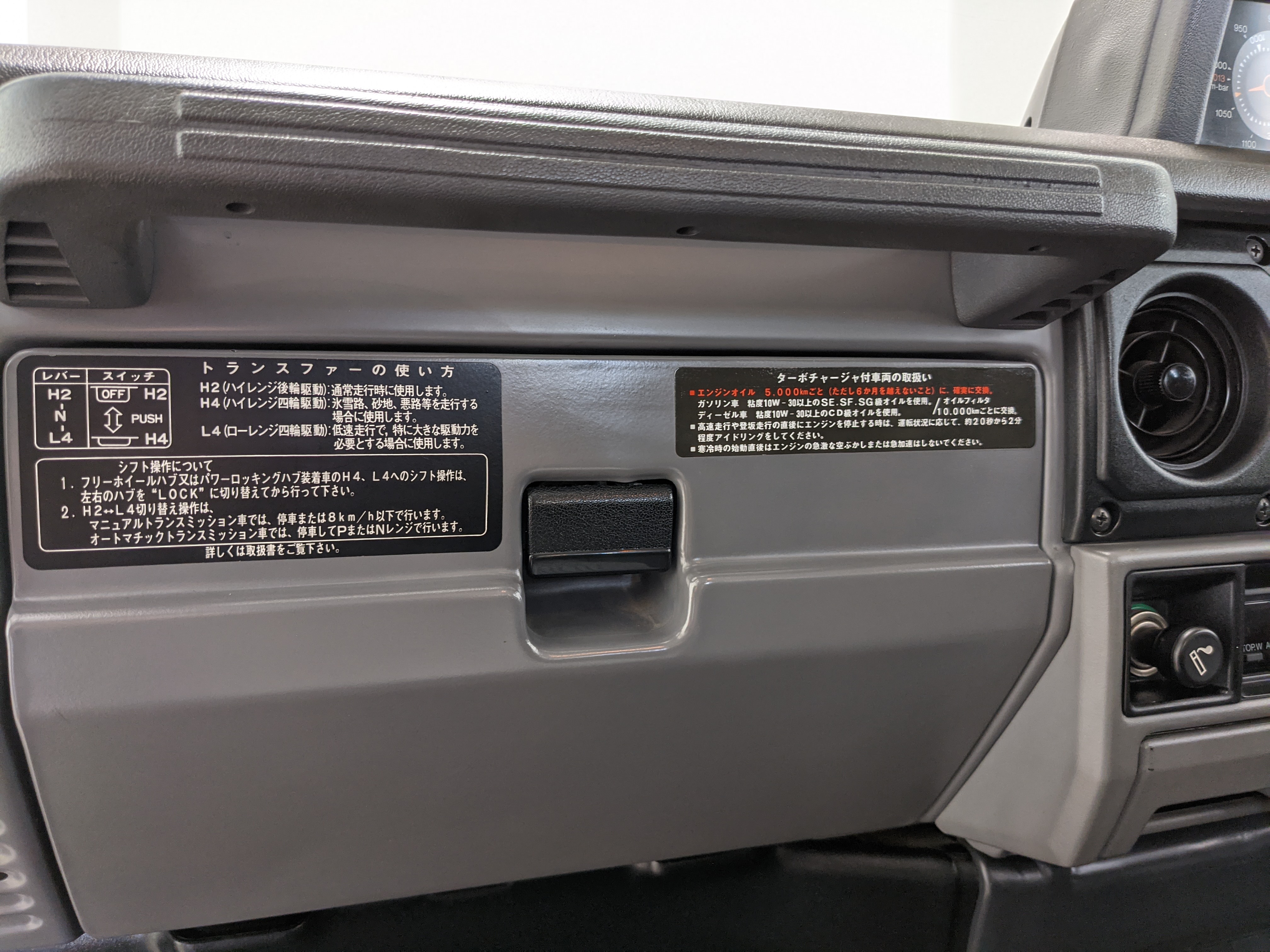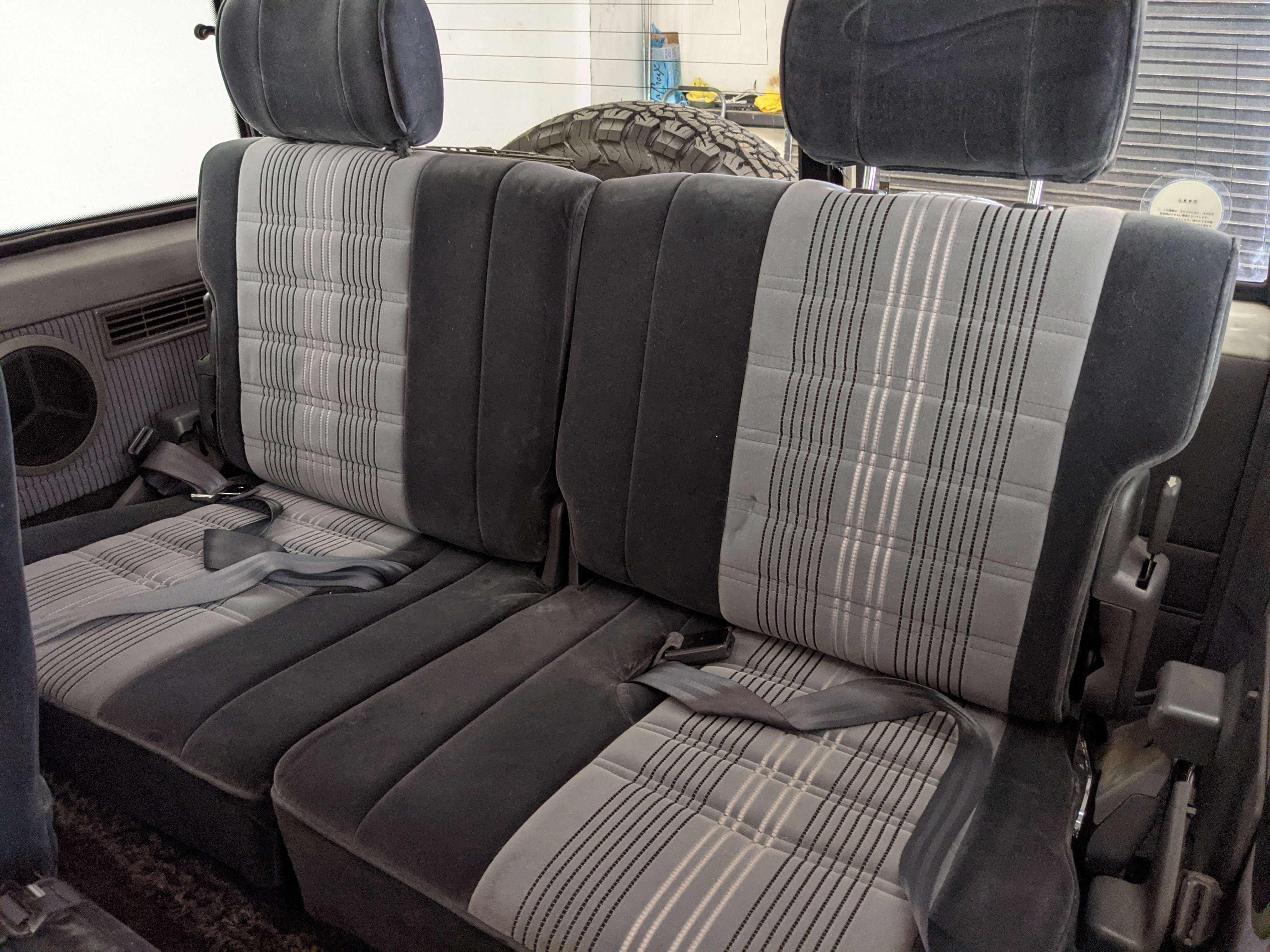 Inside is clean, comfortable and functional. Power windows, air conditioning, turbo emblazoned headrests, and perhaps the most important, the 5 speed manual transmission and the 3 pedals. On the center dash is a unique altimeter/thermometer combo telling you how high up you are, along with the interior and exterior temperatures in celsius. All the original instruction stickers are still here as well. Dash is not cracked or warped at all, door cards are clean and free of stains, rips or wear of any kind. Driver’s seat has a small tear where the seat piping is poking through. Rear seats are perfect, as are the third row seats. Everything functions as it should, glass has no chips or scratches. All switches work, lights and gauges function correctly. Included is the complete Toyota tool kit which includes a Toyota bottle jack and assorted wrenches, center cap removing and center cap applying tools, and a Toyota-branded foldable metal wheel chuck, tucked into a Toyota tool bag.