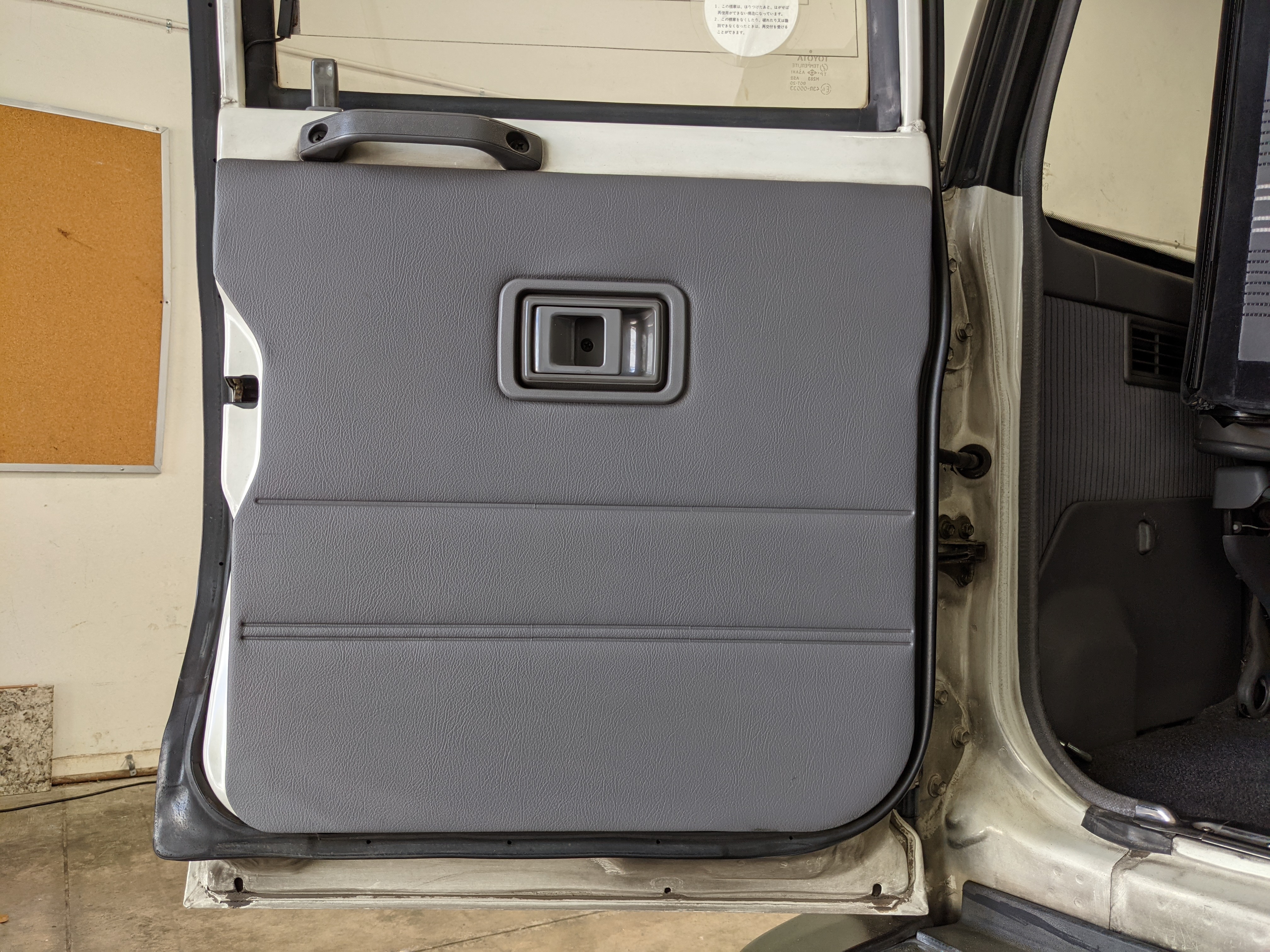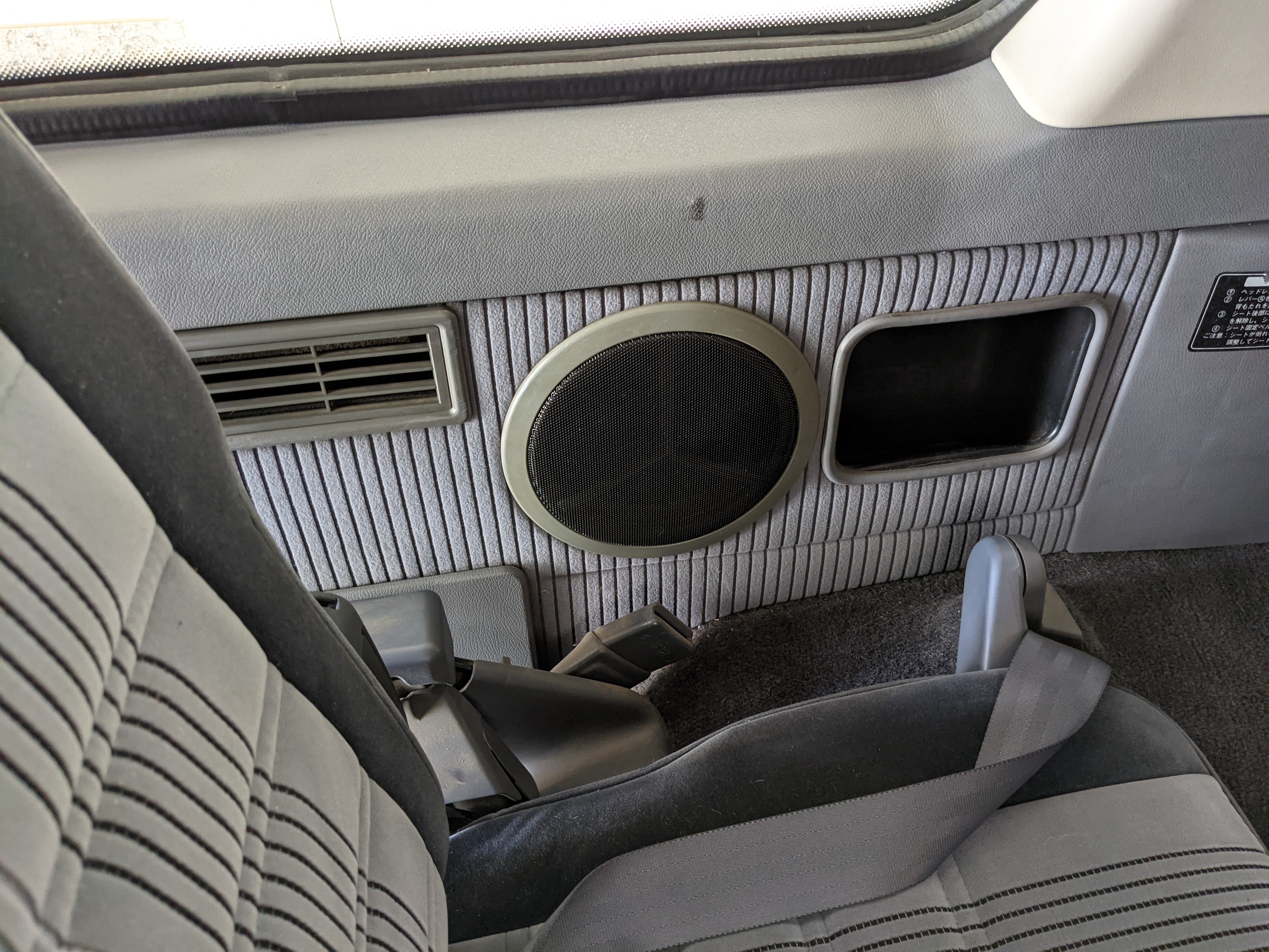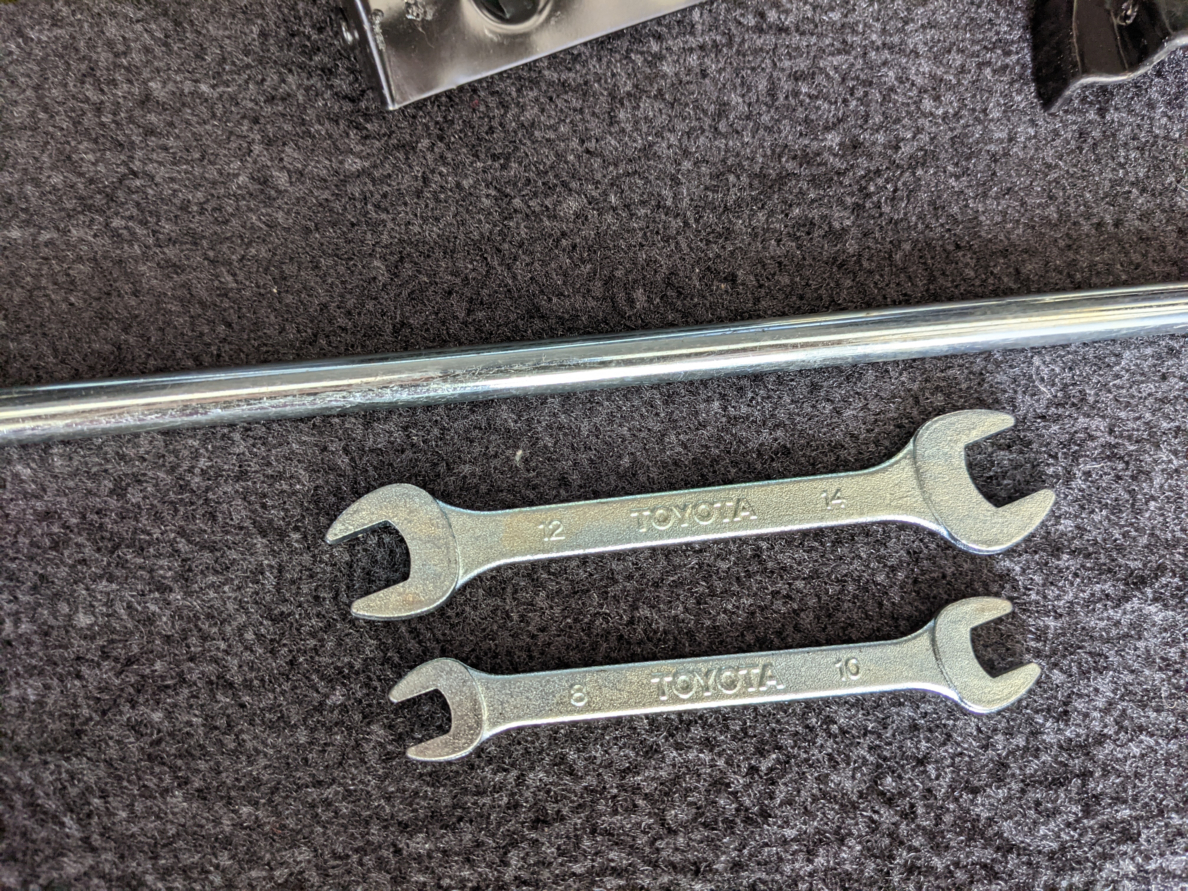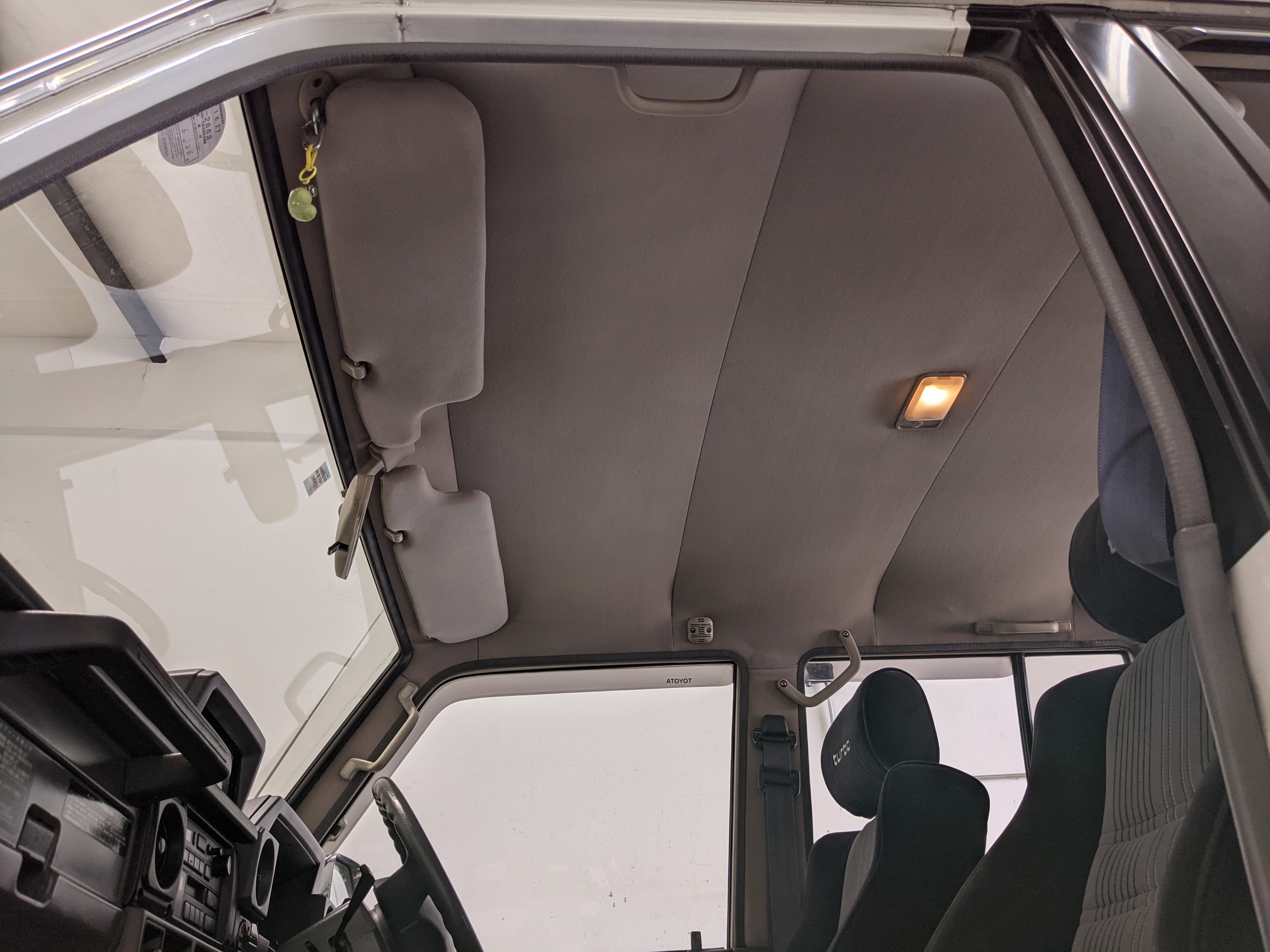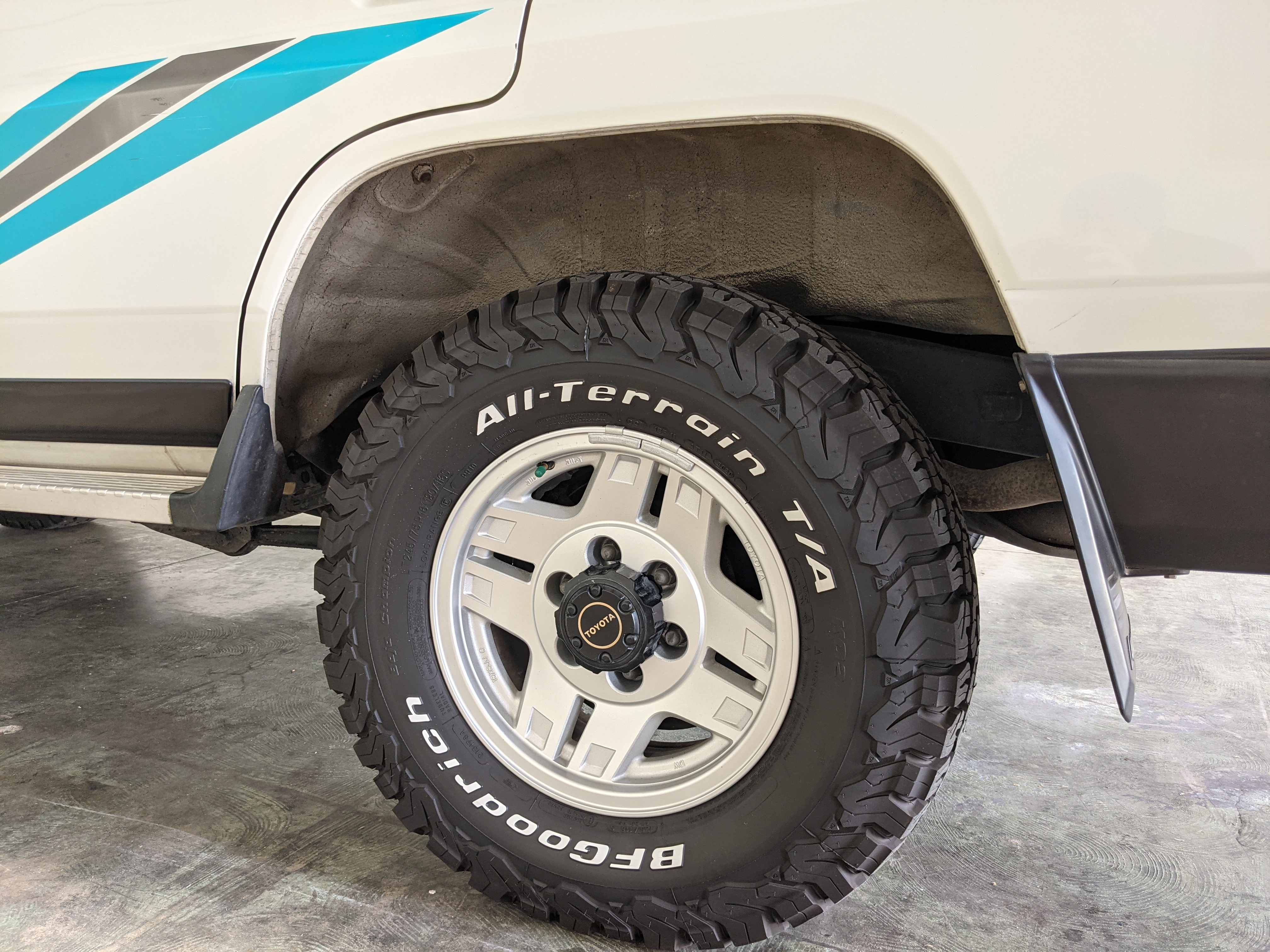 Inside is clean, comfortable and functional. Power windows, air conditioning, turbo emblazoned headrests, and perhaps the most important, the 5 speed manual transmission and the 3 pedals. On the center dash is a unique altimeter/thermometer combo telling you how high up you are, along with the interior and exterior temperatures in celsius. All the original instruction stickers are still here as well. Dash is not cracked or warped at all, door cards are clean and free of stains, rips or wear of any kind. Driver’s seat has a small tear where the seat piping is poking through. Rear seats are perfect, as are the third row seats. Everything functions as it should, glass has no chips or scratches. All switches work, lights and gauges function correctly. Included is the complete Toyota tool kit which includes a Toyota bottle jack and assorted wrenches, center cap removing and center cap applying tools, and a Toyota-branded foldable metal wheel chuck, tucked into a Toyota tool bag.