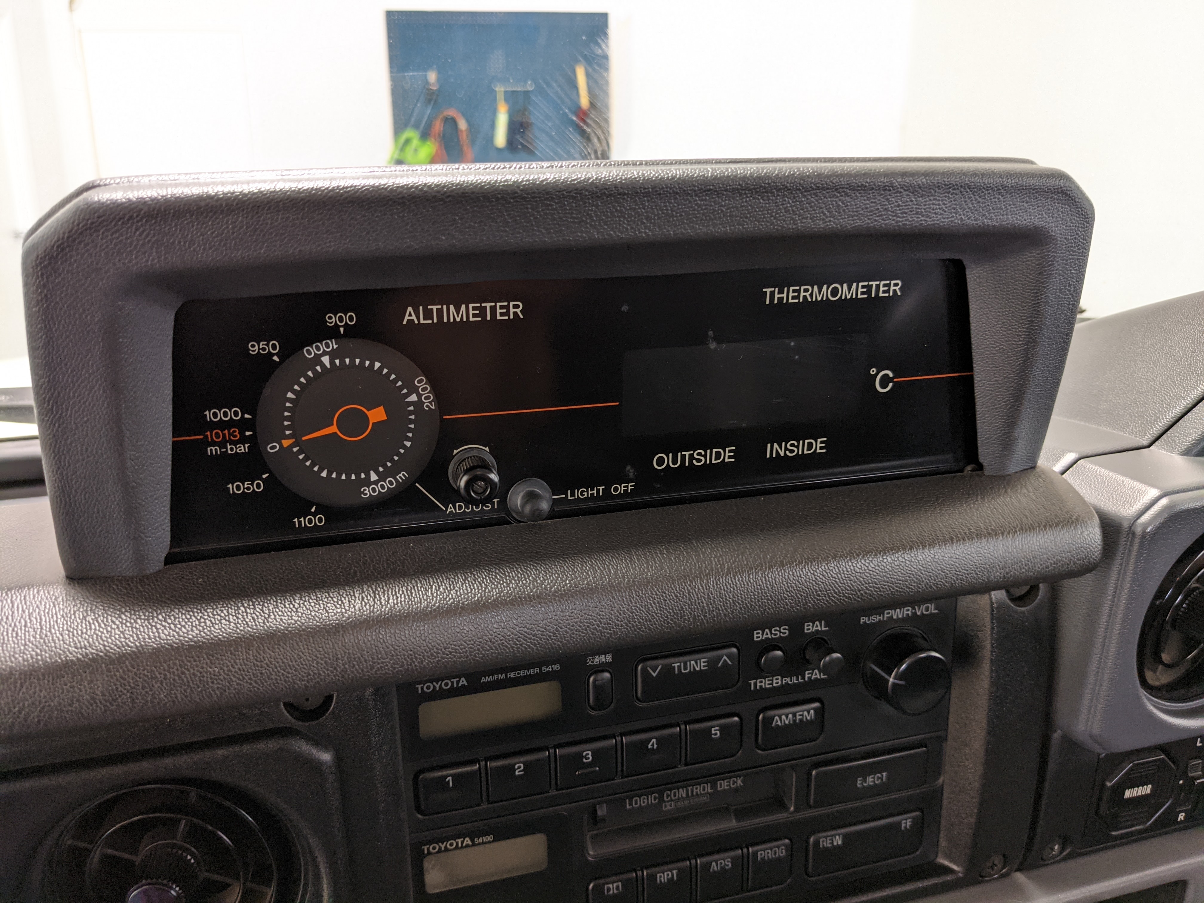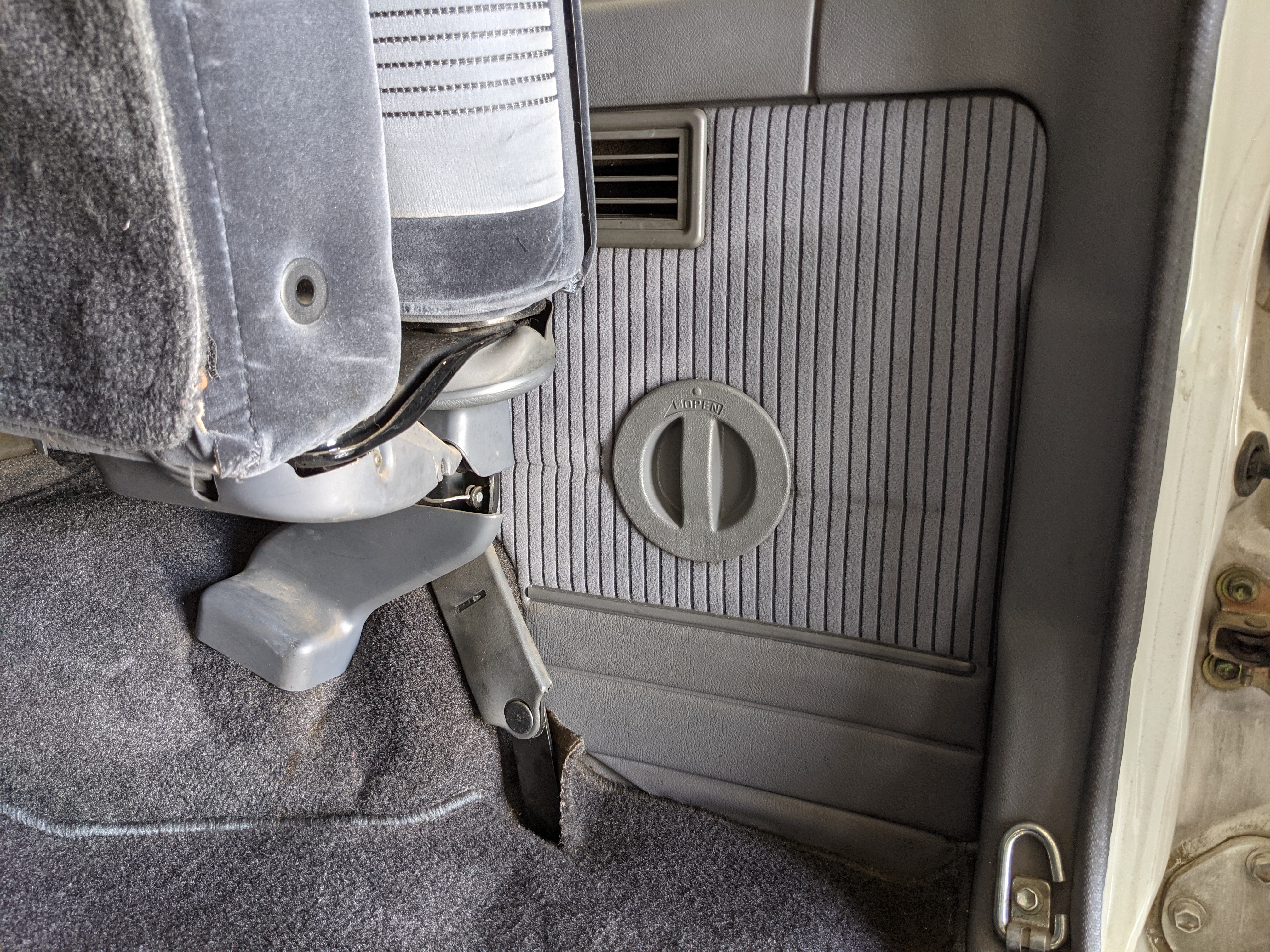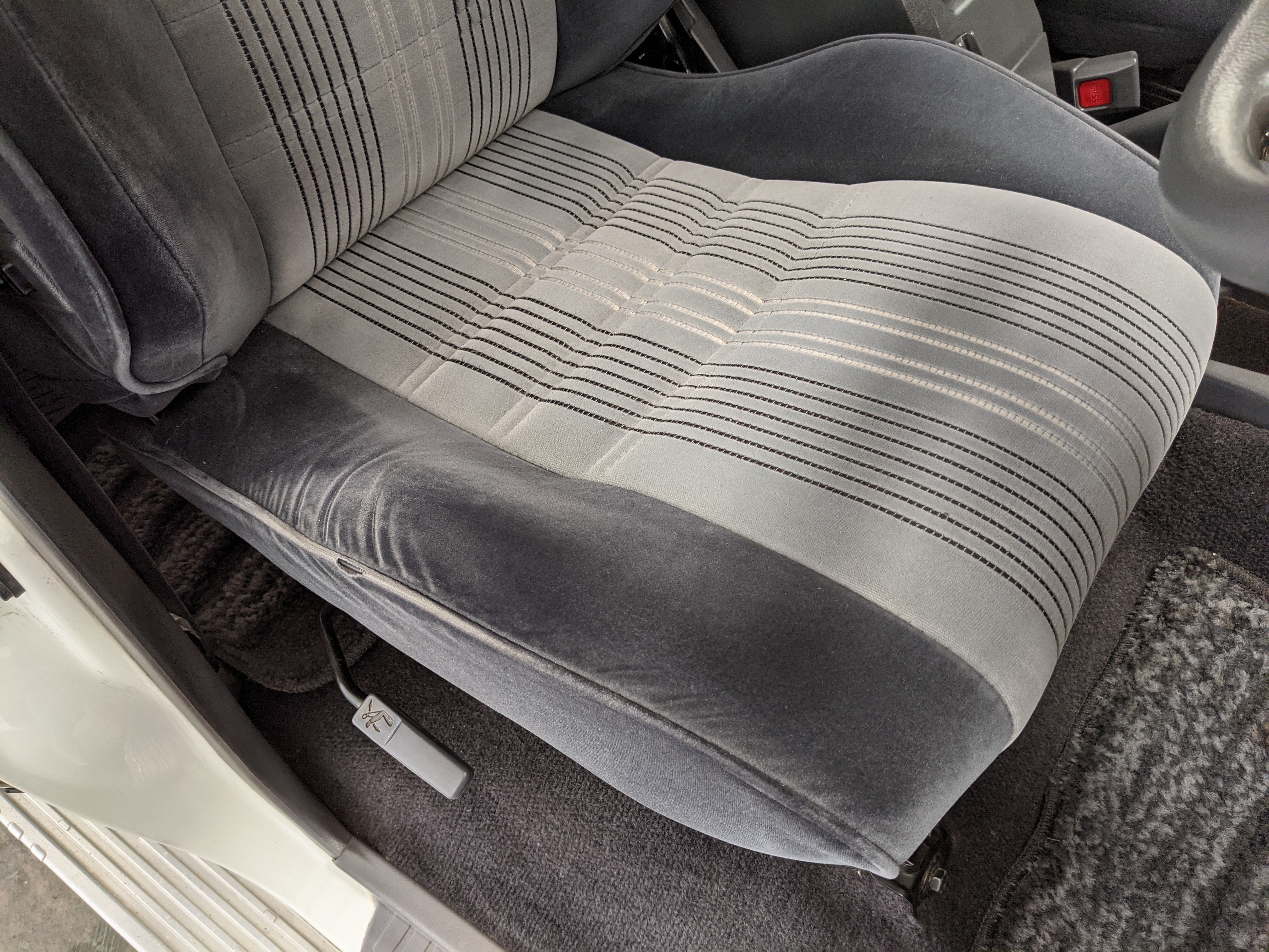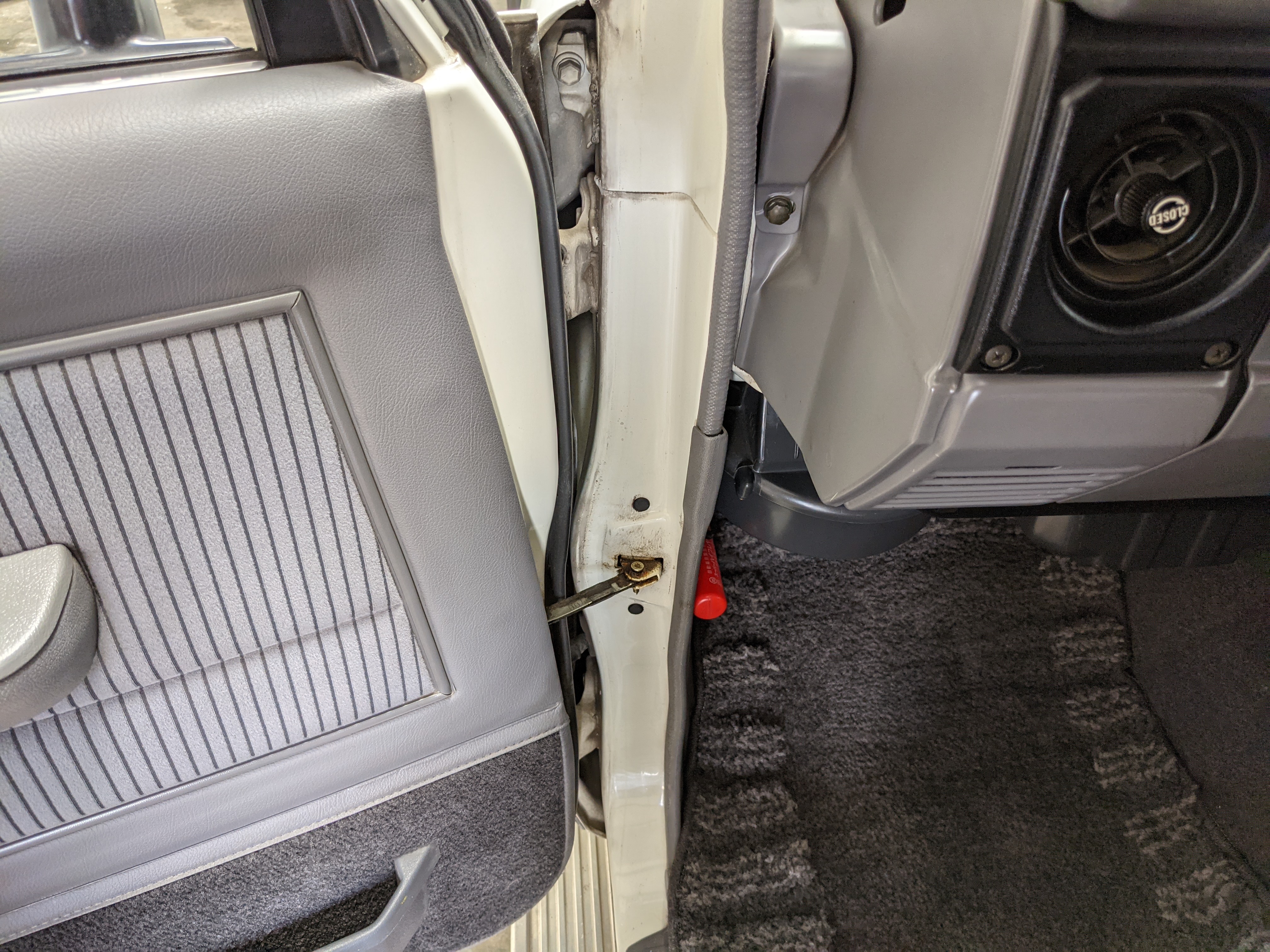 Inside is clean, comfortable and functional. Power windows, air conditioning, turbo emblazoned headrests, and perhaps the most important, the 5 speed manual transmission and the 3 pedals. On the center dash is a unique altimeter/thermometer combo telling you how high up you are, along with the interior and exterior temperatures in celsius. All the original instruction stickers are still here as well. Dash is not cracked or warped at all, door cards are clean and free of stains, rips or wear of any kind. Driver’s seat has a small tear where the seat piping is poking through. Rear seats are perfect, as are the third row seats. Everything functions as it should, glass has no chips or scratches. All switches work, lights and gauges function correctly. Included is the complete Toyota tool kit which includes a Toyota bottle jack and assorted wrenches, center cap removing and center cap applying tools, and a Toyota-branded foldable metal wheel chuck, tucked into a Toyota tool bag.