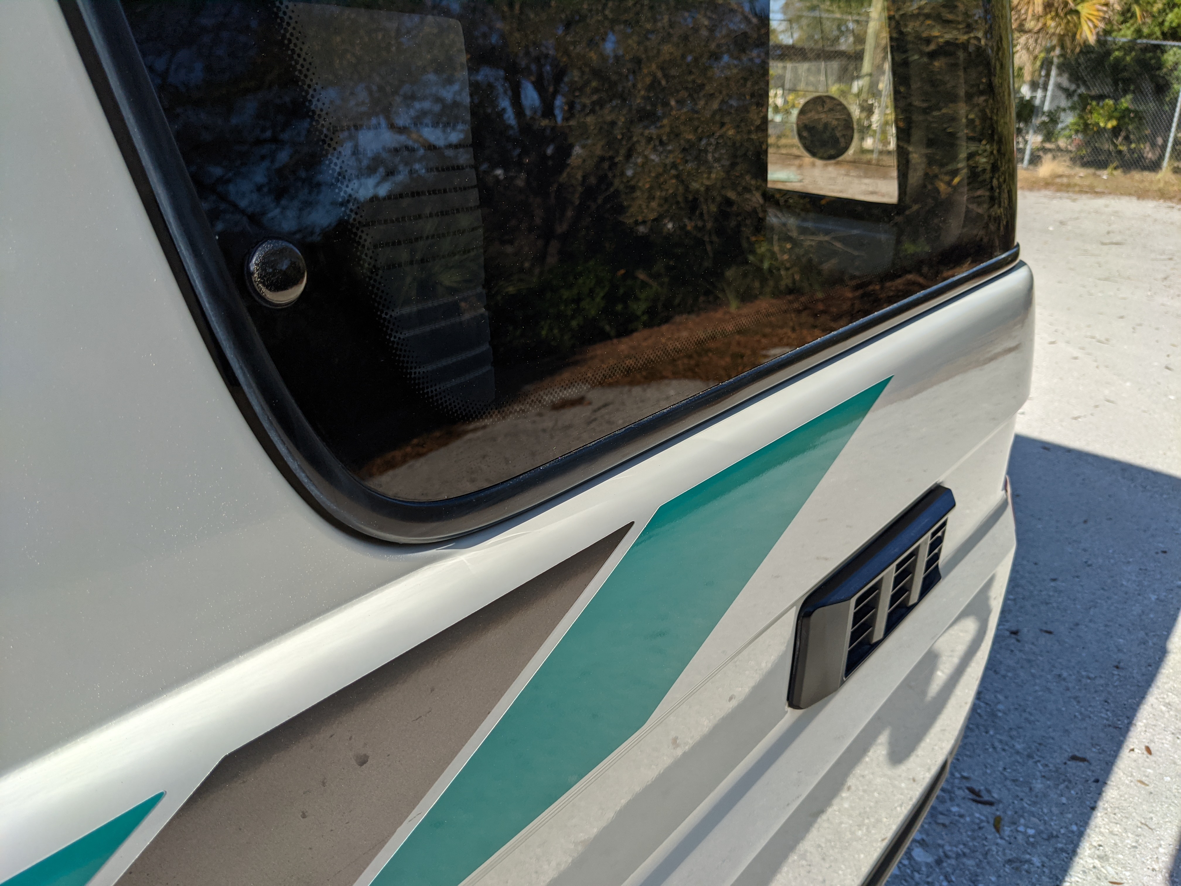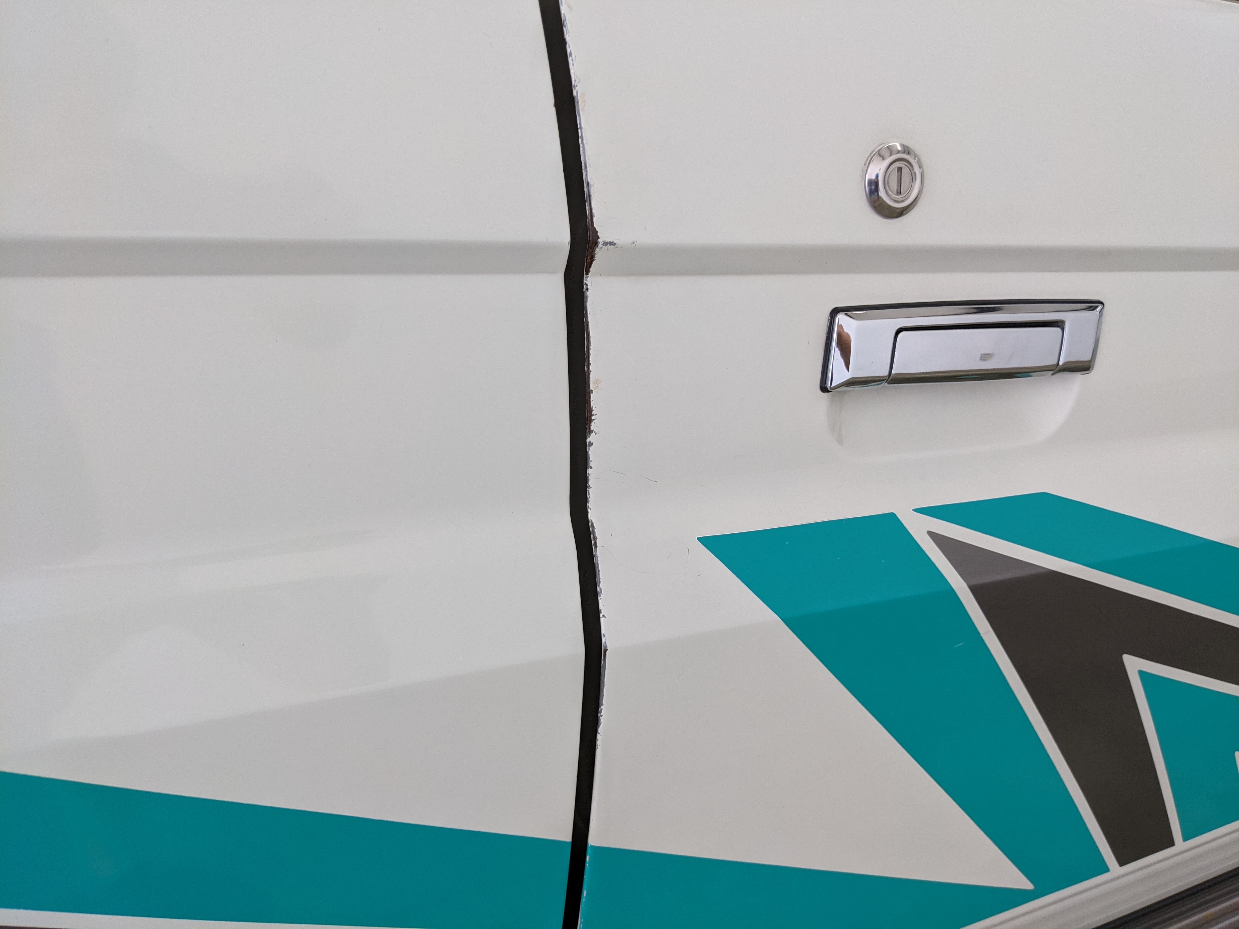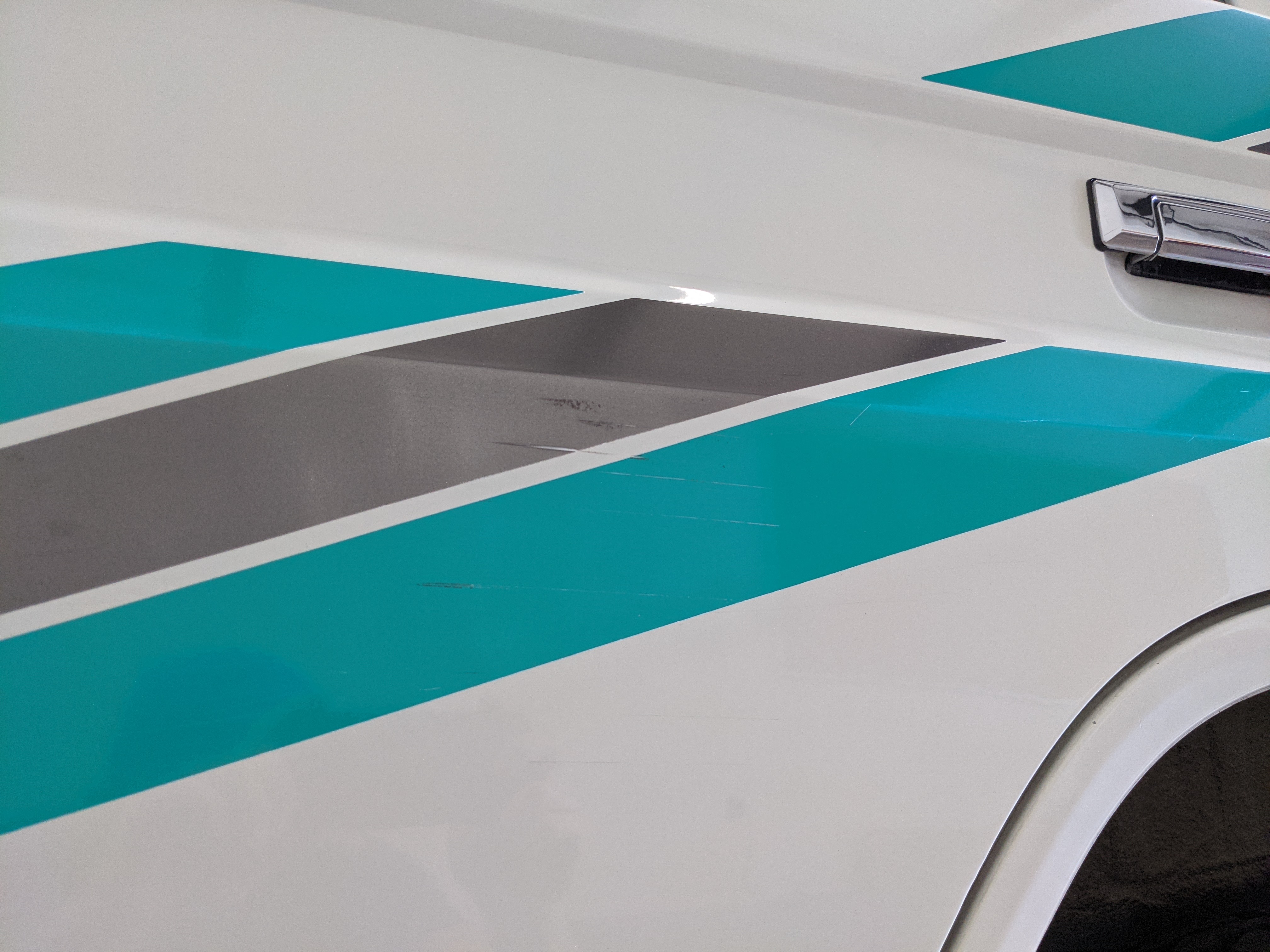 As this is a 30 year old vehicle there are flaws, though they are minor. There is a deep scratch on the left rear right quarter panel just before the tail light. The decal stripes have light scratches. The front right plastic corner has been impacted enough to give it a permanent crease, while the left front bumper has a smooth fist-sized impression on the face. Both rear bumper corners have gouges and scratches. Driver and passenger door edges have chips and paint wear, with the driver’s side having the worst of it.