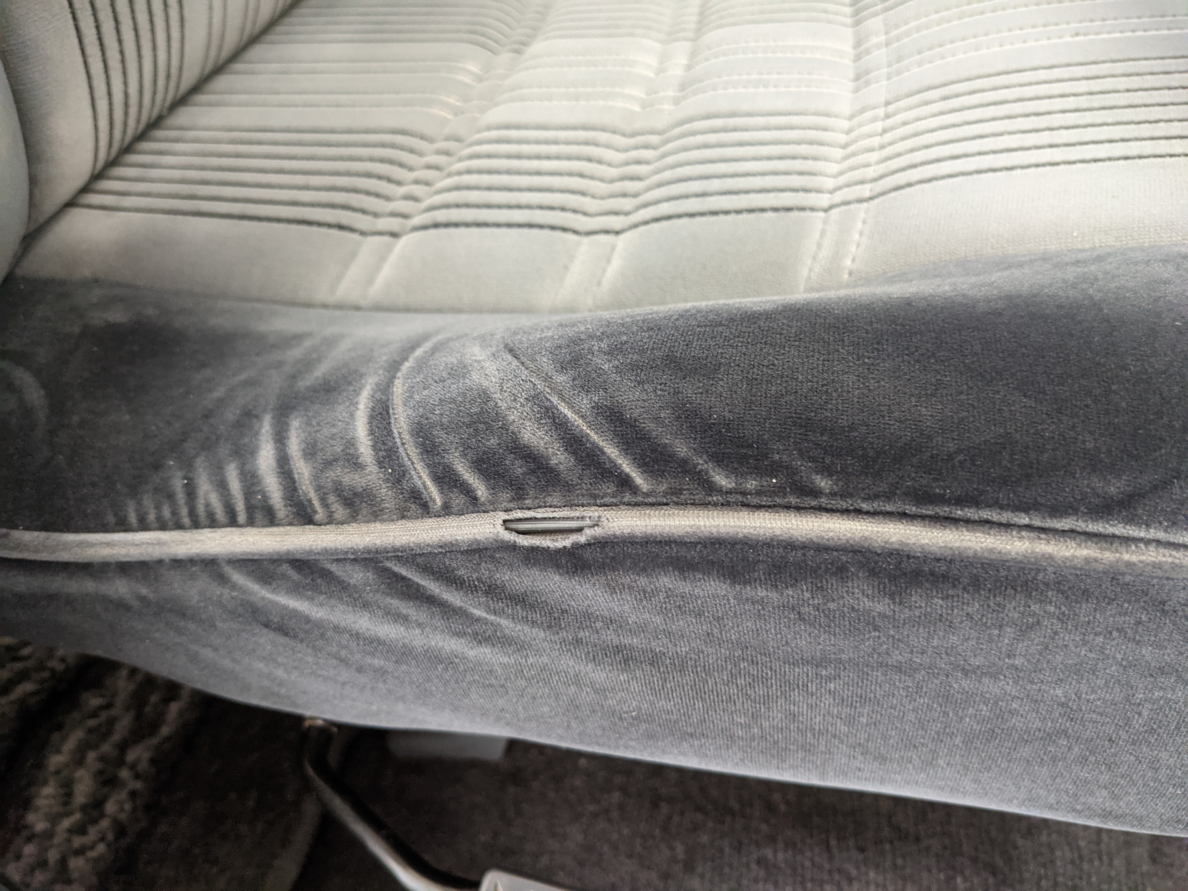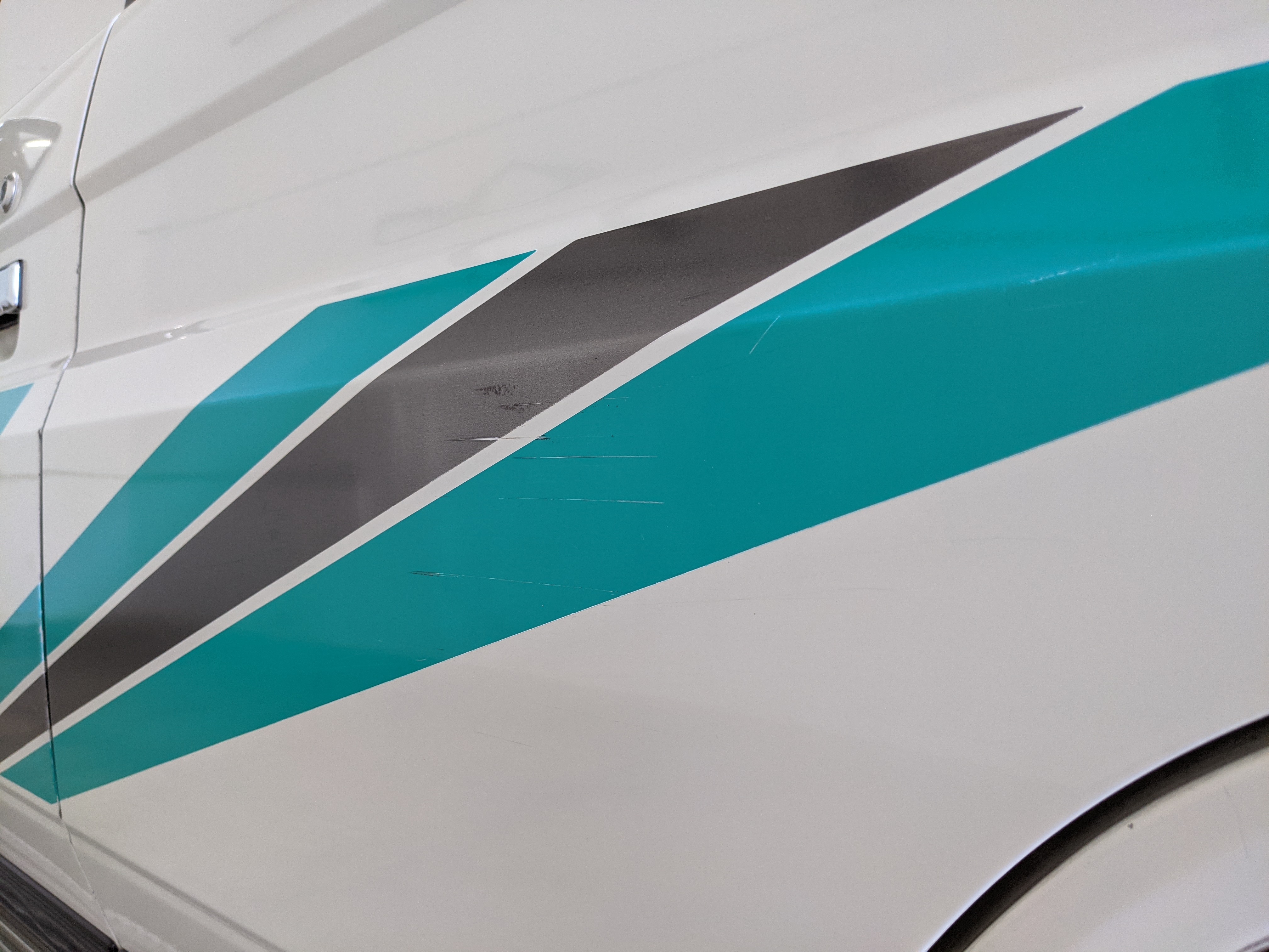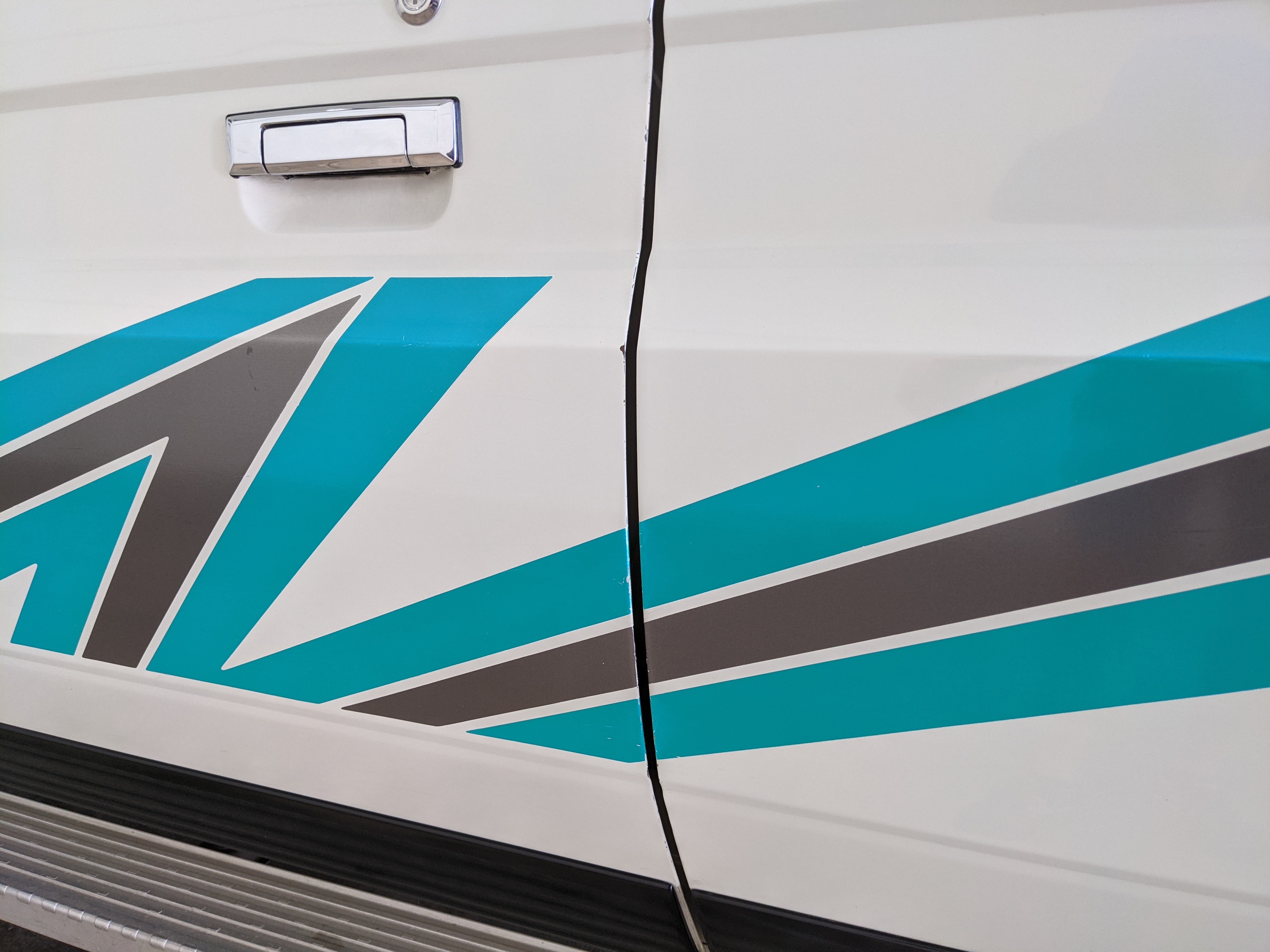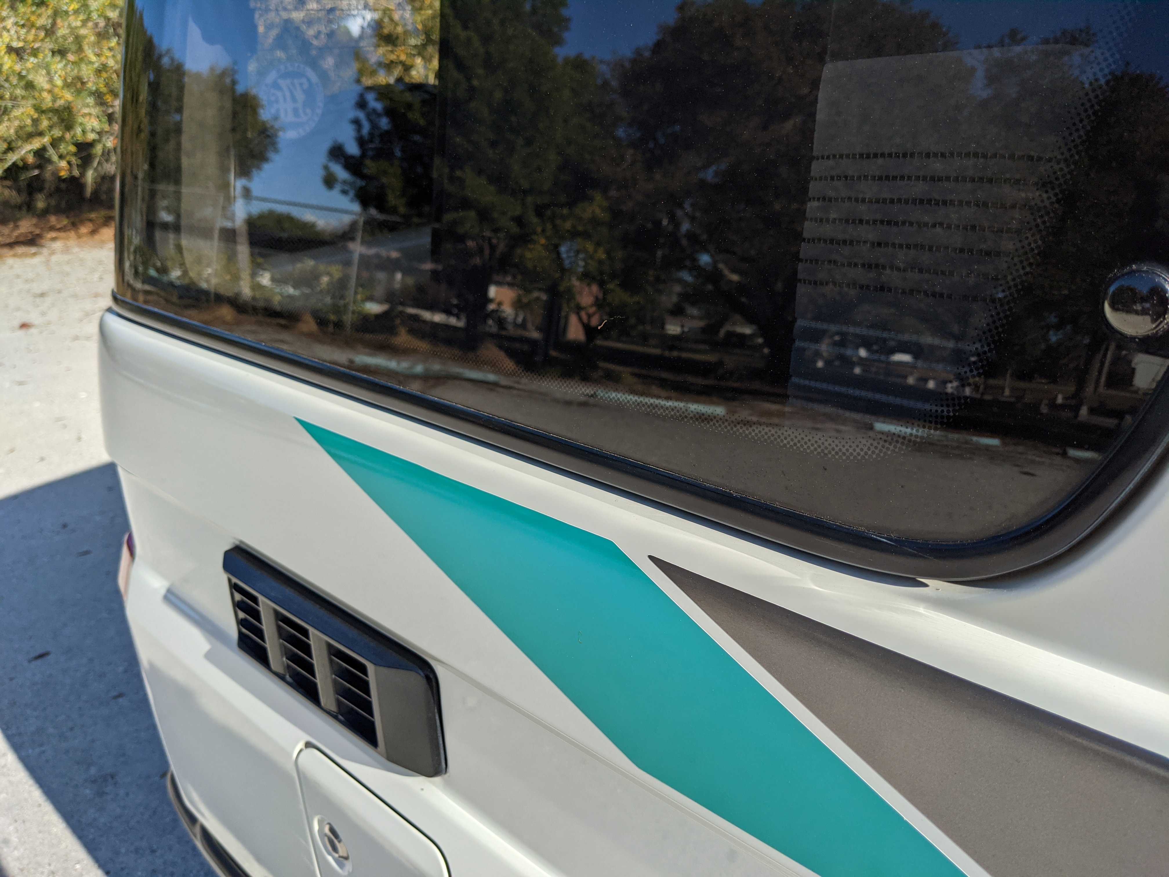 As this is a 30 year old vehicle there are flaws, though they are minor. There is a deep scratch on the left rear right quarter panel just before the tail light. The decal stripes have light scratches. The front right plastic corner has been impacted enough to give it a permanent crease, while the left front bumper has a smooth fist-sized impression on the face. Both rear bumper corners have gouges and scratches. Driver and passenger door edges have chips and paint wear, with the driver’s side having the worst of it.