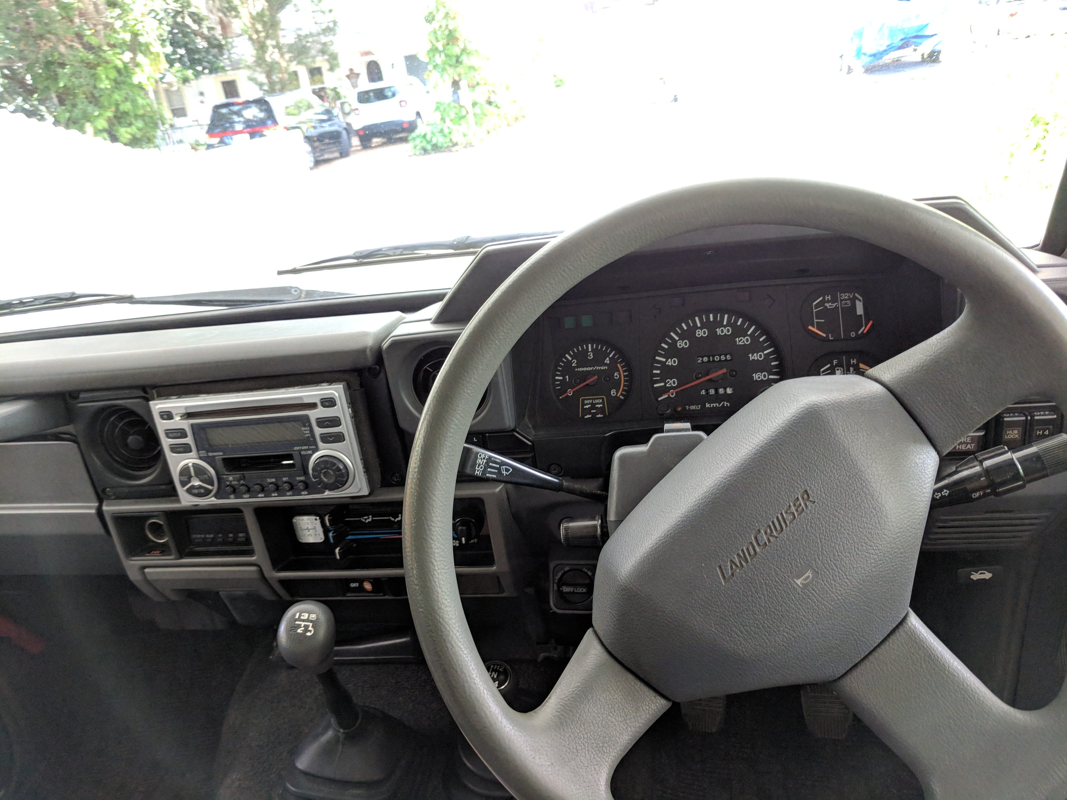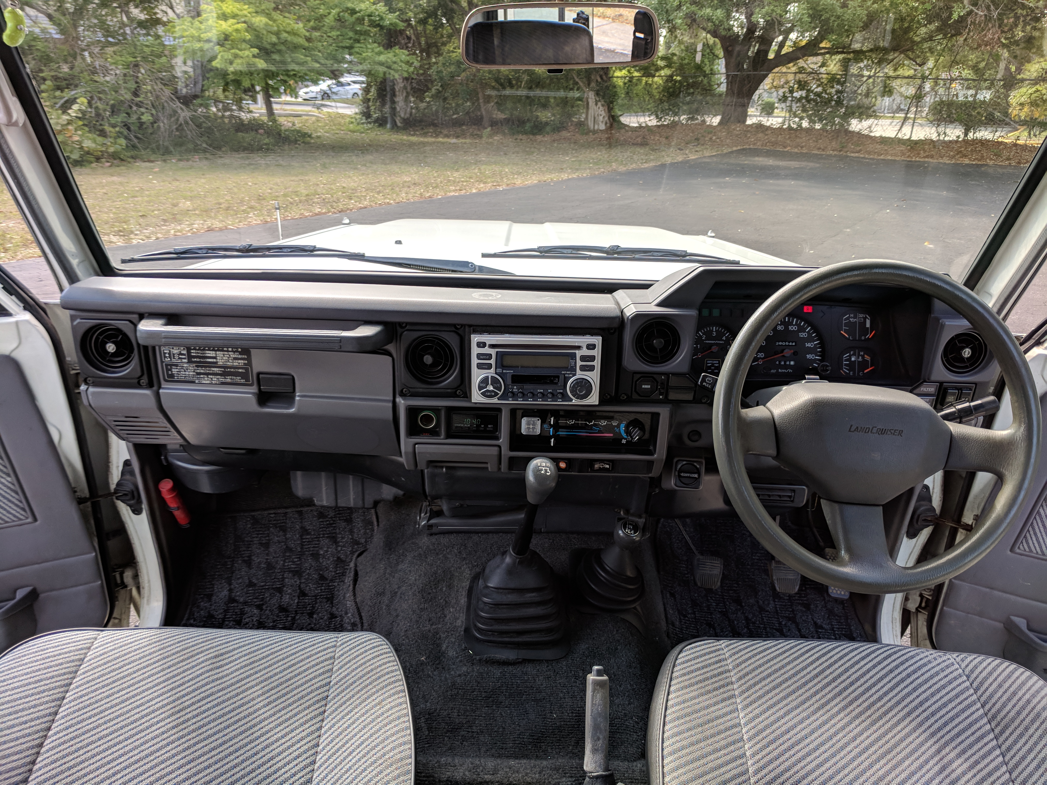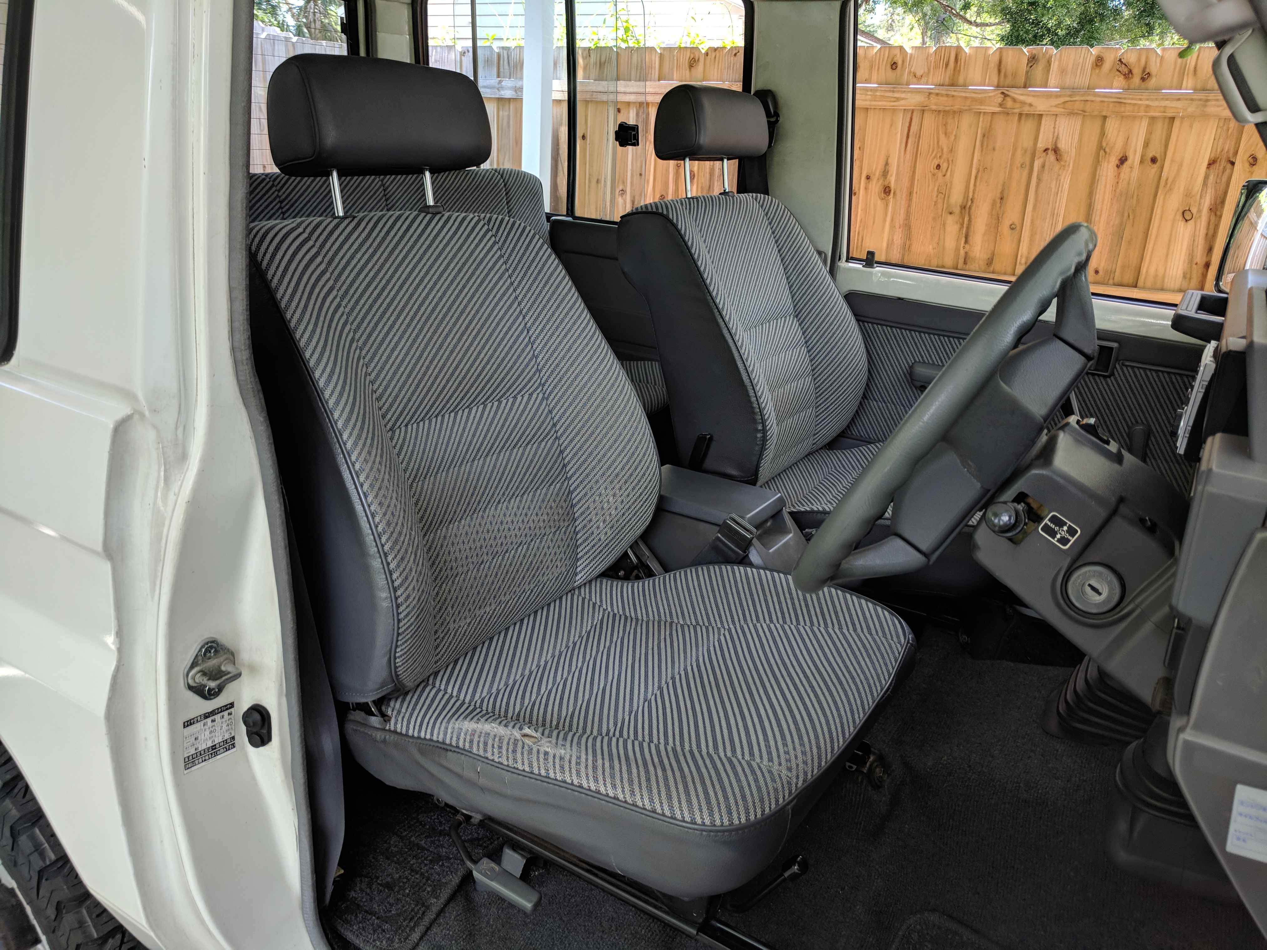 Inside is completely original like the outside, durable gray and white fabric over the seats, with the rear seat being a single bench. Original steering wheel with a plethora of gauges in the cluster. Speedometer and RPM gauges along with temperature, volt, fuel and oil pressure gauges. You might have noticed that the voltmeter shows ‘32V’ as the max, that’s due to this LandCruiser having a dual-battery, 24V electrical system. Lower down behind the wheel on the right is your hub lock and 4WD buttons, left side is your diff lock selector. Off, RR or FR and RR are your options. As-expected HVAC controls in the center stack along with an aftermarket tape and CD player which functions. This was a non-smoking vehicle so the ashtray is spotless and the cigarette lighter is unused. Electric mirrors, rear defrost and rear wipers round out the controls. Original floor mats are included as well. Rear bench seat can fold forward giving you more room for cargo in the back.