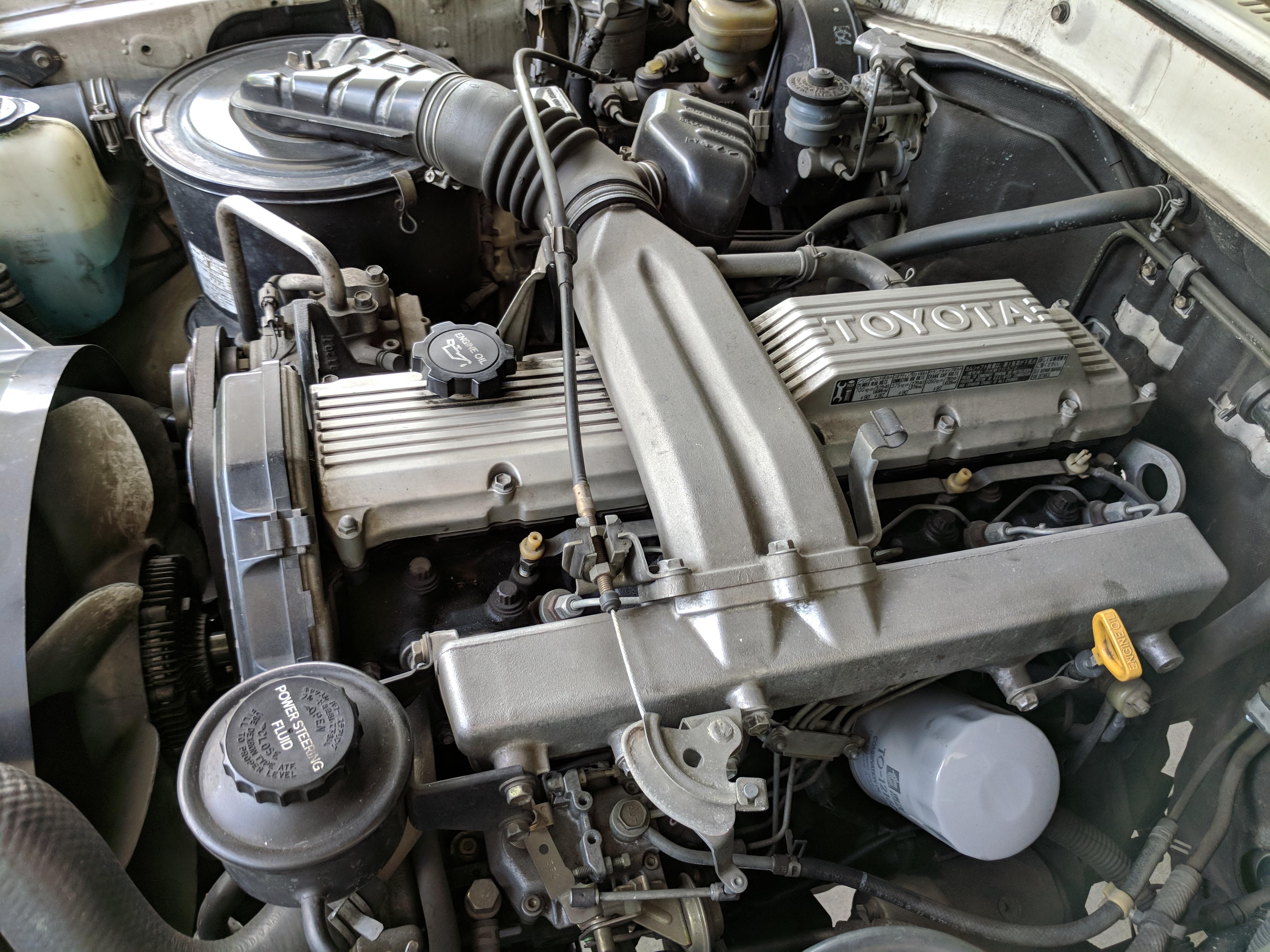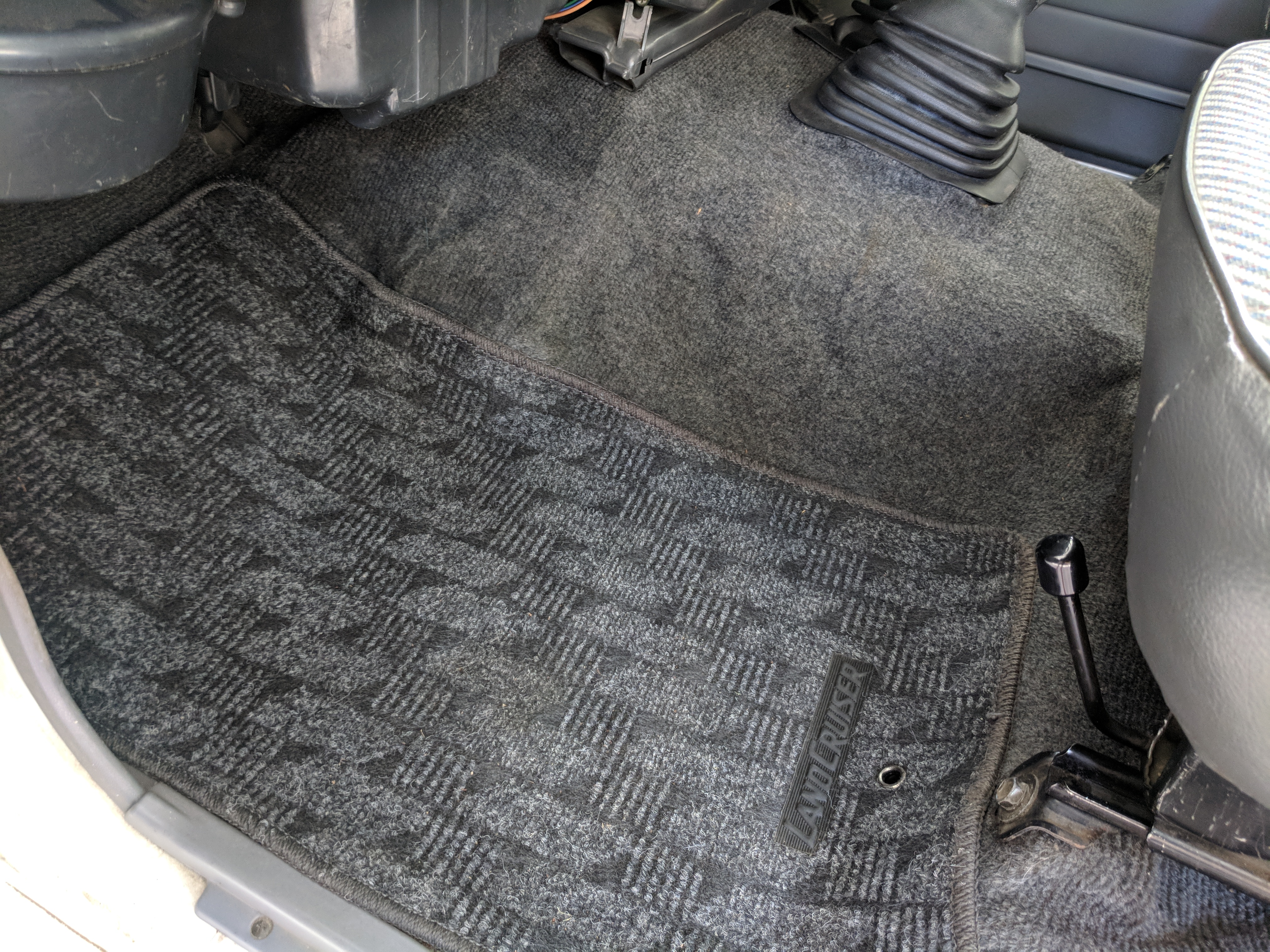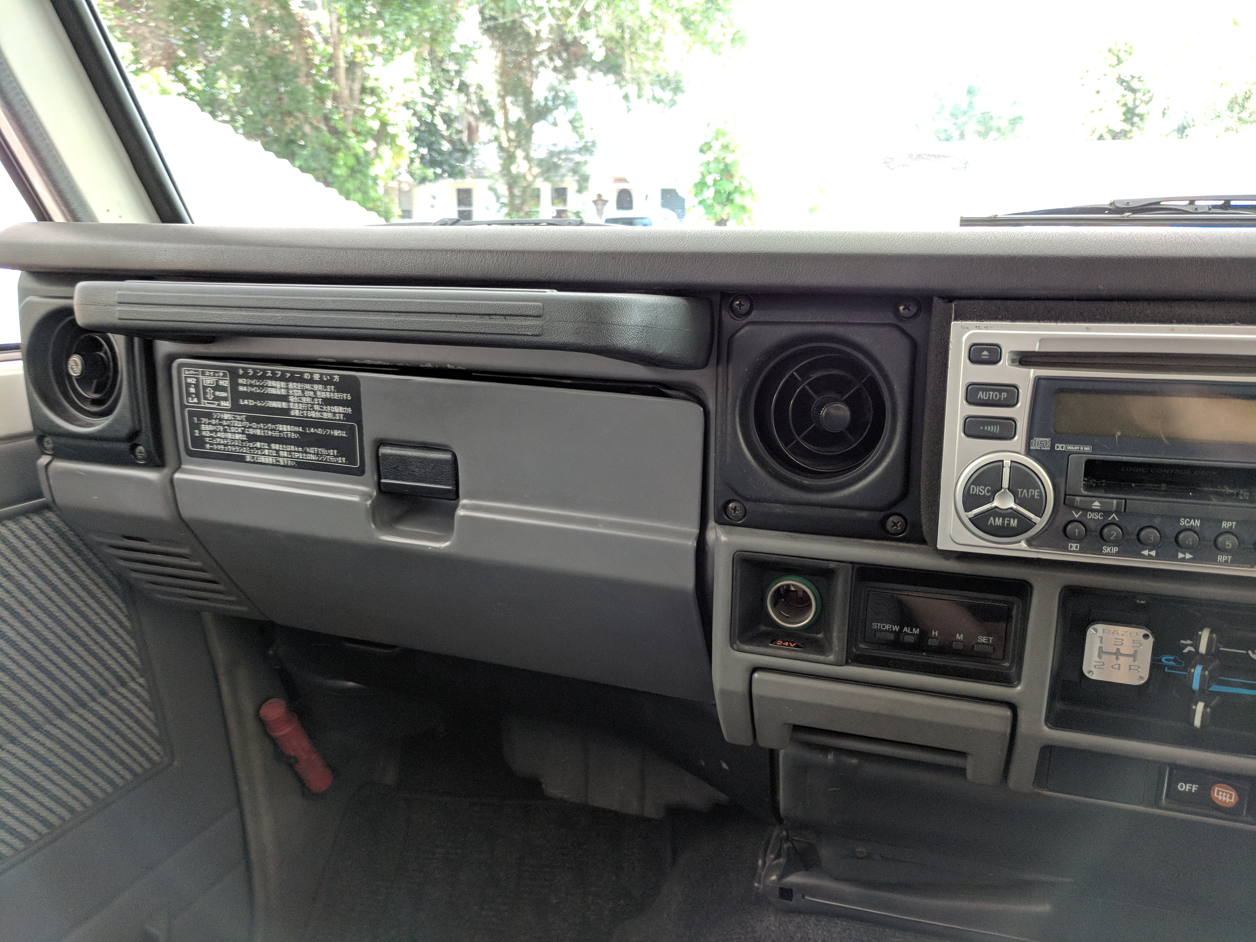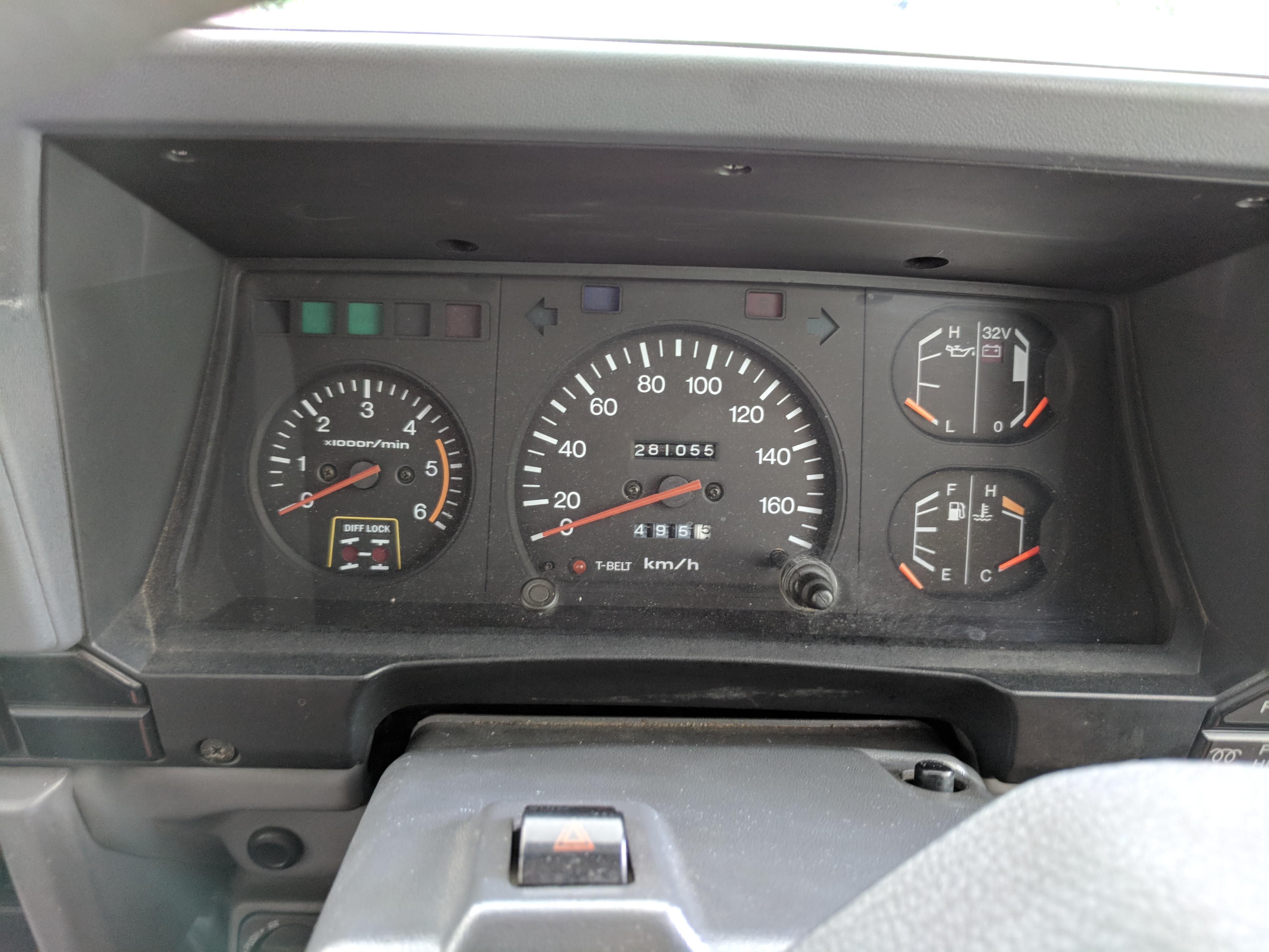 Inside is completely original like the outside, durable gray and white fabric over the seats, with the rear seat being a single bench. Original steering wheel with a plethora of gauges in the cluster. Speedometer and RPM gauges along with temperature, volt, fuel and oil pressure gauges. You might have noticed that the voltmeter shows ‘32V’ as the max, that’s due to this LandCruiser having a dual-battery, 24V electrical system. Lower down behind the wheel on the right is your hub lock and 4WD buttons, left side is your diff lock selector. Off, RR or FR and RR are your options. As-expected HVAC controls in the center stack along with an aftermarket tape and CD player which functions. This was a non-smoking vehicle so the ashtray is spotless and the cigarette lighter is unused. Electric mirrors, rear defrost and rear wipers round out the controls. Original floor mats are included as well. Rear bench seat can fold forward giving you more room for cargo in the back.