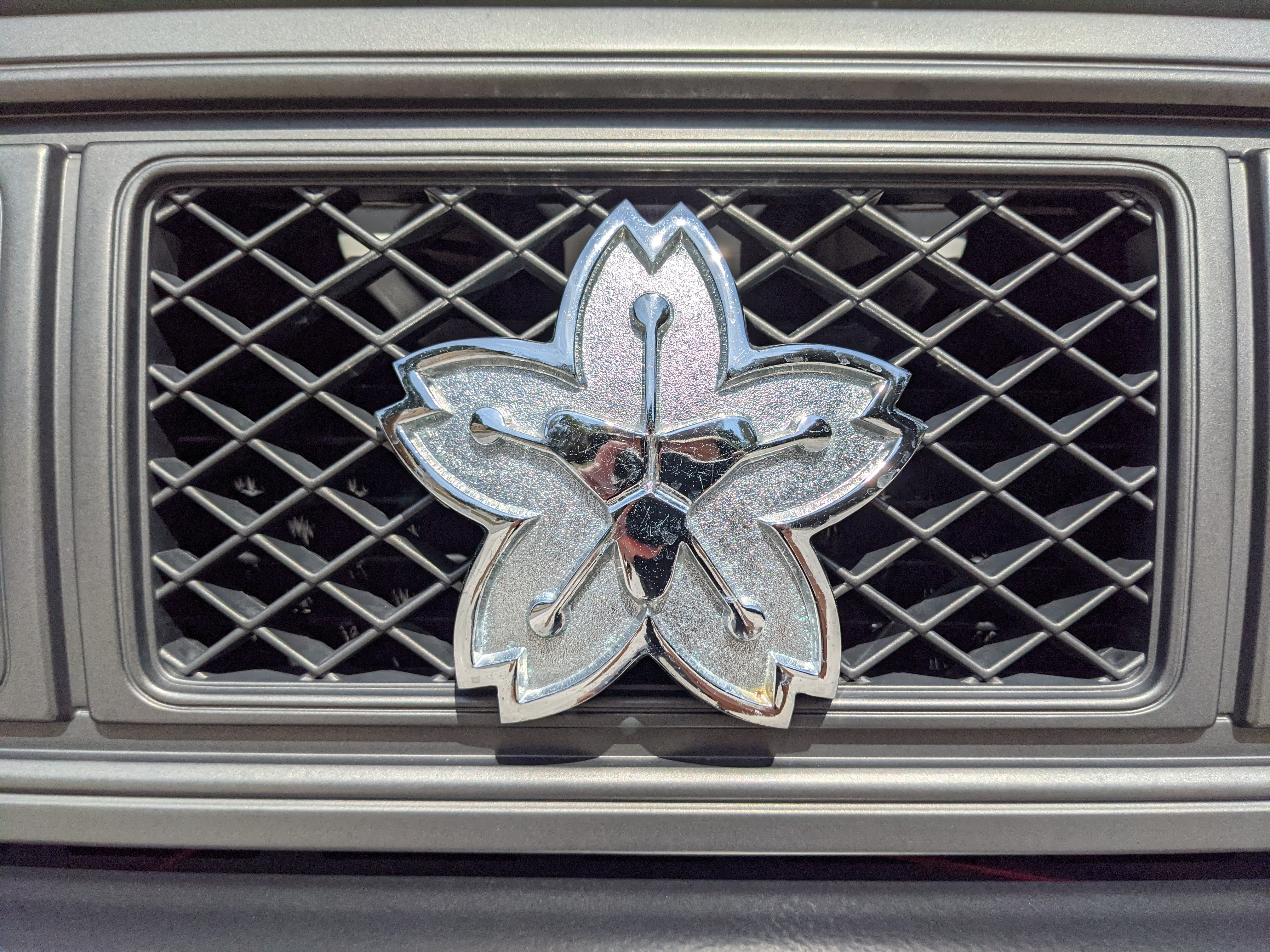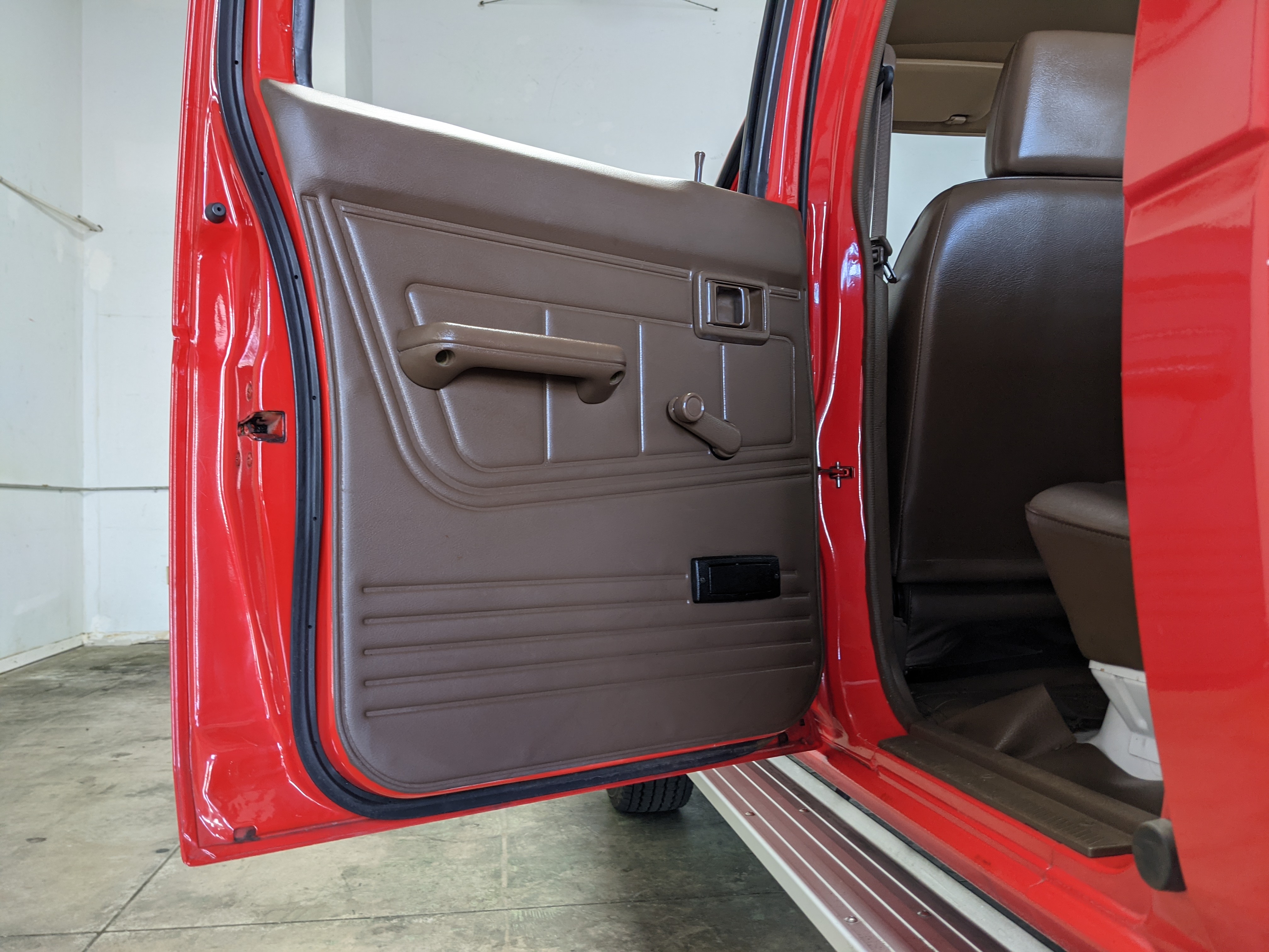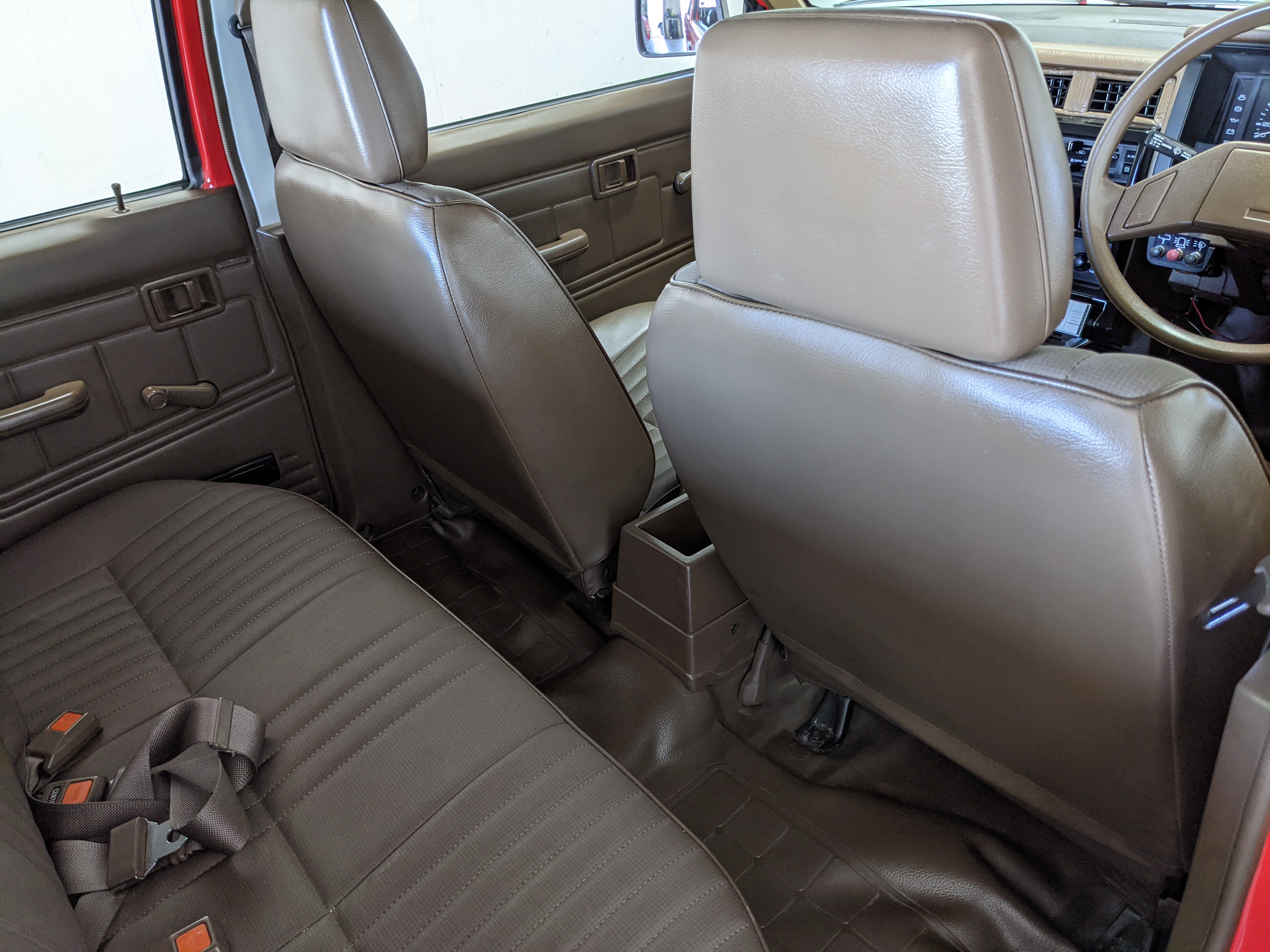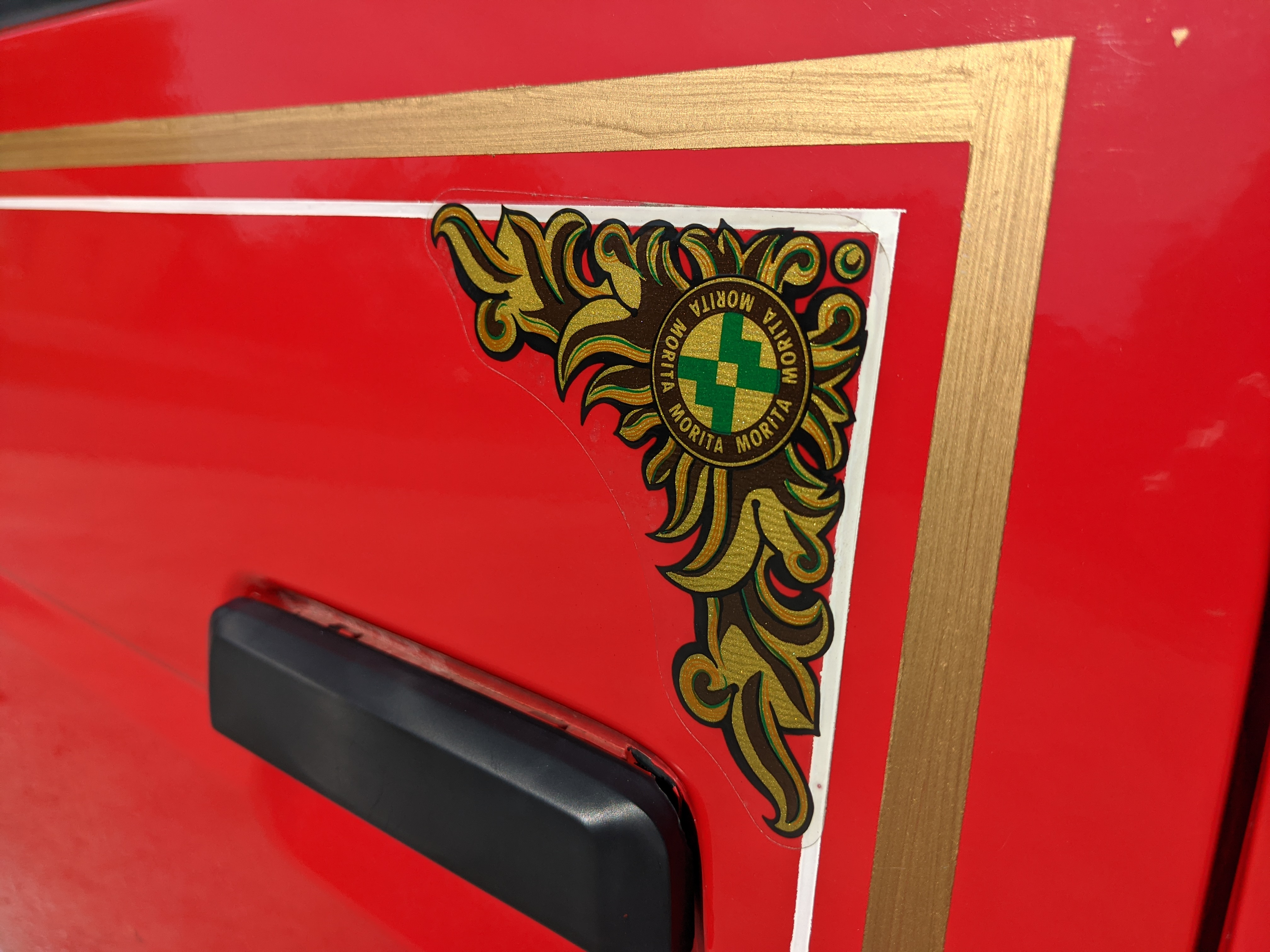 Well, it’s red. Fire engine red, perhaps the most red you can get. Gold and white stripes outline various body panels, with decorative corner pieces with the company that built this truck, ‘Morita’ inlaid within. Trim is flawless, as is the bumper corners, grill, front bumper, door handles, even the wheel center caps. We never did get the double cab variant here in the USA, so the truck has a somewhat unique profile to our western eyes. The front has the original emblem for the fire department front and center.