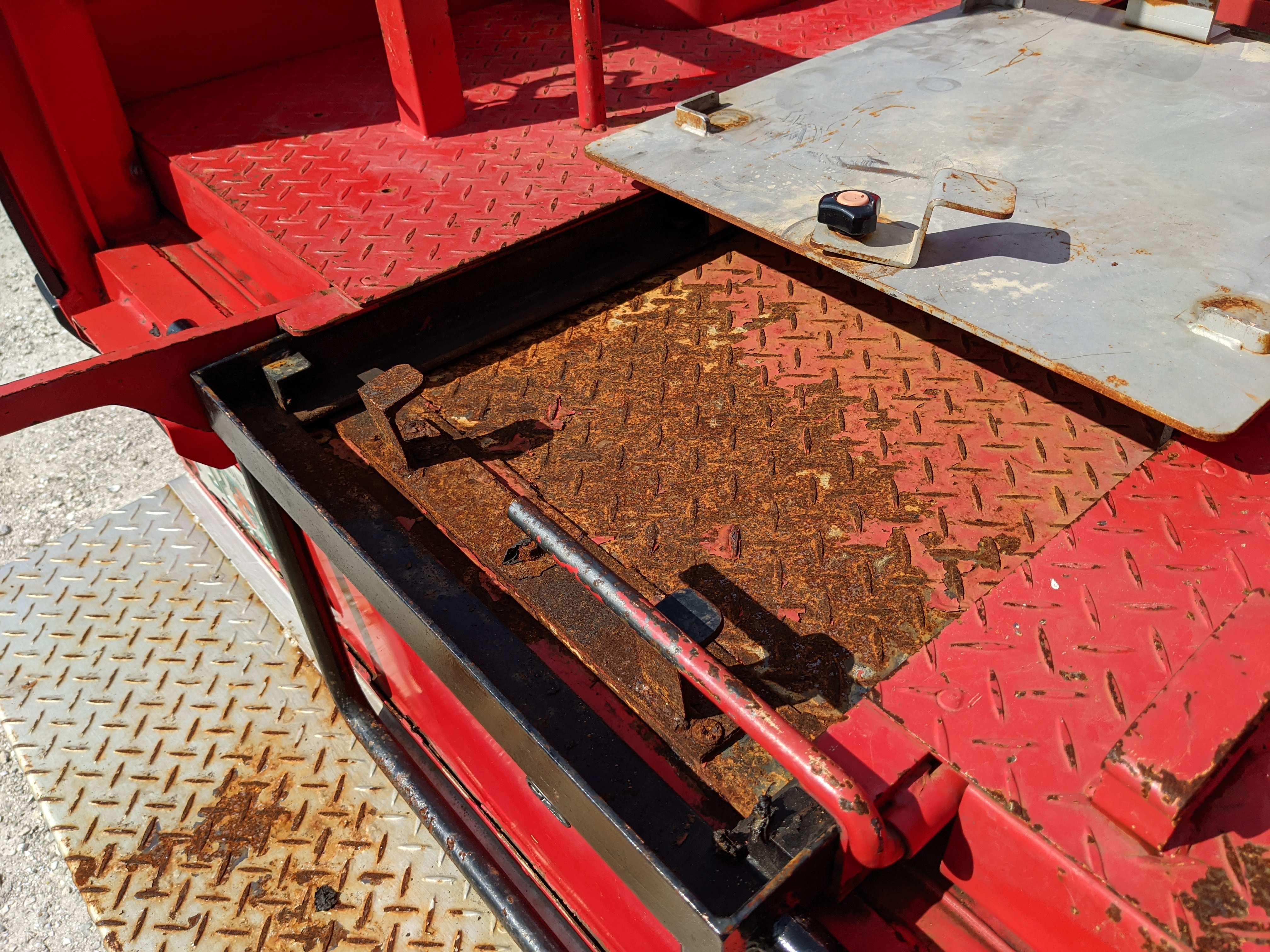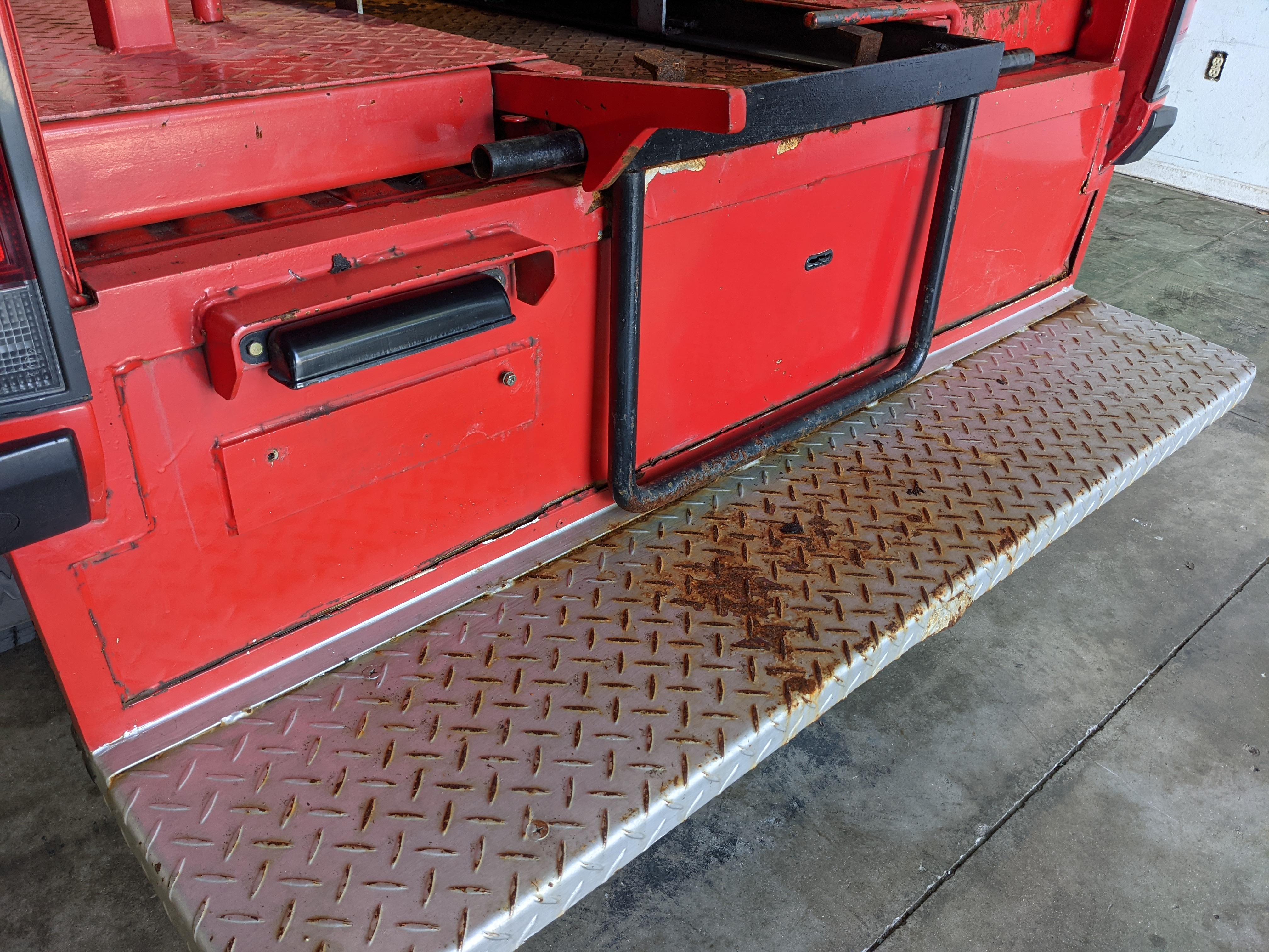 Being a fire truck the bed is where the ‘fire truck’ portion really exists. The bed has a specially-build diamond plate tray sitting on top of the original bed. This tray holds the now-empty pump base, used to slide the pump in and out. Various bars and hooks to hold ladders, hoses and various fire-fighting accessories are also here. The rear of the truck has a welded-on step to facilitate ease of access in the back, though if you peek behind it you’ll find the original truck intact. Usually you’ll find these trucks in Japan with one of the rear bed-sides cut in a way to allow a loop of hose to easily hang, thankfully this truck has it’s full bed. If we were to keep this truck, we’d pull out all the diamond plate, remove the rear step, source a tailgate, paint that same red, and leave everything else. In this way you get an actual functional truck with all the fire engine details that are important and stand out, namely the lights, sirens and decal work.