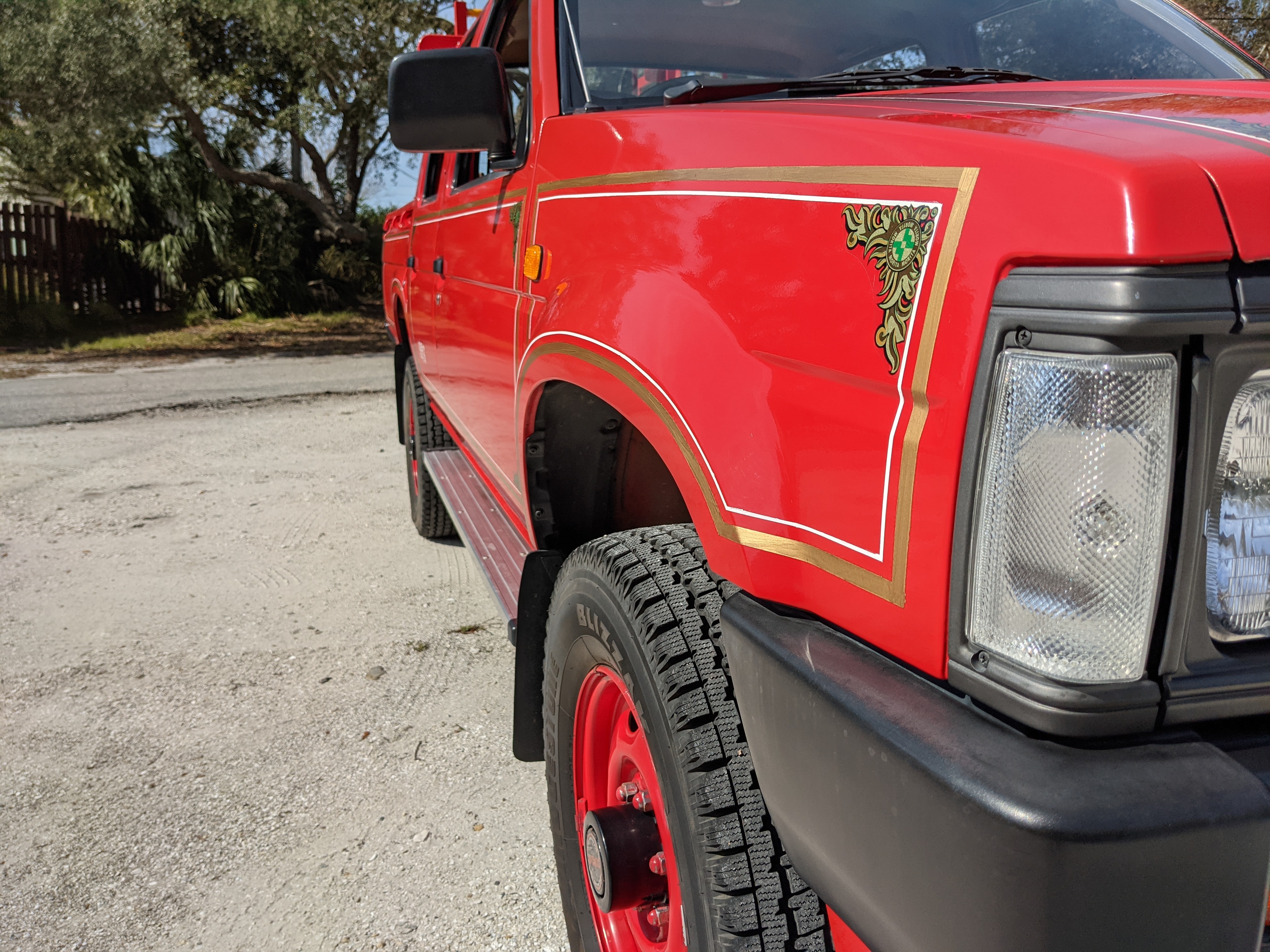 At the end of the day, this is a brand new 1992 Nissan 4WD double cab pickup truck. It just so happens to also be a fire engine with air conditioning. Just try to restrain yourself with the lights and sirens, the law isn’t very appreciative of fire-pretenders.