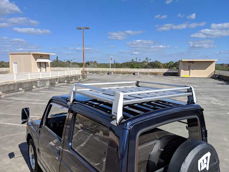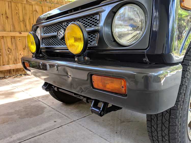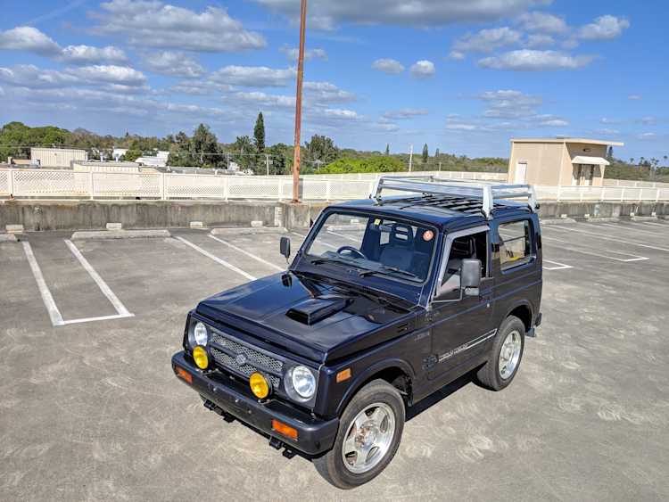This Jimny is a one-owner vehicle, with a body-on-frame design with sold axles front and back, and leaf springs on all four corners. Low and high range 4x4 with the standard RWD high transfer case, and manual locking front hubs. The transmission itself is a 5 speed affair that will get you to 65 MPH without issue. Factory fog lights sit on the front bumper with an OEM aluminium luggage rack from Suzuki on the roof. Killer 'Tenacious 4x4 power...' tire cover on the spare, factory original alloy wheels finish it off. It also has power steering. Has its original alloy wheels. Color is somewhere between purple and blue.