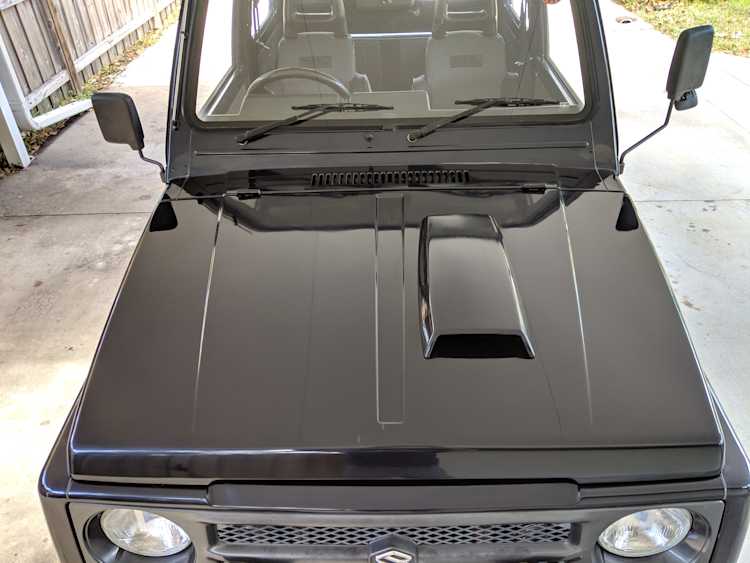 Being that it is a kei class vehicle from Japan it is equipped with a turbocharged 3cyl engine with a top mounted intercooler, hence the functional hoodscoop. While its displacement is only 660cc, the turbo charging gives it a sharp boost of power under acceleration you wouldn't expect compared to a typical Samurai.