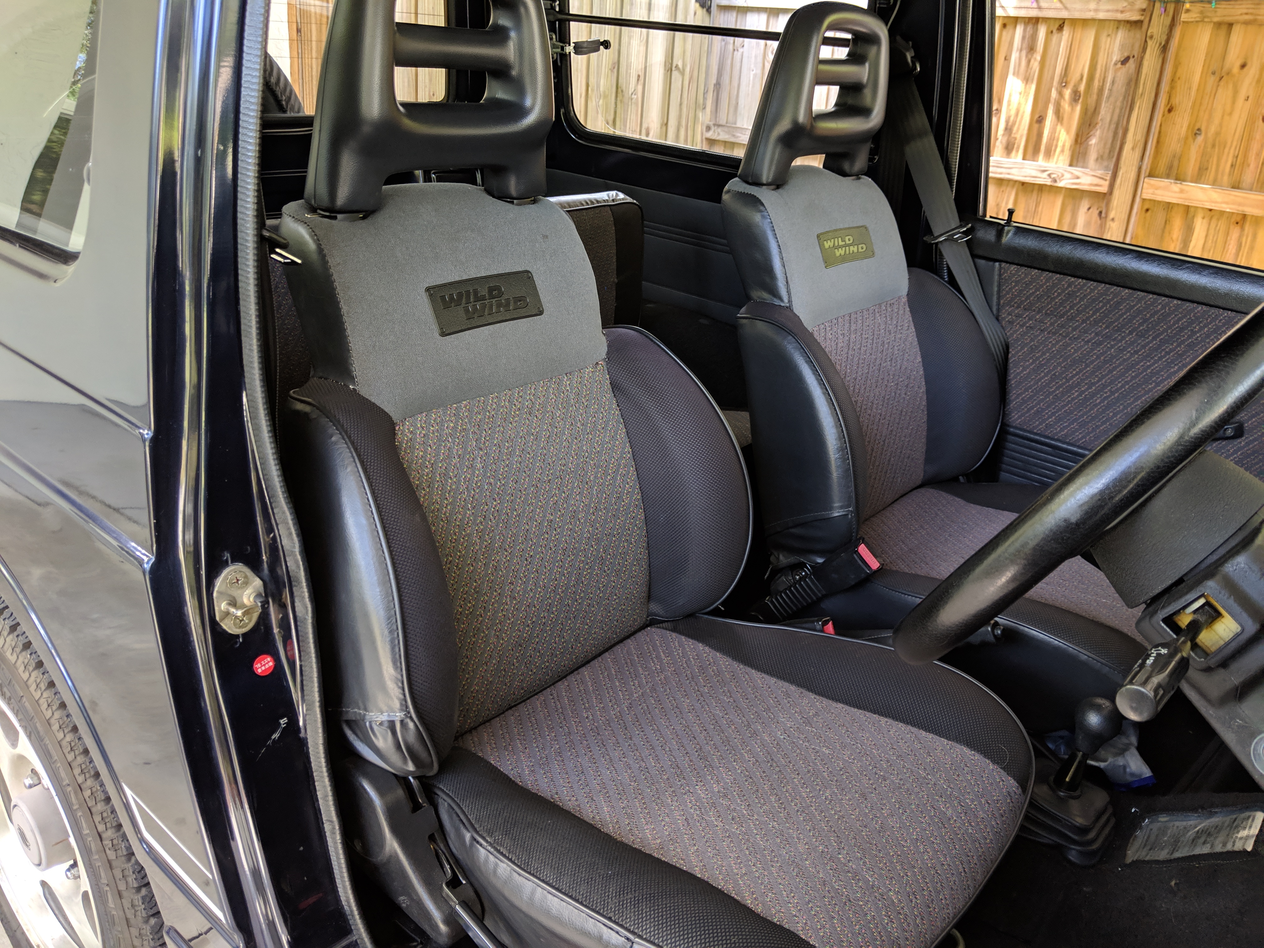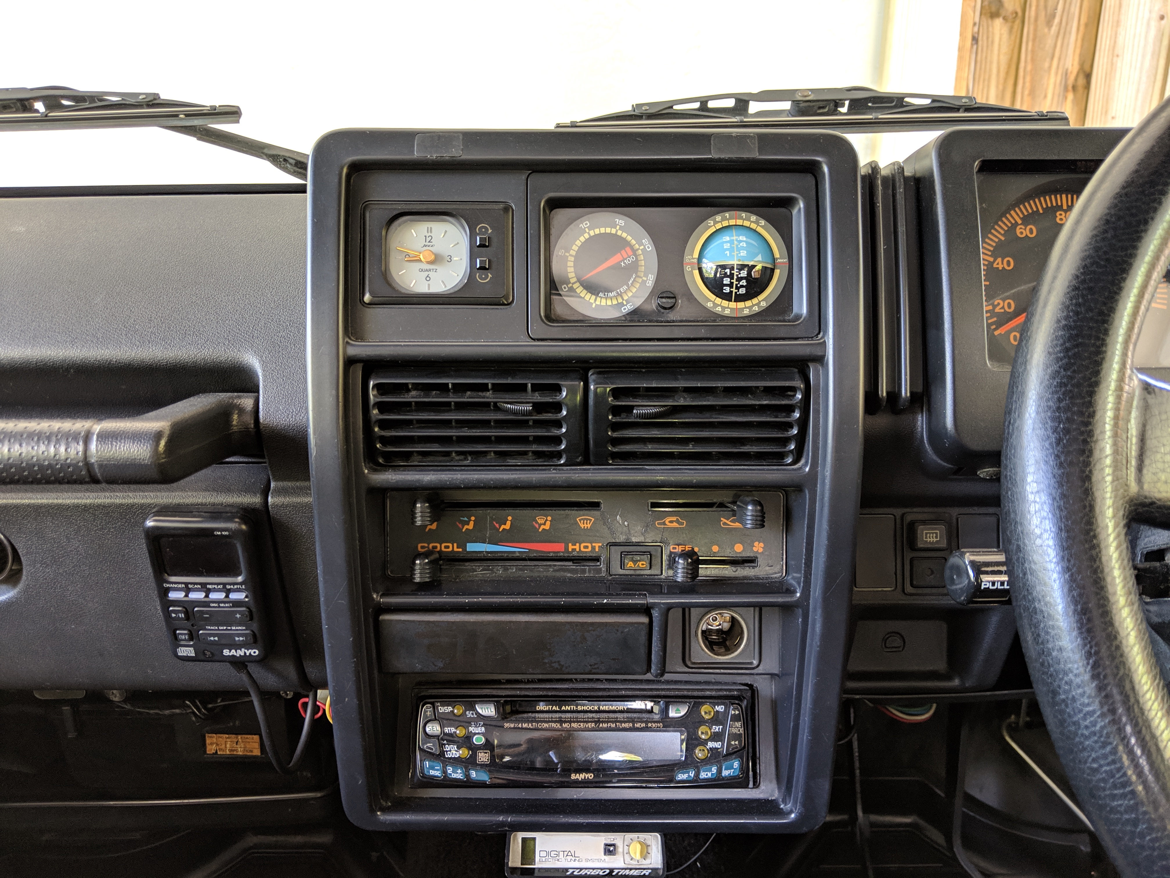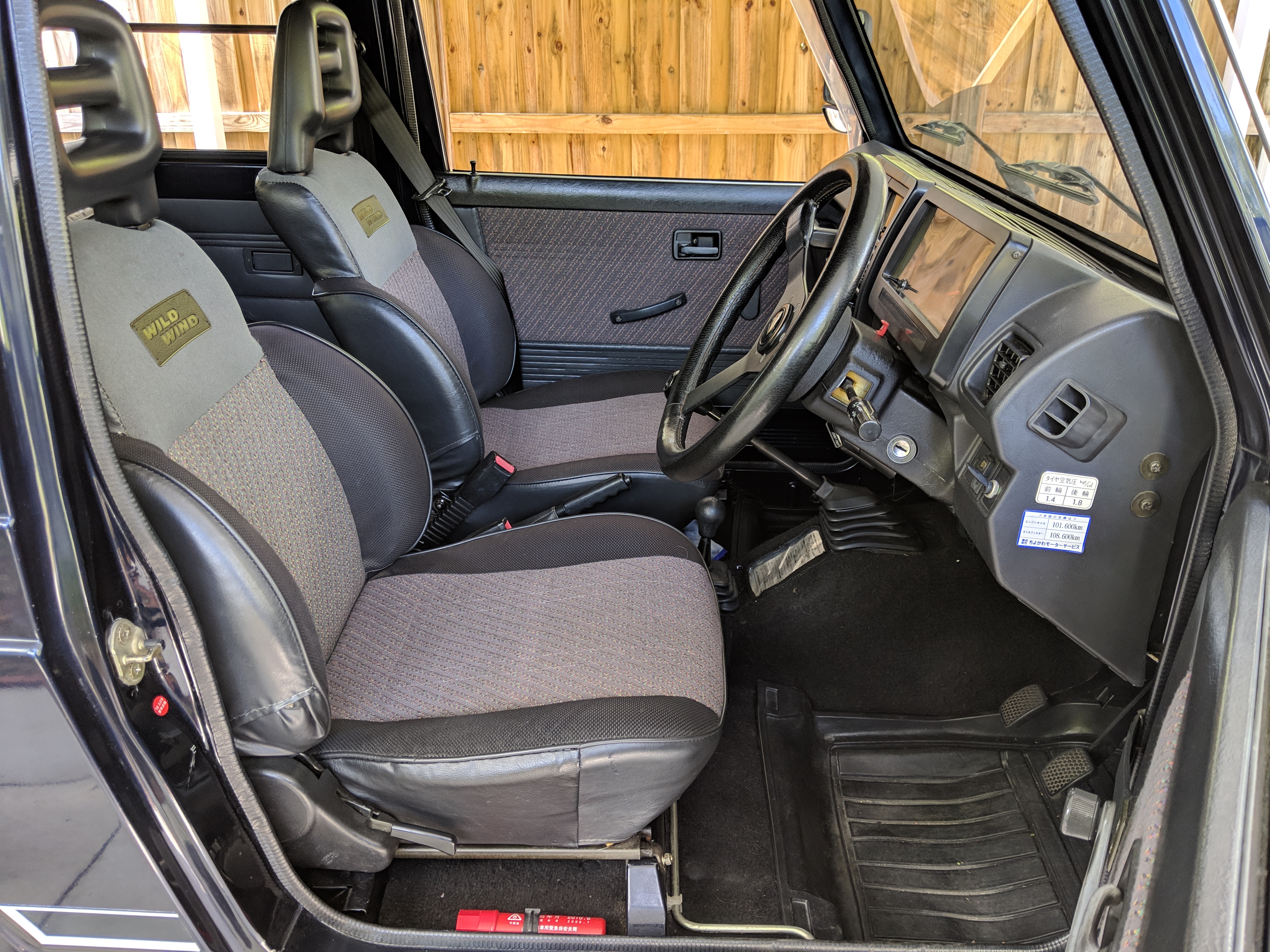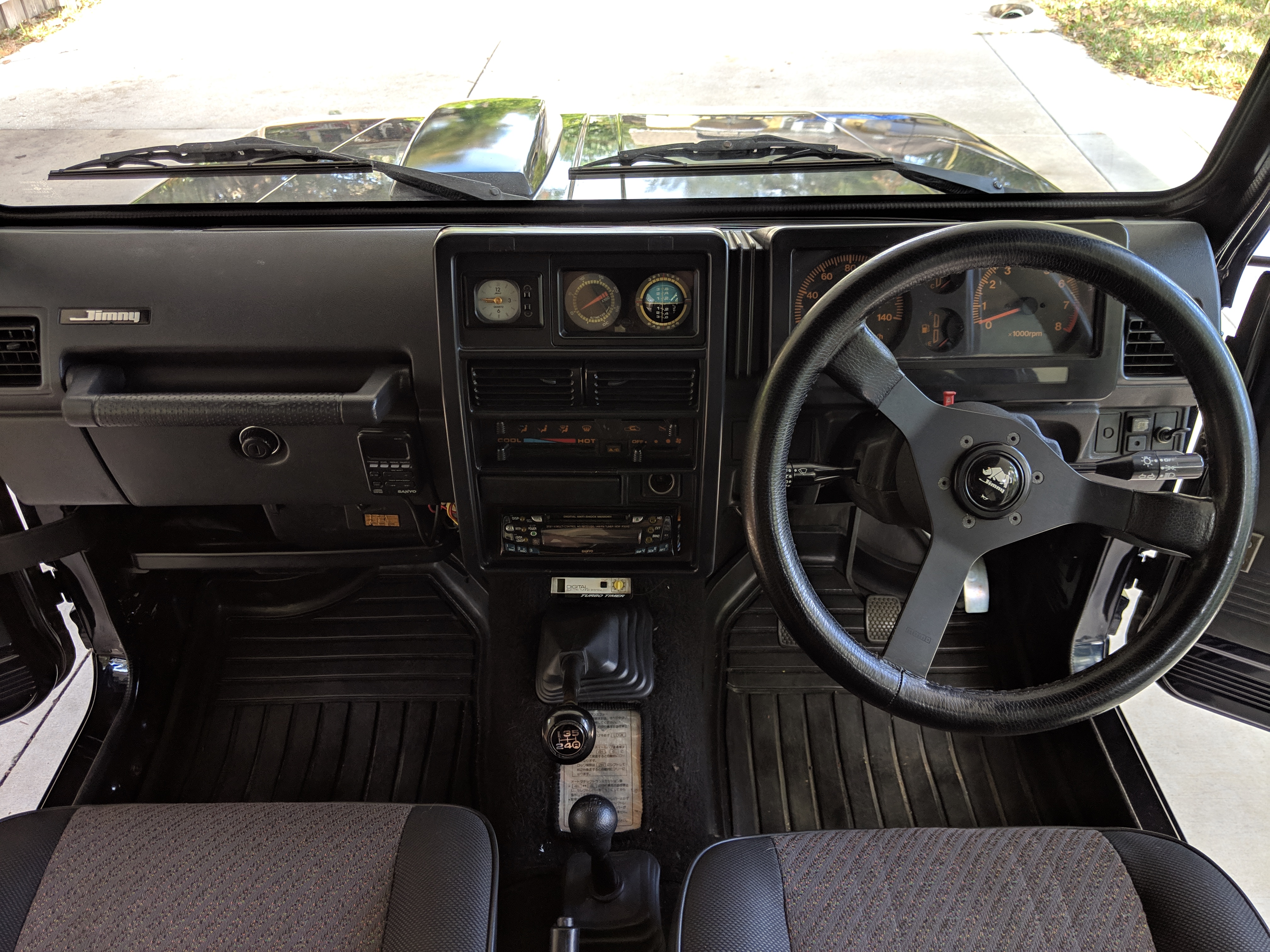 Inside you have a stock interior in fantastic shape. Factory original Jimny MOMO steering wheel with Jimny rhino on the horn and seats that let you know this is a Wild Wind edition. Working original clock, altimeter and clinometer are mounted in the center, with an aftermarket Sony Minidisc headunit installed below. A turbo timer is installed underneath that.