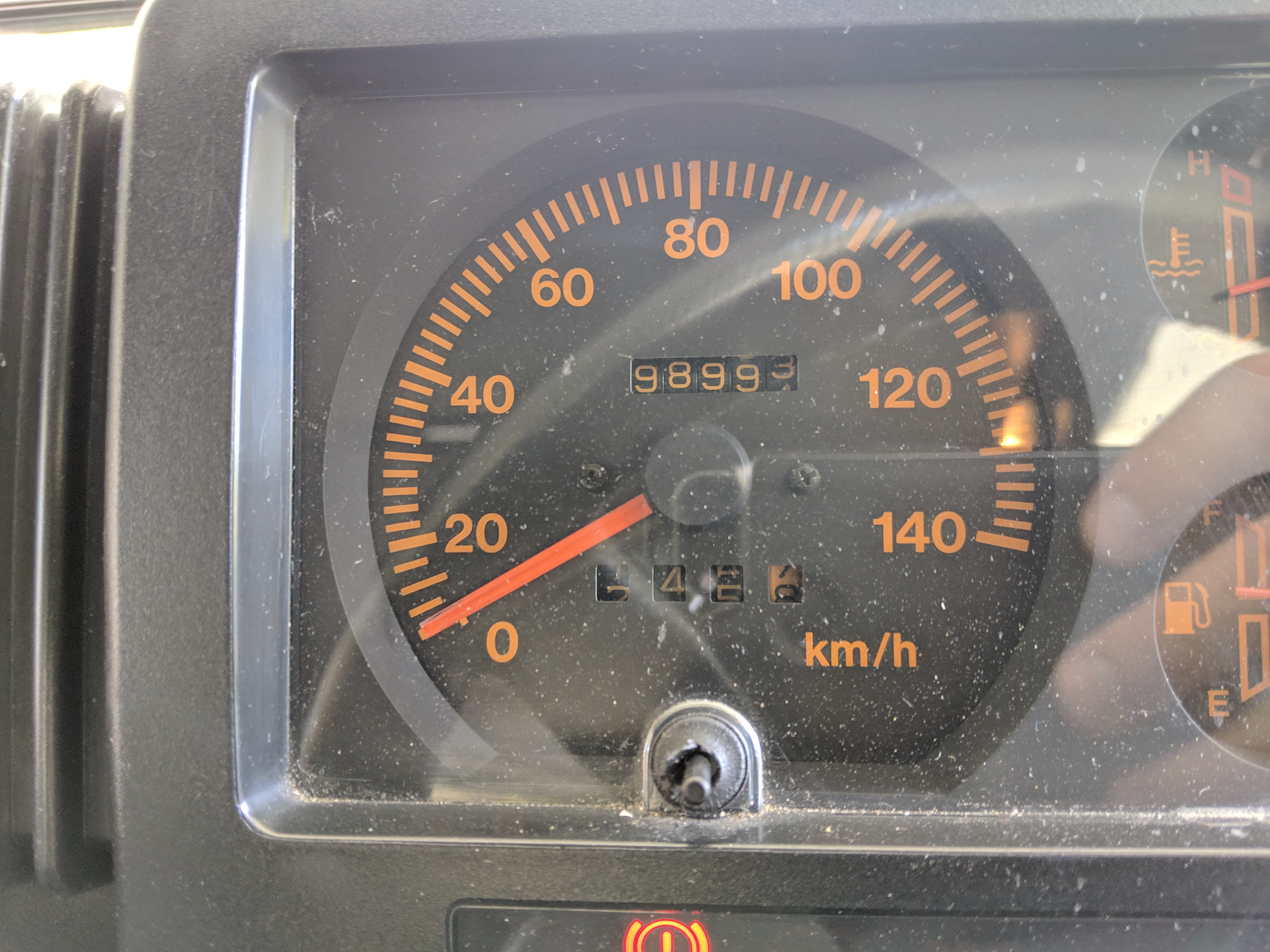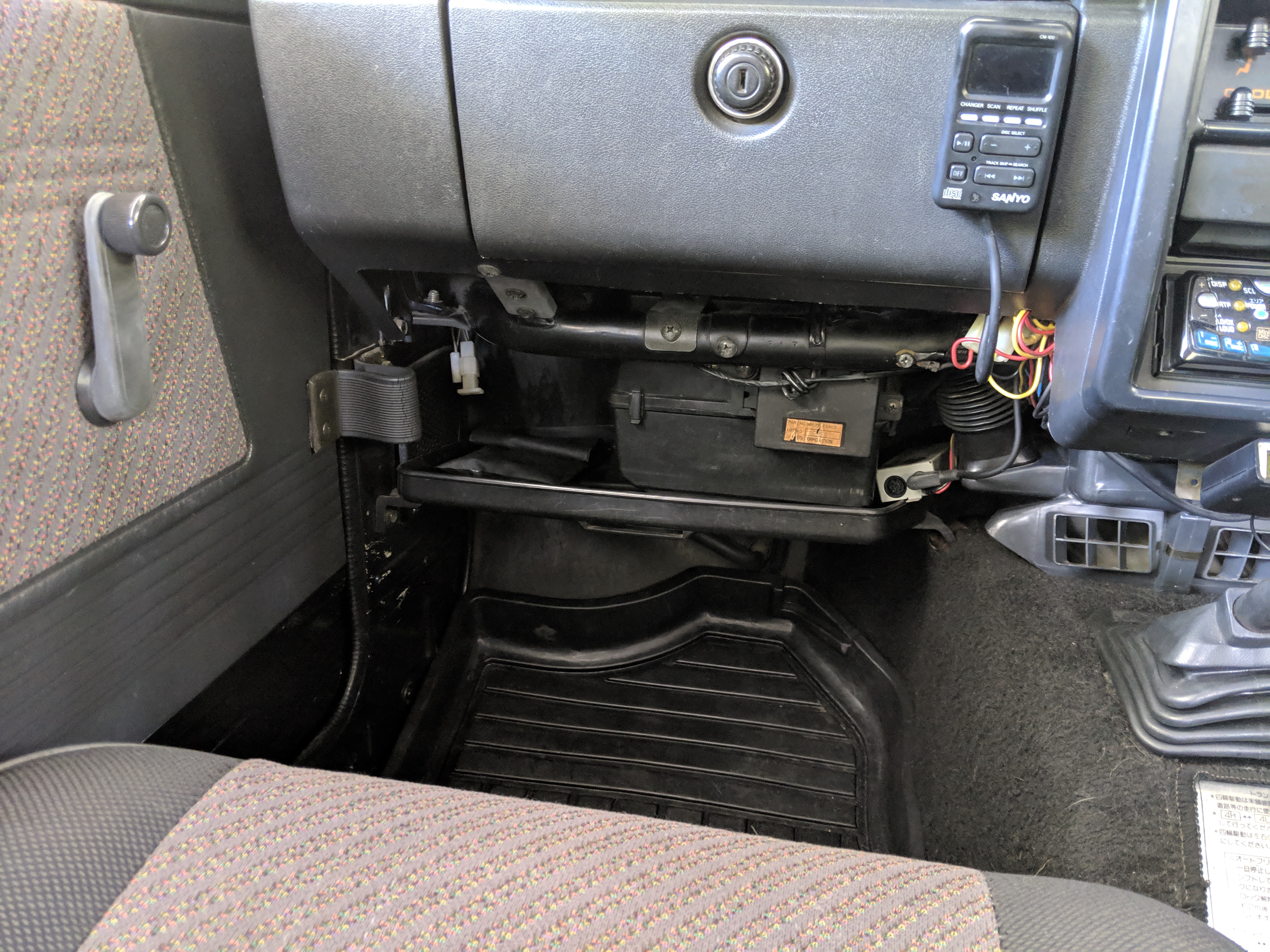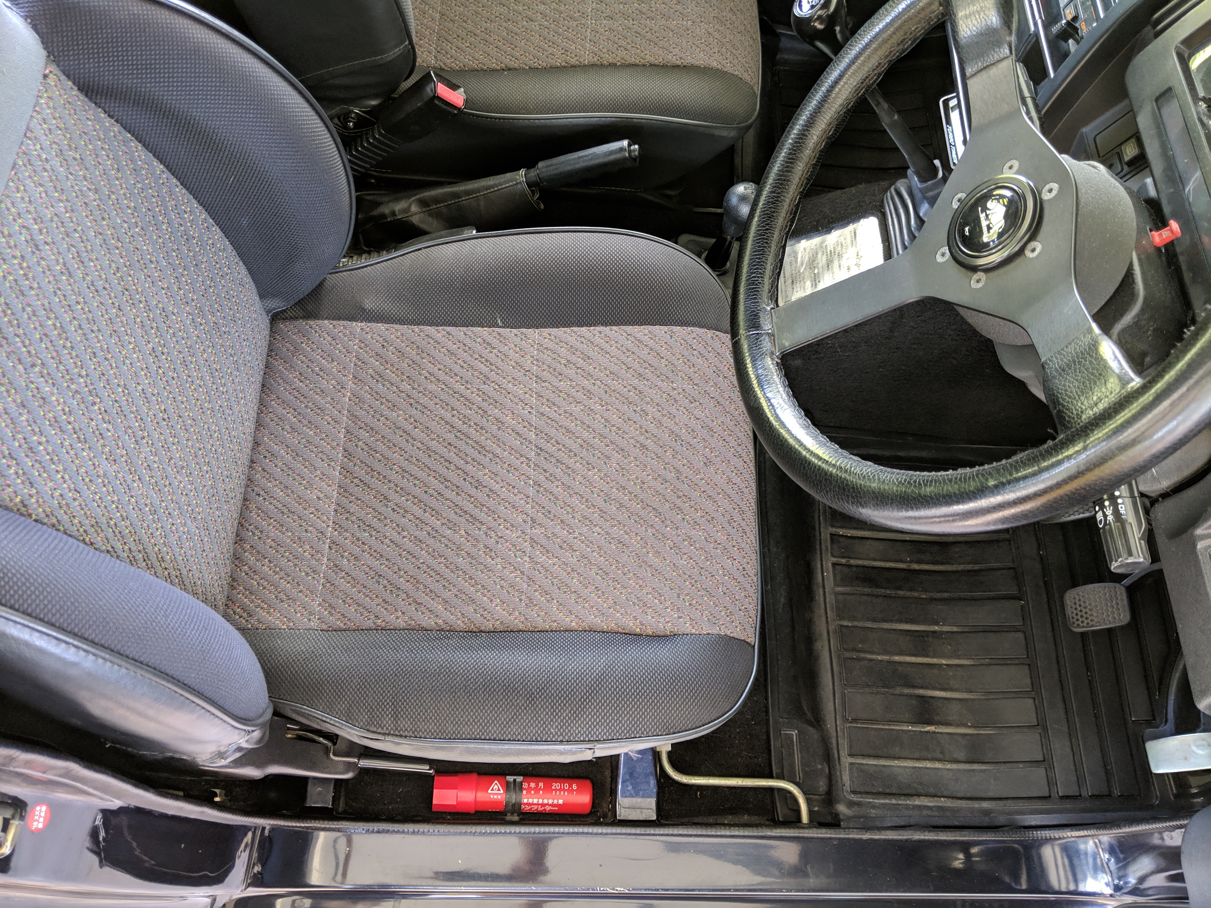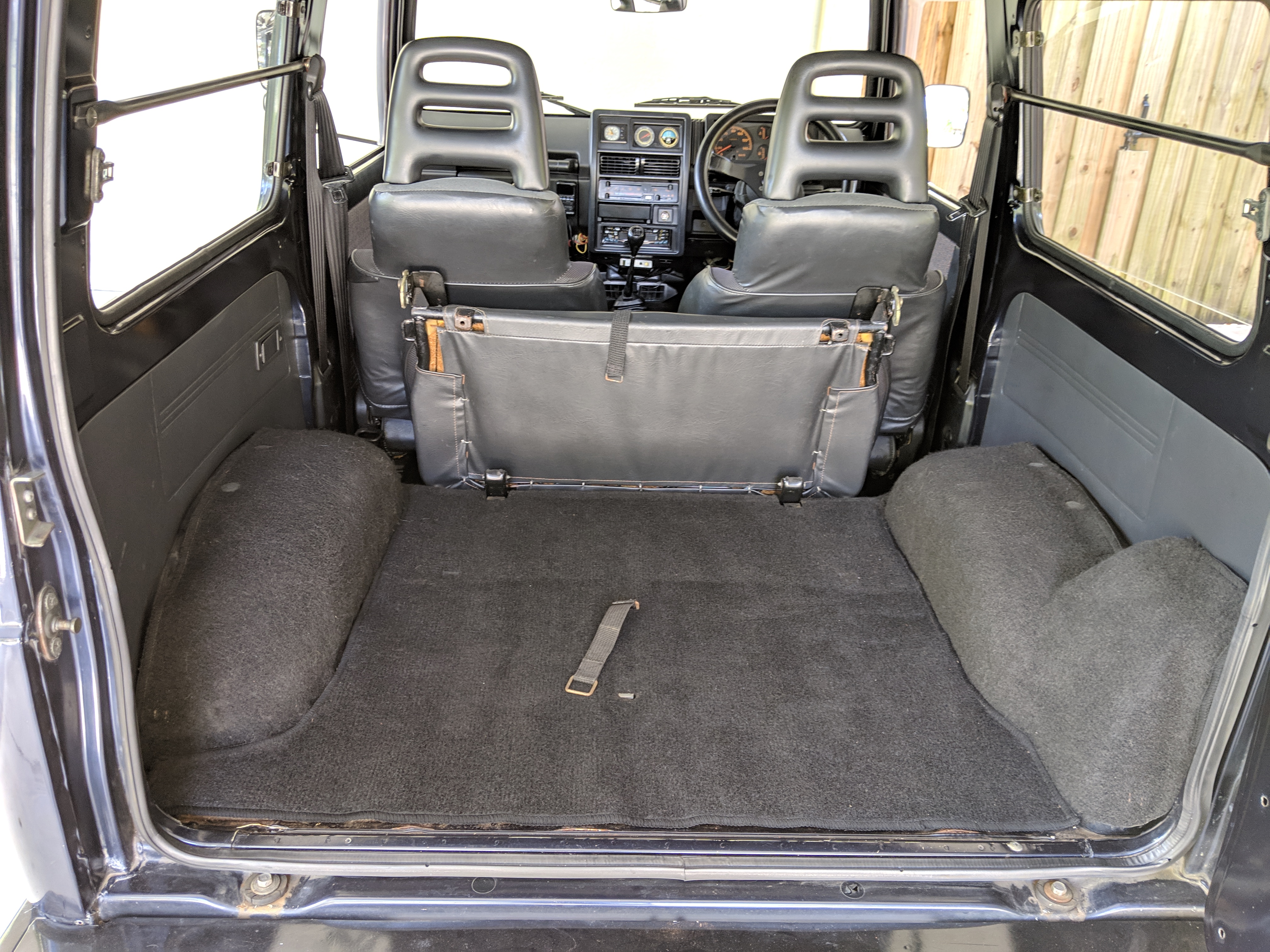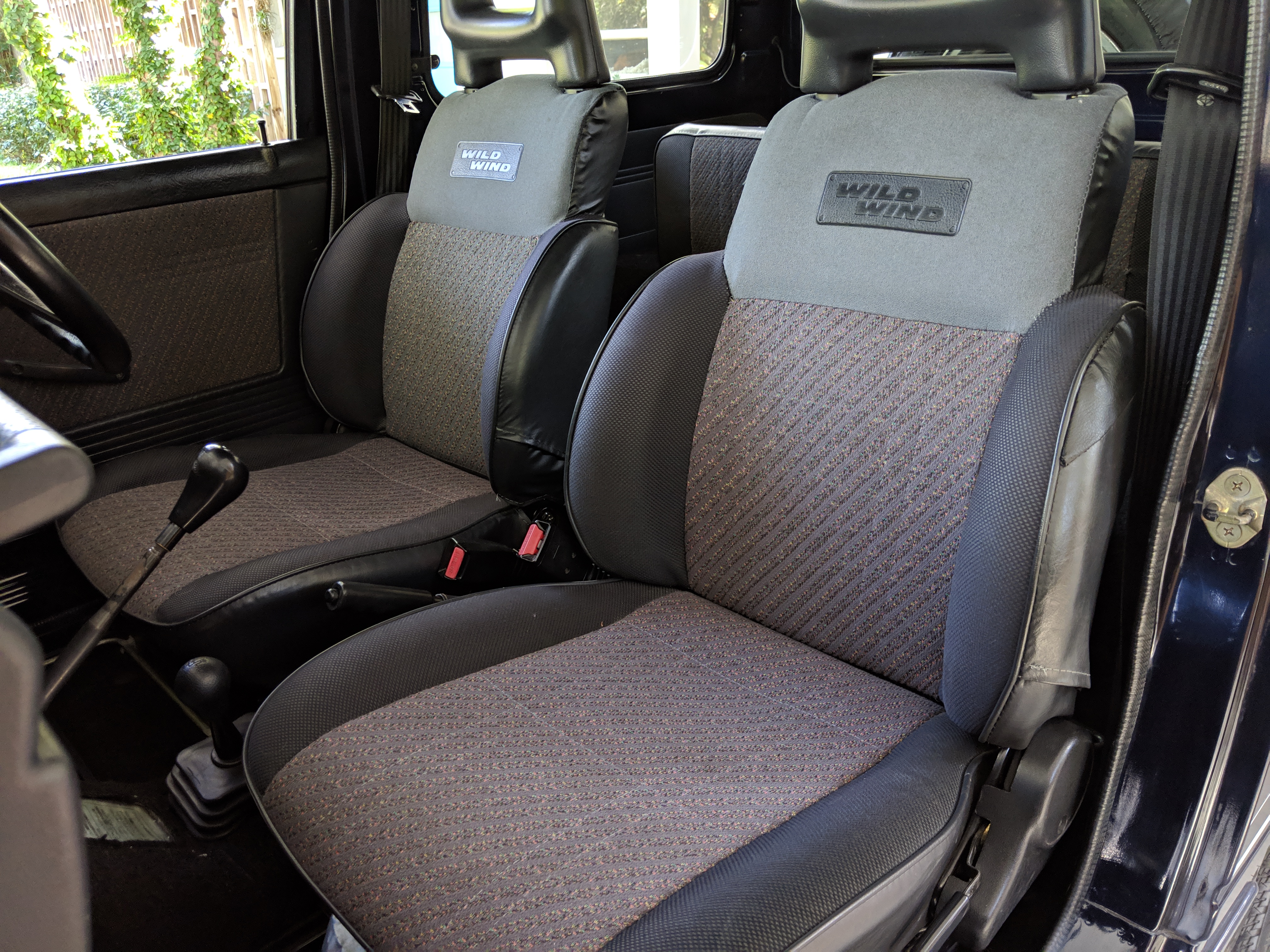 Inside you have a stock interior in fantastic shape. Factory original Jimny MOMO steering wheel with Jimny rhino on the horn and seats that let you know this is a Wild Wind edition. Working original clock, altimeter and clinometer are mounted in the center, with an aftermarket Sony Minidisc headunit installed below. A turbo timer is installed underneath that.