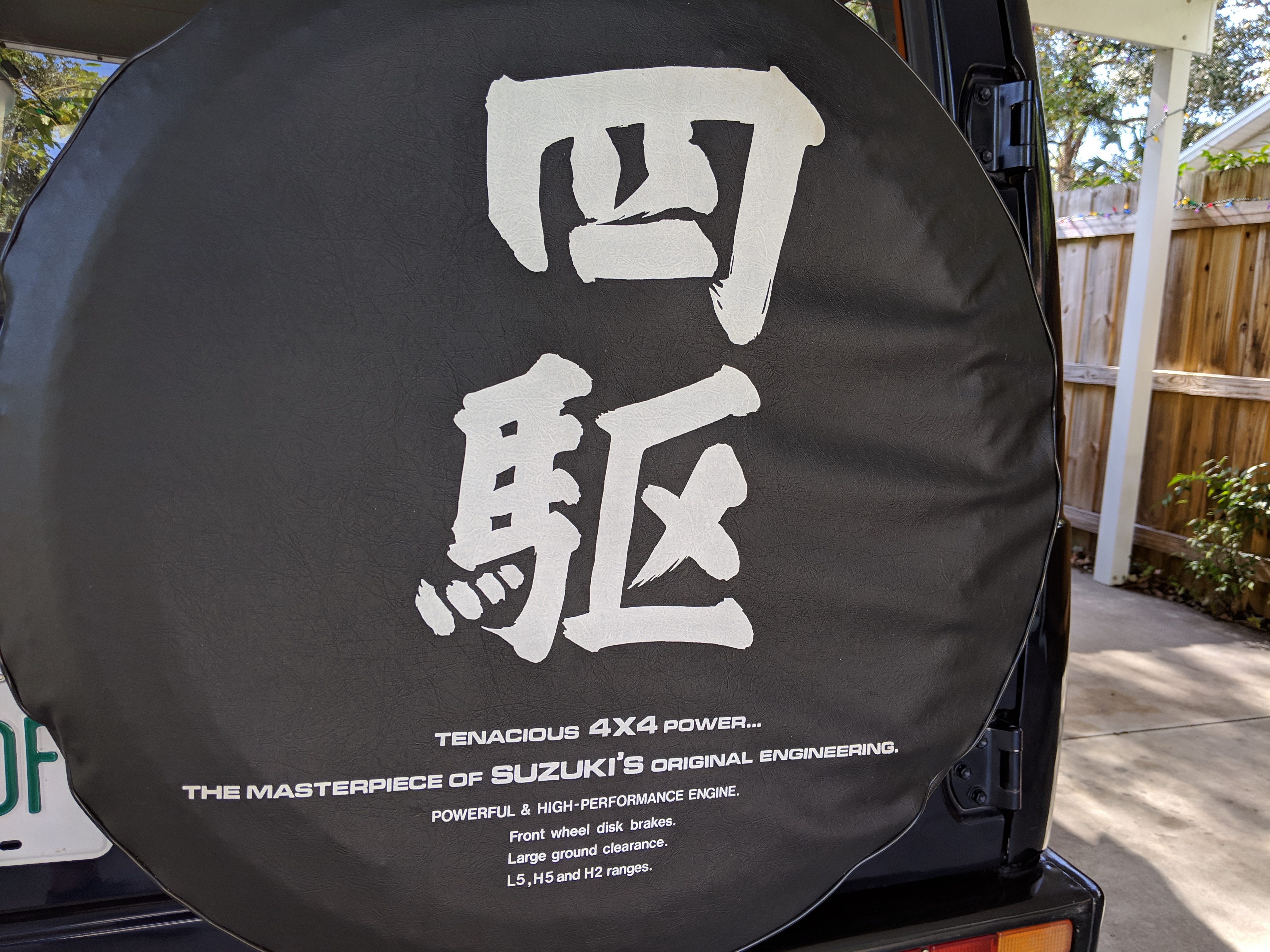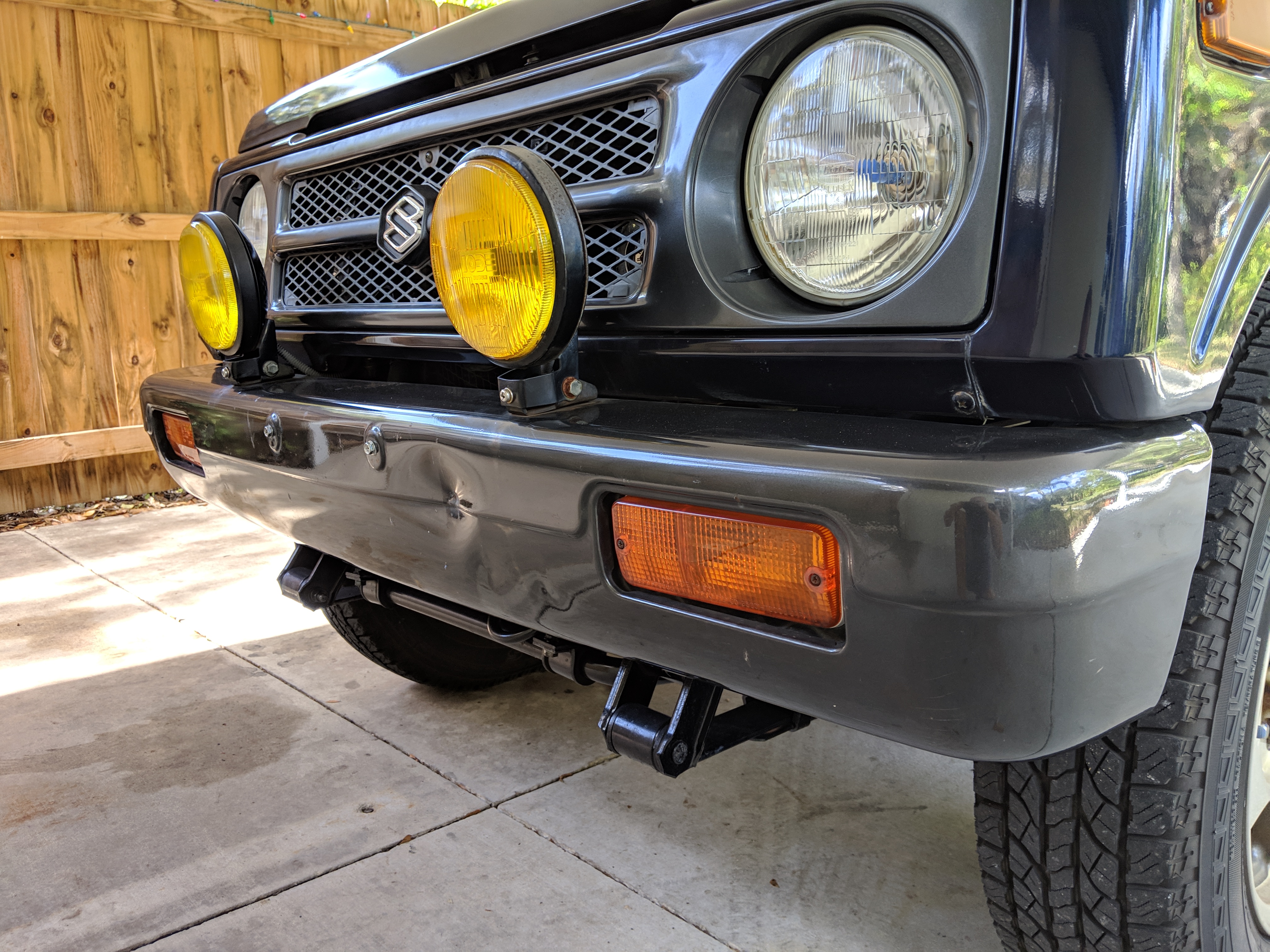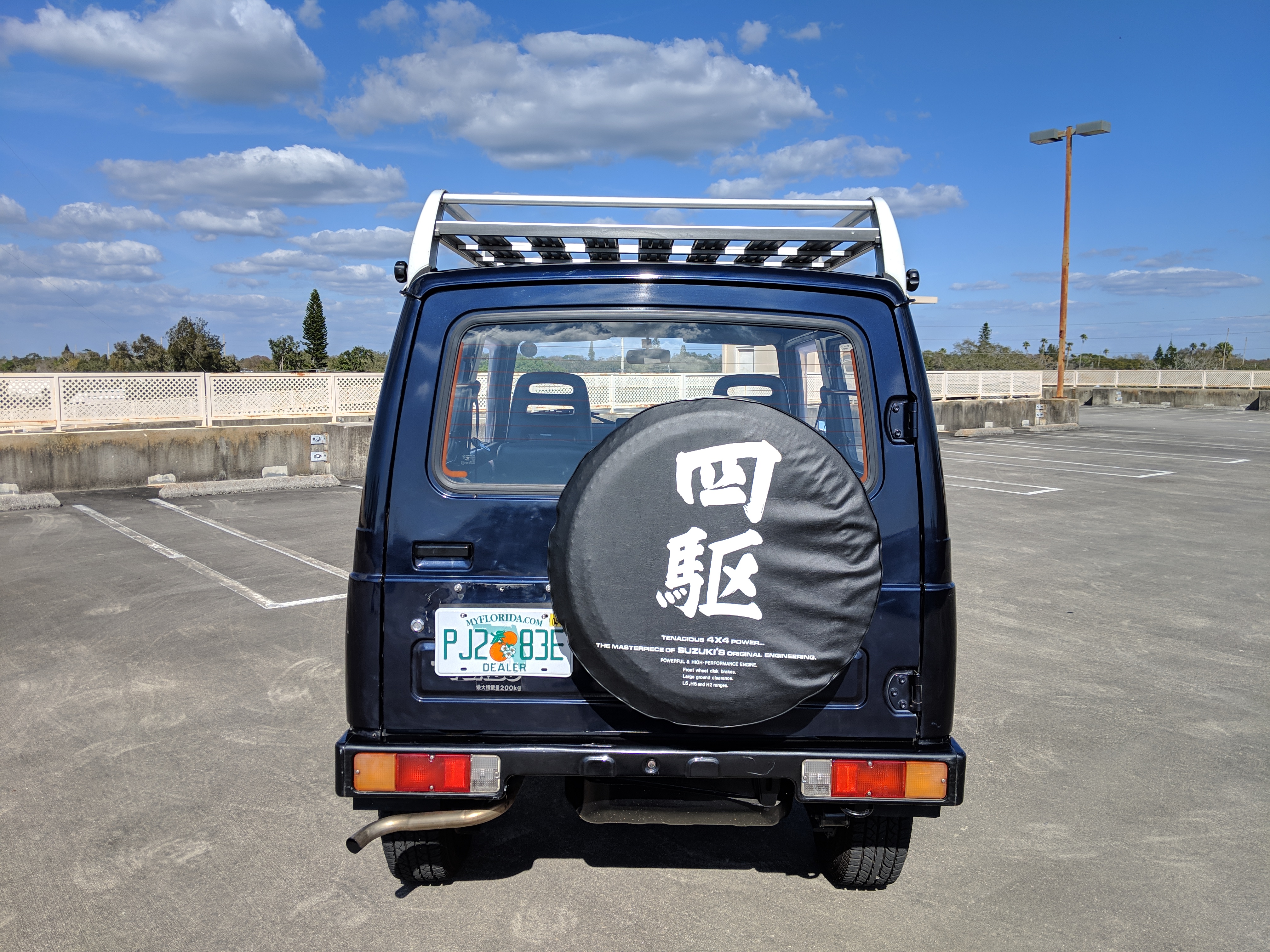 This Jimny is a one-owner vehicle, with a body-on-frame design with sold axles front and back, and leaf springs on all four corners. Low and high range 4x4 with the standard RWD high transfer case, and manual locking front hubs. The transmission itself is a 5 speed affair that will get you to 65 MPH without issue. Factory fog lights sit on the front bumper with an OEM aluminium luggage rack from Suzuki on the roof. Killer 'Tenacious 4x4 power...' tire cover on the spare, factory original alloy wheels finish it off. It also has power steering. Has its original alloy wheels. Color is somewhere between purple and blue.