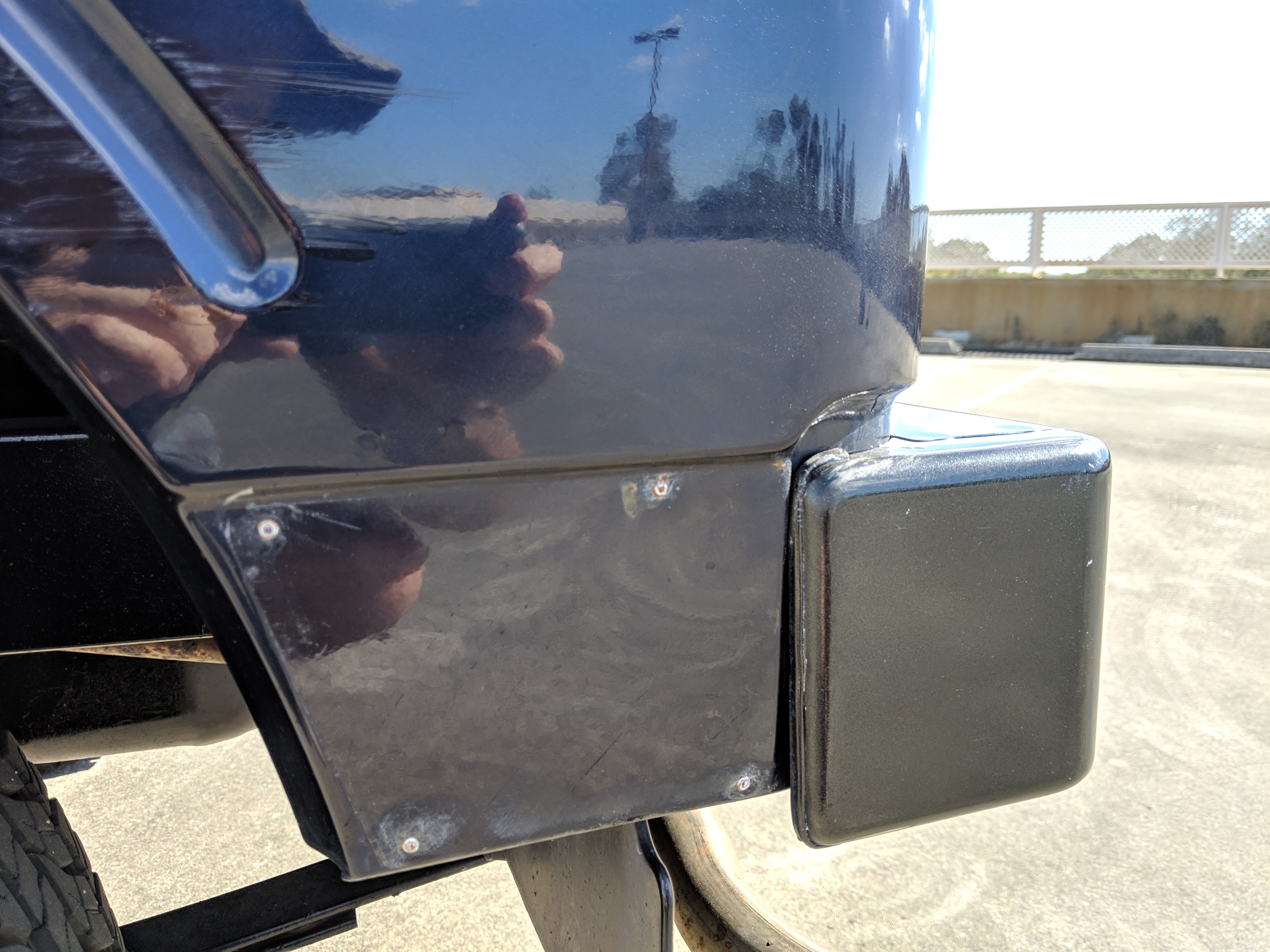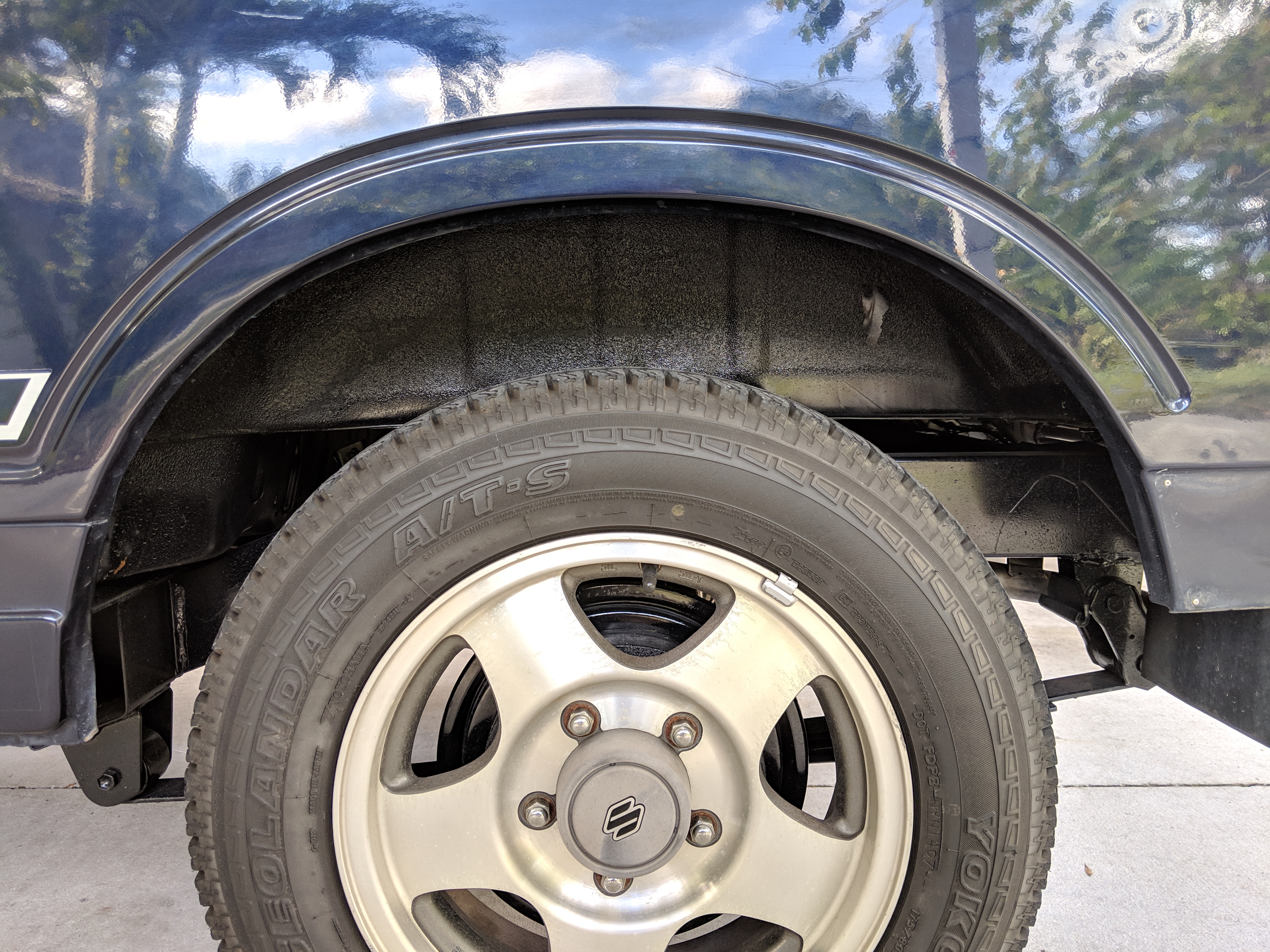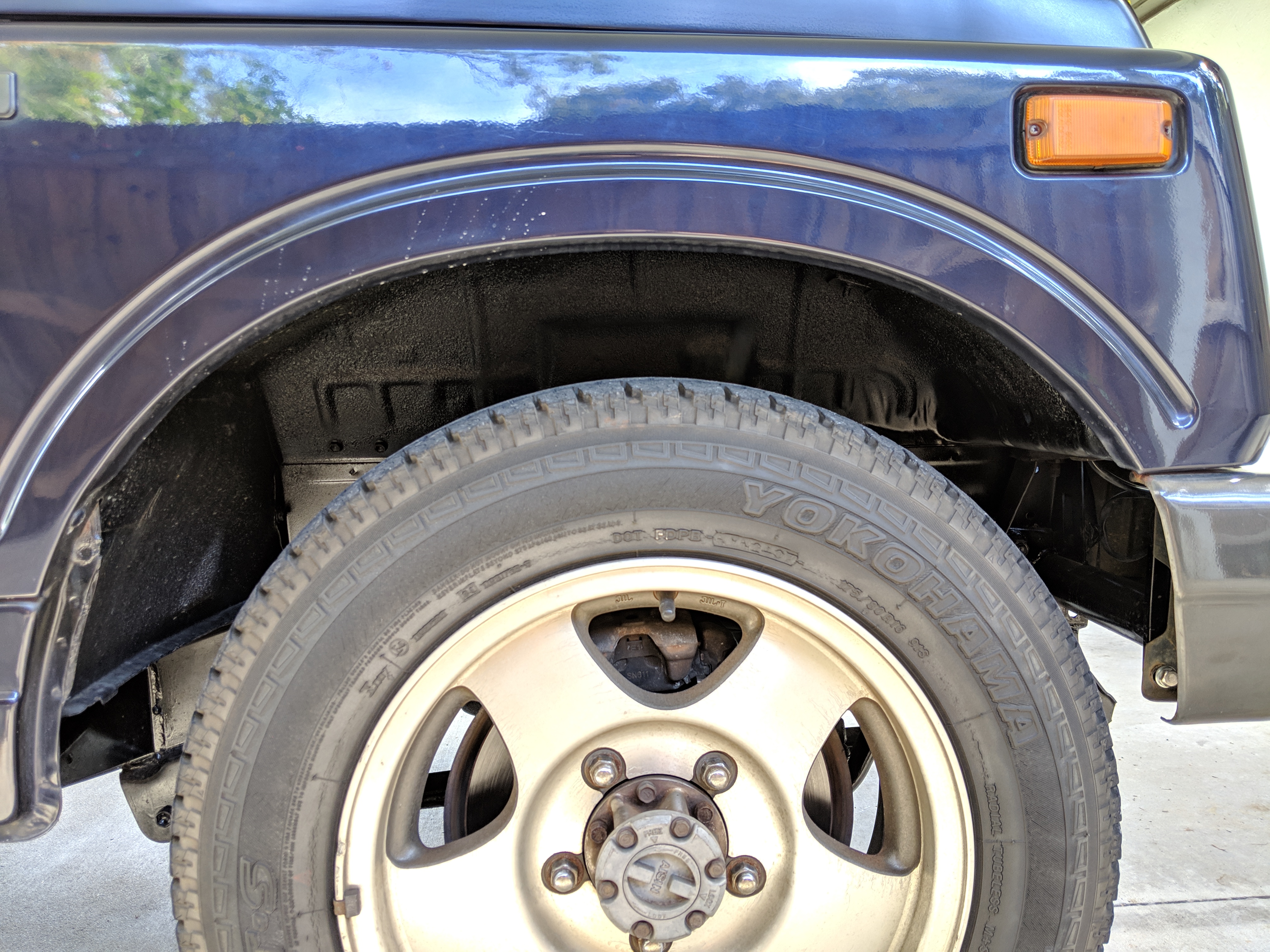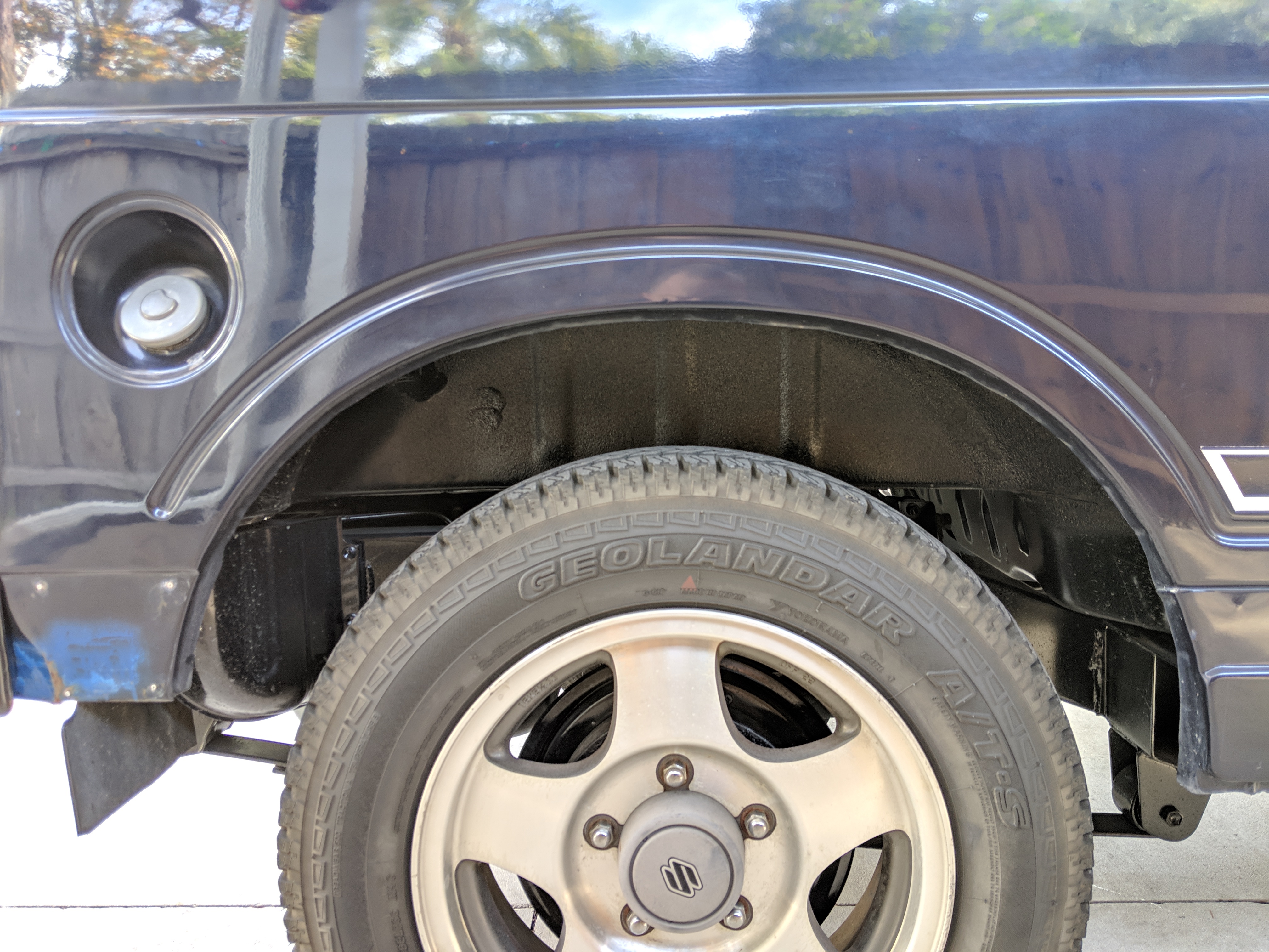 This Jimny is a one-owner vehicle, with a body-on-frame design with sold axles front and back, and leaf springs on all four corners. Low and high range 4x4 with the standard RWD high transfer case, and manual locking front hubs. The transmission itself is a 5 speed affair that will get you to 65 MPH without issue. Factory fog lights sit on the front bumper with an OEM aluminium luggage rack from Suzuki on the roof. Killer 'Tenacious 4x4 power...' tire cover on the spare, factory original alloy wheels finish it off. It also has power steering. Has its original alloy wheels. Color is somewhere between purple and blue.