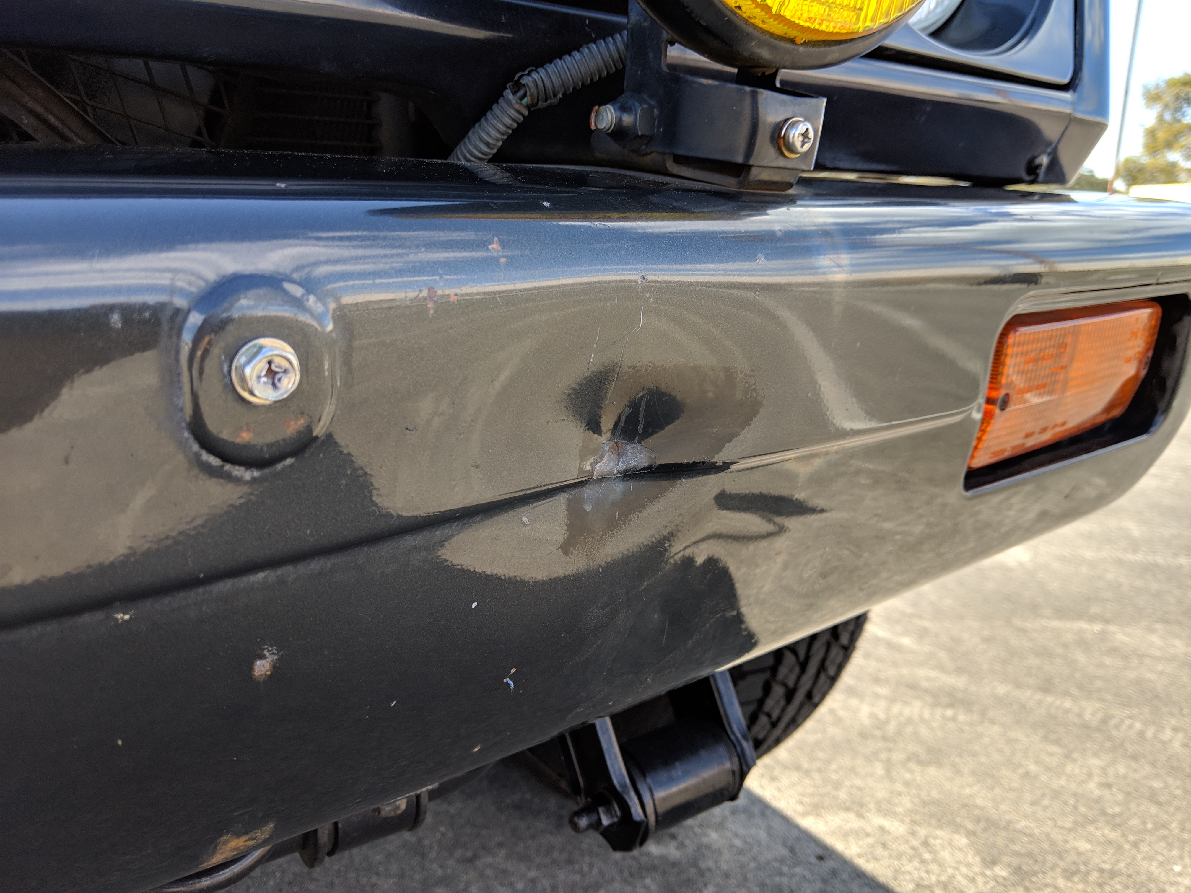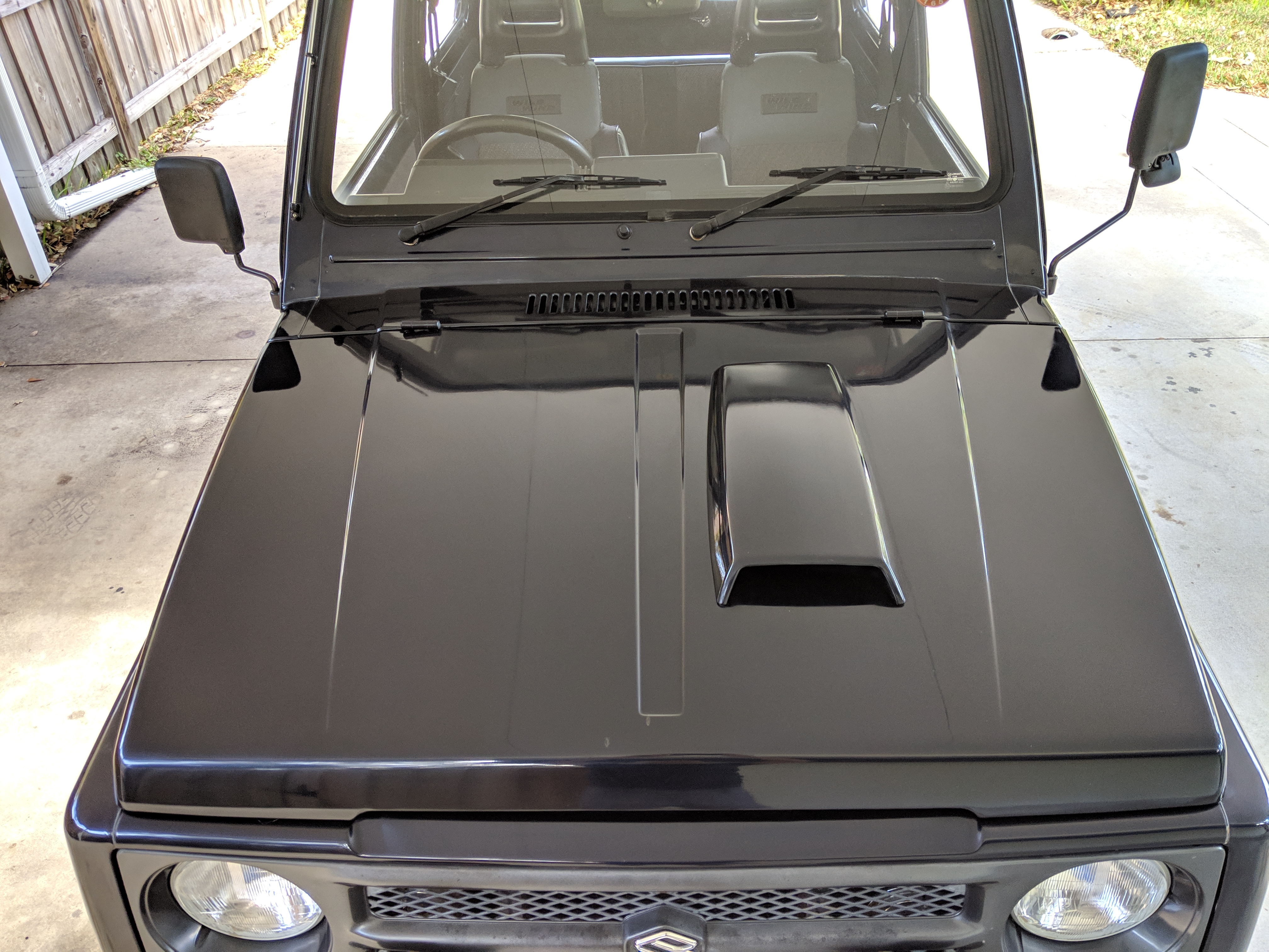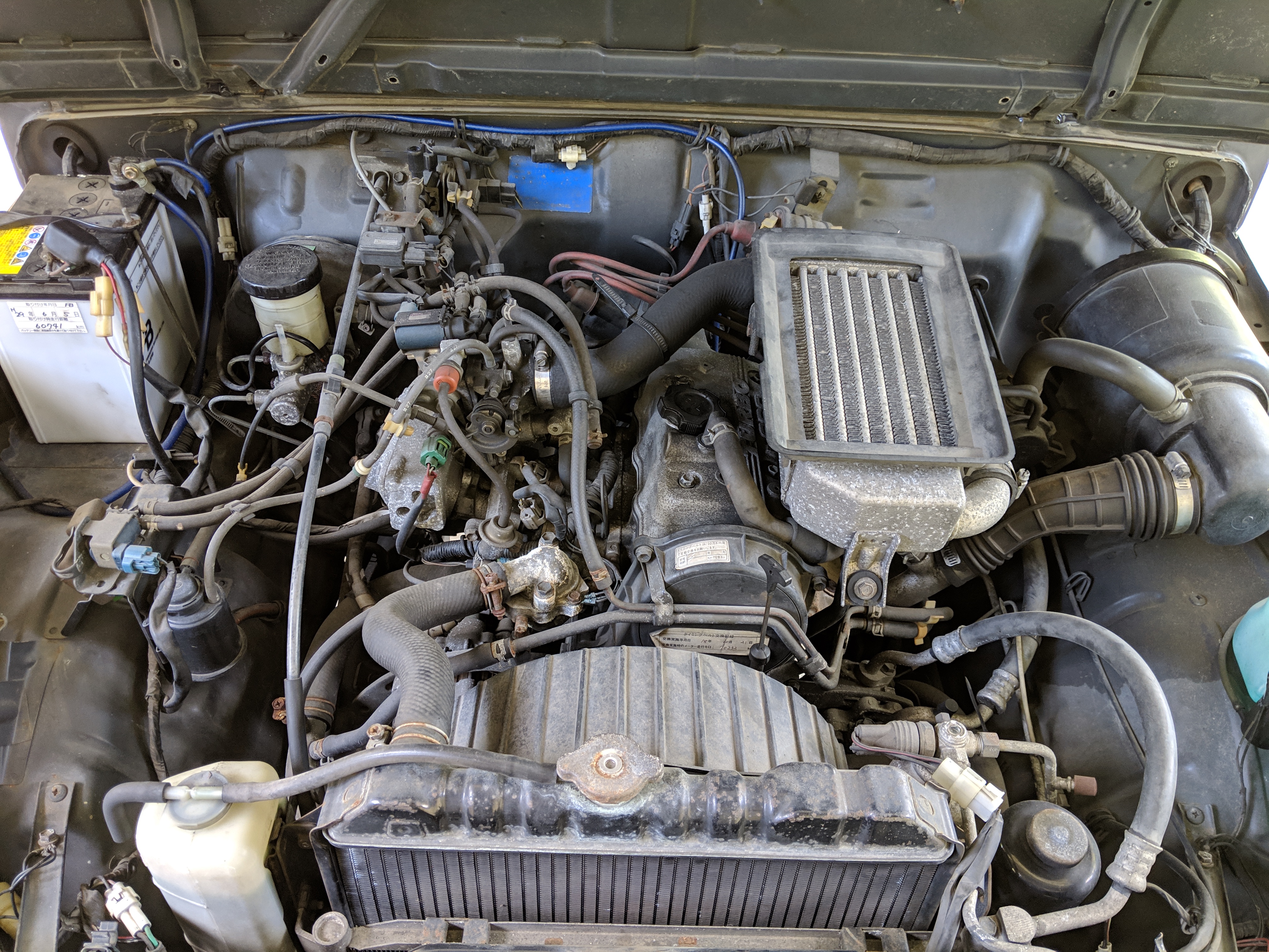 Being that it is a kei class vehicle from Japan it is equipped with a turbocharged 3cyl engine with a top mounted intercooler, hence the functional hoodscoop. While its displacement is only 660cc, the turbo charging gives it a sharp boost of power under acceleration you wouldn't expect compared to a typical Samurai.