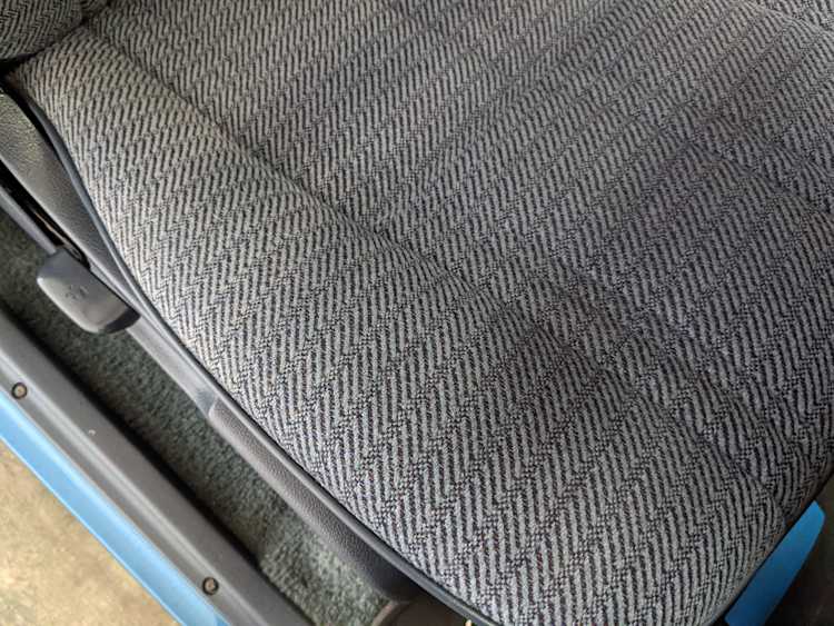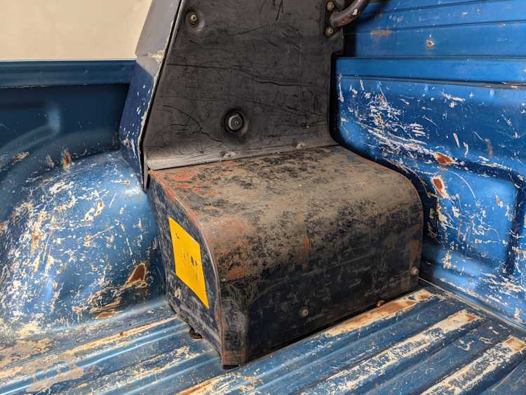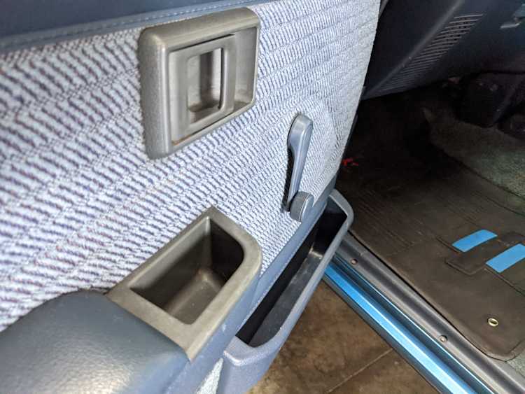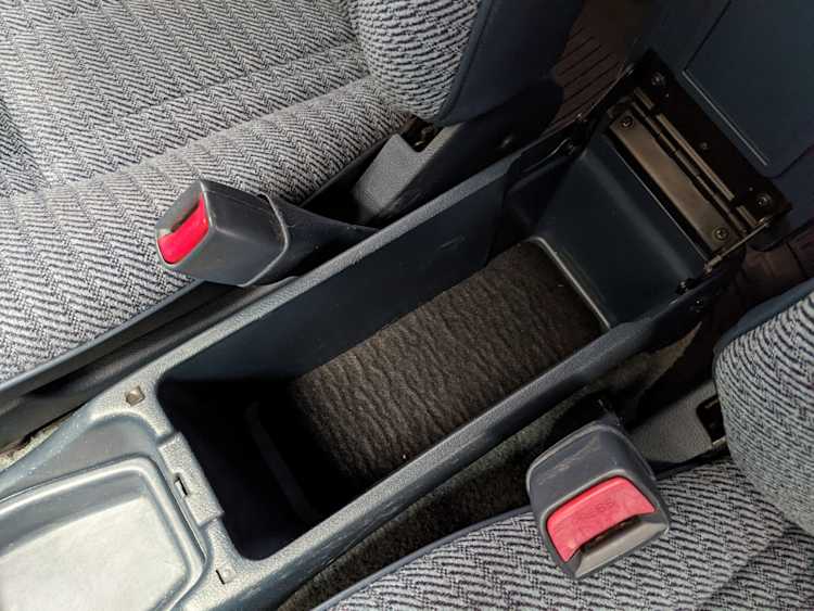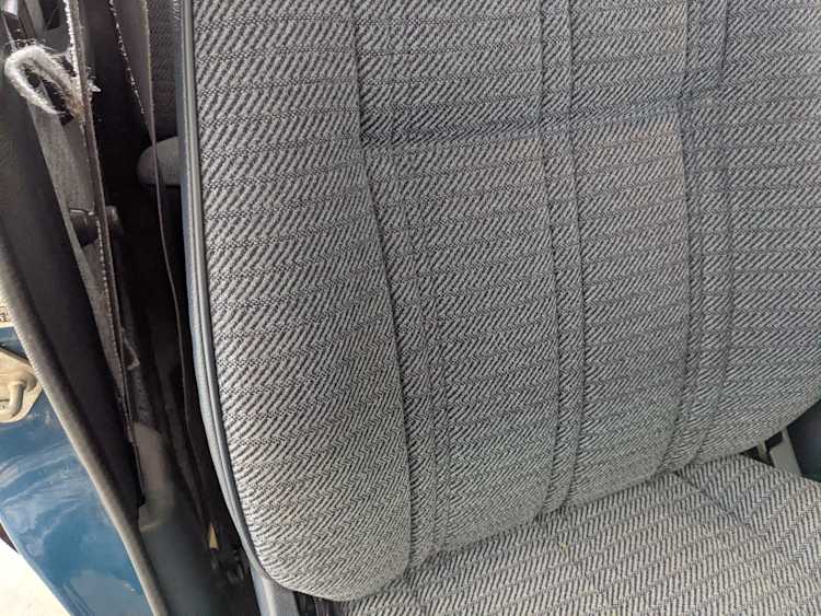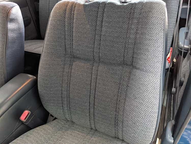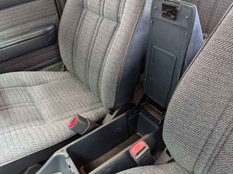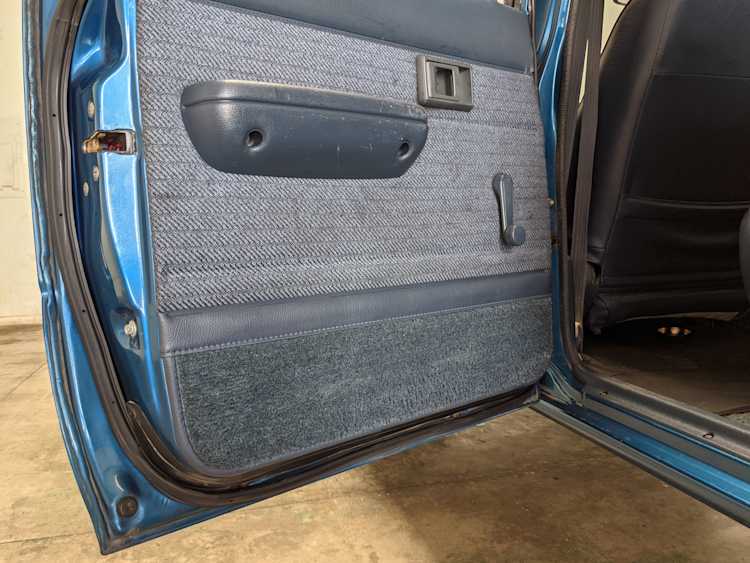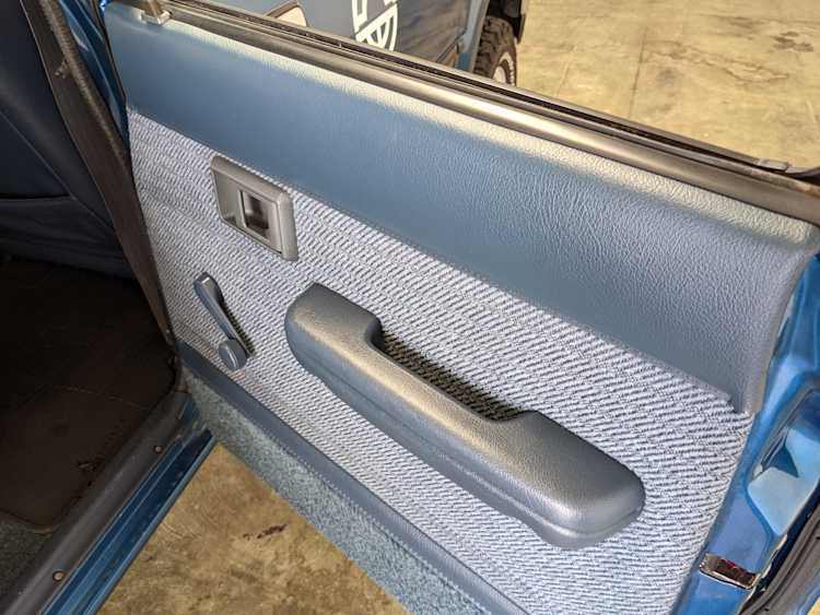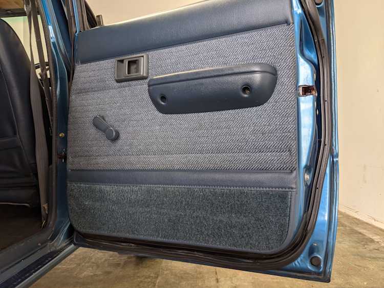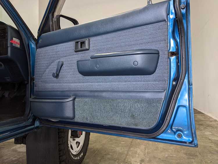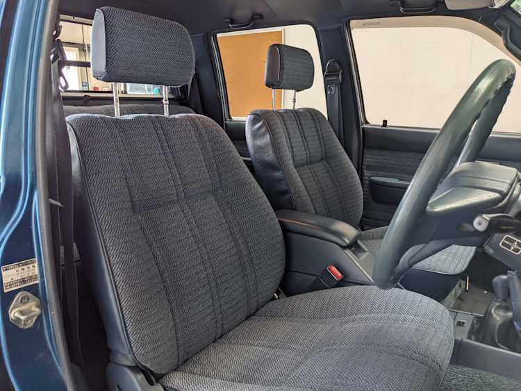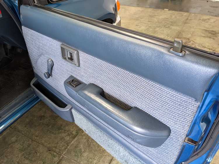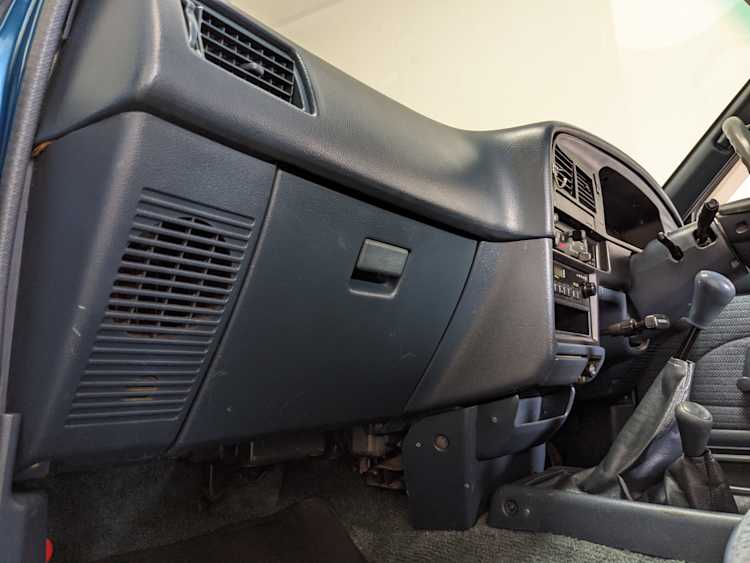 Interior is actually remarkably sorted for being a former construction truck from 1992. Non smoker (if you can believe it!), with the benefit of thick vinyl seat covers being on it since new (since removed), allowing the great blue fabric covering the seats to survive. Original radio is still installed, with the OEM single speaker over on the driver’s side. No cracks in the dash, no tears in the seat, no burns anywhere.
