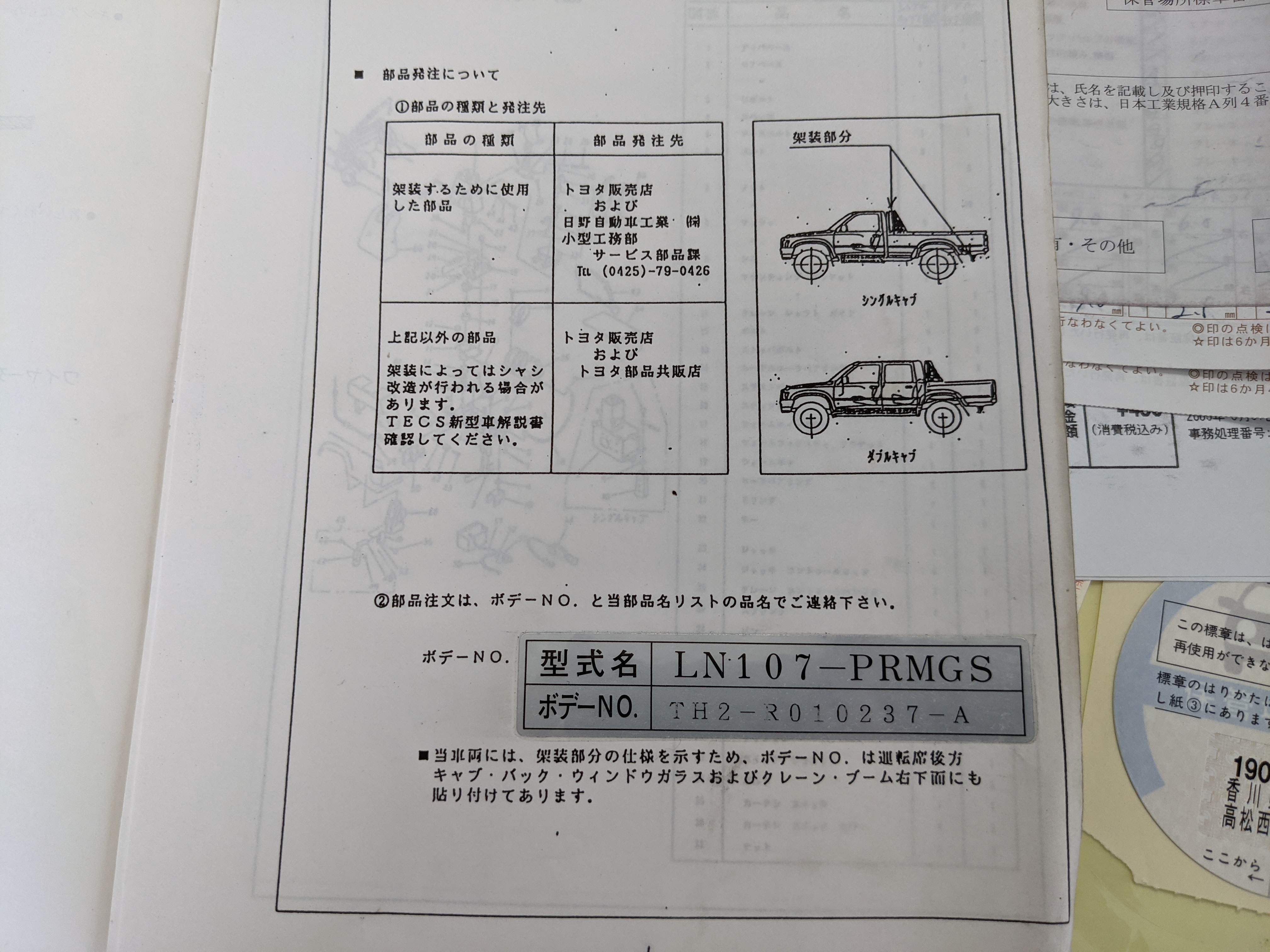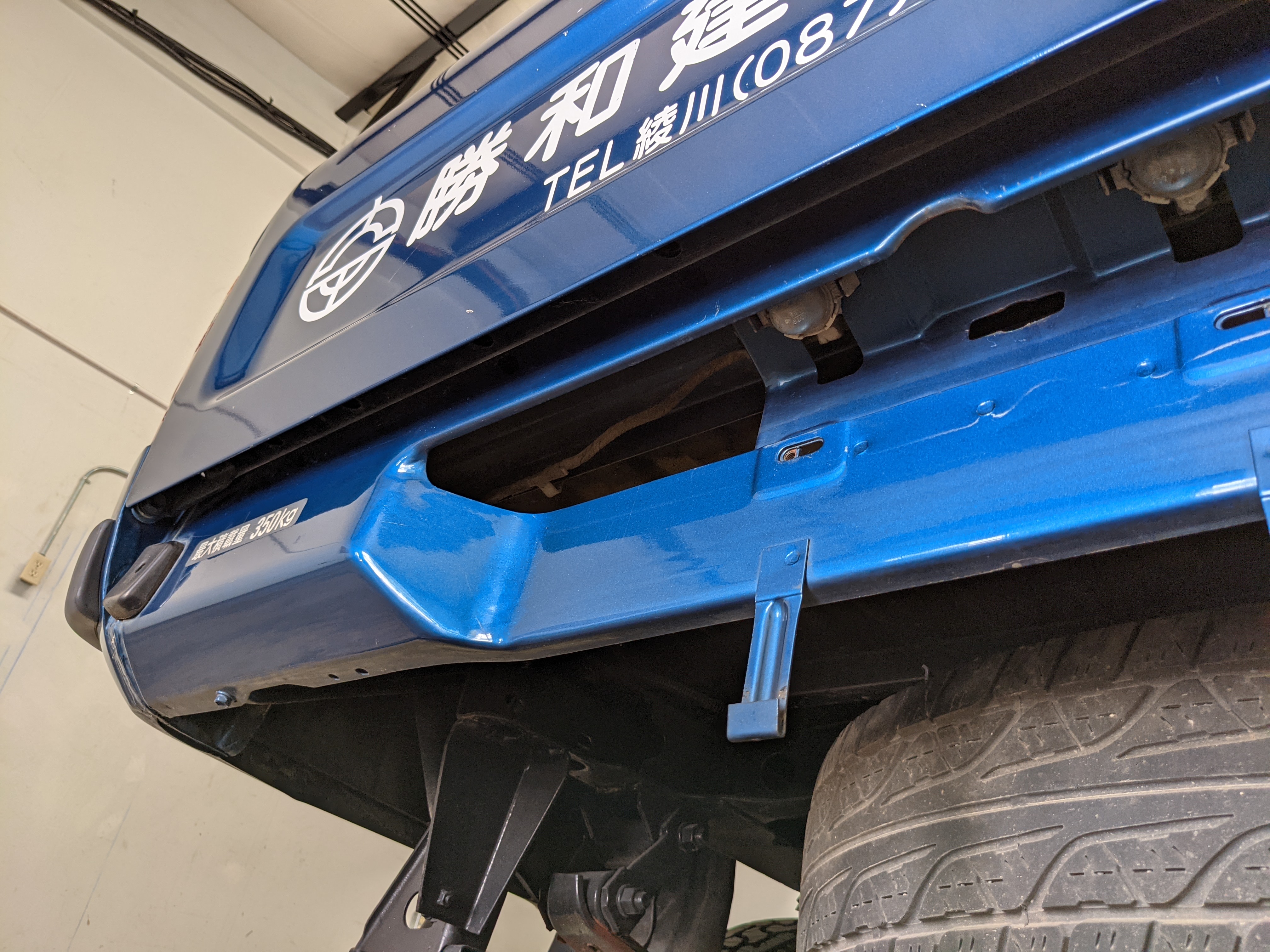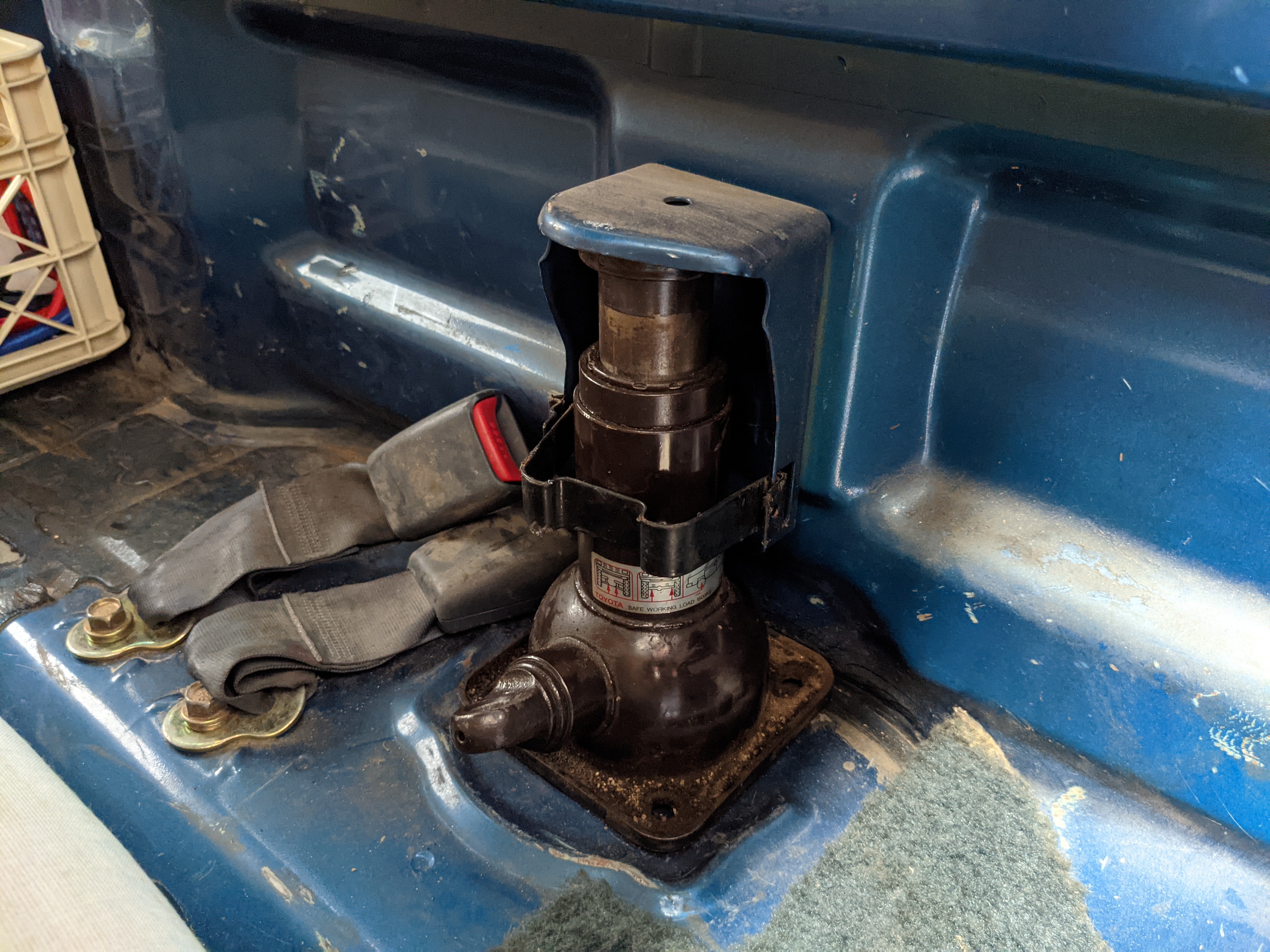 ‘Active Base’ is a Toyota-designated package that is applied to the trucks equipped with the unique crane system in the bed. Looks like a roll bar when stowed away, but hides a manually adjusted, electrically actuated crane capable of lifting 180-450 kg (396- 992 pounds) depending on angle and rotation of the boom. Toolkit behind the rear seat includes a few unique pieces as well including a metal L-bracket that adapts the standard bottle back to a quasi-outrigger connecting to a unique chassis portion on the rear left of the truck under the bed.