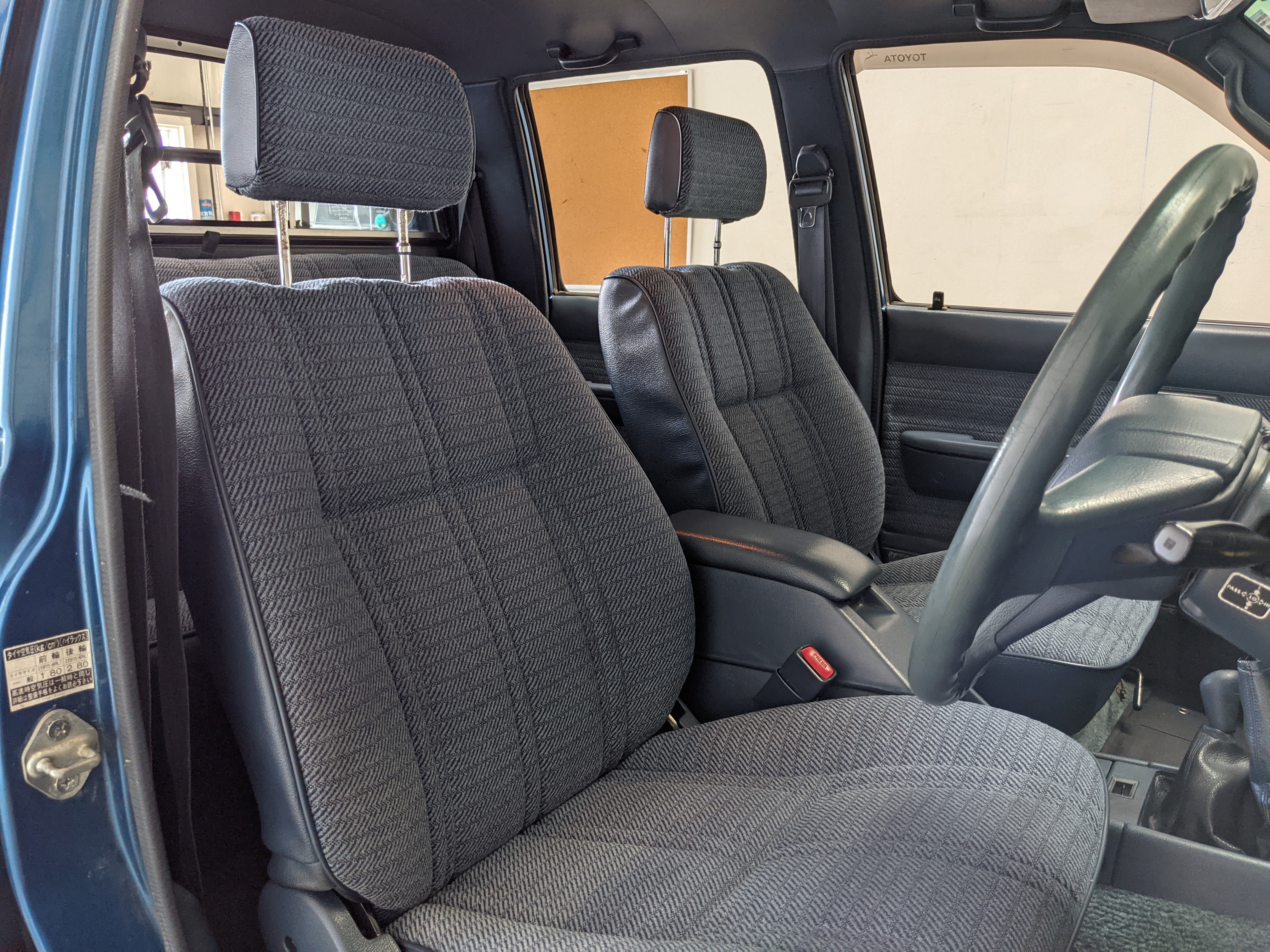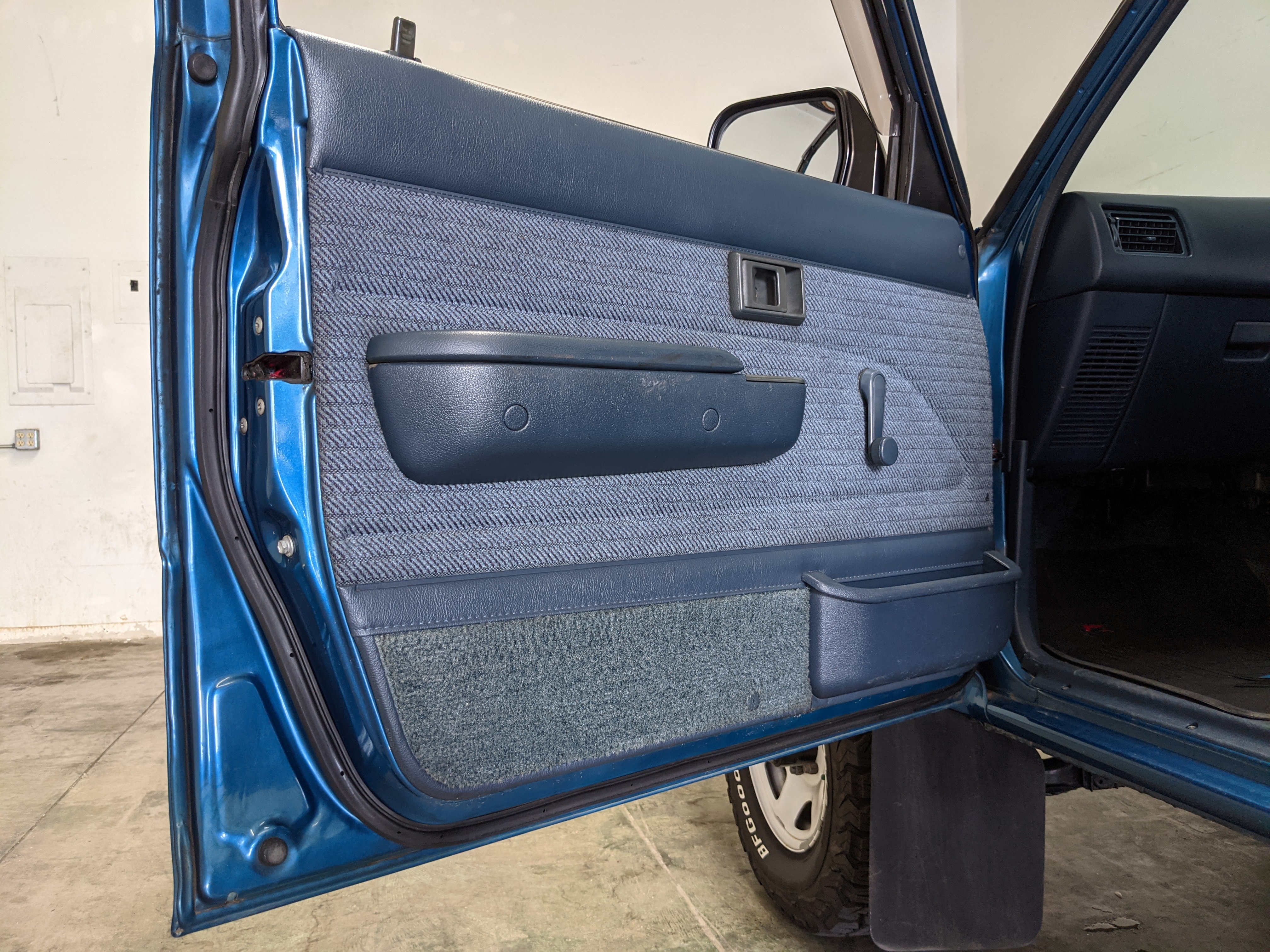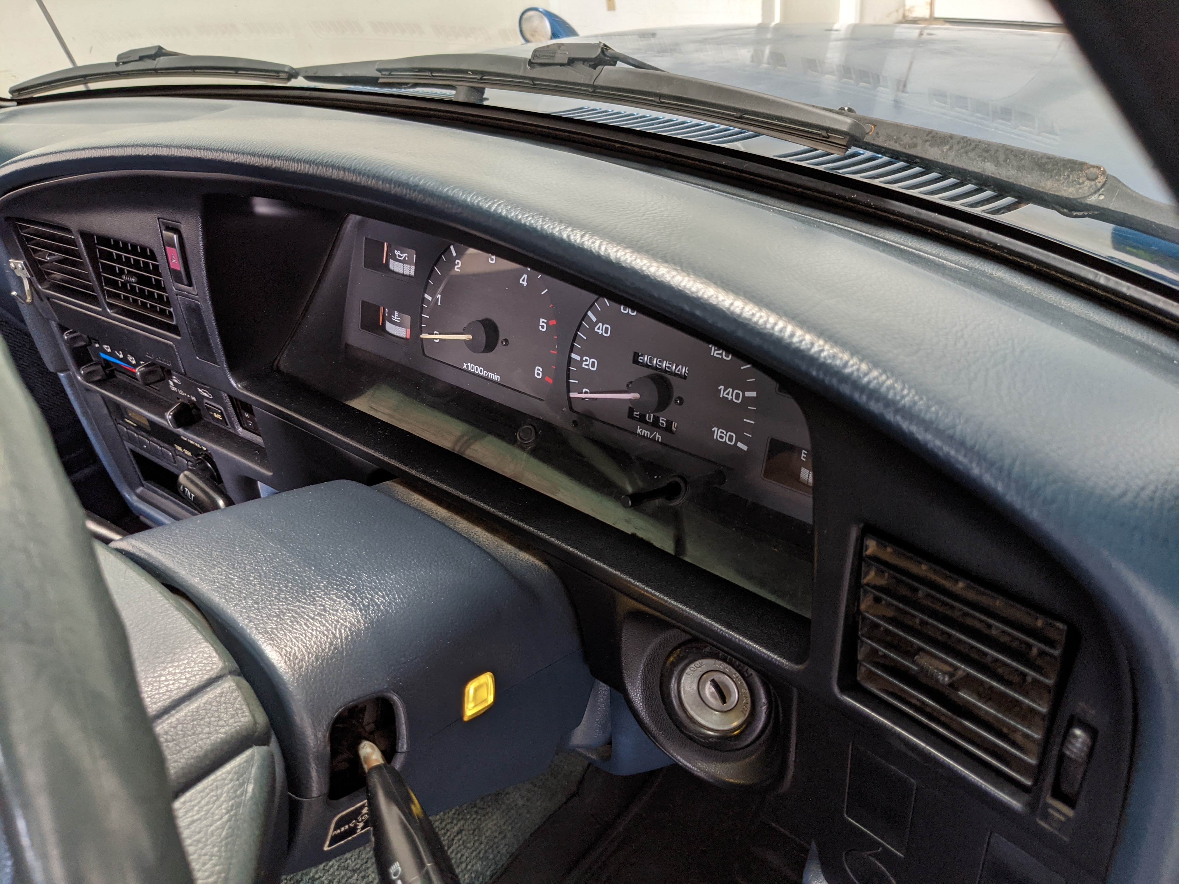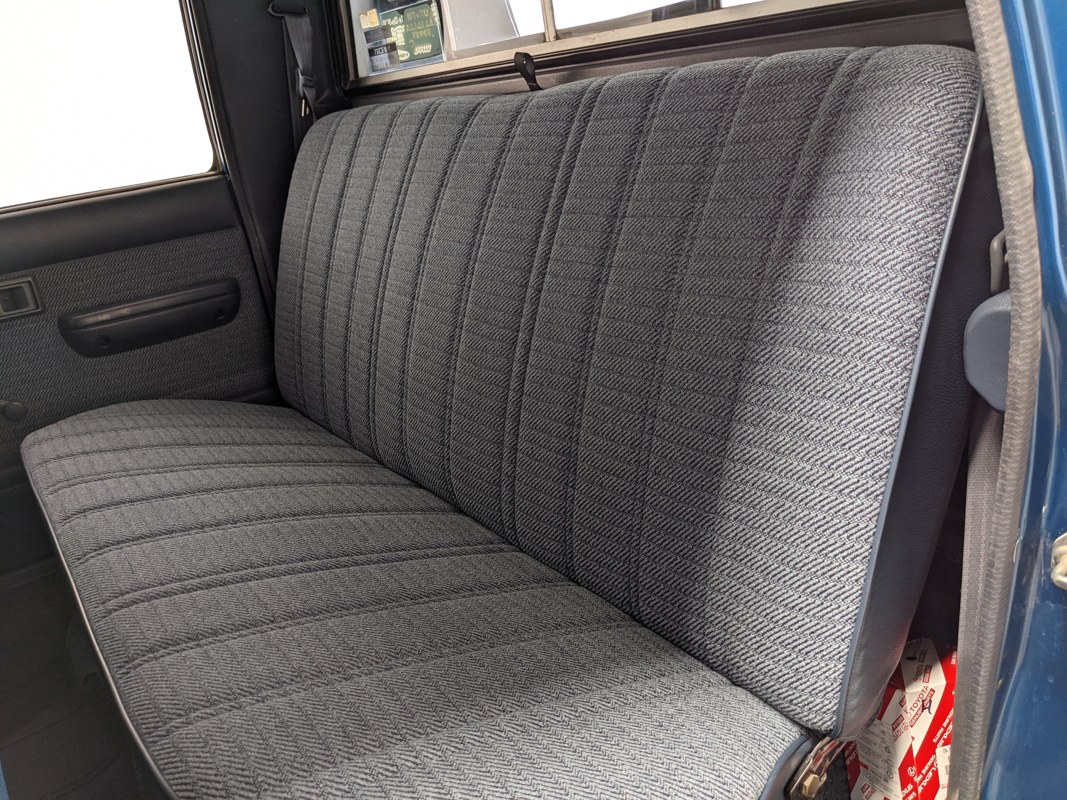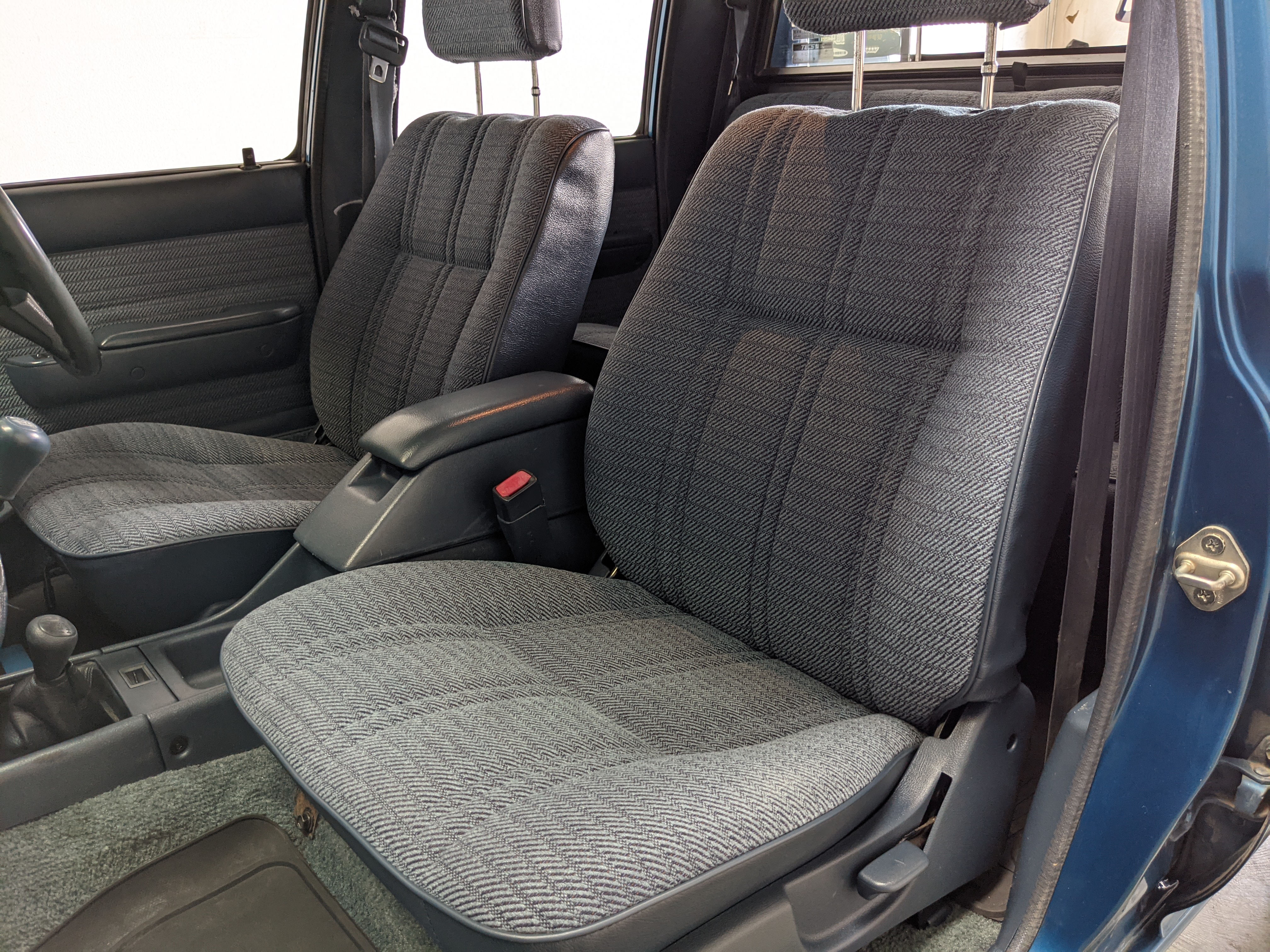 Interior is actually remarkably sorted for being a former construction truck from 1992. Non smoker (if you can believe it!), with the benefit of thick vinyl seat covers being on it since new (since removed), allowing the great blue fabric covering the seats to survive. Original radio is still installed, with the OEM single speaker over on the driver’s side. No cracks in the dash, no tears in the seat, no burns anywhere.