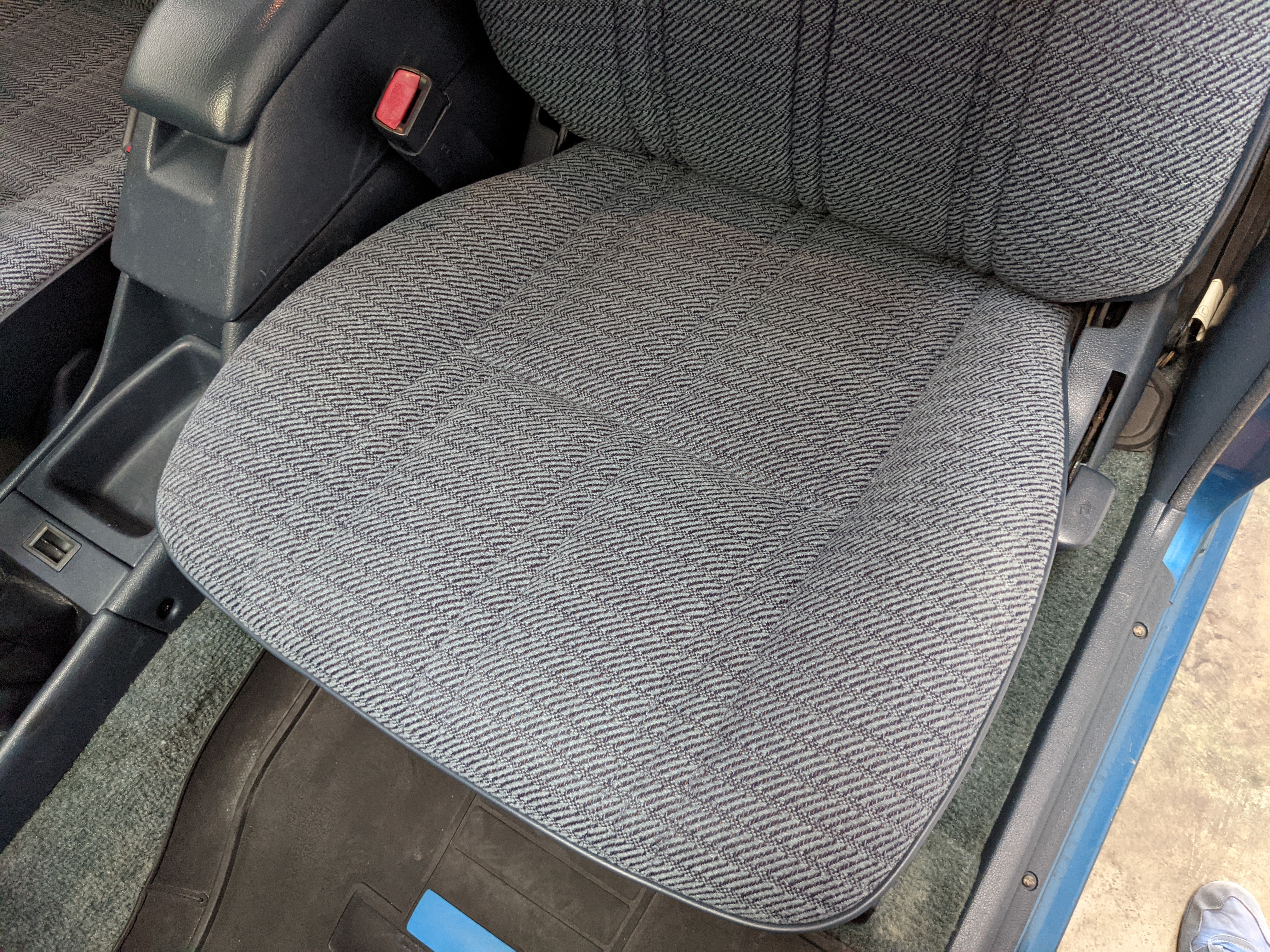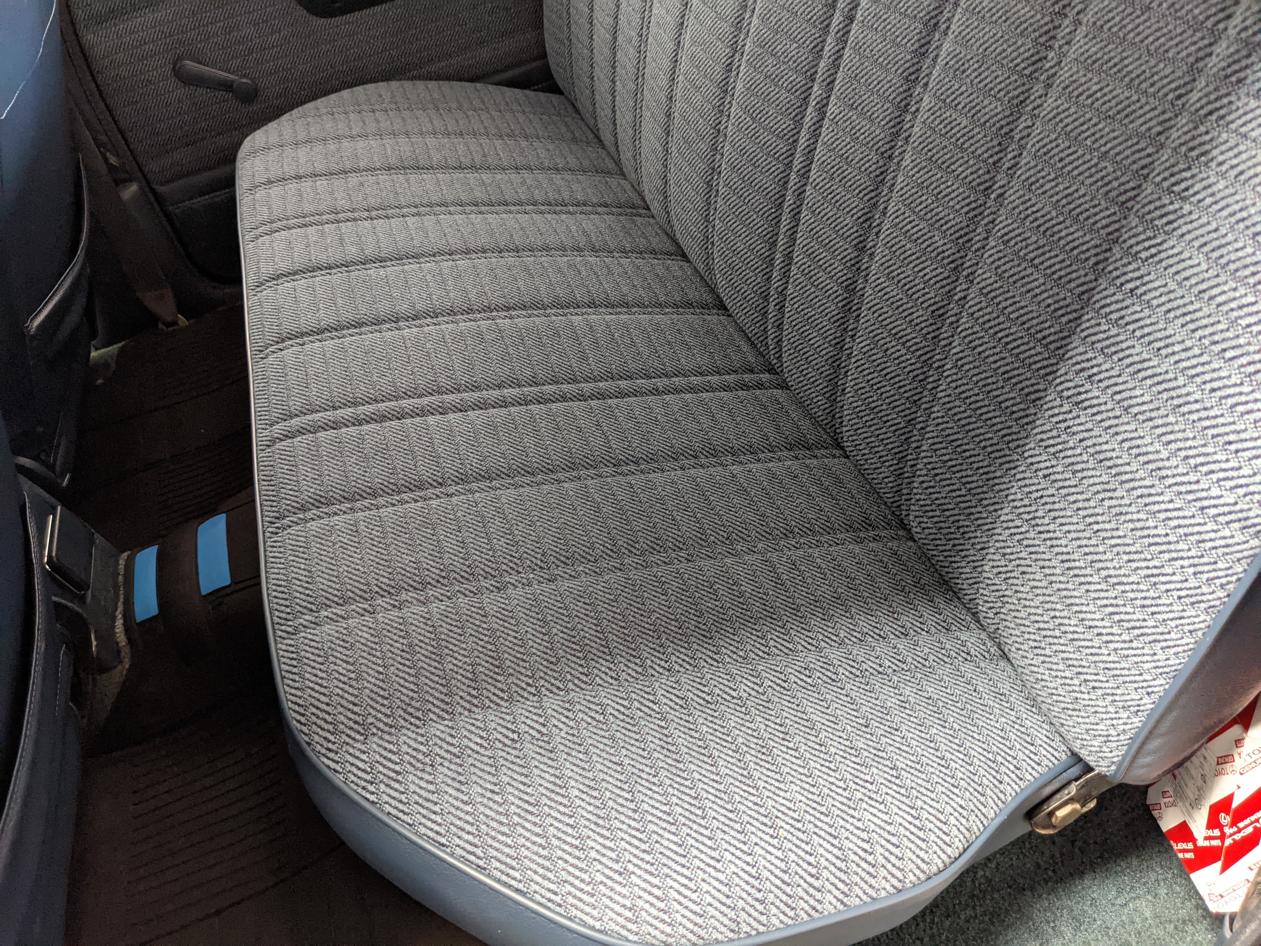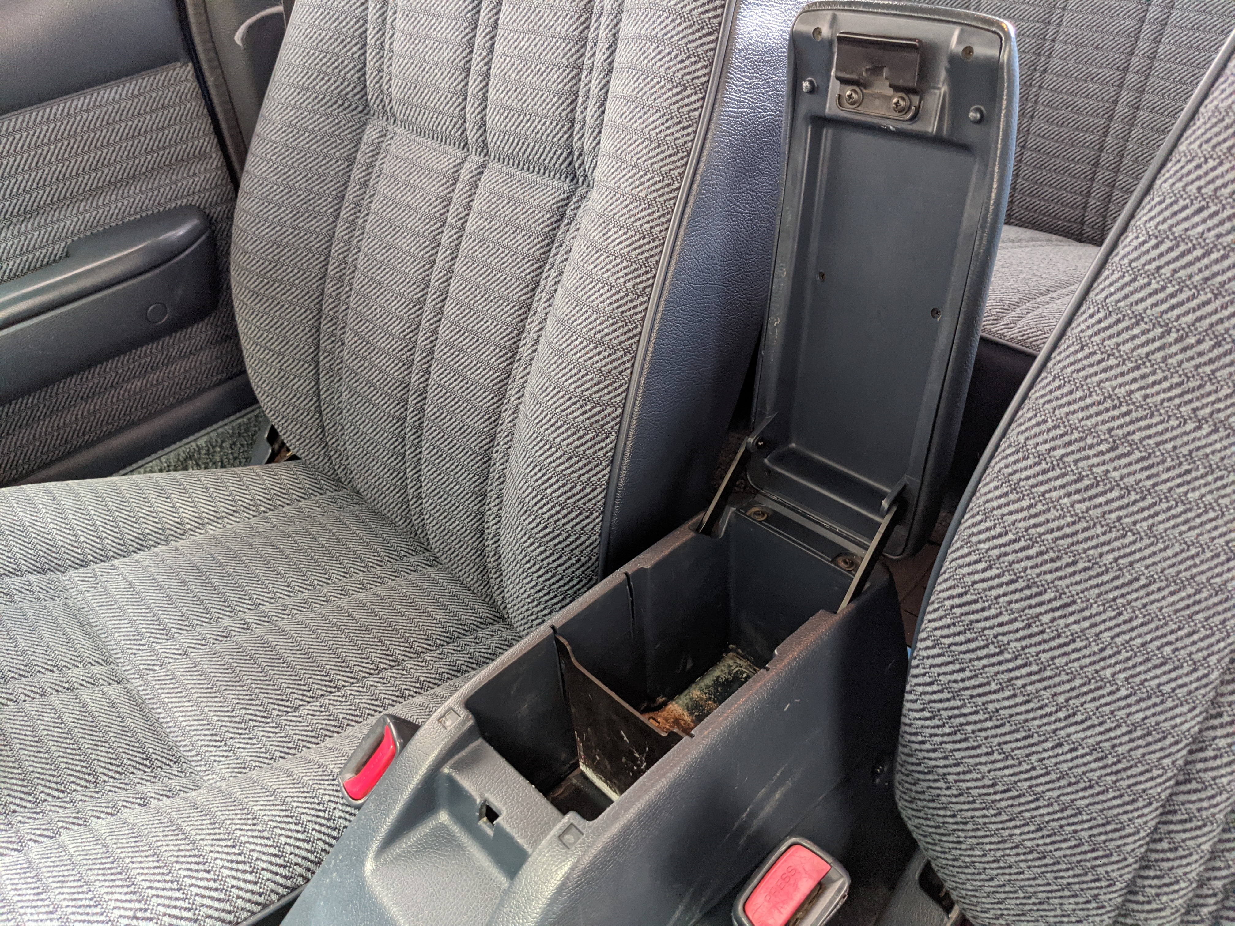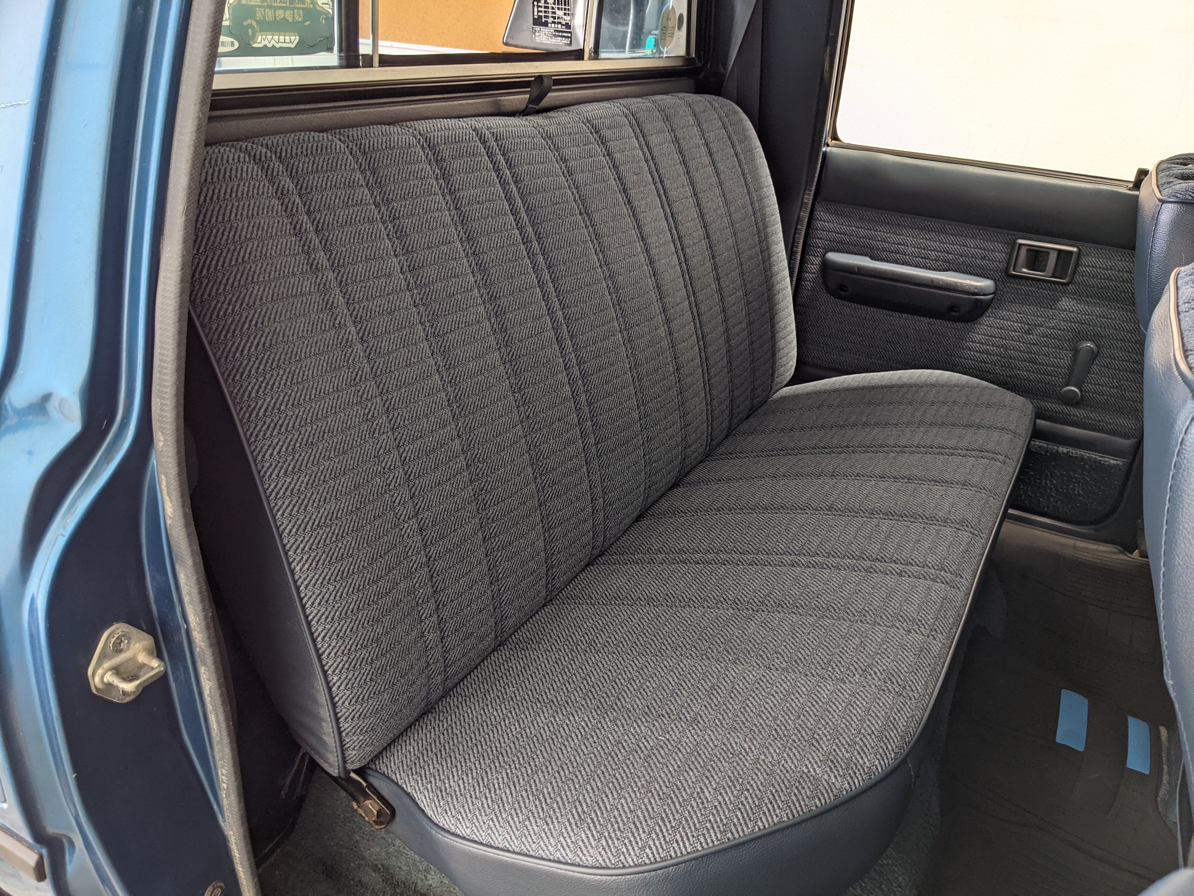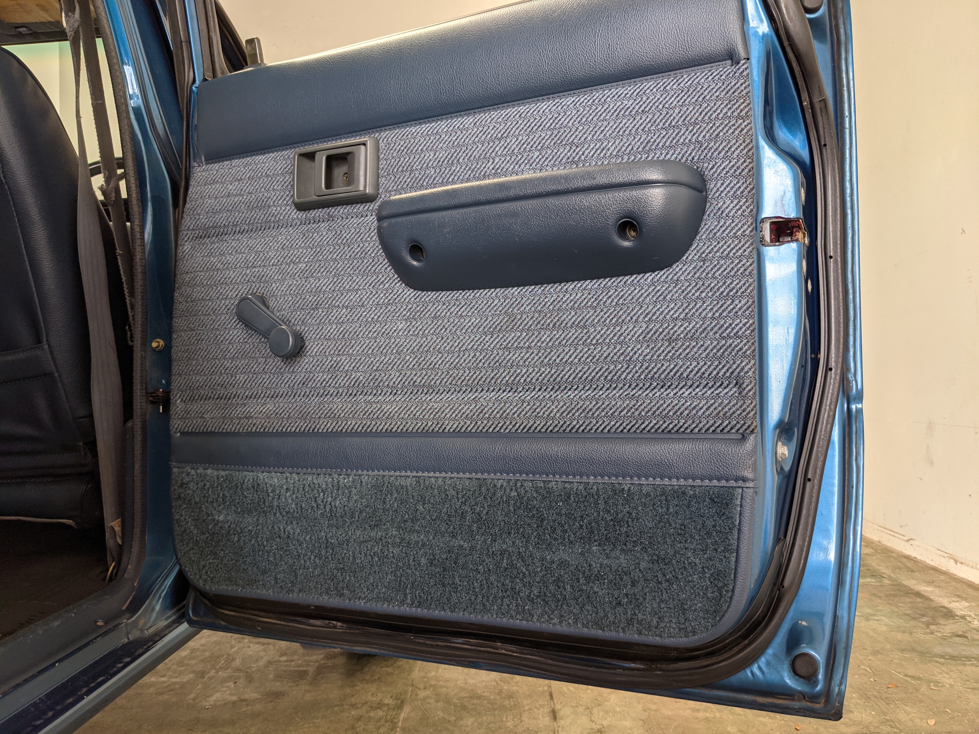 Interior is actually remarkably sorted for being a former construction truck from 1992. Non smoker (if you can believe it!), with the benefit of thick vinyl seat covers being on it since new (since removed), allowing the great blue fabric covering the seats to survive. Original radio is still installed, with the OEM single speaker over on the driver’s side. No cracks in the dash, no tears in the seat, no burns anywhere.