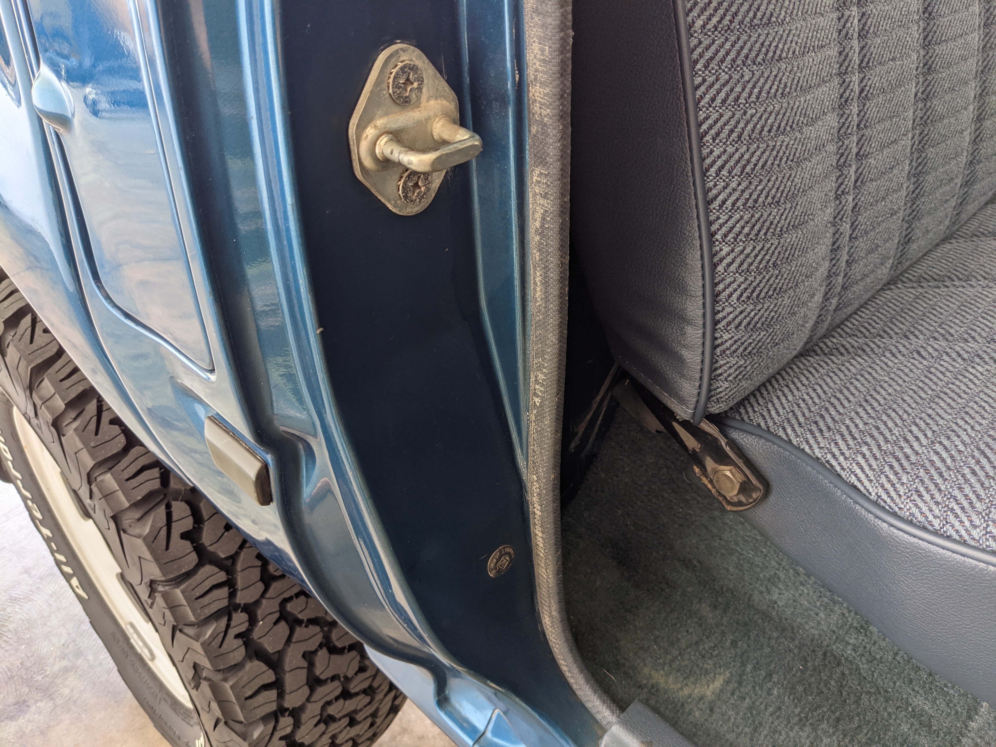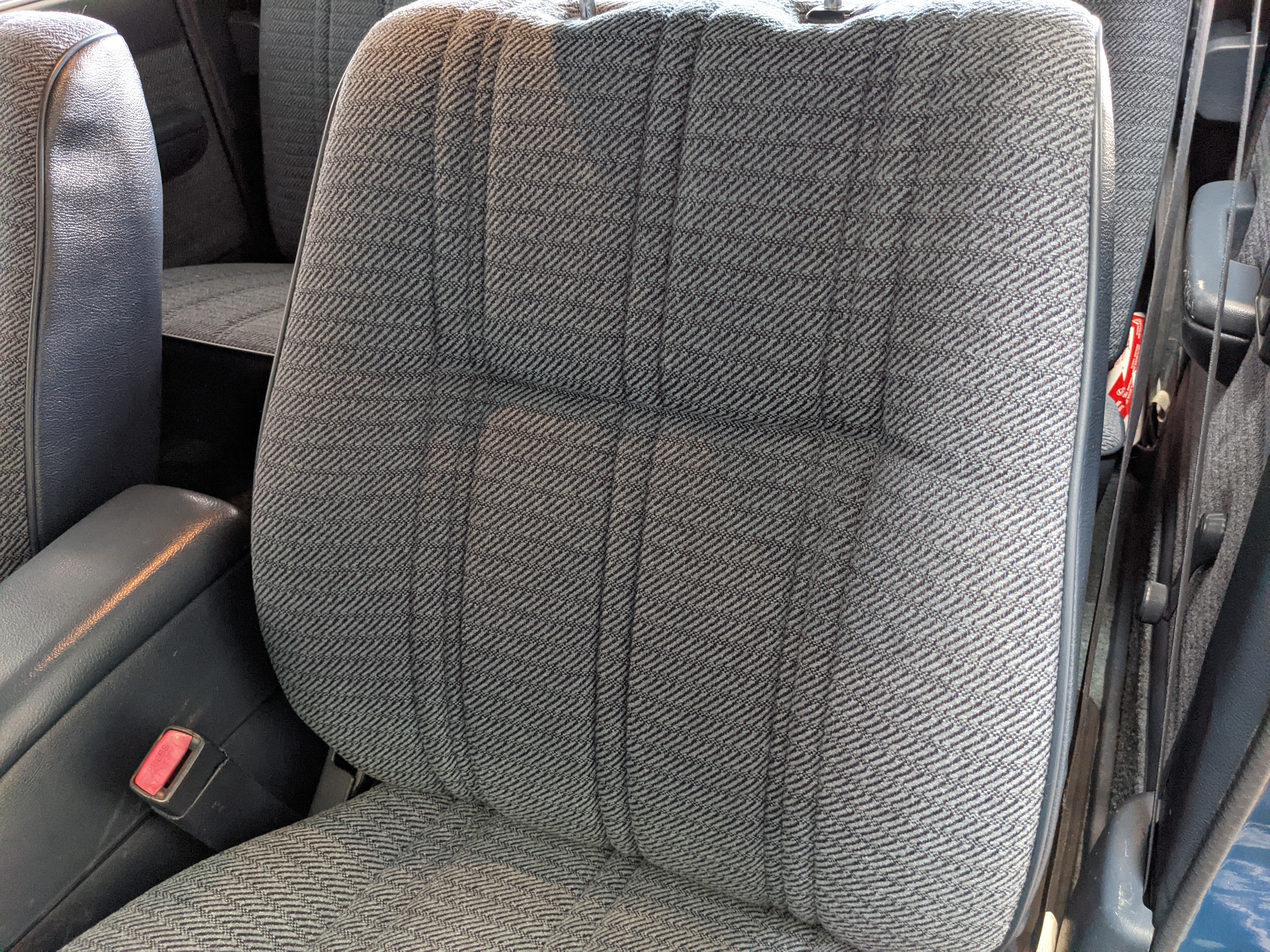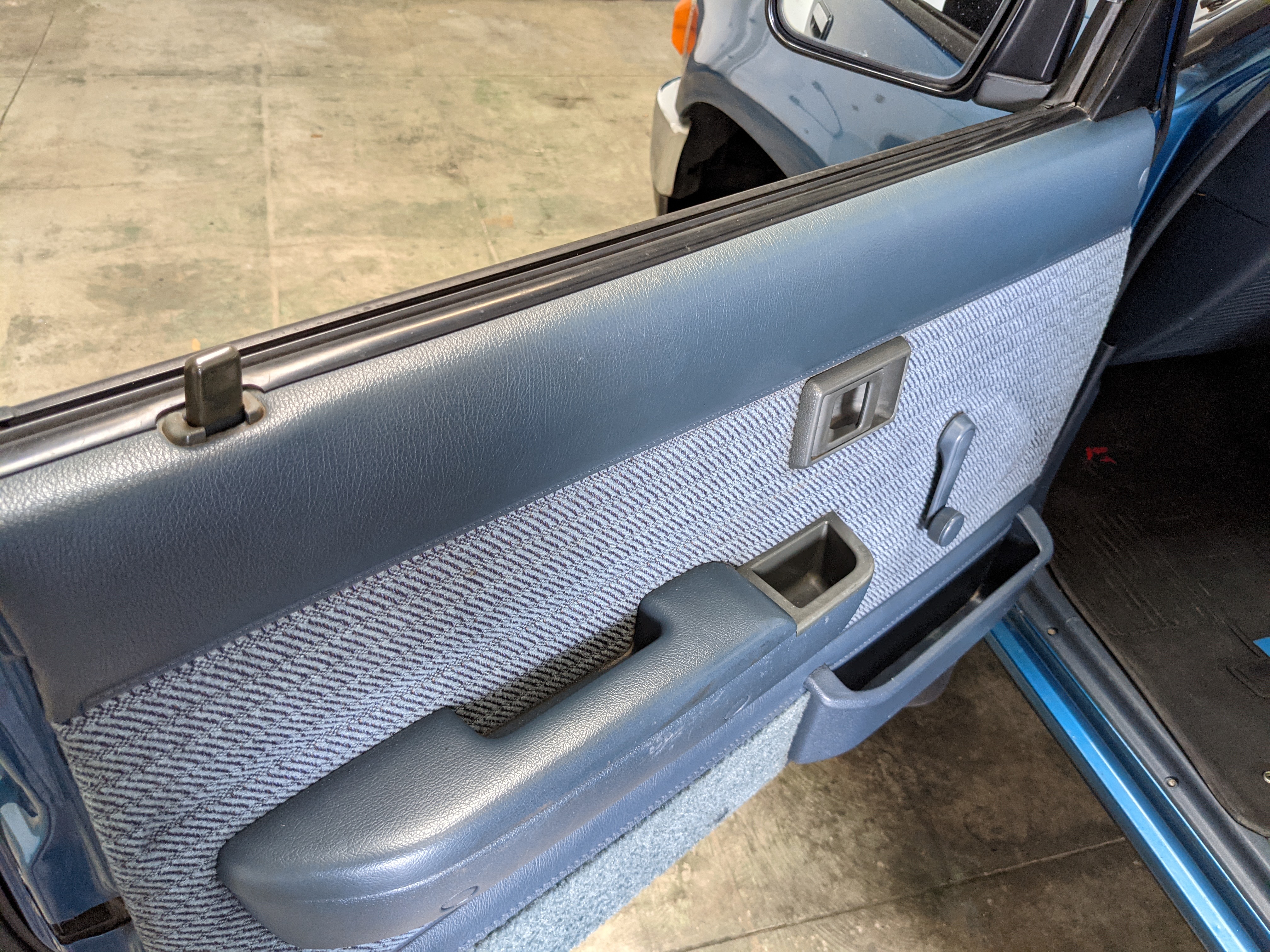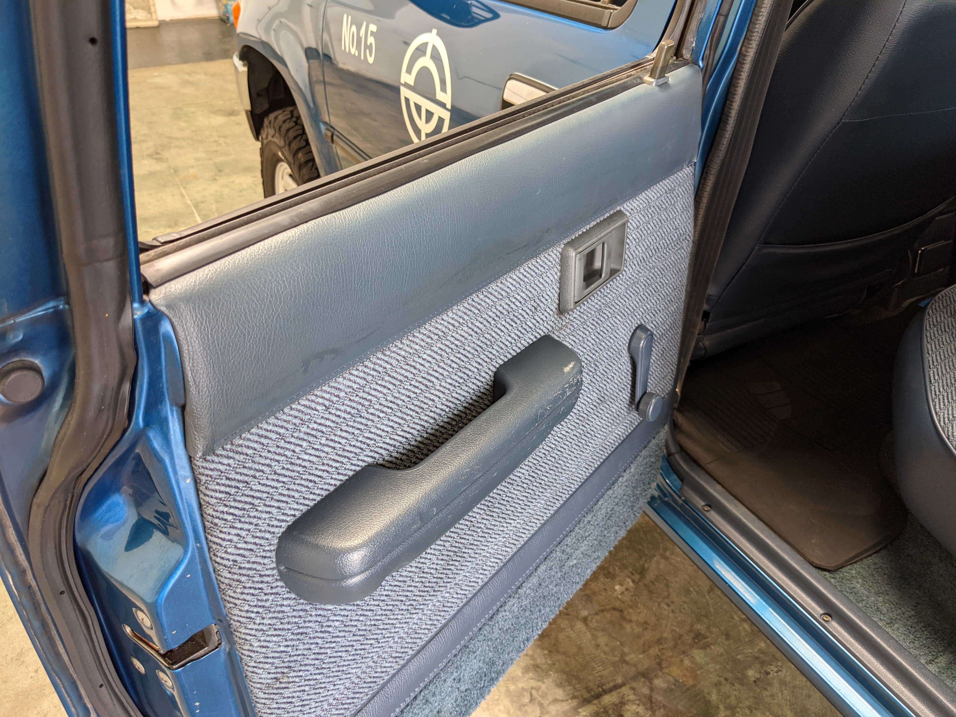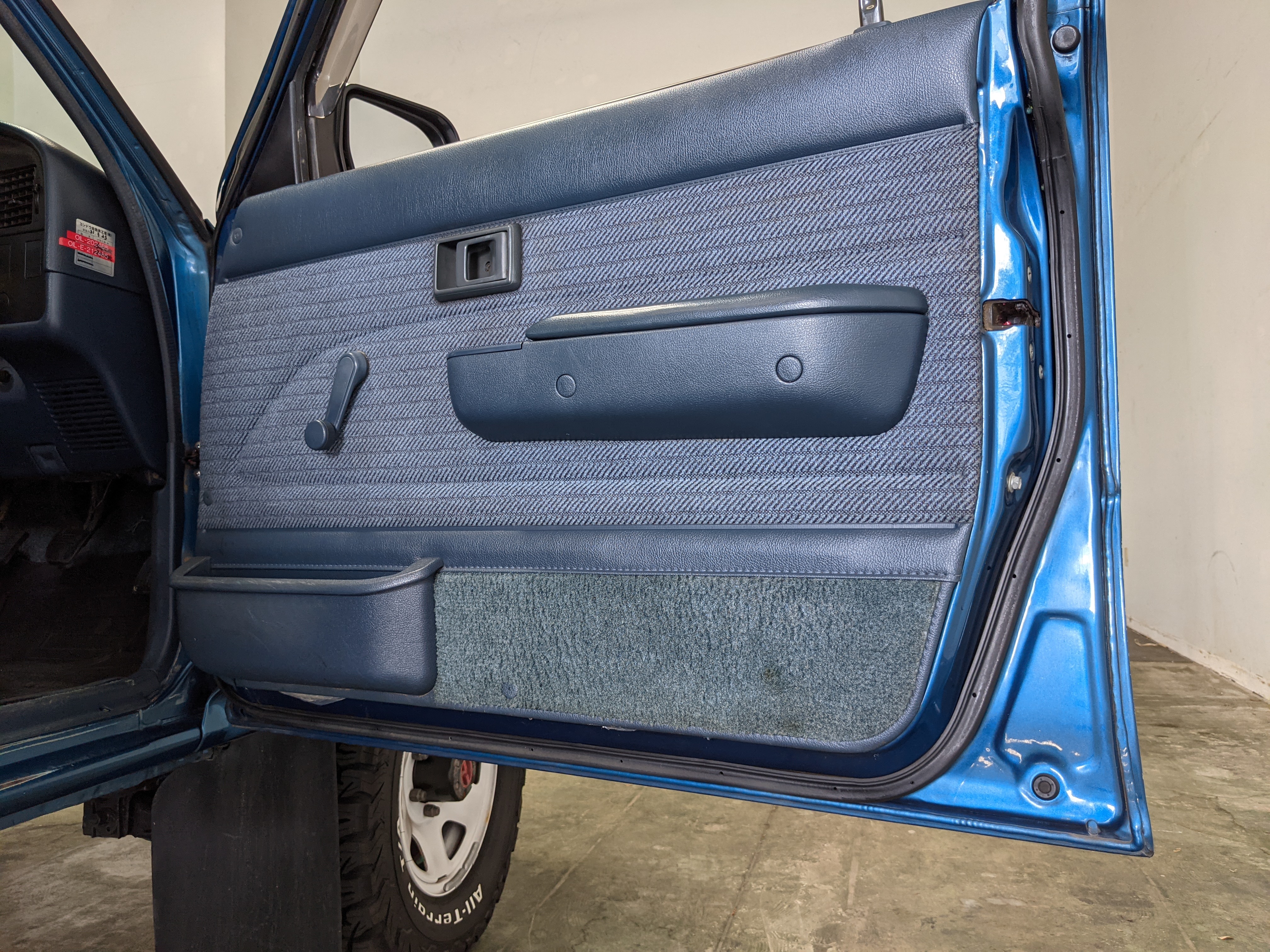 Interior is actually remarkably sorted for being a former construction truck from 1992. Non smoker (if you can believe it!), with the benefit of thick vinyl seat covers being on it since new (since removed), allowing the great blue fabric covering the seats to survive. Original radio is still installed, with the OEM single speaker over on the driver’s side. No cracks in the dash, no tears in the seat, no burns anywhere.