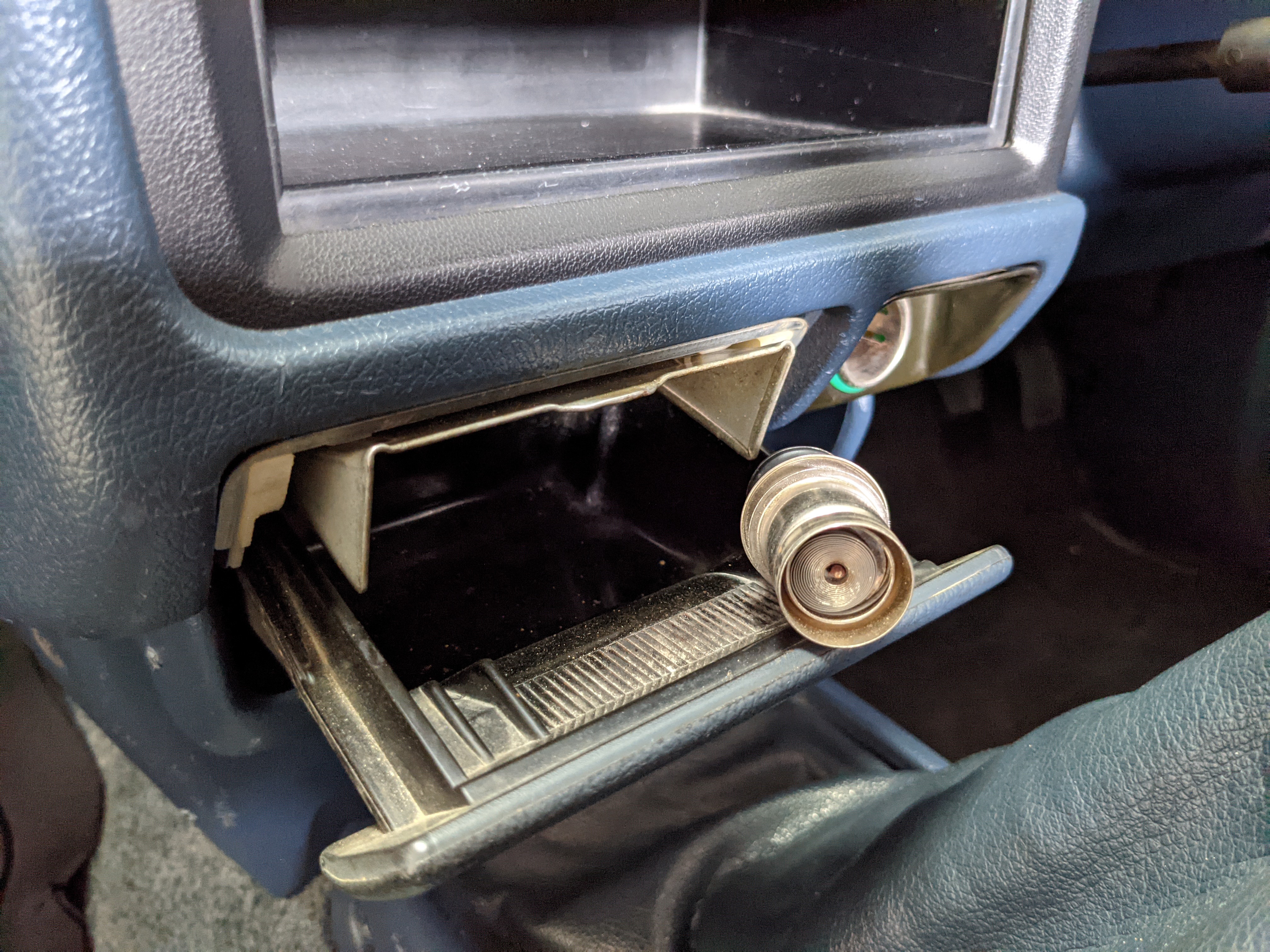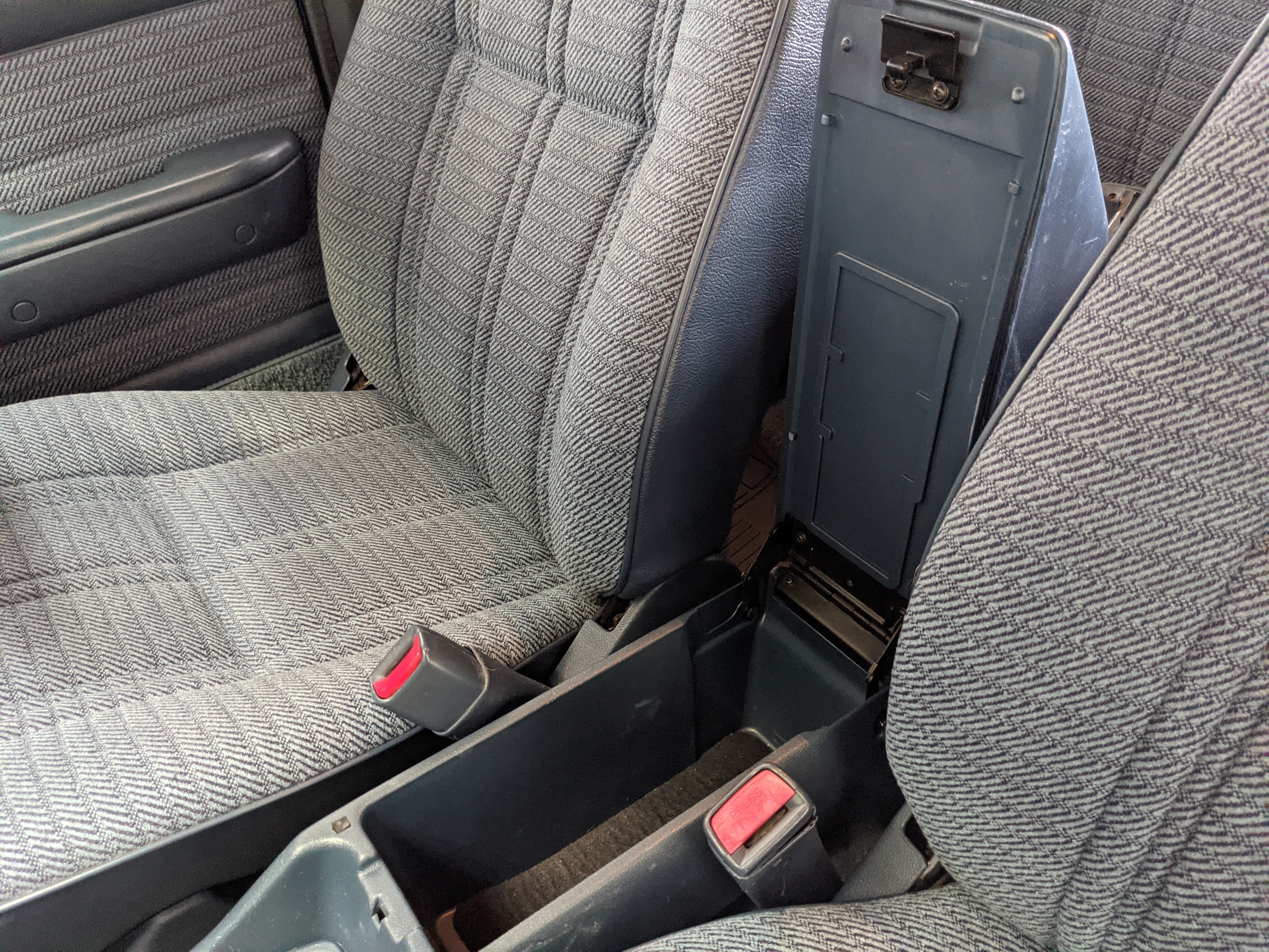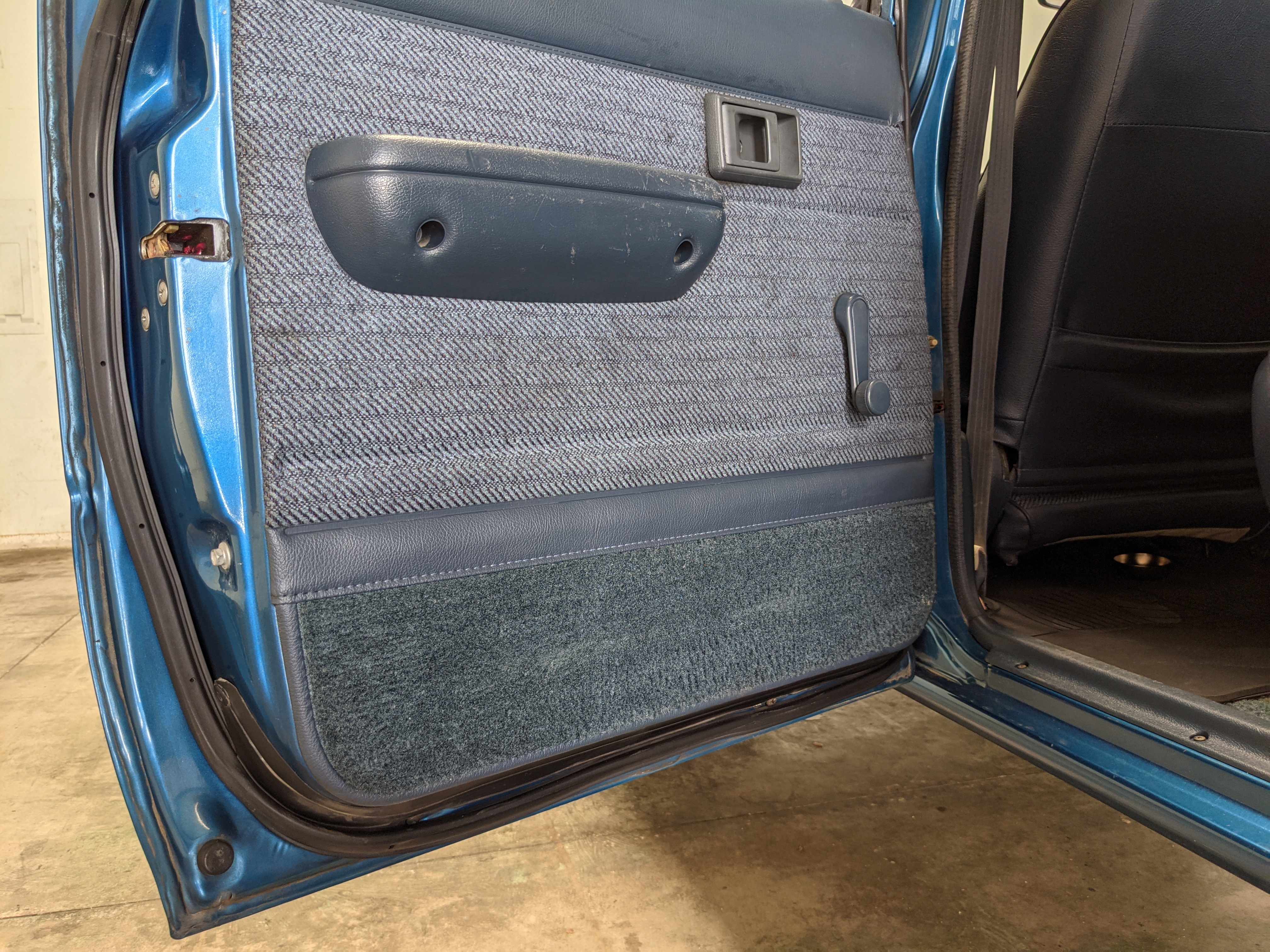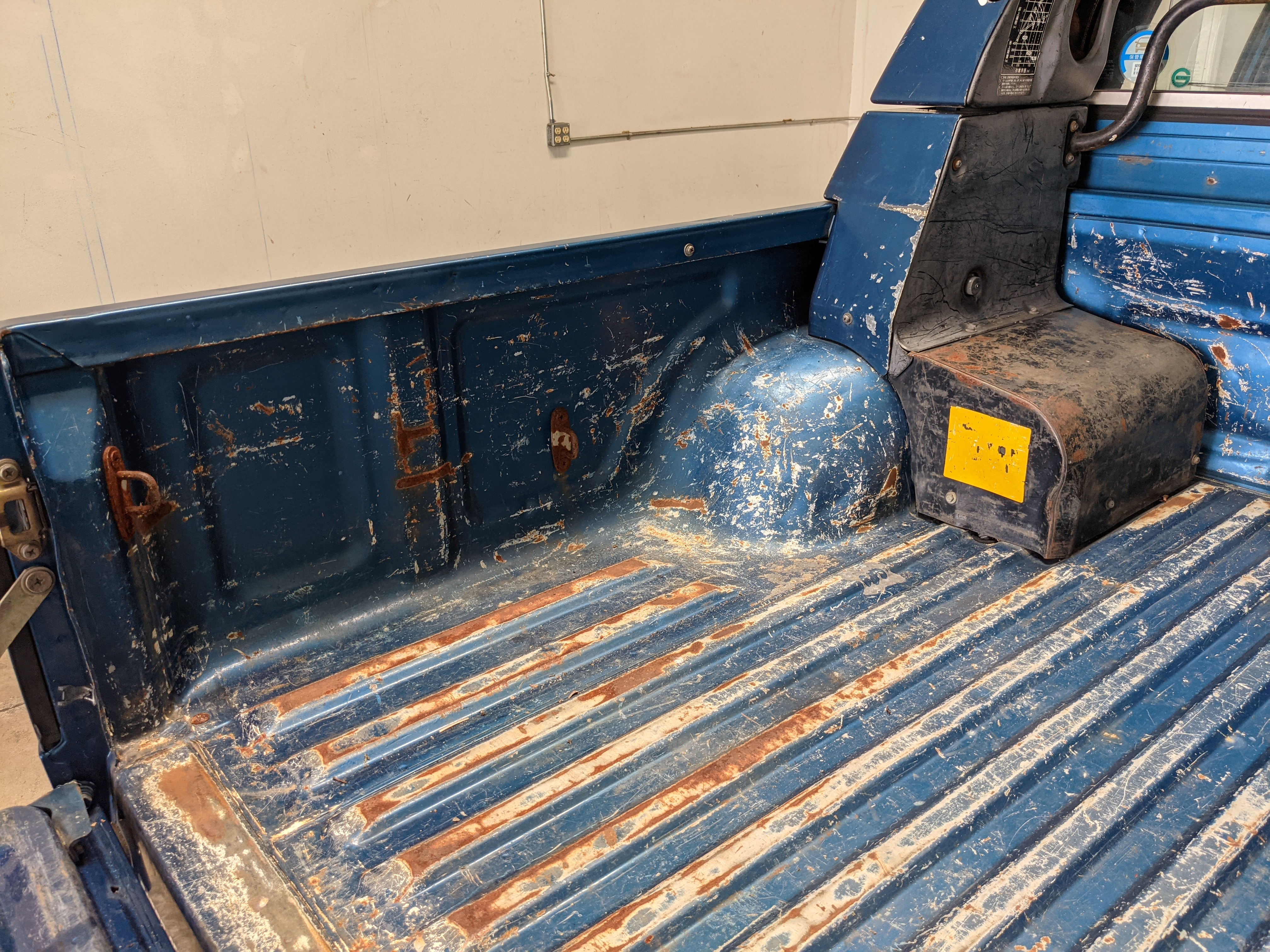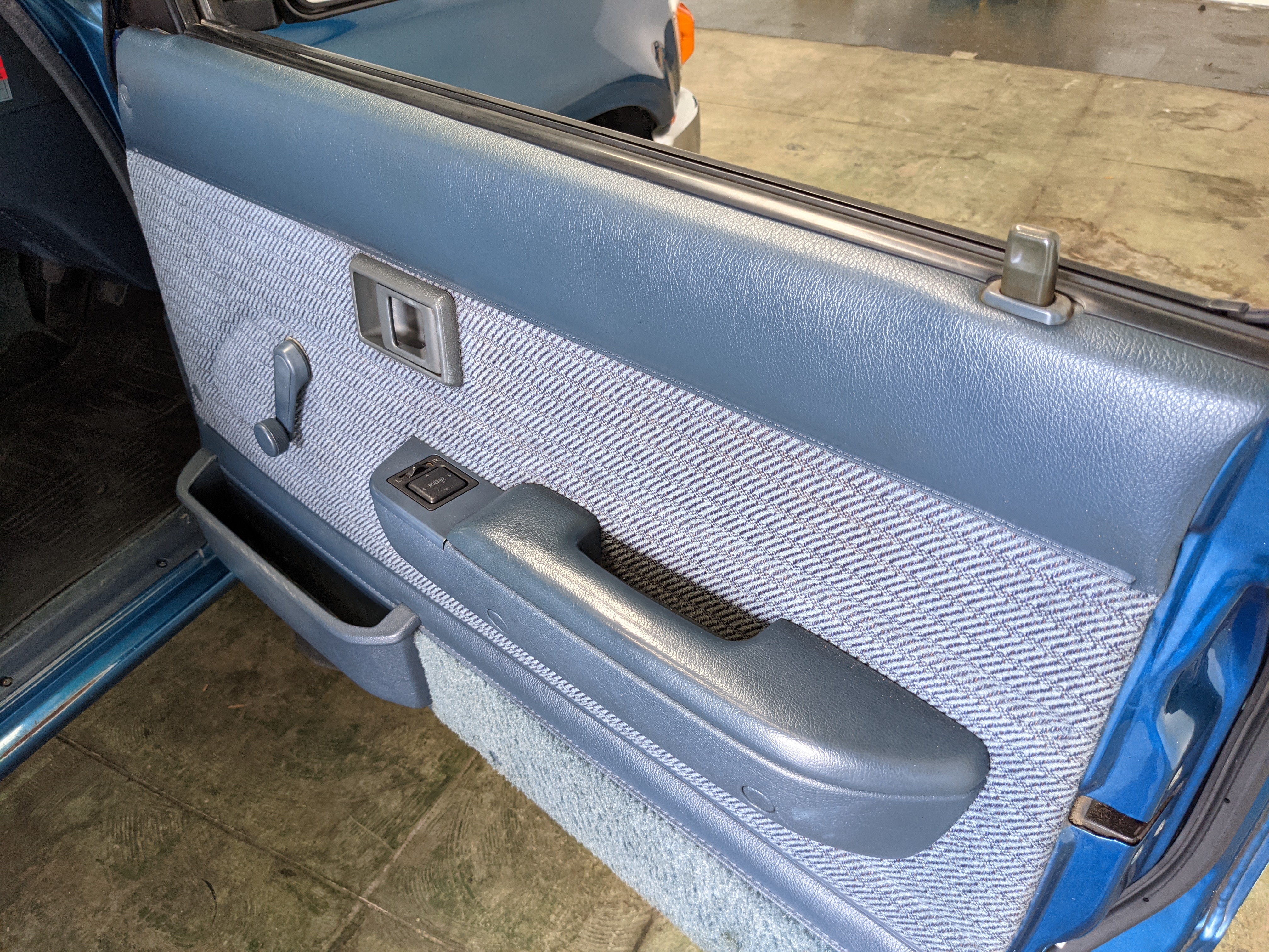 Interior is actually remarkably sorted for being a former construction truck from 1992. Non smoker (if you can believe it!), with the benefit of thick vinyl seat covers being on it since new (since removed), allowing the great blue fabric covering the seats to survive. Original radio is still installed, with the OEM single speaker over on the driver’s side. No cracks in the dash, no tears in the seat, no burns anywhere.