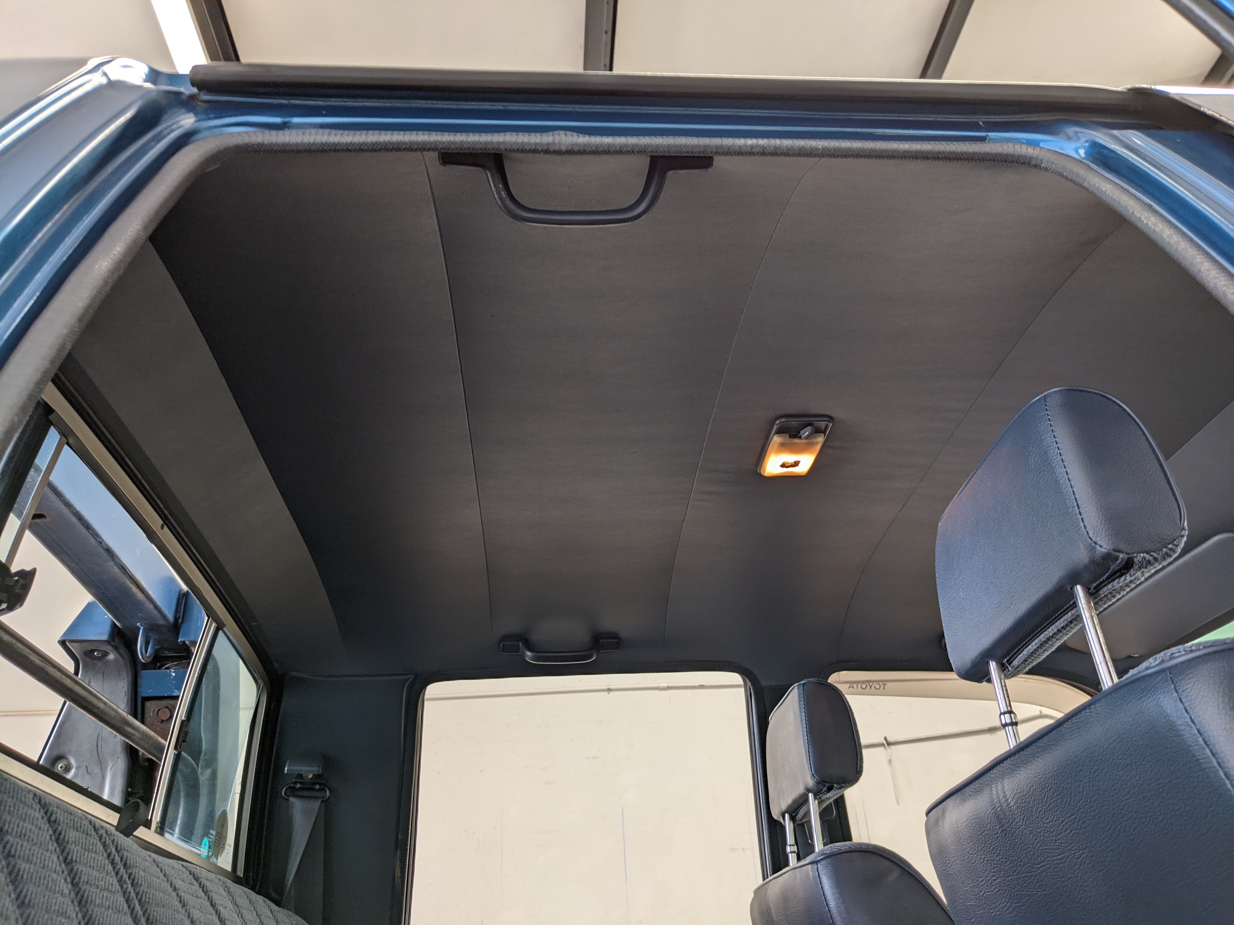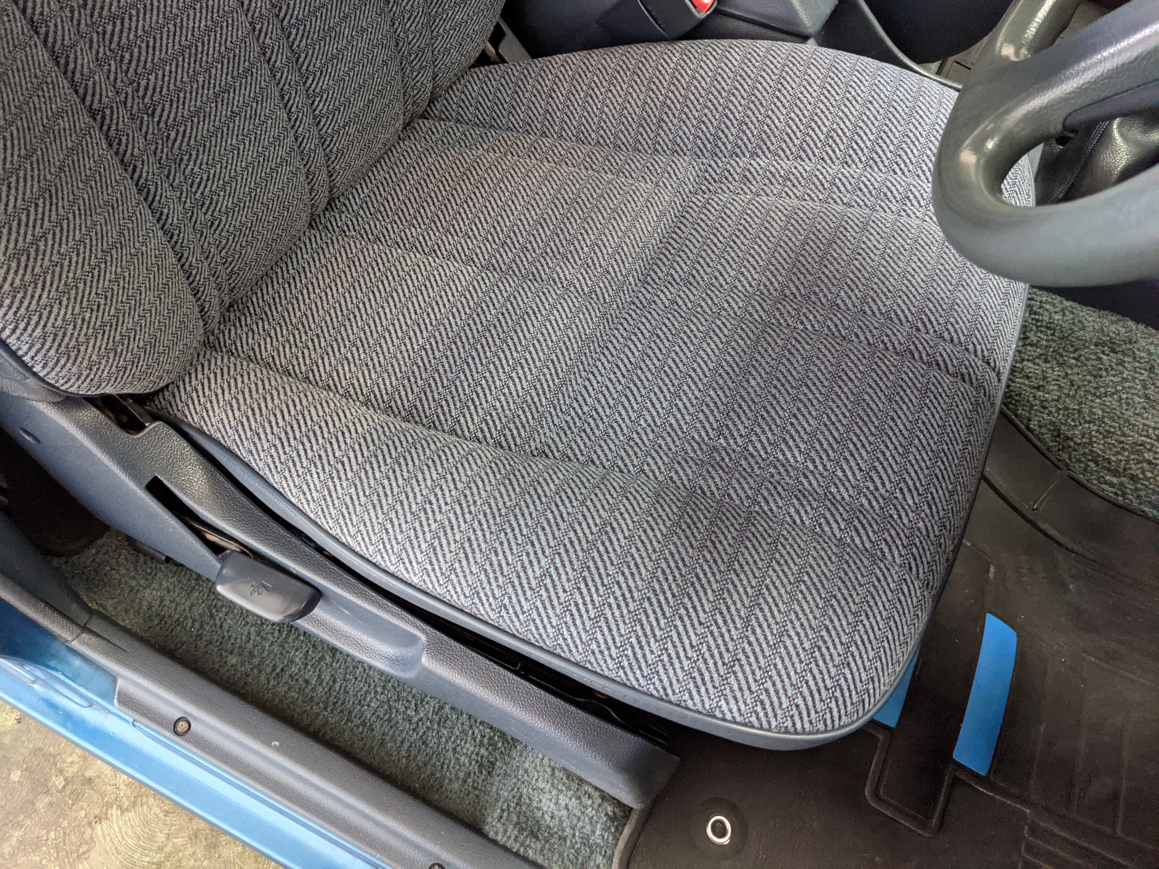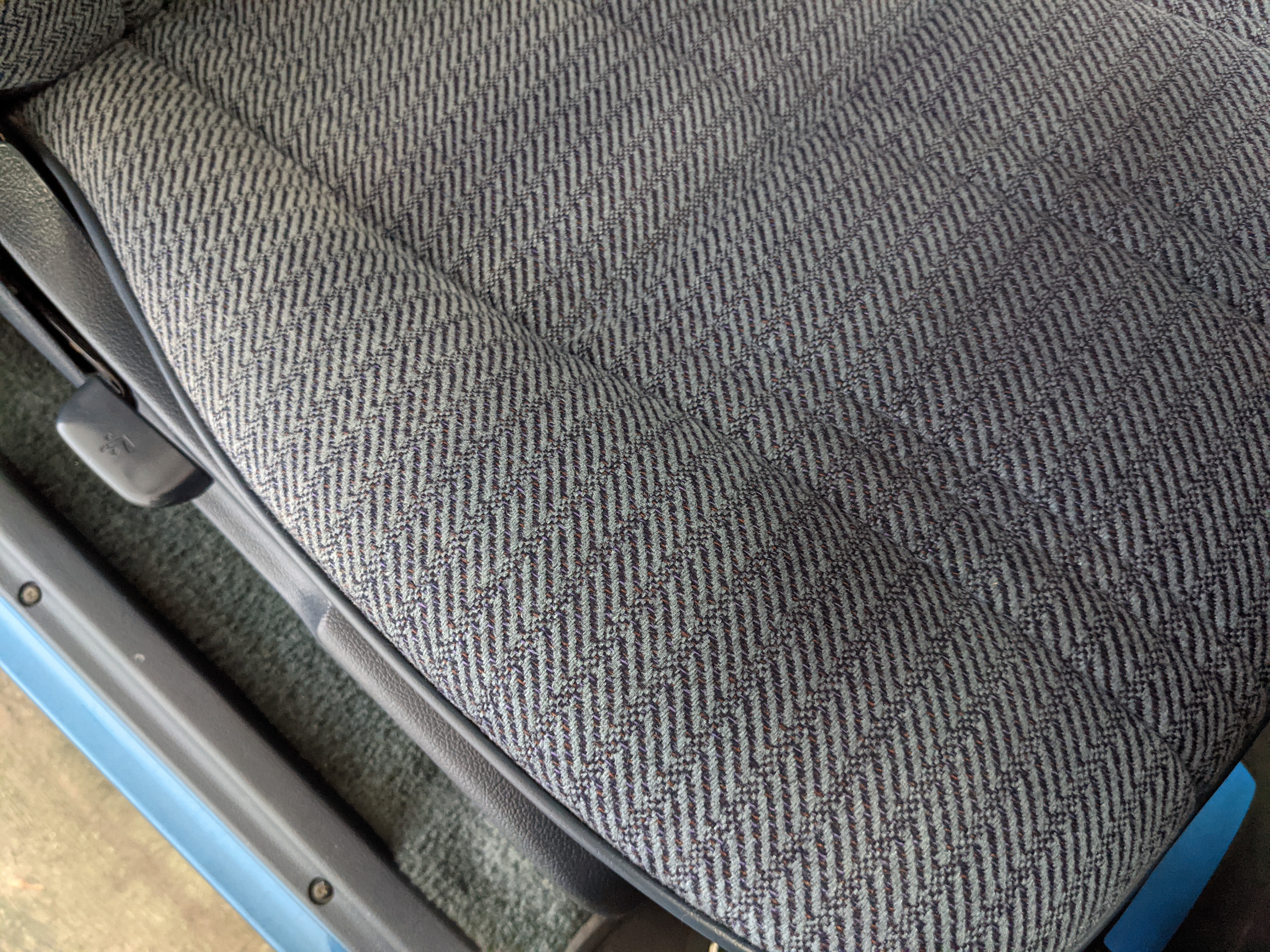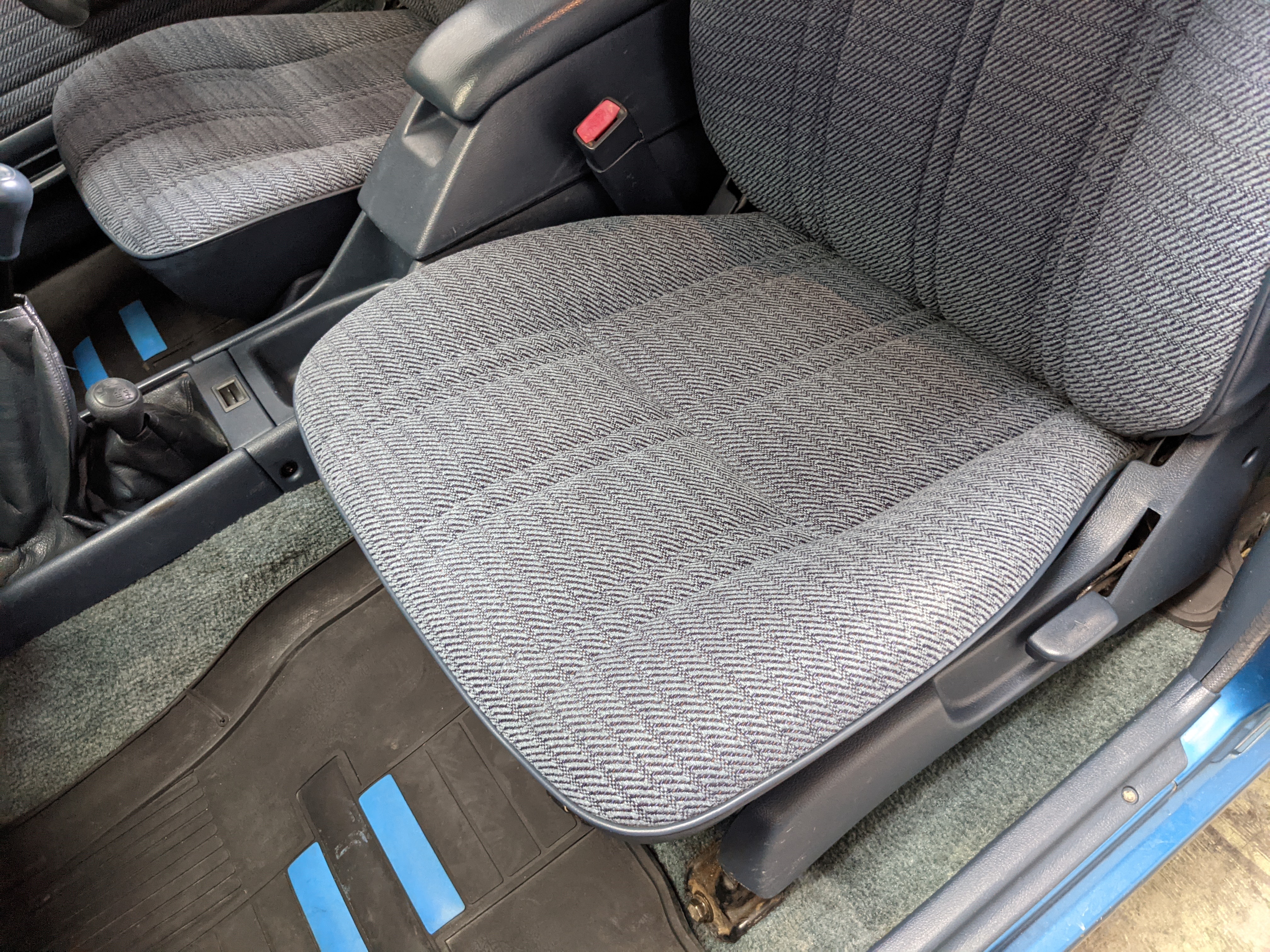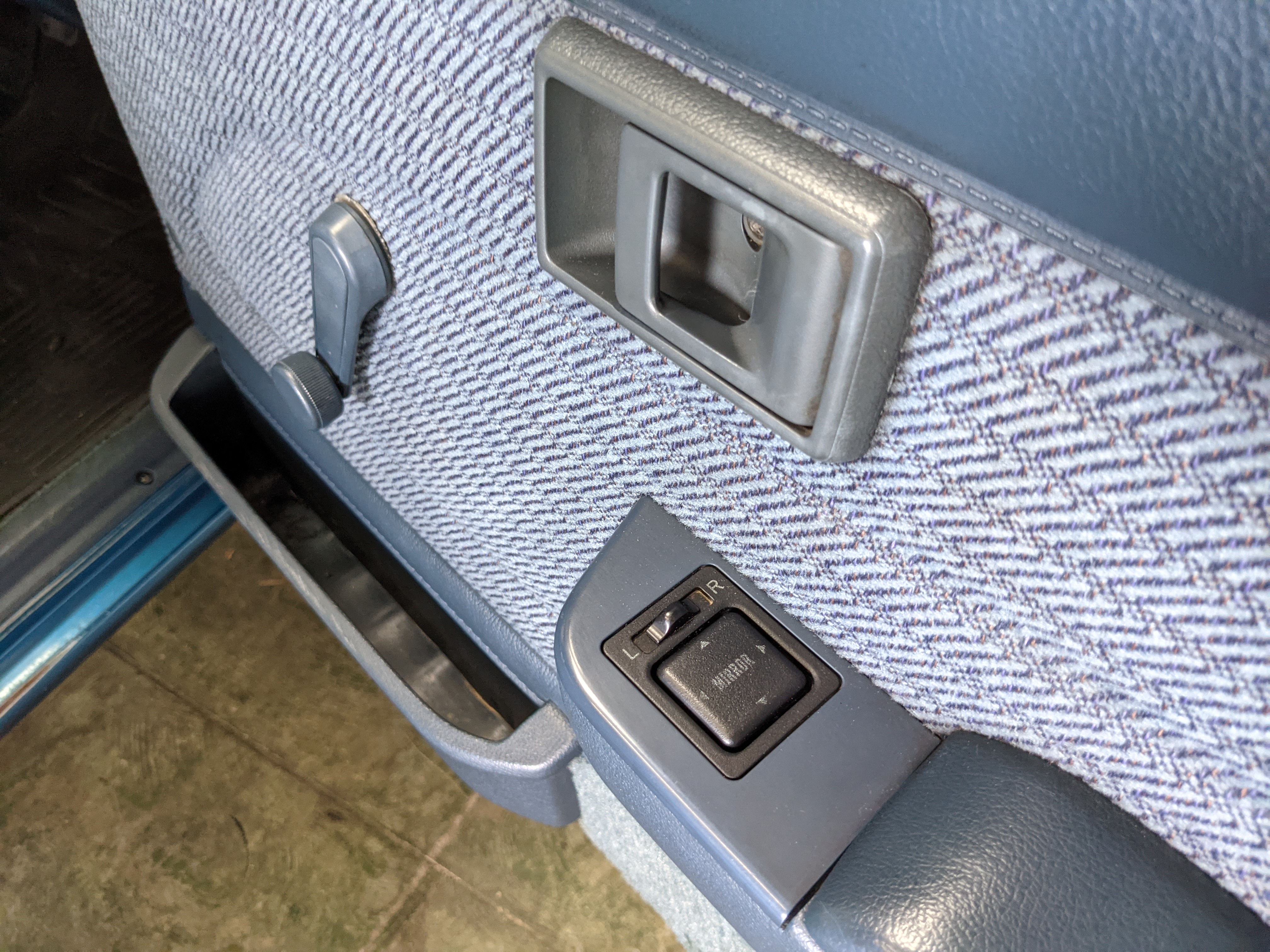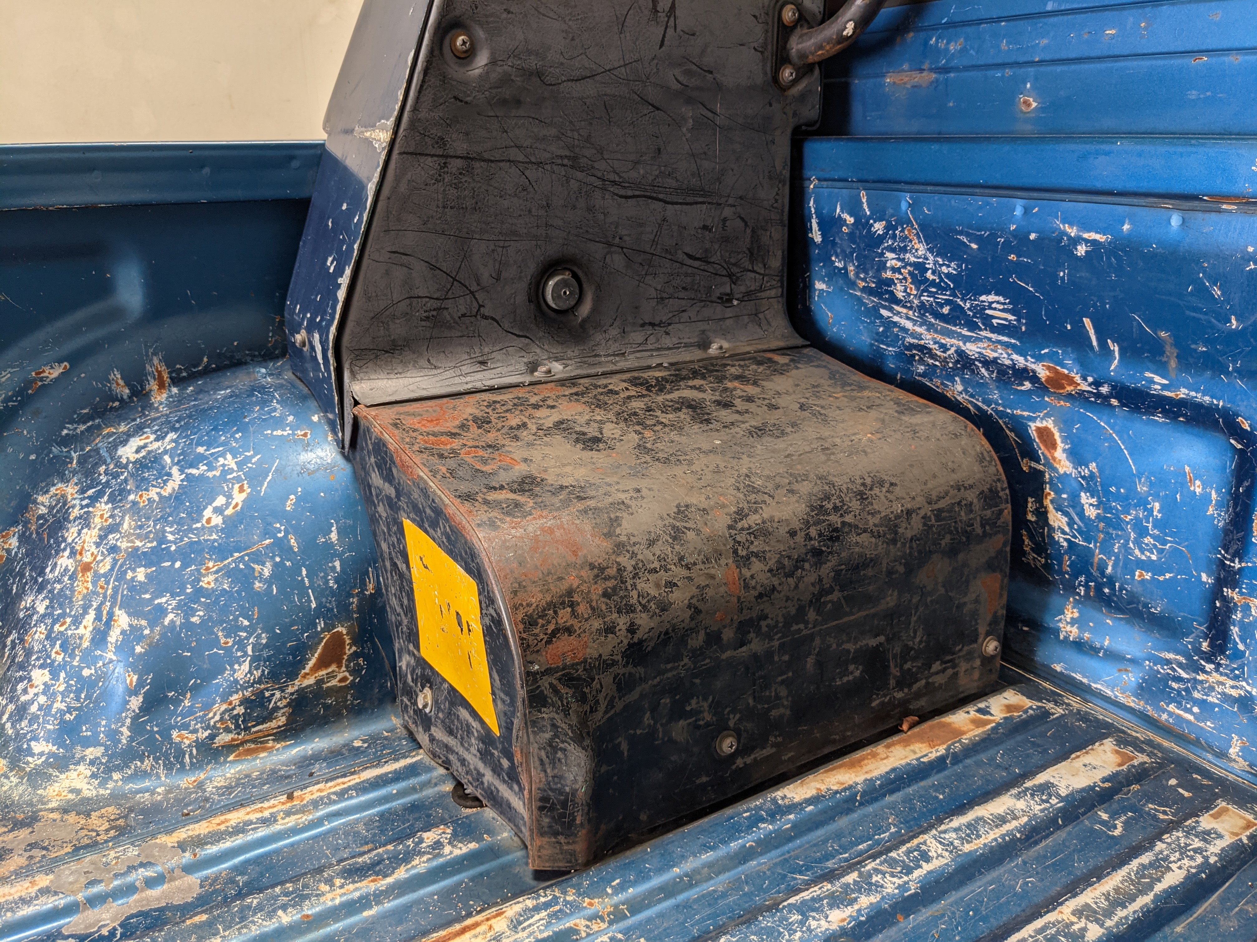 Interior is actually remarkably sorted for being a former construction truck from 1992. Non smoker (if you can believe it!), with the benefit of thick vinyl seat covers being on it since new (since removed), allowing the great blue fabric covering the seats to survive. Original radio is still installed, with the OEM single speaker over on the driver’s side. No cracks in the dash, no tears in the seat, no burns anywhere.
