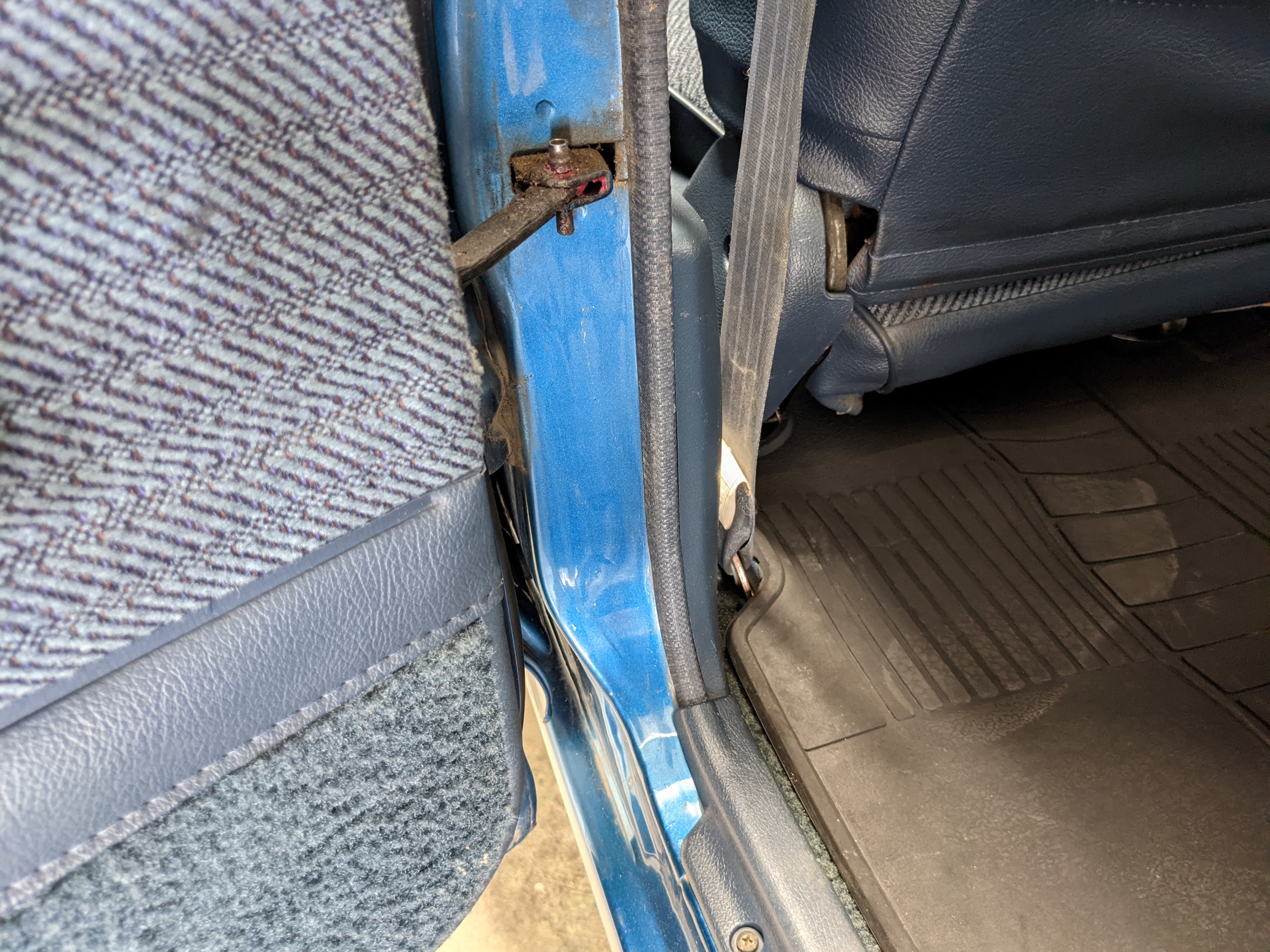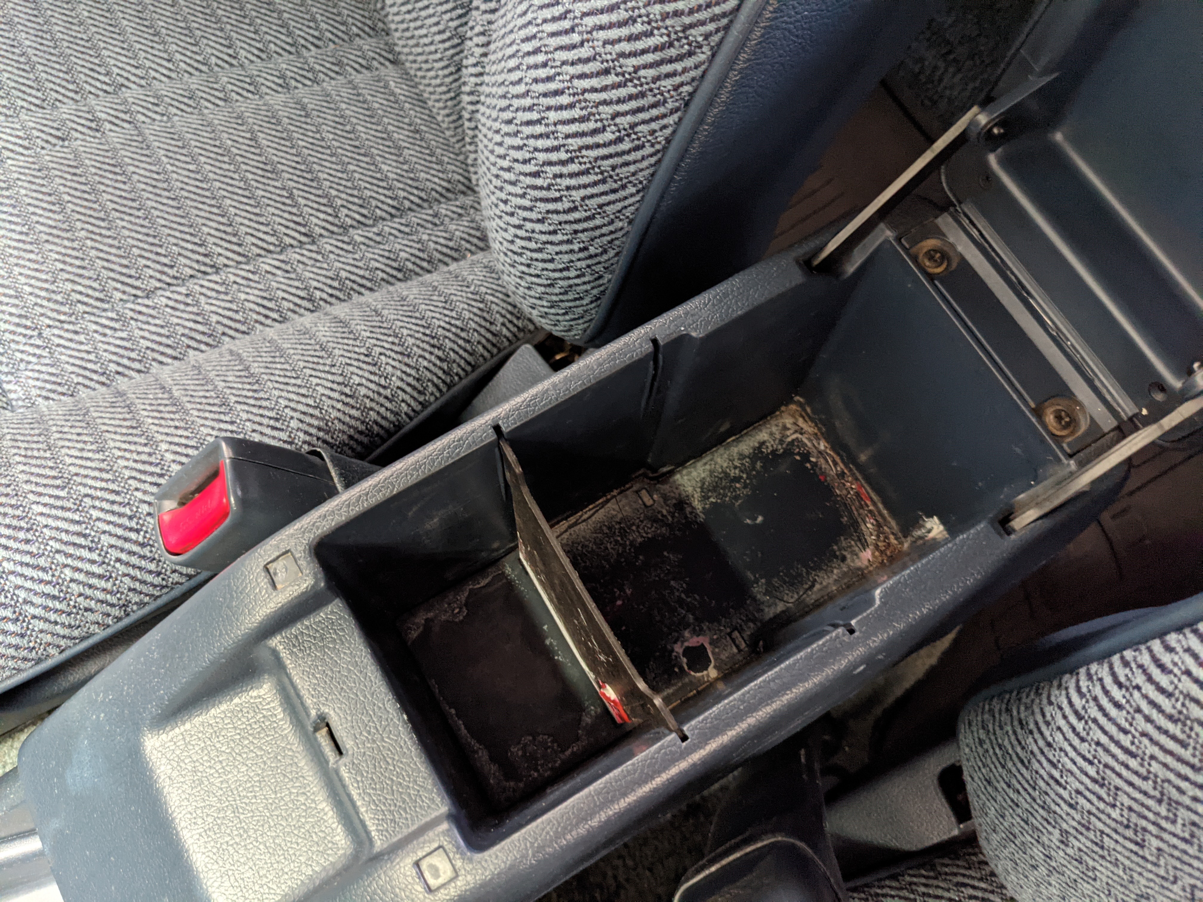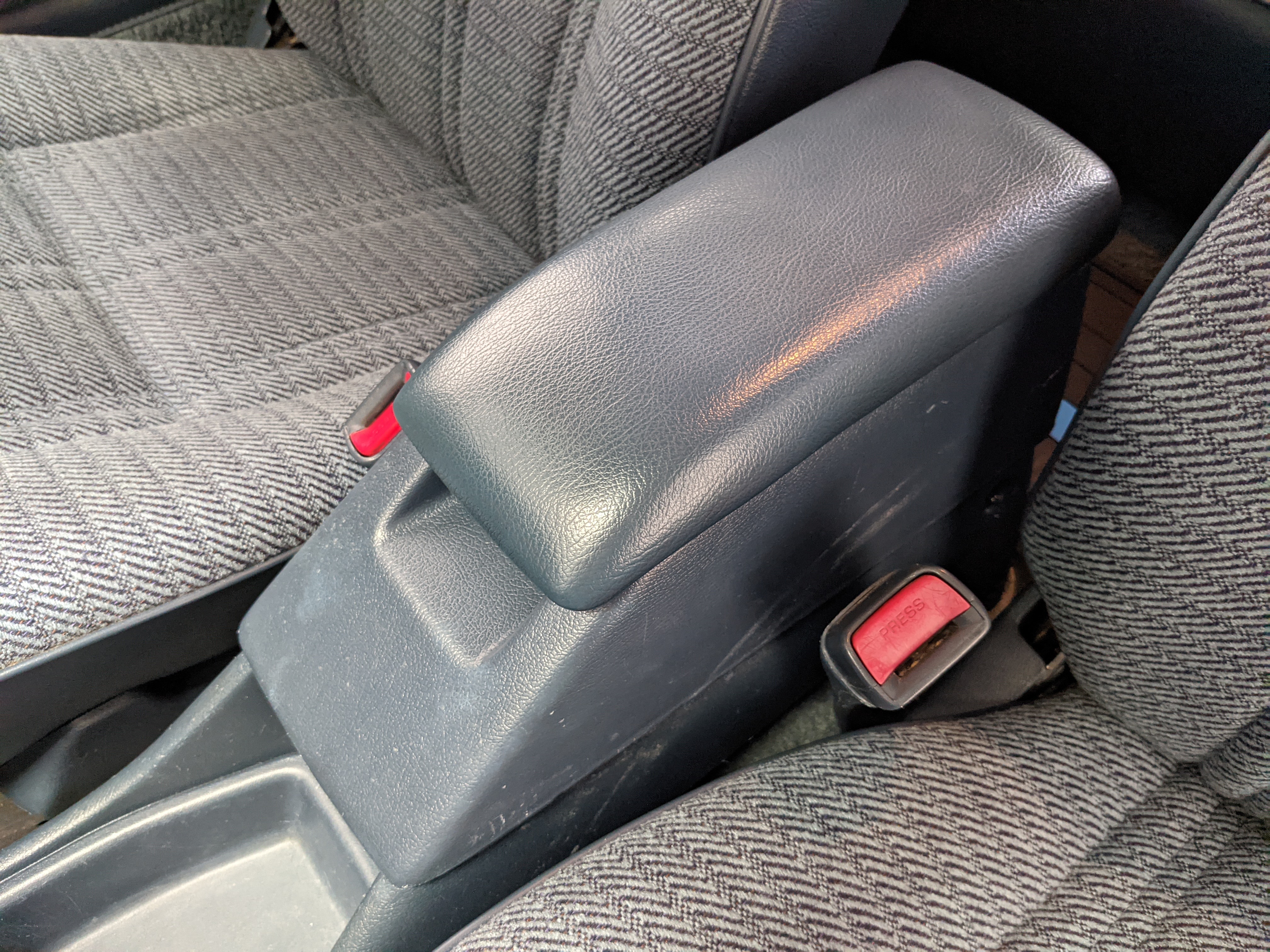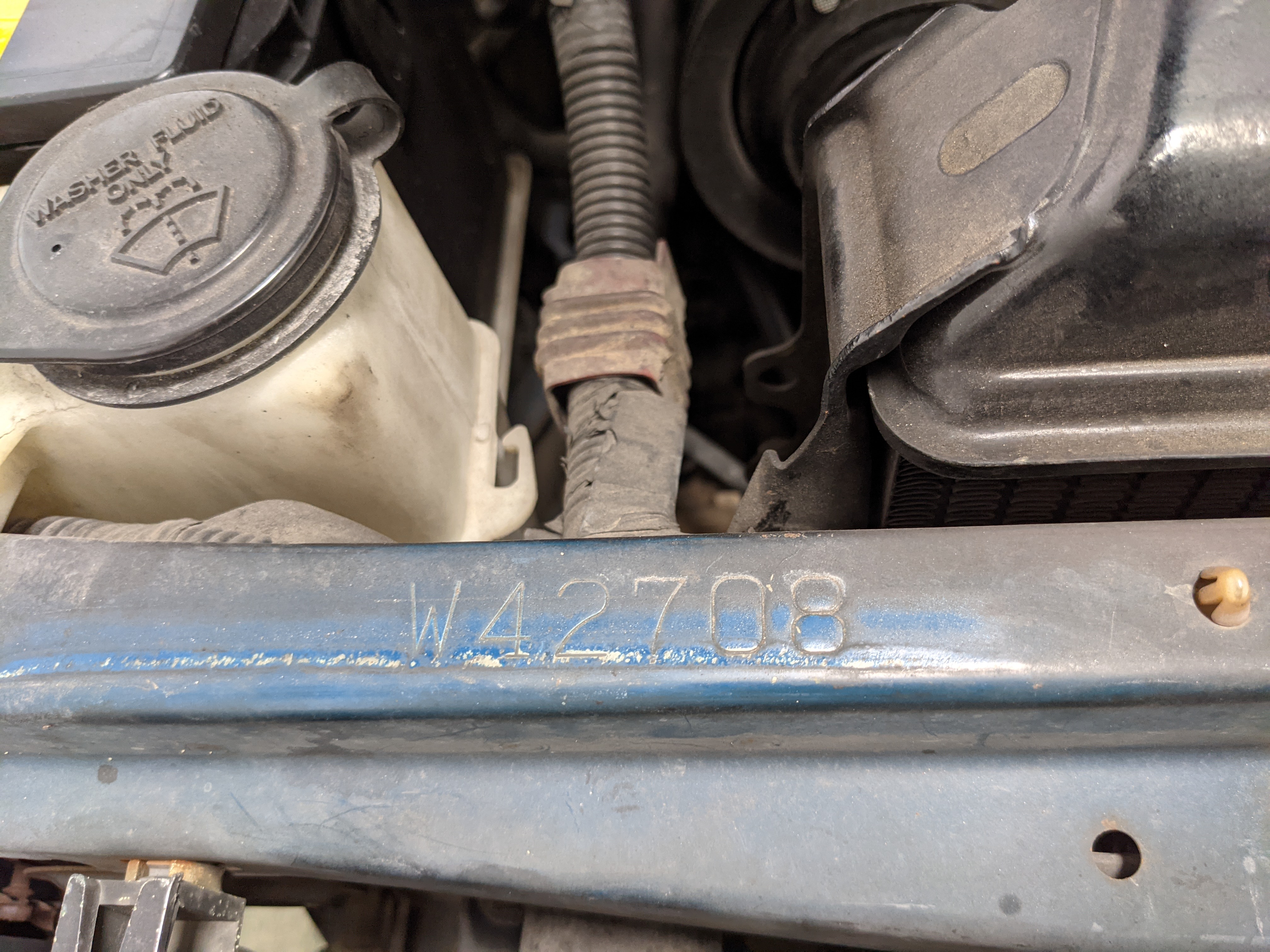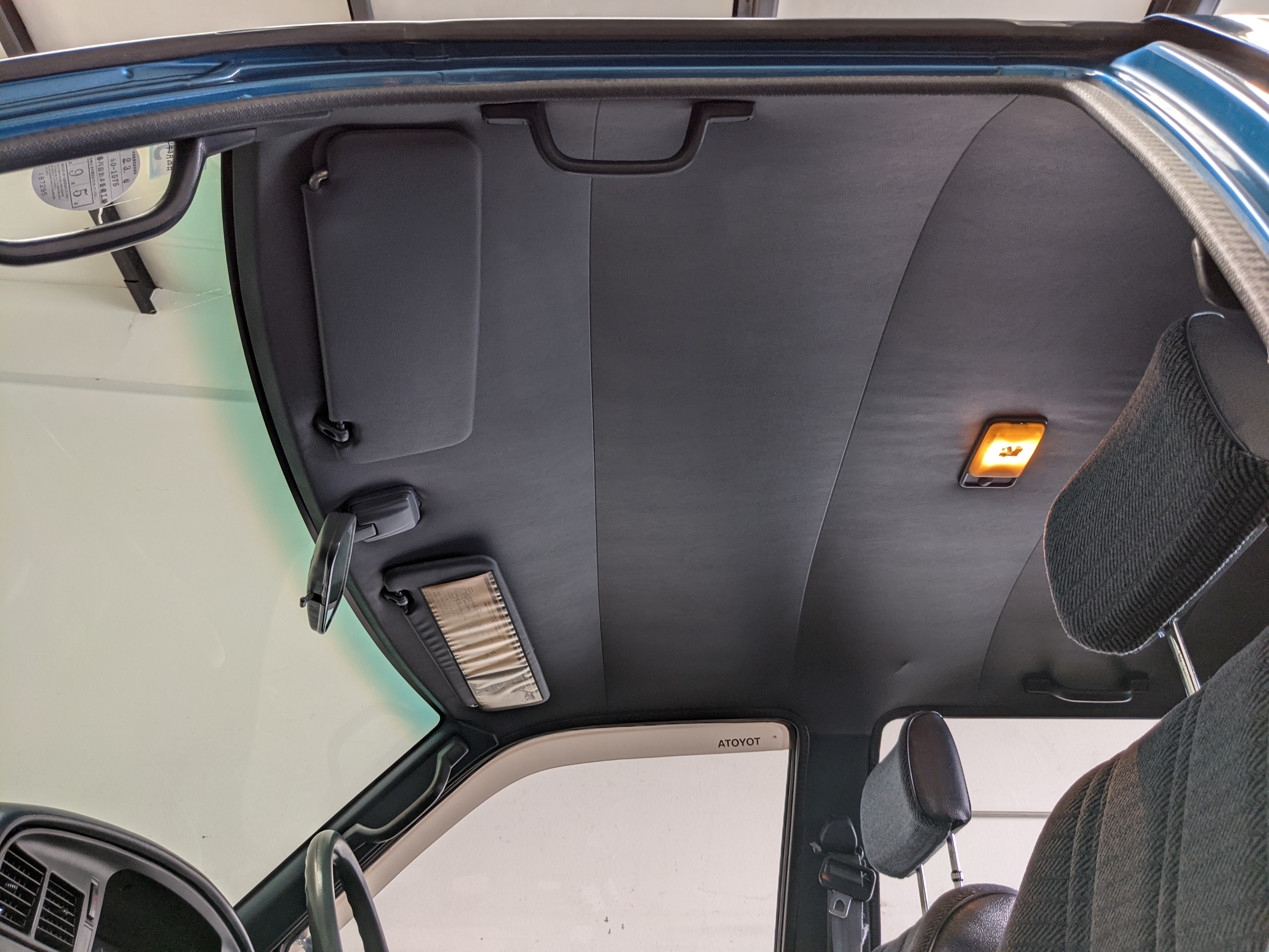 Interior is actually remarkably sorted for being a former construction truck from 1992. Non smoker (if you can believe it!), with the benefit of thick vinyl seat covers being on it since new (since removed), allowing the great blue fabric covering the seats to survive. Original radio is still installed, with the OEM single speaker over on the driver’s side. No cracks in the dash, no tears in the seat, no burns anywhere.