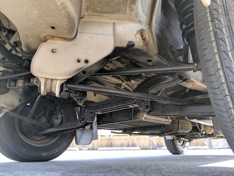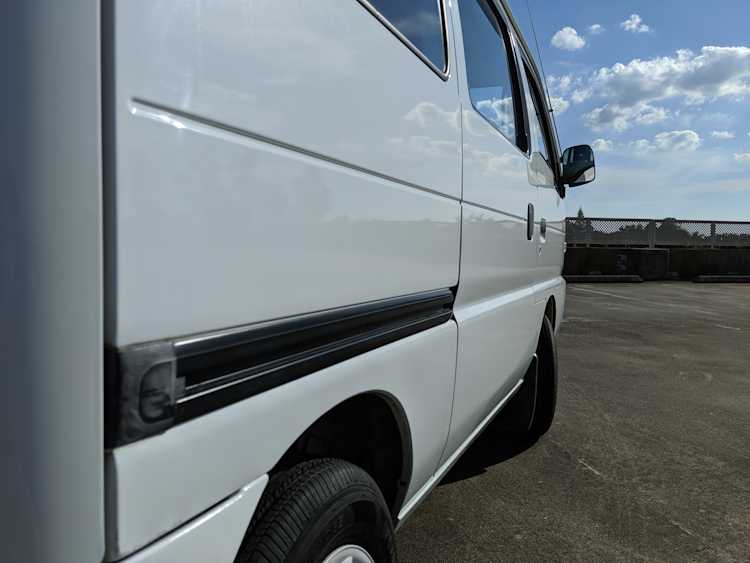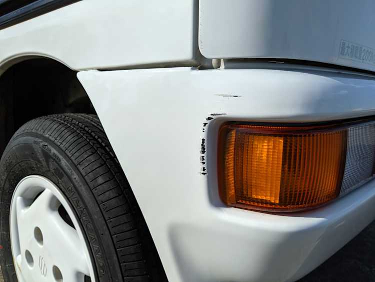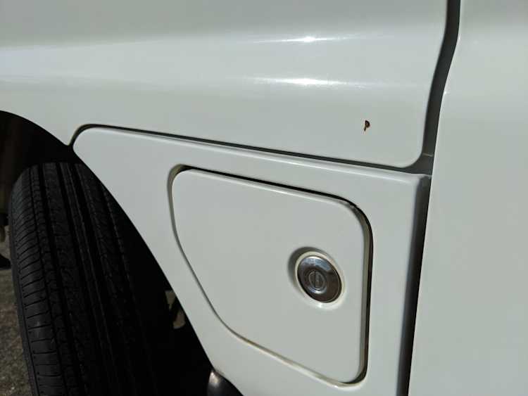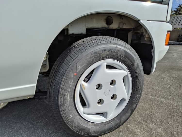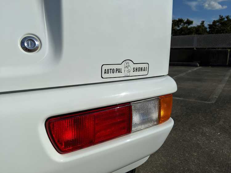 Exterior is white, with a set of white wheel covers. Tires are brand new, with no dents, rust, or corrosion to be found anywhere. Glass is clean, clear and also in perfect condition. Emblems and labels are in wonderfully good shape, with a bonus ‘AUTO PAL SHONAI’ sticker on the rear. Underside is remarkably clean as well. There are a few blemishes on the outside, most notably the front left and rear bumpers as shown in the pictures.