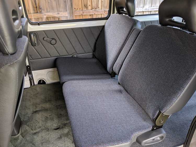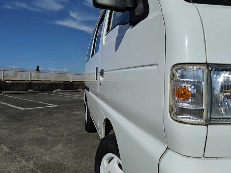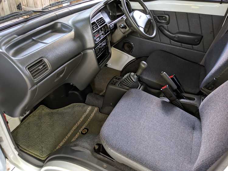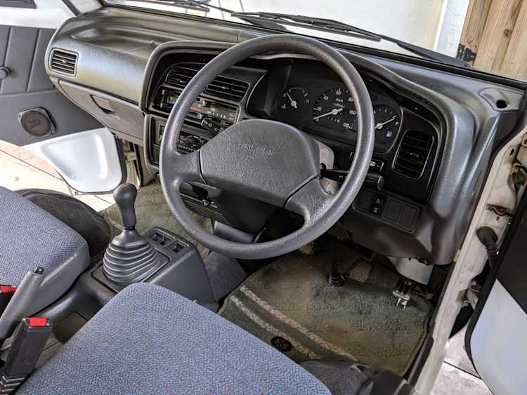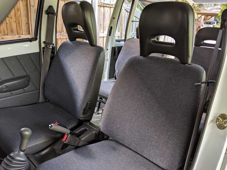 Interior is much like the exterior, just very clean and down-right perfect shape for something from 25 years ago. Fabric is clean and without tears or any visible wear at all. Steering wheel also shows little signs of use, with the rest of the dashboard and various plastics on the inside looking very much new. Floor mats show slight discoloration but otherwise are in good condition. Original stereo tape deck works perfectly, as well as the air conditioning system. Manual windows for all four doors which includes the ability to roll down the glass in the rear sliding doors. The only power lock available in this van is for the rear tailgate. Rear seat passengers get to share a single center armrest, but like most kei vans of this era they do not get seat belts. Front seats get standard shoulder belts. Rear cargo area is, you guessed it, extremely clean and shows almost no wear. Rear seats can be folded flat into the floor to give even more cargo capacity.