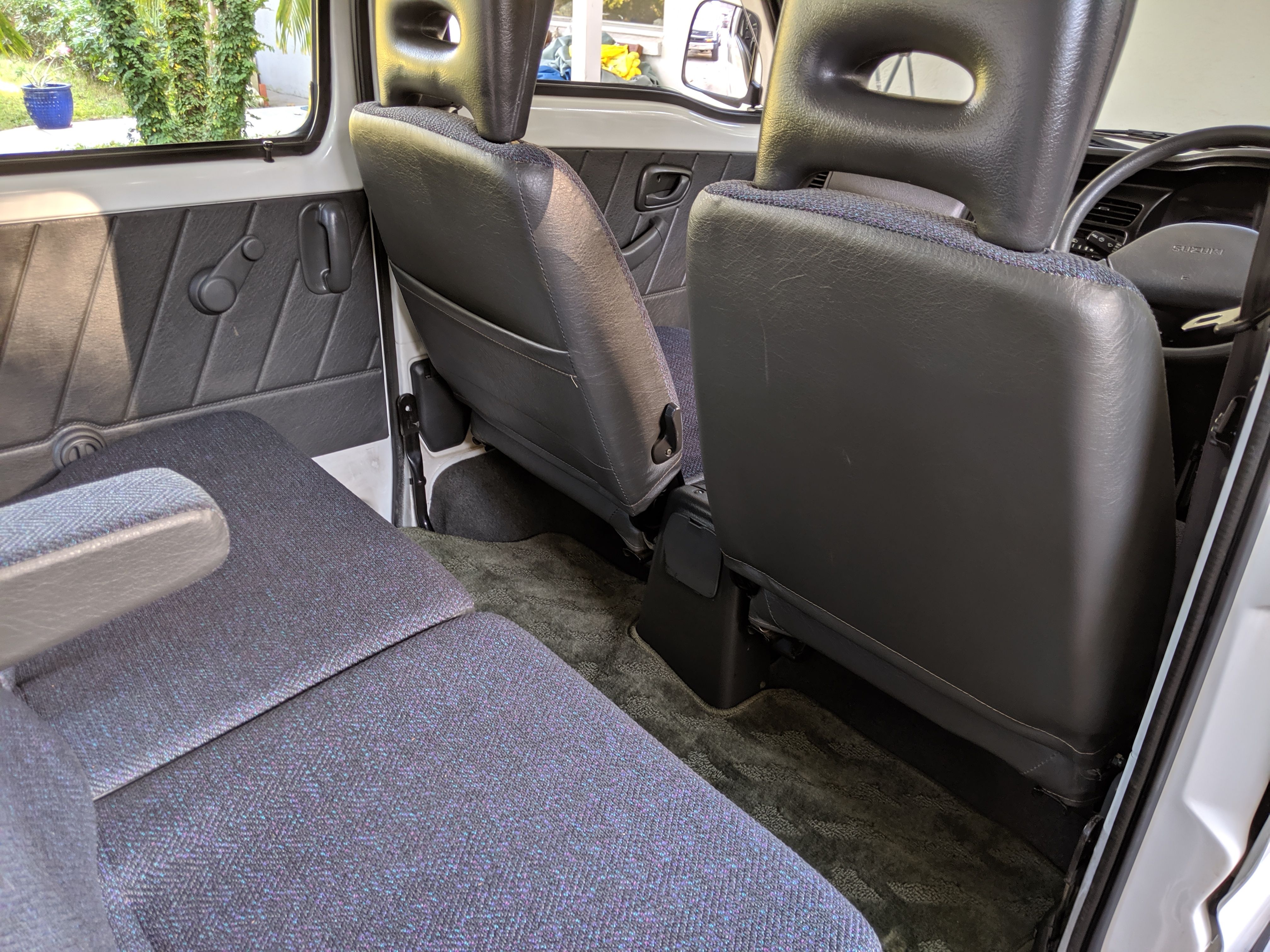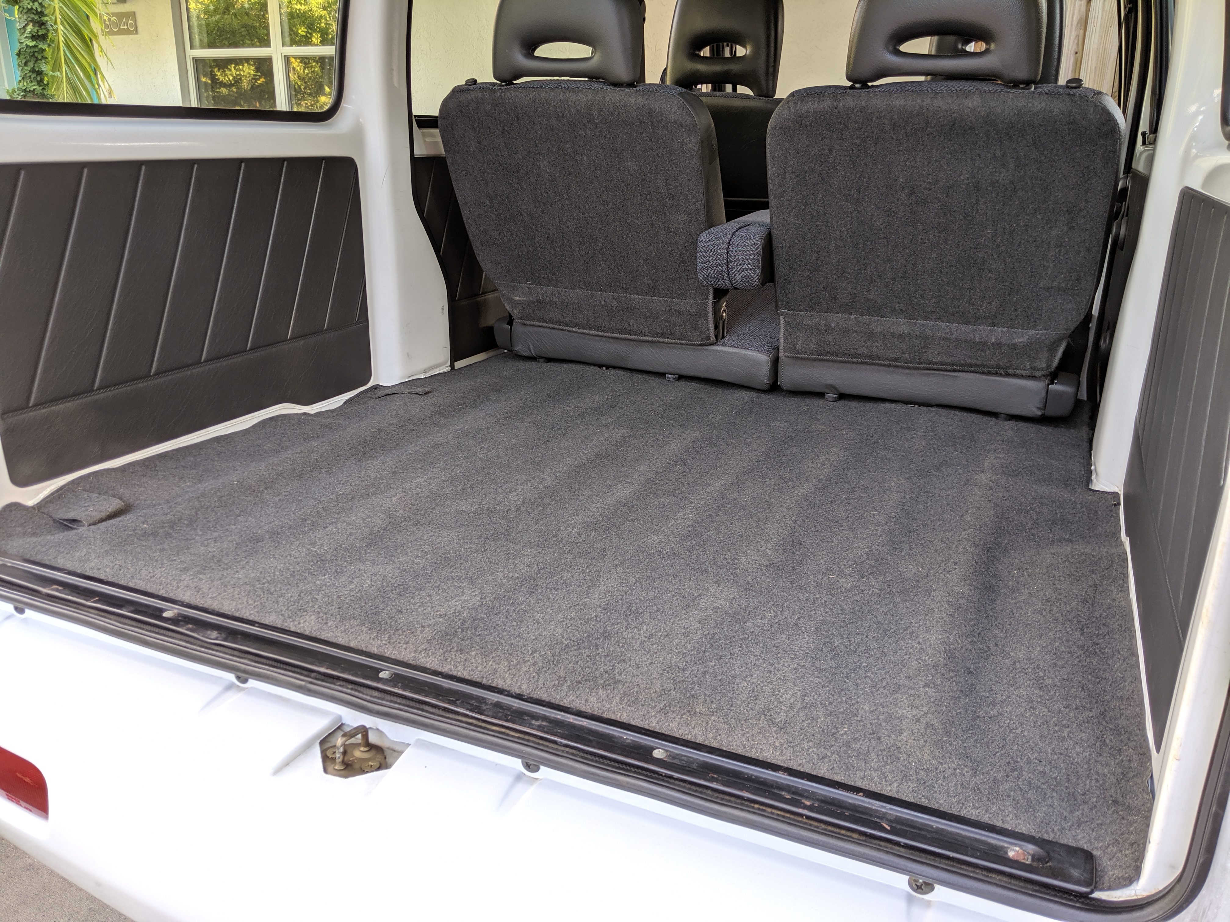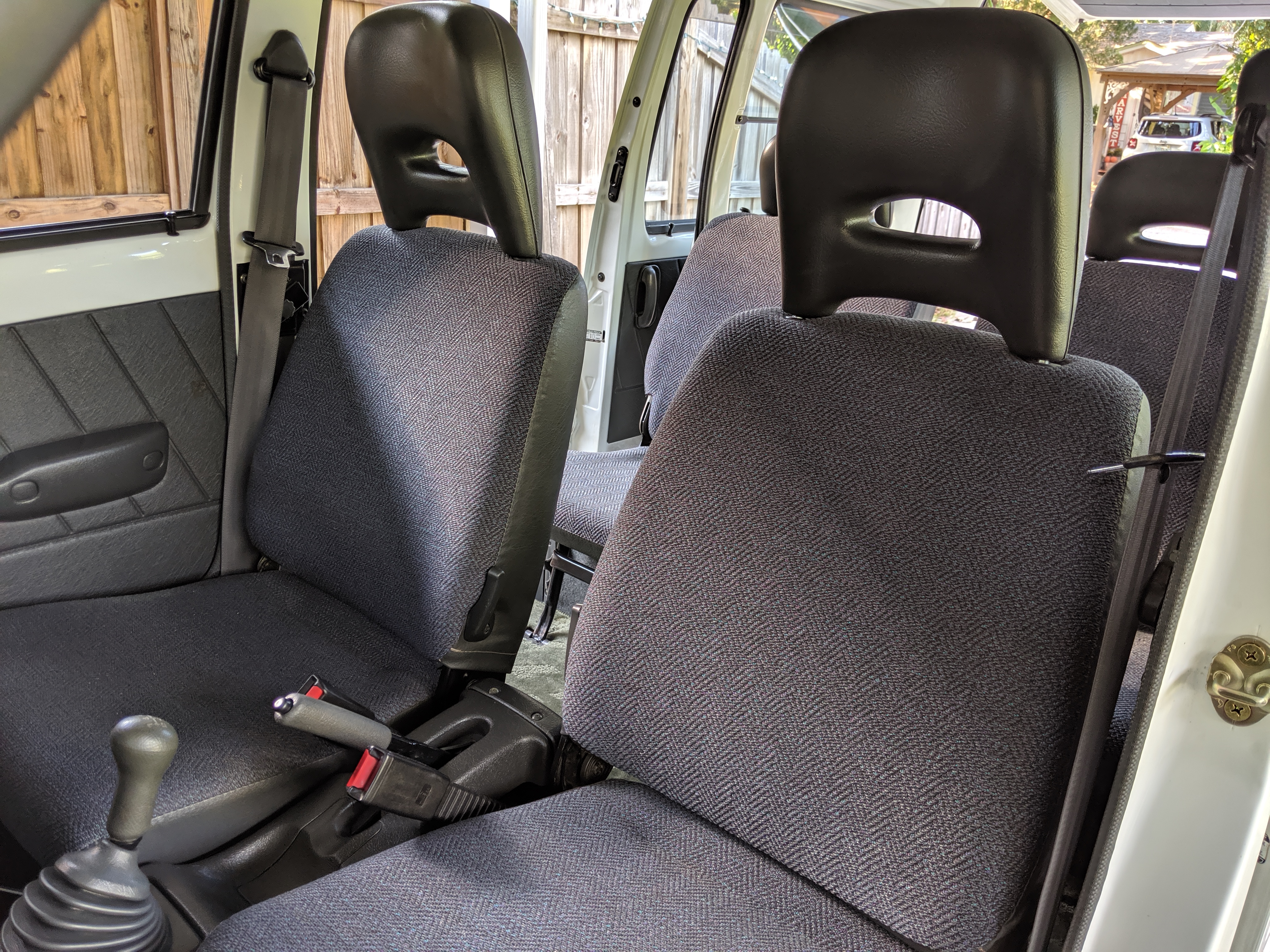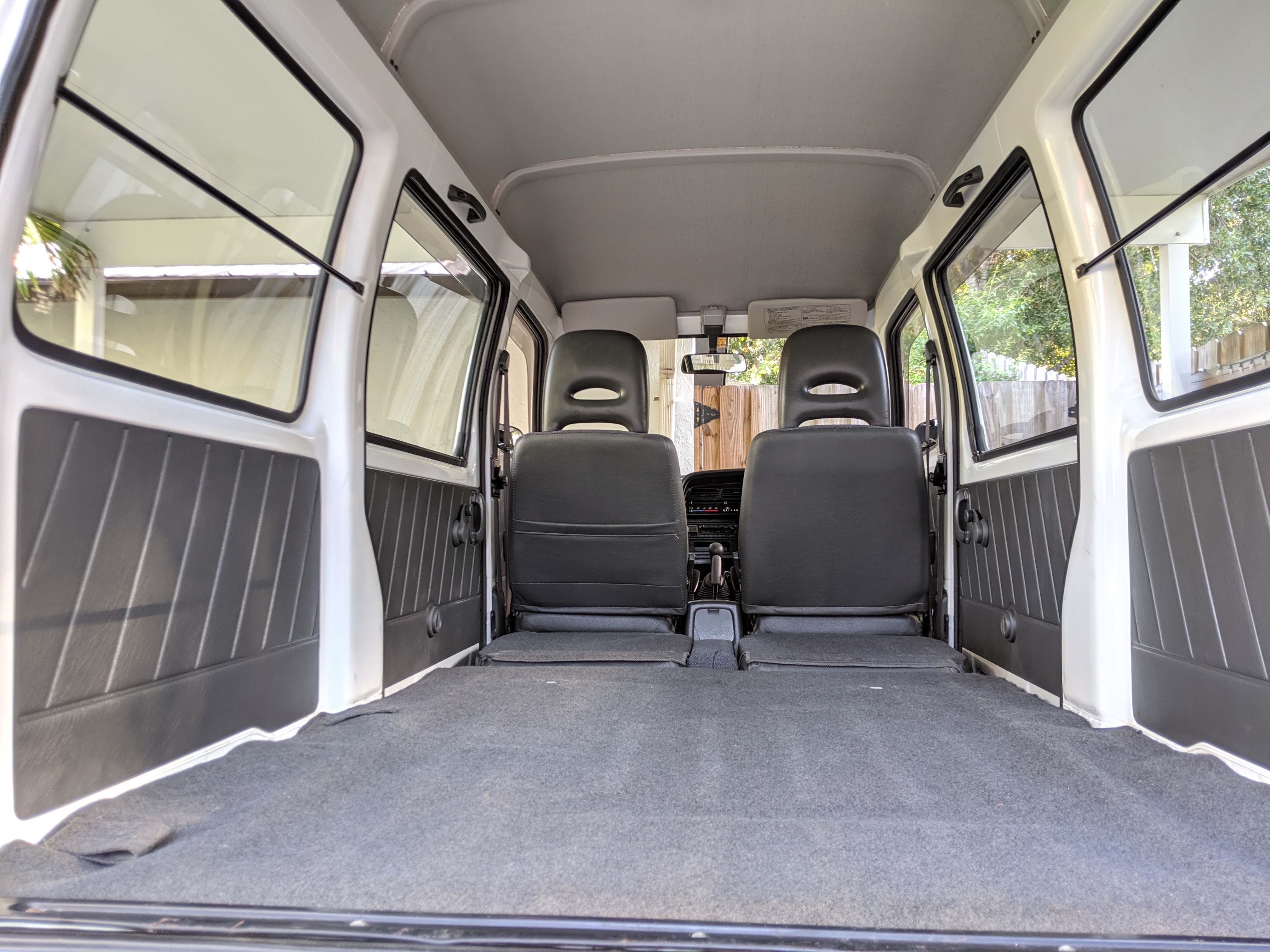 Interior is much like the exterior, just very clean and down-right perfect shape for something from 25 years ago. Fabric is clean and without tears or any visible wear at all. Steering wheel also shows little signs of use, with the rest of the dashboard and various plastics on the inside looking very much new. Floor mats show slight discoloration but otherwise are in good condition. Original stereo tape deck works perfectly, as well as the air conditioning system. Manual windows for all four doors which includes the ability to roll down the glass in the rear sliding doors. The only power lock available in this van is for the rear tailgate. Rear seat passengers get to share a single center armrest, but like most kei vans of this era they do not get seat belts. Front seats get standard shoulder belts. Rear cargo area is, you guessed it, extremely clean and shows almost no wear. Rear seats can be folded flat into the floor to give even more cargo capacity.