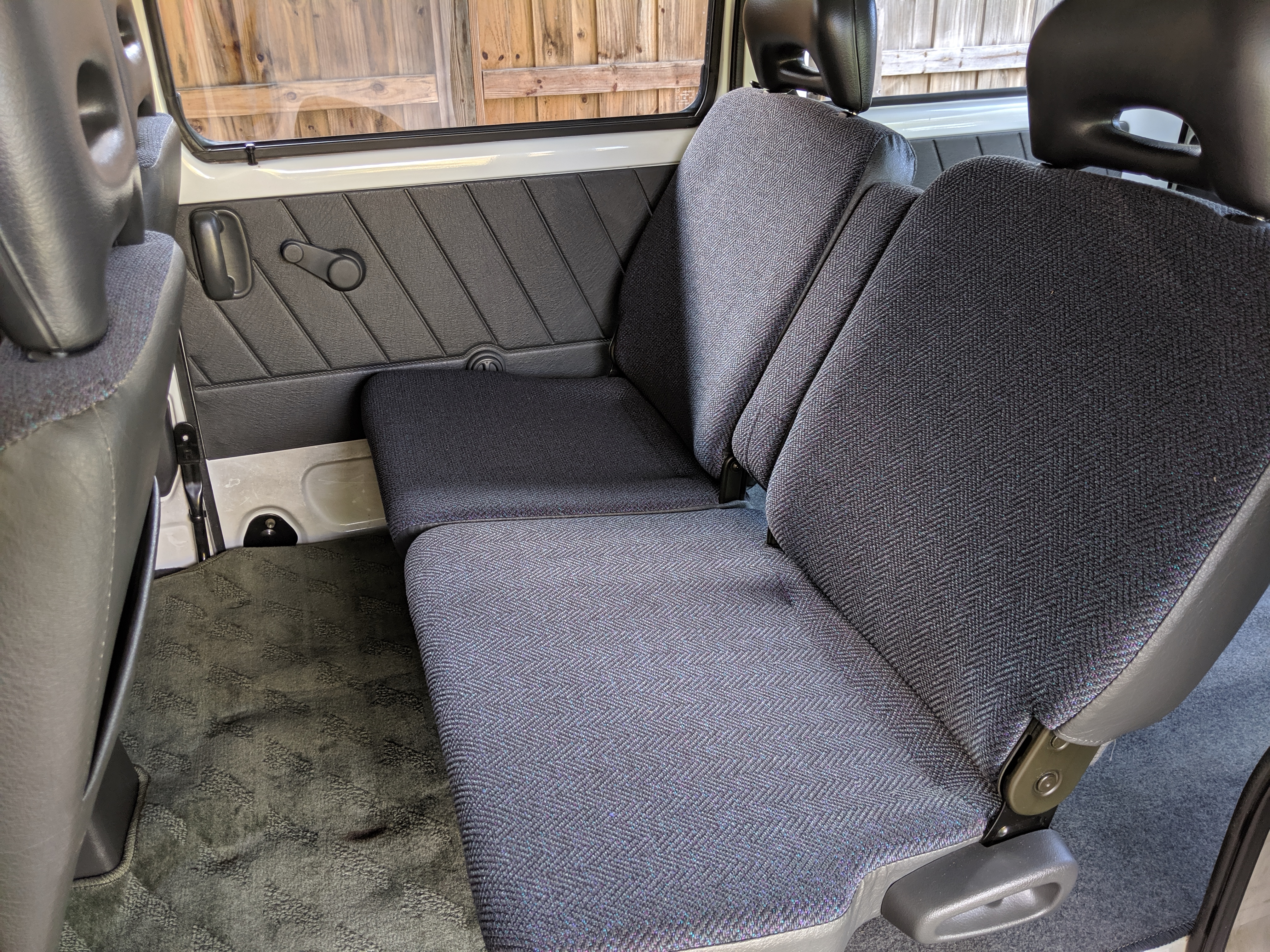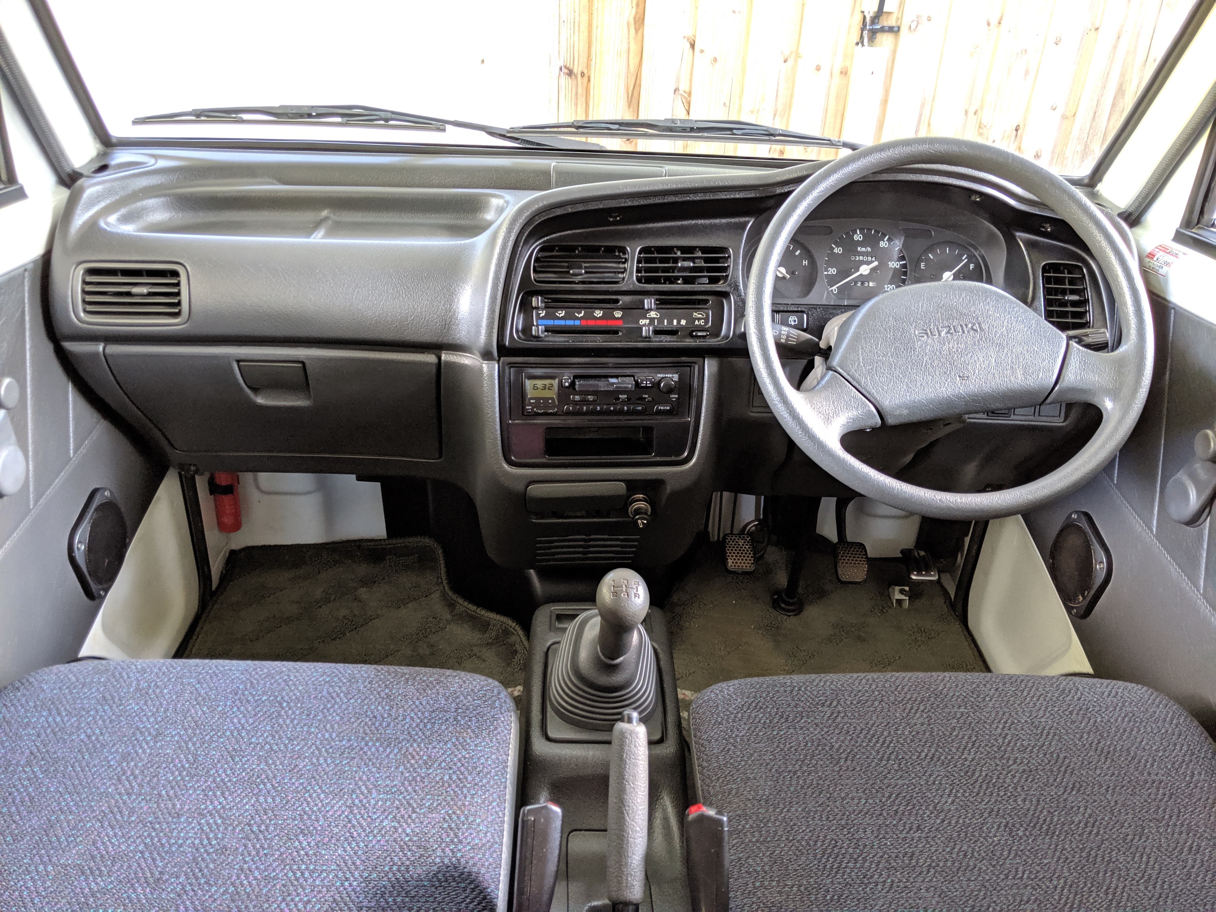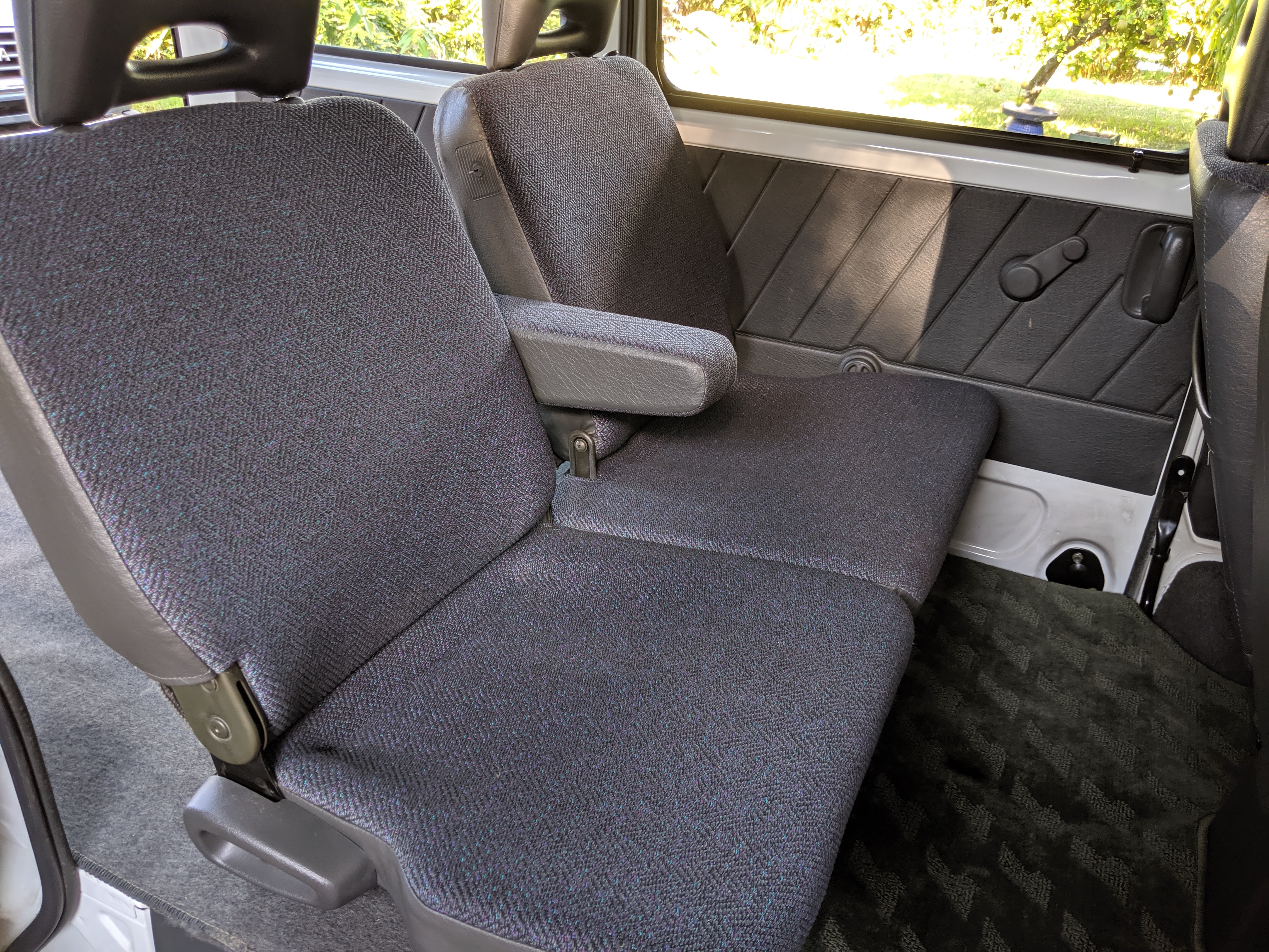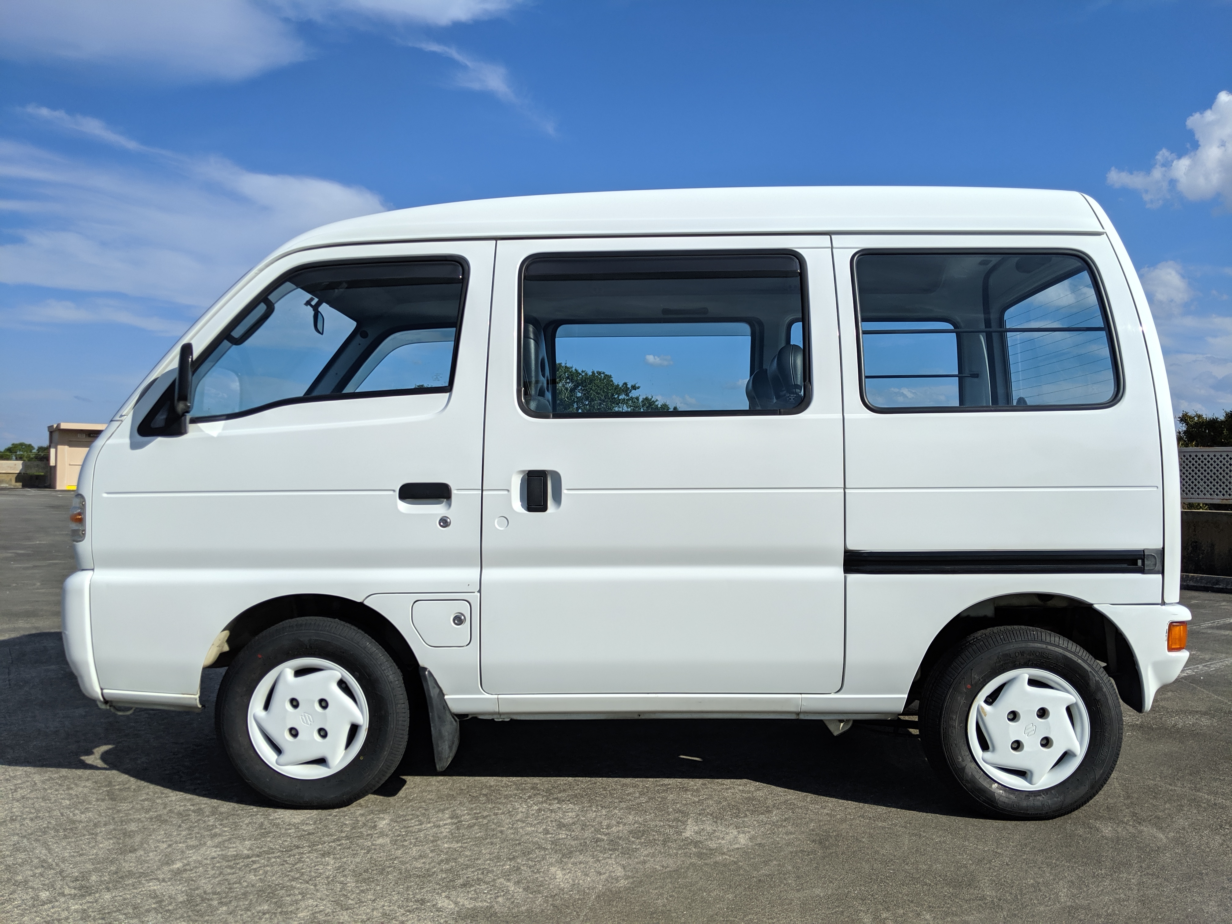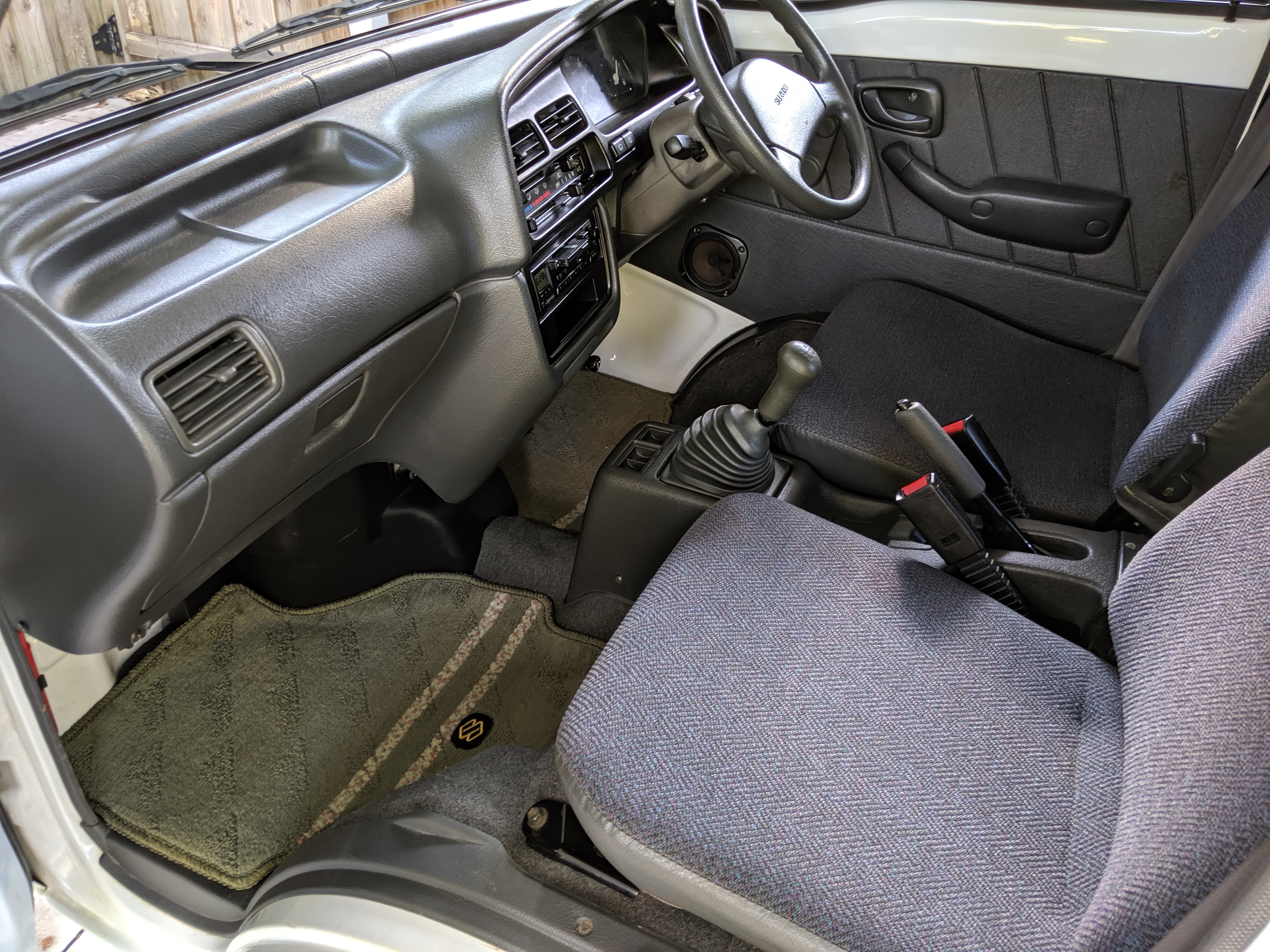 Interior is much like the exterior, just very clean and down-right perfect shape for something from 25 years ago. Fabric is clean and without tears or any visible wear at all. Steering wheel also shows little signs of use, with the rest of the dashboard and various plastics on the inside looking very much new. Floor mats show slight discoloration but otherwise are in good condition. Original stereo tape deck works perfectly, as well as the air conditioning system. Manual windows for all four doors which includes the ability to roll down the glass in the rear sliding doors. The only power lock available in this van is for the rear tailgate. Rear seat passengers get to share a single center armrest, but like most kei vans of this era they do not get seat belts. Front seats get standard shoulder belts. Rear cargo area is, you guessed it, extremely clean and shows almost no wear. Rear seats can be folded flat into the floor to give even more cargo capacity.