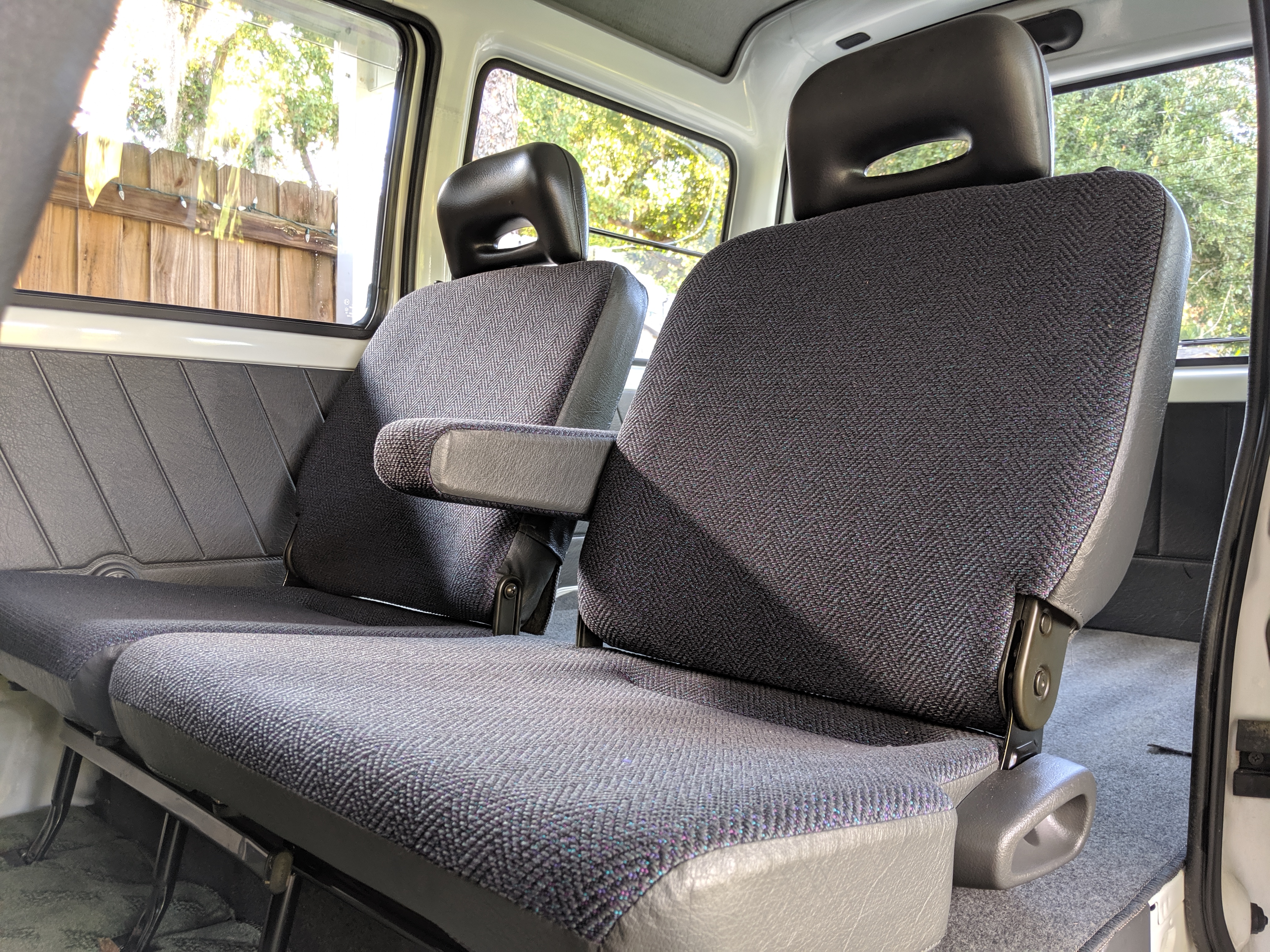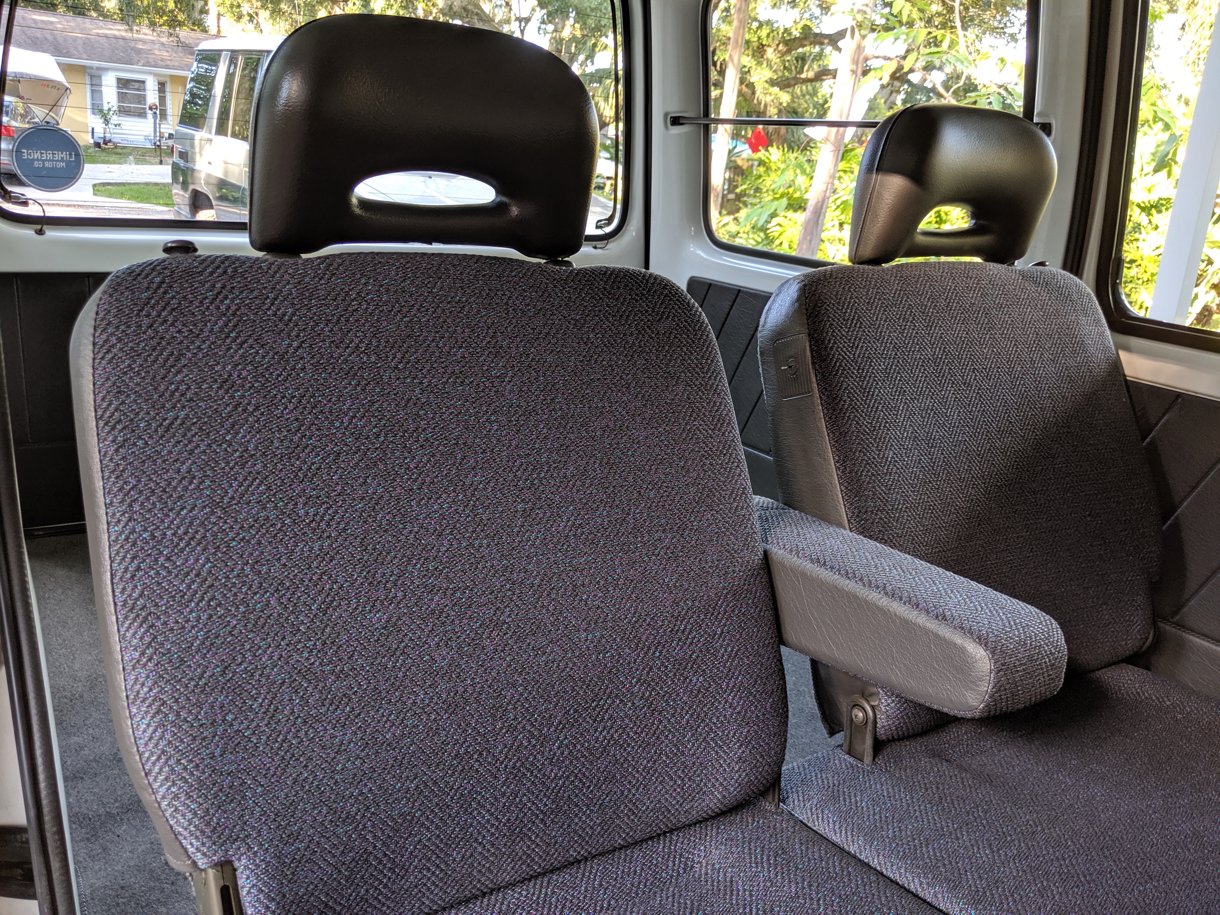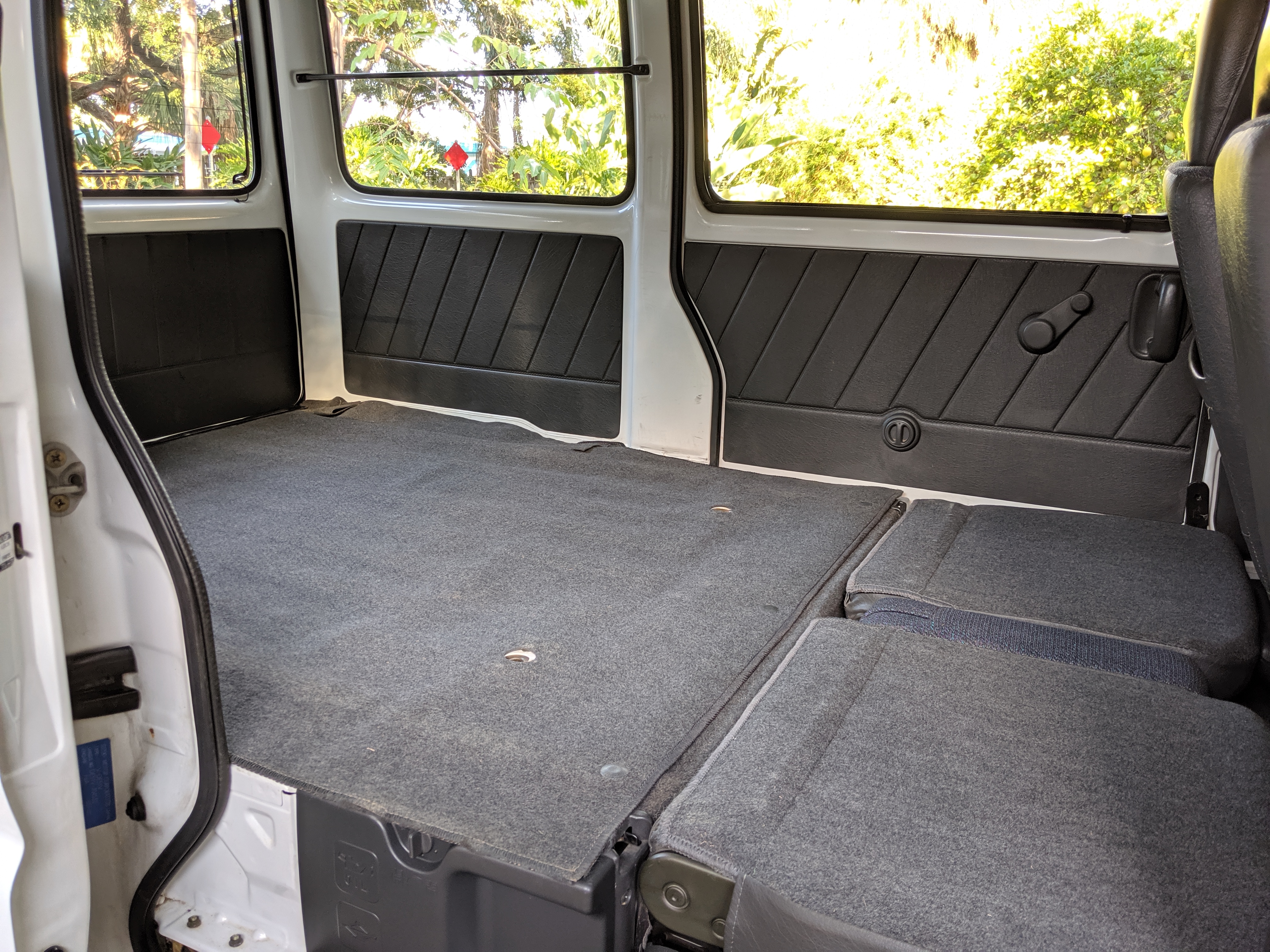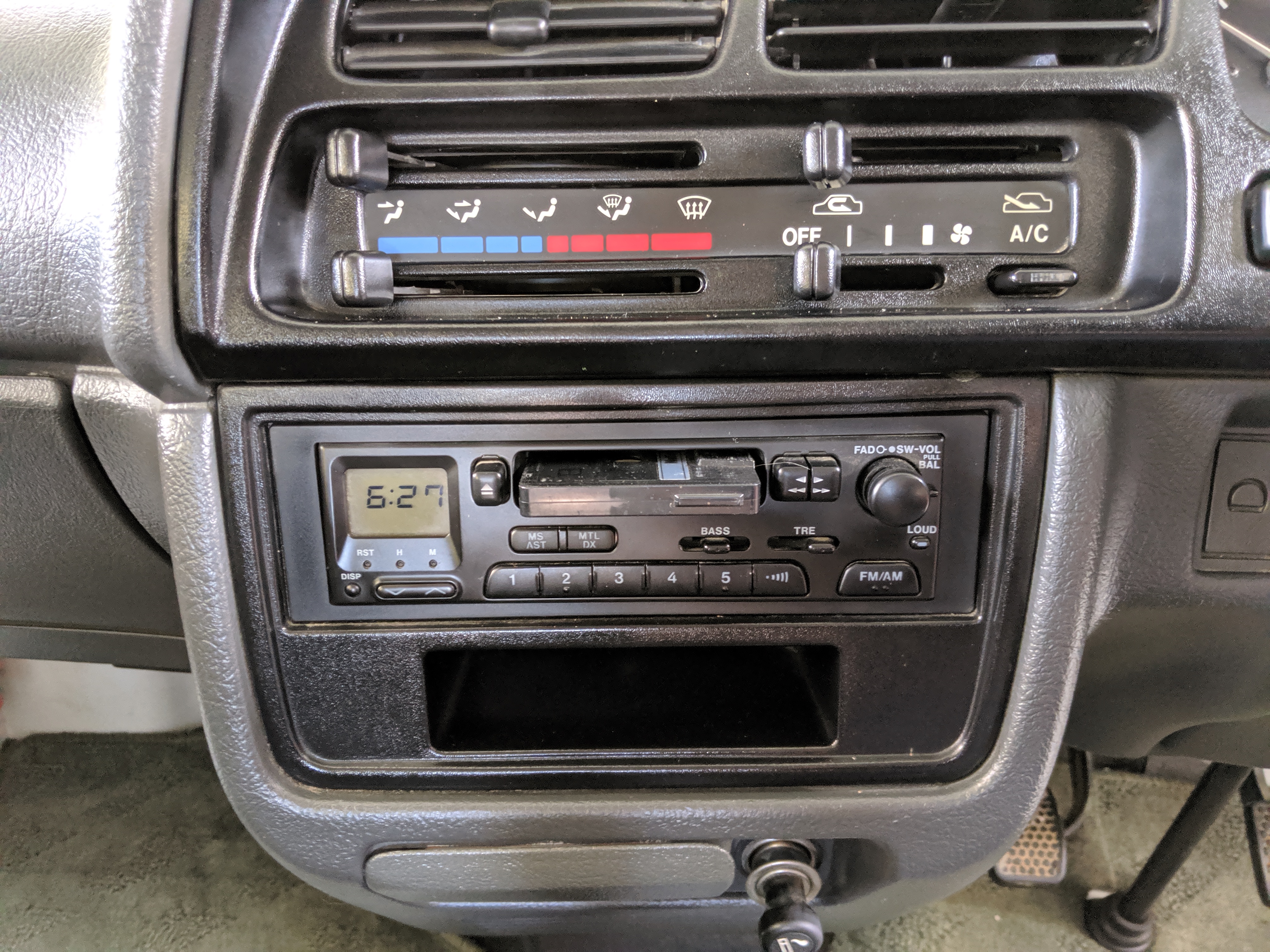 Interior is much like the exterior, just very clean and down-right perfect shape for something from 25 years ago. Fabric is clean and without tears or any visible wear at all. Steering wheel also shows little signs of use, with the rest of the dashboard and various plastics on the inside looking very much new. Floor mats show slight discoloration but otherwise are in good condition. Original stereo tape deck works perfectly, as well as the air conditioning system. Manual windows for all four doors which includes the ability to roll down the glass in the rear sliding doors. The only power lock available in this van is for the rear tailgate. Rear seat passengers get to share a single center armrest, but like most kei vans of this era they do not get seat belts. Front seats get standard shoulder belts. Rear cargo area is, you guessed it, extremely clean and shows almost no wear. Rear seats can be folded flat into the floor to give even more cargo capacity.