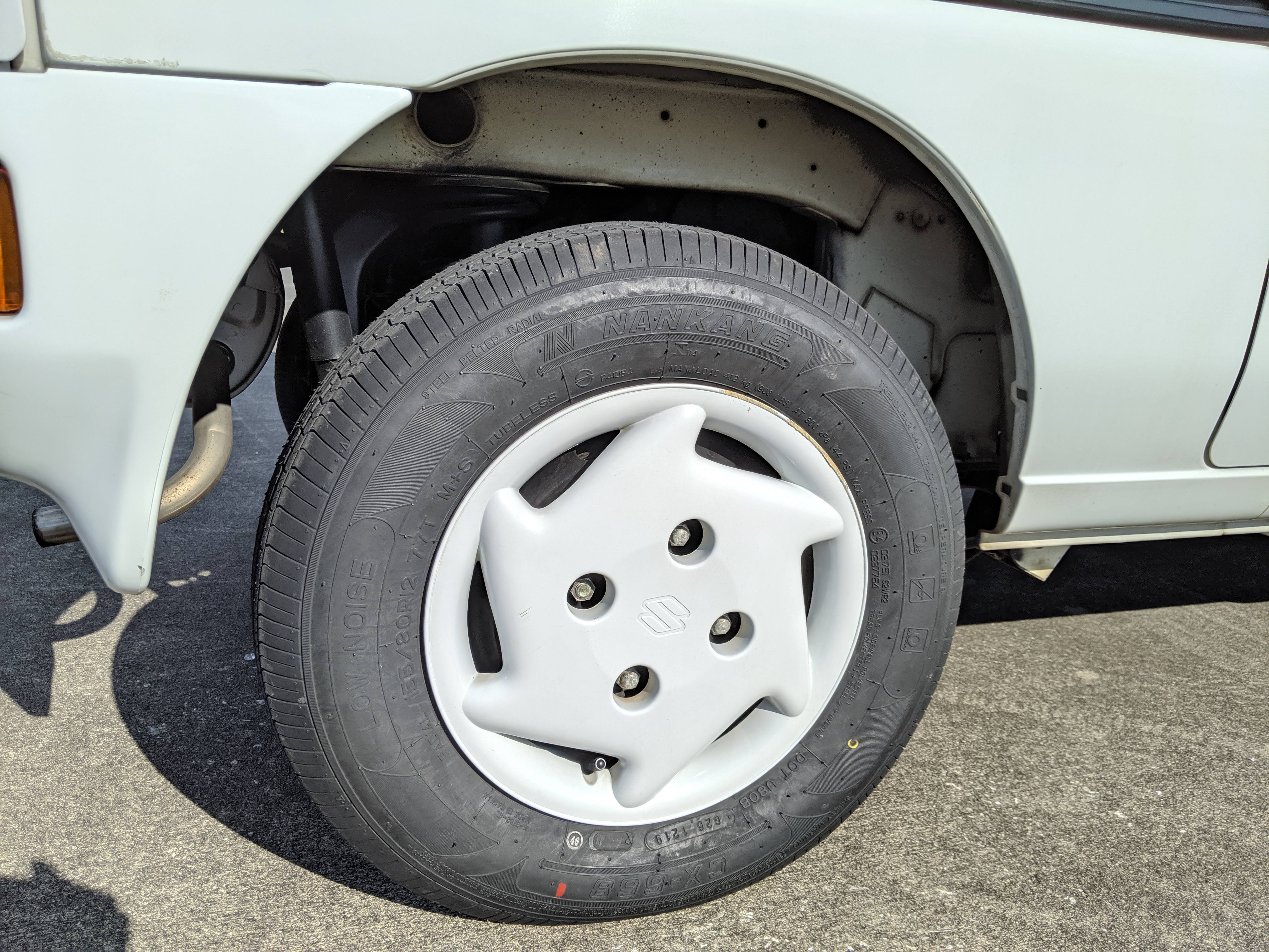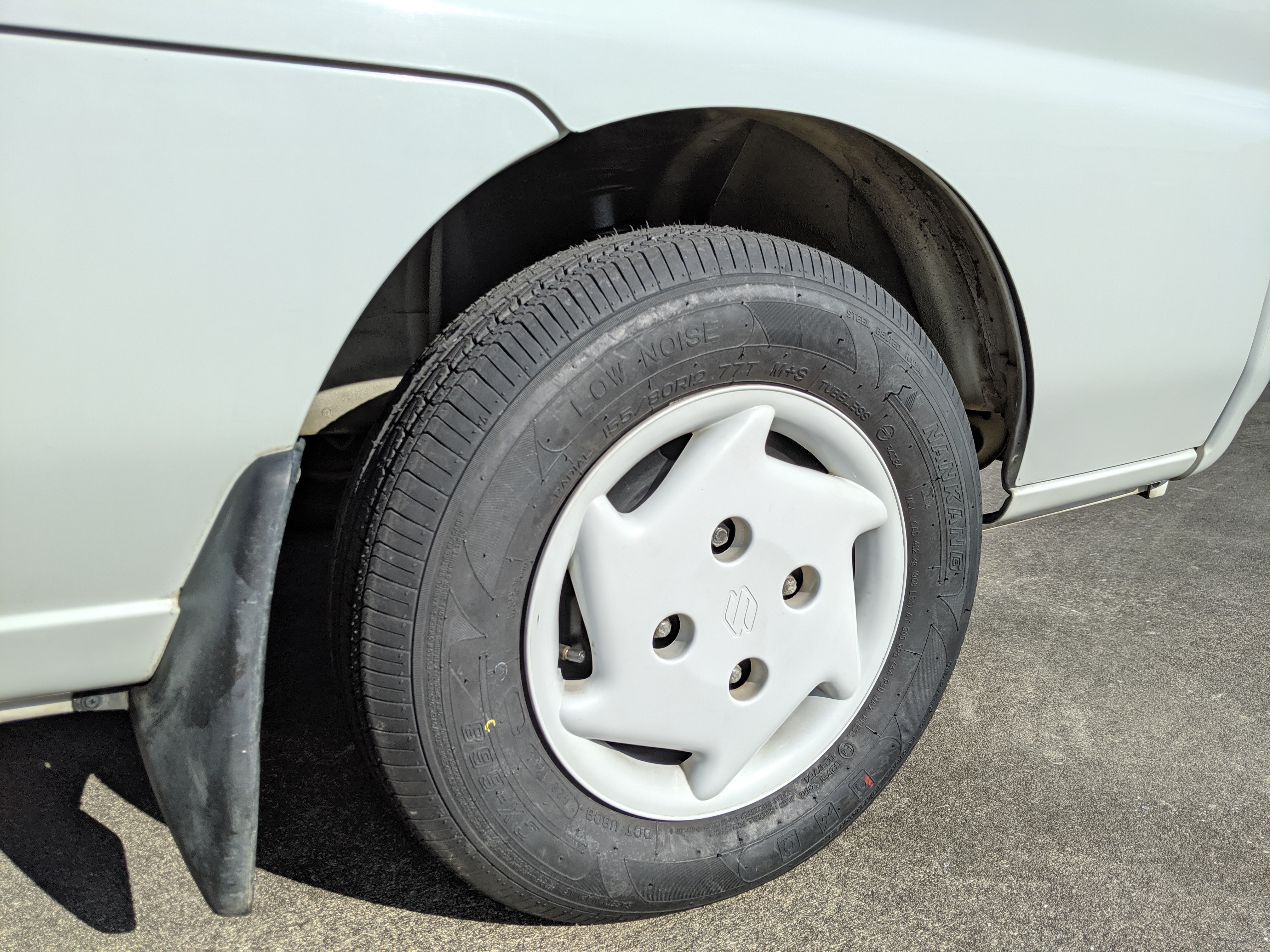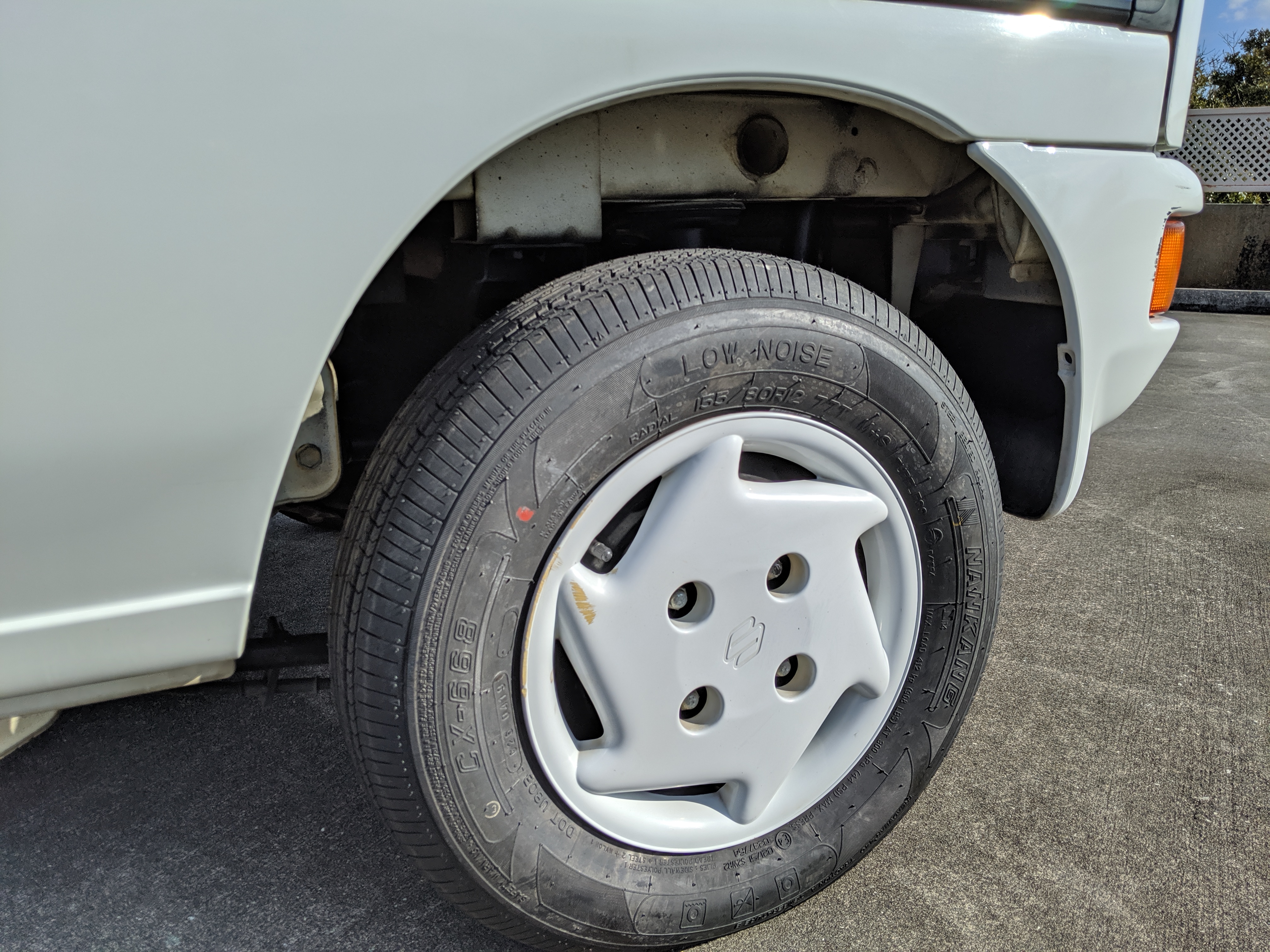 Exterior is white, with a set of white wheel covers. Tires are brand new, with no dents, rust, or corrosion to be found anywhere. Glass is clean, clear and also in perfect condition. Emblems and labels are in wonderfully good shape, with a bonus ‘AUTO PAL SHONAI’ sticker on the rear. Underside is remarkably clean as well. There are a few blemishes on the outside, most notably the front left and rear bumpers as shown in the pictures.