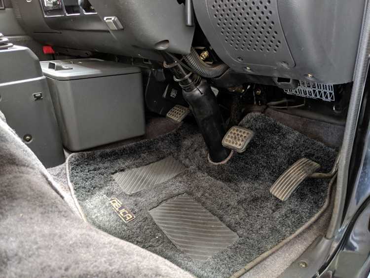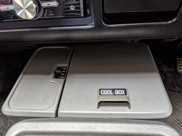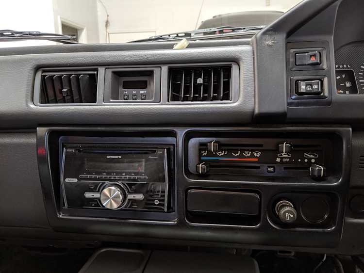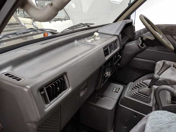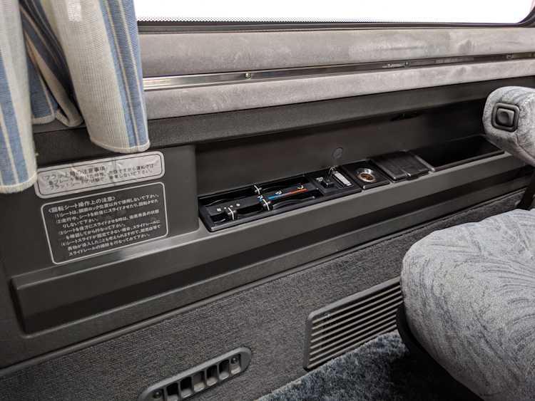 Inside is the good stuff. Thick pile carpeting and even thicker floor mats with Chamonix-style seats throughout. Everything is where it should be, save for they center pod that usually goes on the dashboard that includes an interior and exterior thermometer and inclinometer. Previous owner had a (poorly installed) TV installed there, though the vehicle included the OEM inclinometer pod. We had to have that shipped separately, and it is included with the purchase of the van. Besides that, everything is clean, clear and in glorious original condition. Gauge cluster says it all, with an odometer showing under 86,000 total kms, translating to an absurdly low 54,000 miles. In the center starting at the bottom you’ve got the functioning COOL BOX, which can both heat and cool its contents and also make ice. Above that is the HVAC controls, including excellent functional air conditioning and heat. The original double-din OEM headunit will also be included (it is in the same shipment as the inclinometer) though a Pioneer unit is installed at the moment, giving you a CD player, USB and AUX input. Above the rearview mirror and dome lights are controls for the rear Crystal Lite Roof shade controls with a manual sunroof just for the driver and front passenger. The glove box contains the original Delica user’s manual.