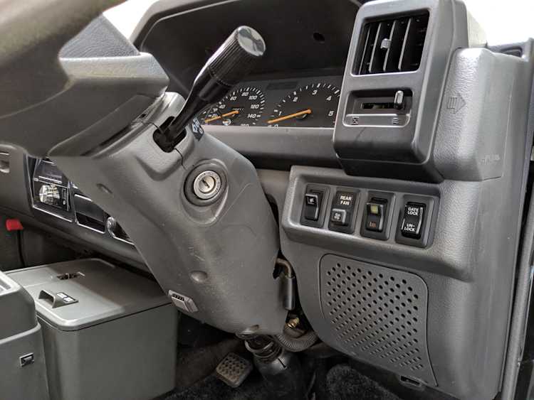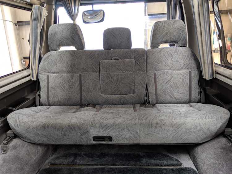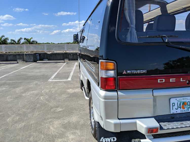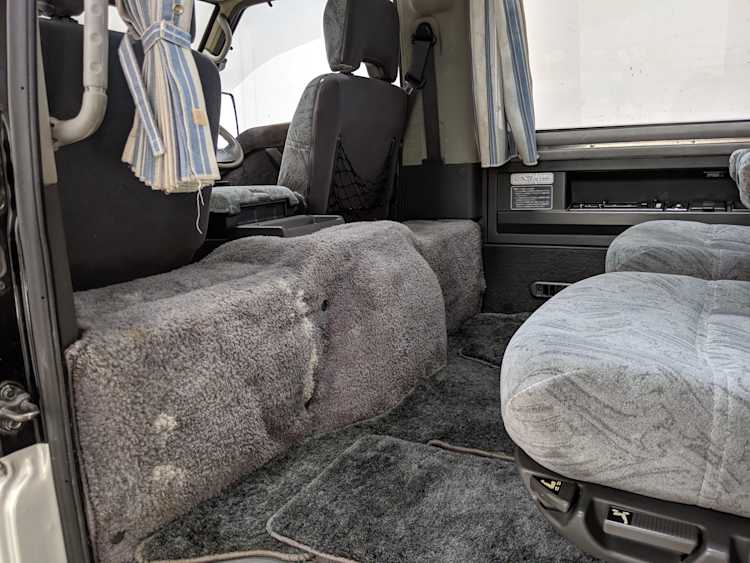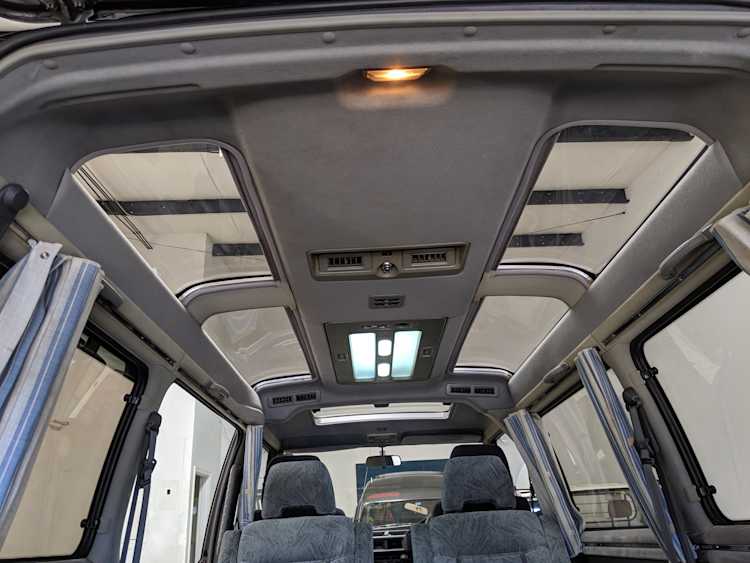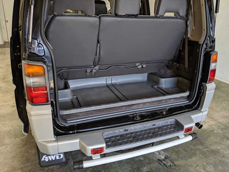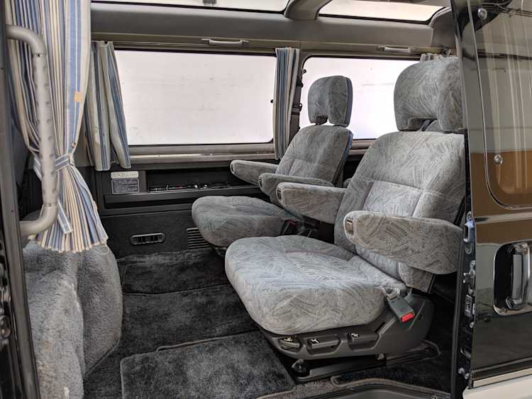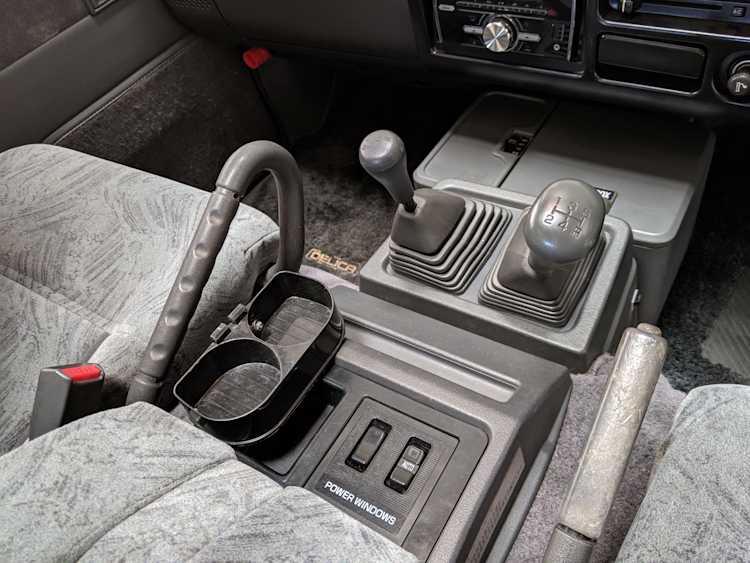 In back is the real place to be, with two spinning captain’s chairs in the same luscious fabric as the front, which can be spun around 360 degrees locking at various points, though it should be noted that in order to use the shoulder belts you must be facing forward. These two chairs can also slide forward and backward along the floor. The rear bench seat is donned in the familiar fabric pattern and has a center armrest. On the right wall opposite the sliding door is the rear controls for the rear heater and AC unit. Controls are also located for the driver up front. All the original floor mats are included and are way softer than floor mats should be for any vehicle. In the rear cargo area is a little bonus in the form of a plastic tray embossed with ‘MITSUBISHI’. Above in the roof is the defining characteristic of high-trim Delicas, the Crystal Lite Roof. 4 large curved glass panels give a excellent view of the sky while driving. Each shade can be individually opened or closed, or be toggled all at once. Rear vents and a large overhead fluorescent light show up here as well. Please note that the left front rear shade is ‘sticky’, the reason is the cable that drives the shade is damaged a bit meaning it can close all the way but will need to be helped along to open back up. Completing the aesthetic is curtains that can be drawn over all the exterior rear windows. You’d be hard pressed to find a newer, lower mileage, manual transmission Super Exceed. These L300 Delicas have the following they do for a reason, if you’d like to jump in you couldn’t do better than this 1994 Delica.