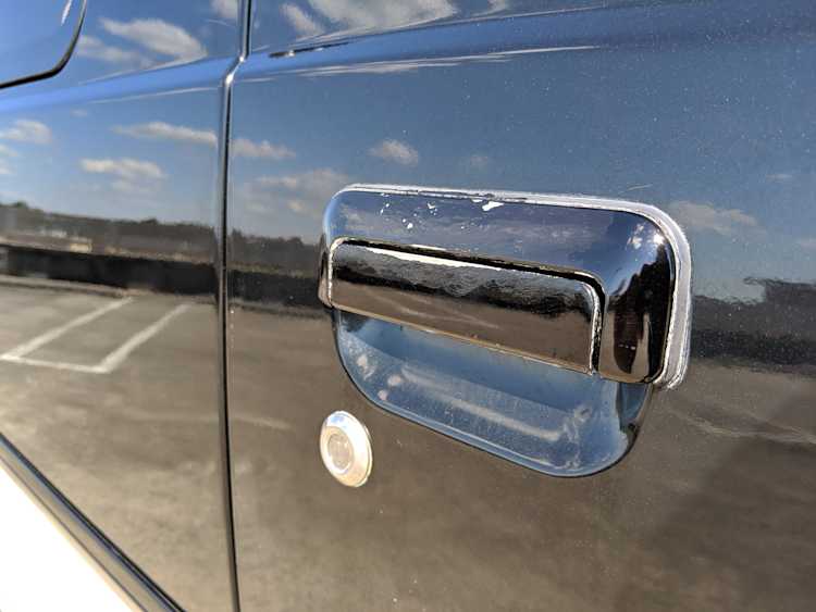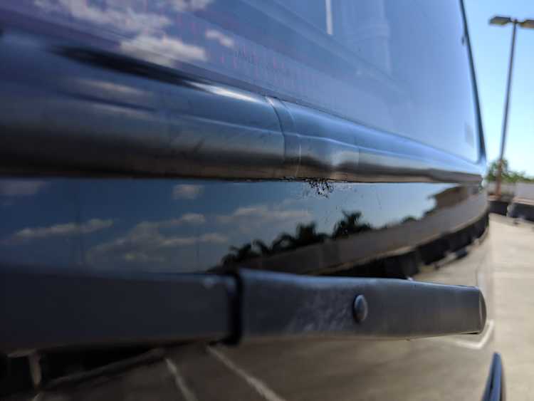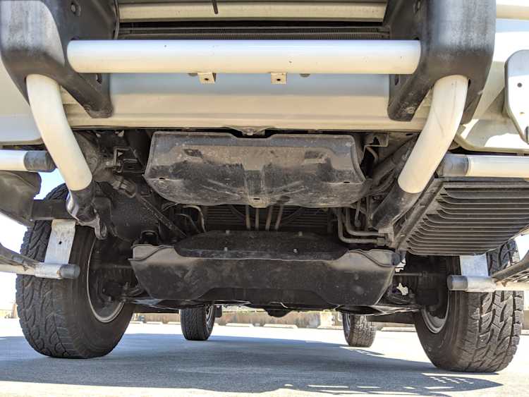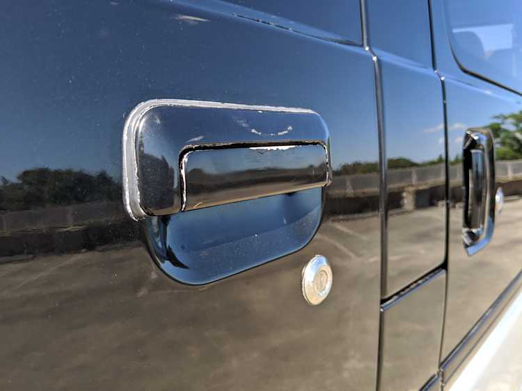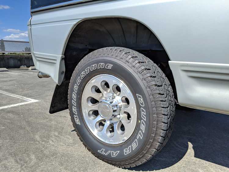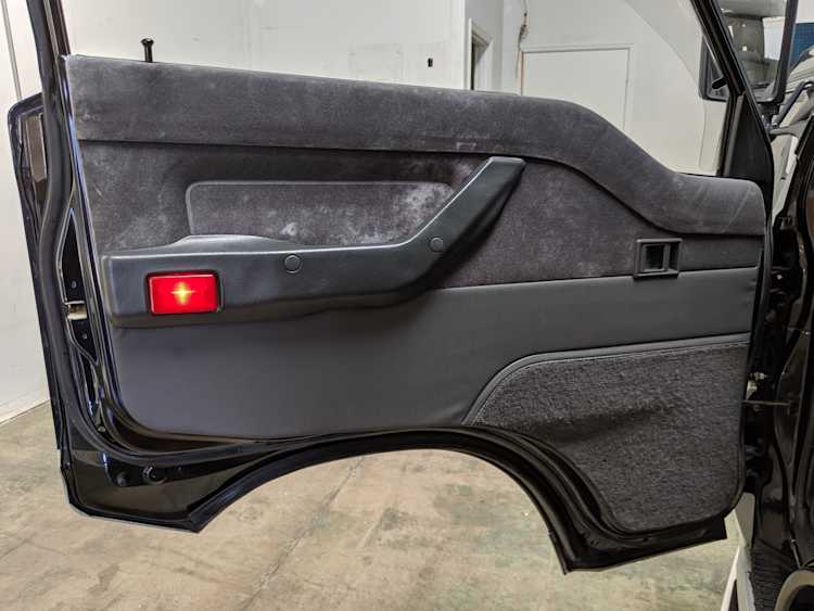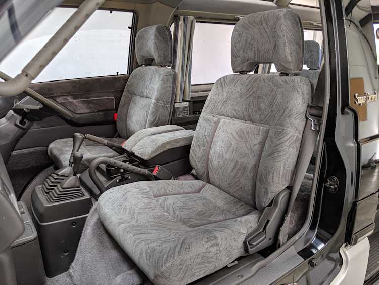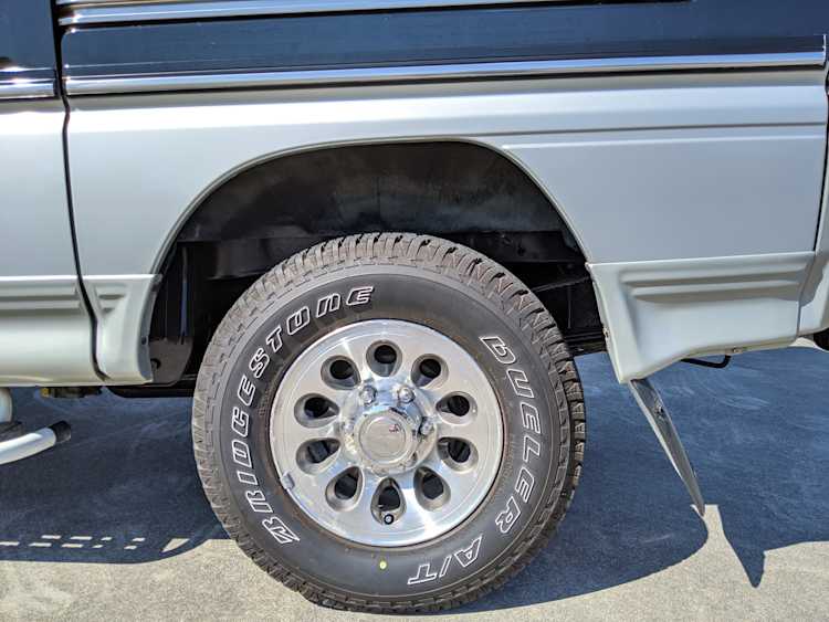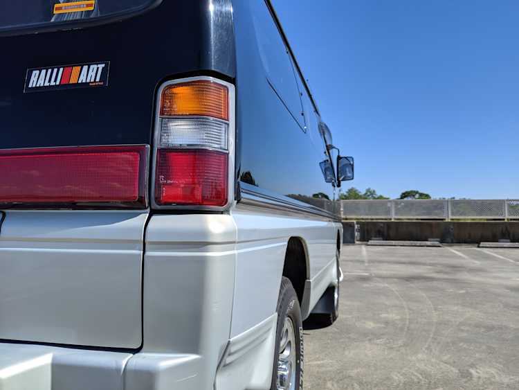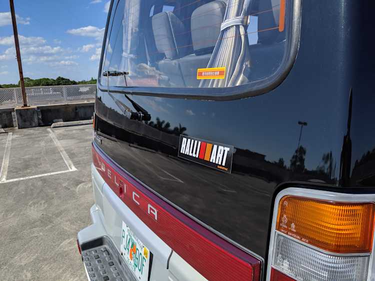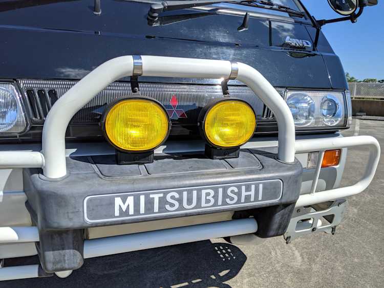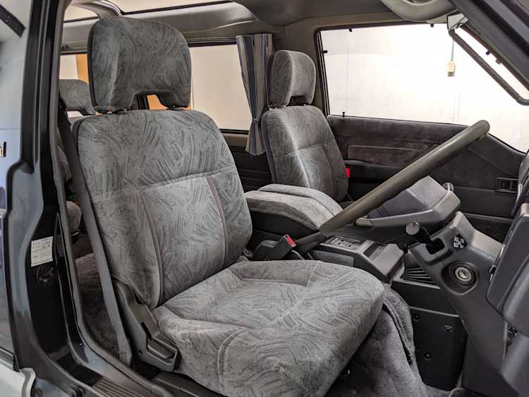 This Delica wears two tone paint, slightly sparkly black on top and silver along the bottom. Factory bull bar, side step and rear bumper bar are in excellent condition. Original wheels with their included center caps are in good shape as are the tires that wrap them. Flaws and blemishes are few for a vehicle 25 years old. A small bubble is forming just under the rear glass. Front door handles do show a poor attempt to paint. All glass is clean and clear. Underside is exceptionally clean as the skid plates show no damage or wear. To say this was never taken offroad wouldn’t be surprising, but it’s almost like it was never driven at all! On the back you get a cool ‘Ralli Art Club Style’ sticker.