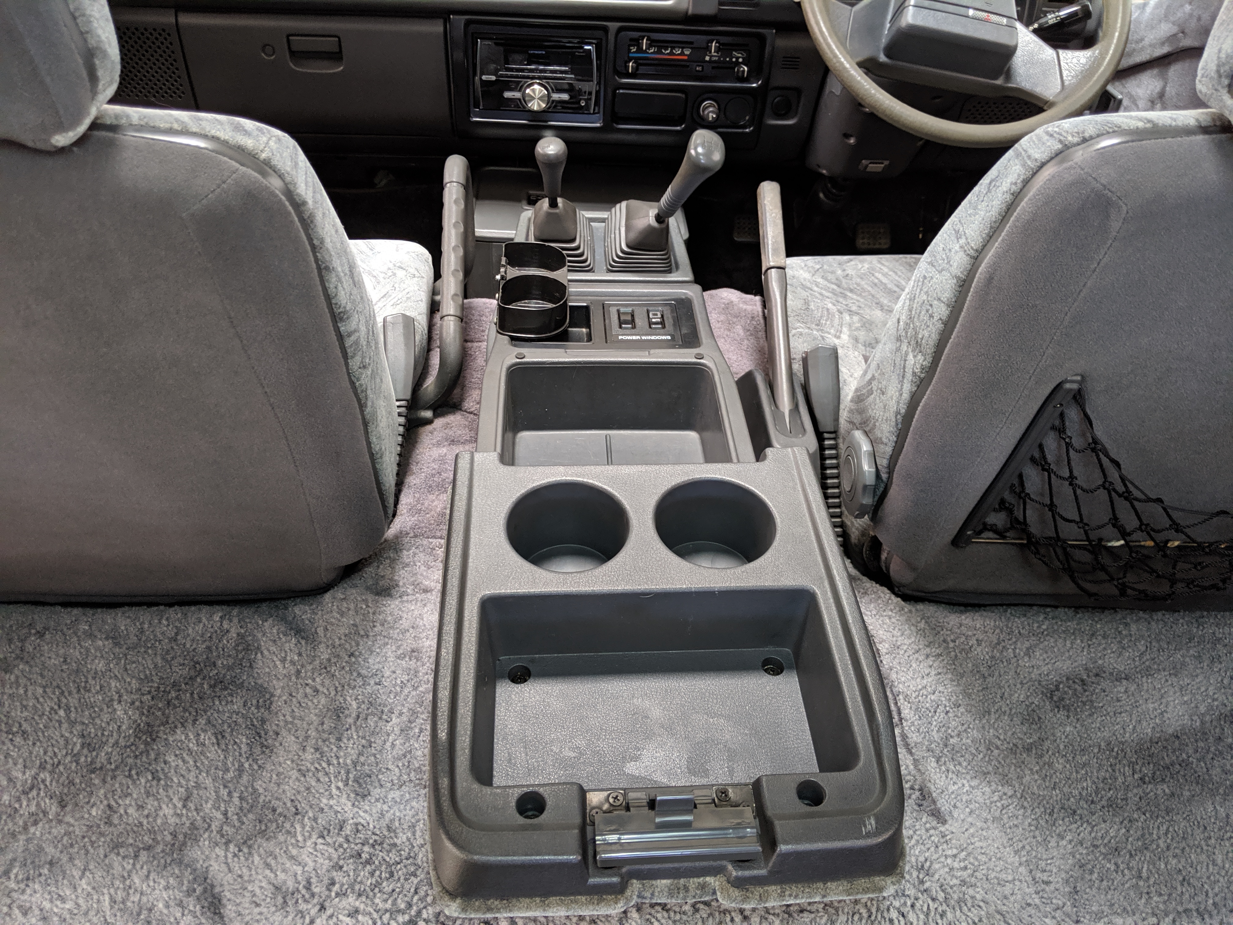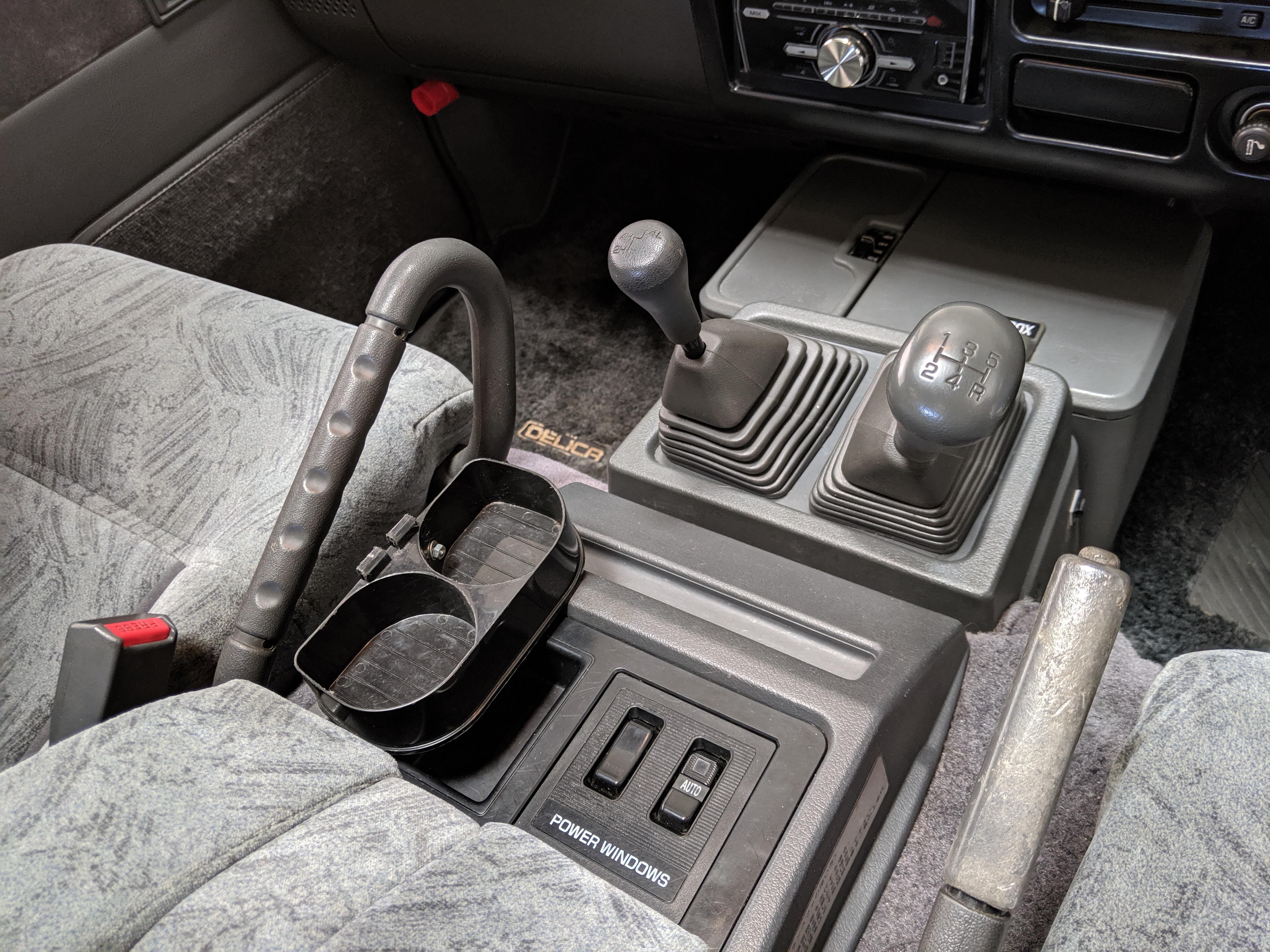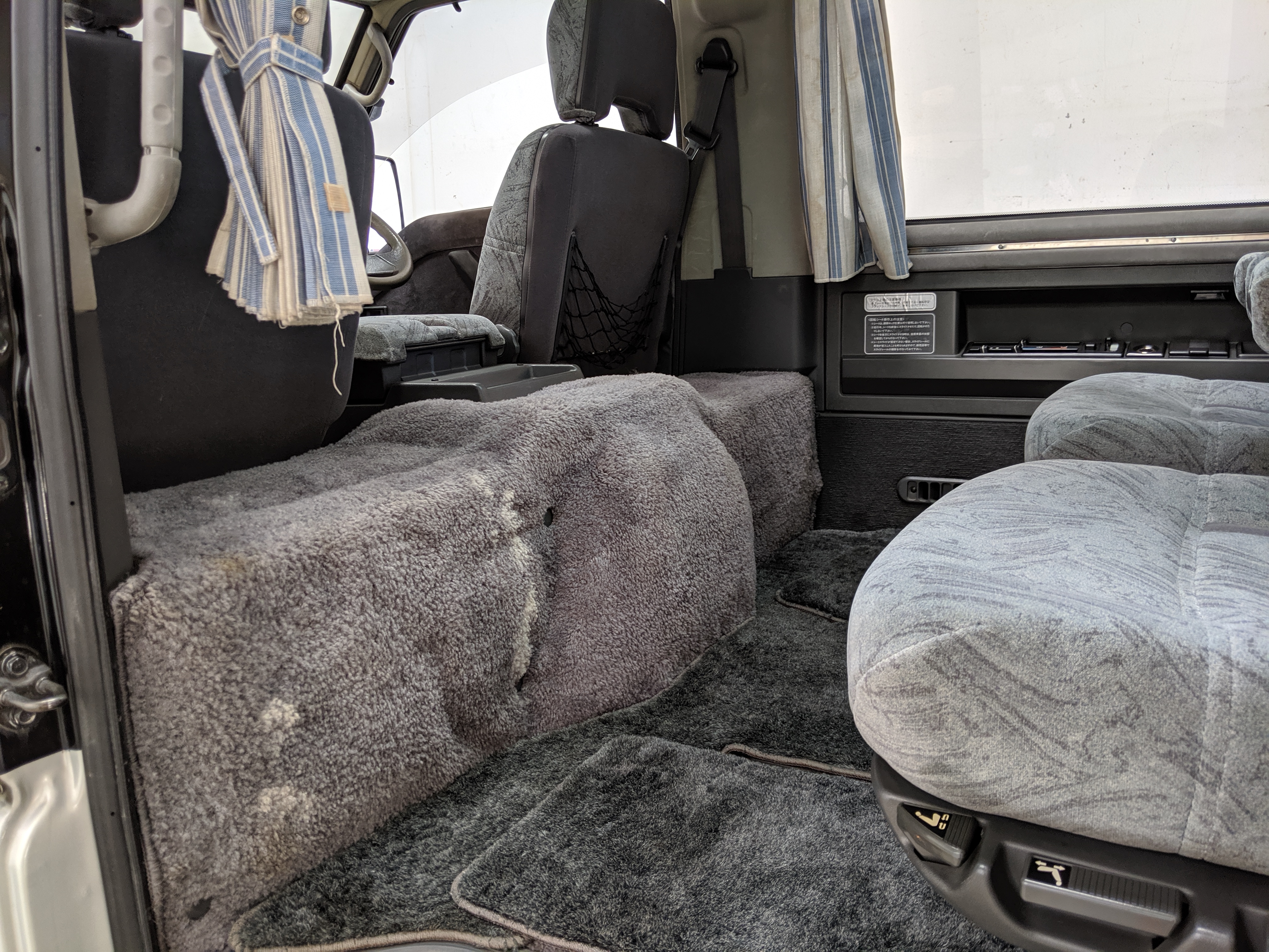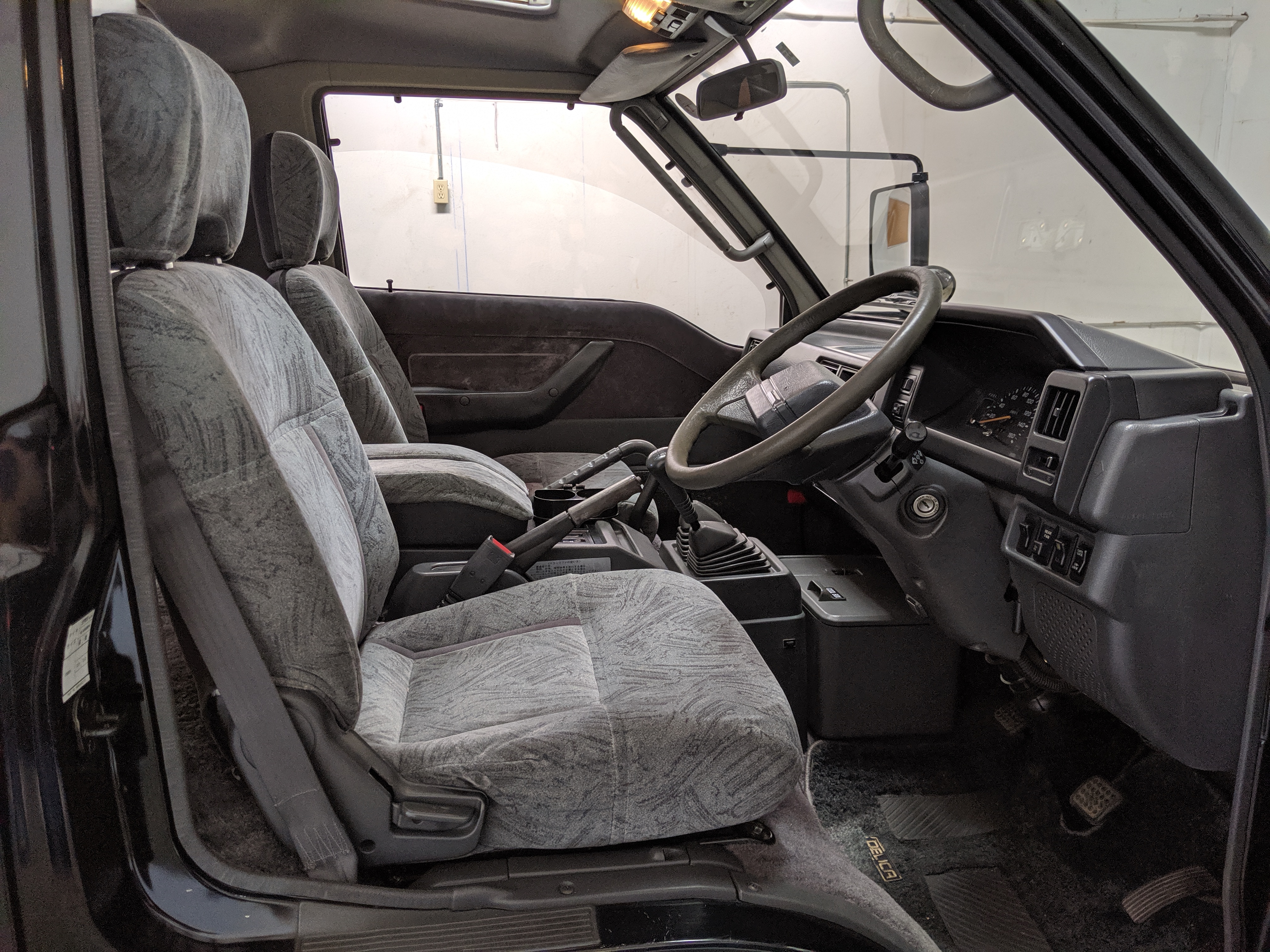 Inside is the good stuff. Thick pile carpeting and even thicker floor mats with Chamonix-style seats throughout. Everything is where it should be, save for they center pod that usually goes on the dashboard that includes an interior and exterior thermometer and inclinometer. Previous owner had a (poorly installed) TV installed there, though the vehicle included the OEM inclinometer pod. We had to have that shipped separately, and it is included with the purchase of the van. Besides that, everything is clean, clear and in glorious original condition. Gauge cluster says it all, with an odometer showing under 86,000 total kms, translating to an absurdly low 54,000 miles. In the center starting at the bottom you’ve got the functioning COOL BOX, which can both heat and cool its contents and also make ice. Above that is the HVAC controls, including excellent functional air conditioning and heat. The original double-din OEM headunit will also be included (it is in the same shipment as the inclinometer) though a Pioneer unit is installed at the moment, giving you a CD player, USB and AUX input. Above the rearview mirror and dome lights are controls for the rear Crystal Lite Roof shade controls with a manual sunroof just for the driver and front passenger. The glove box contains the original Delica user’s manual.