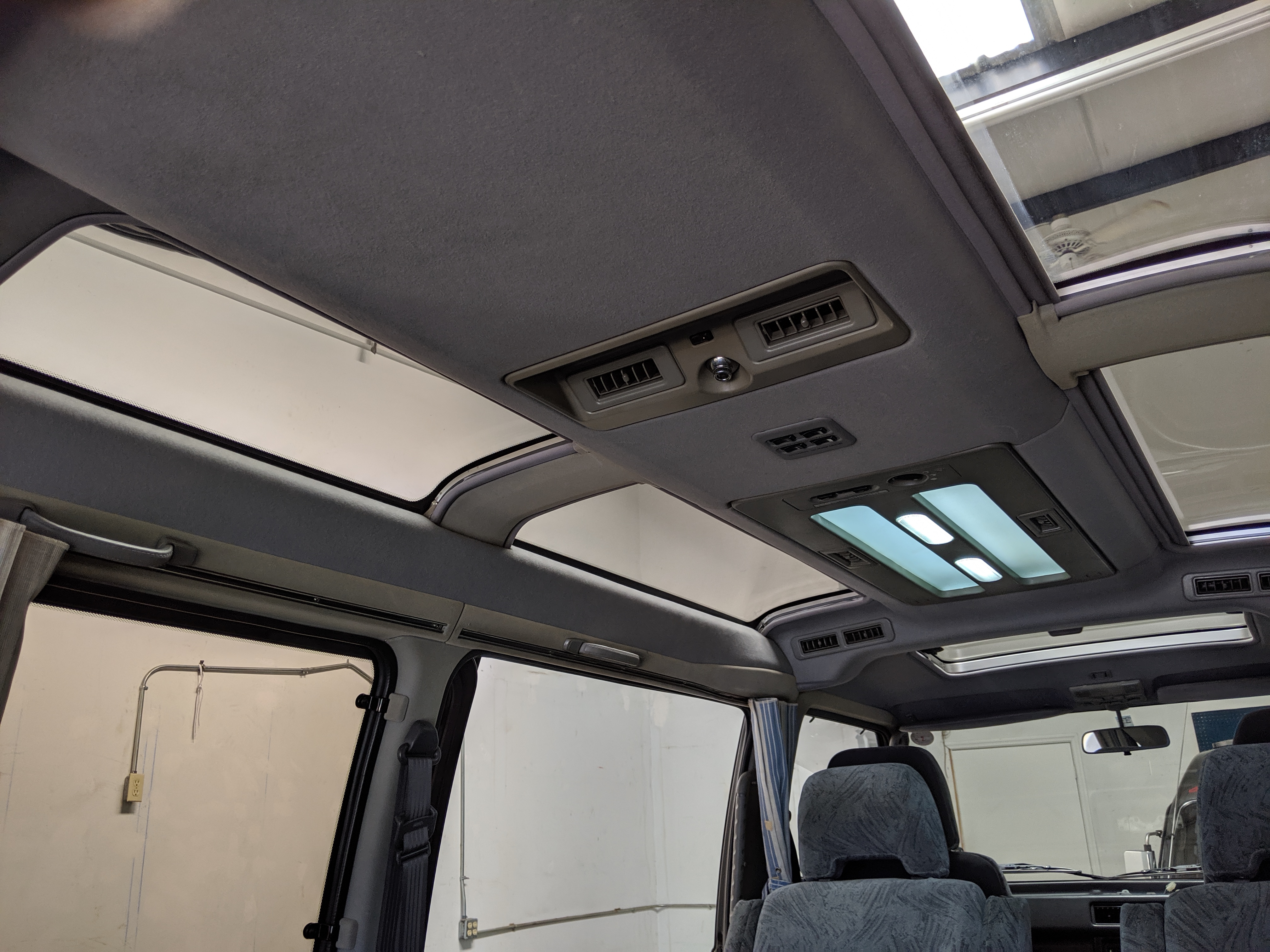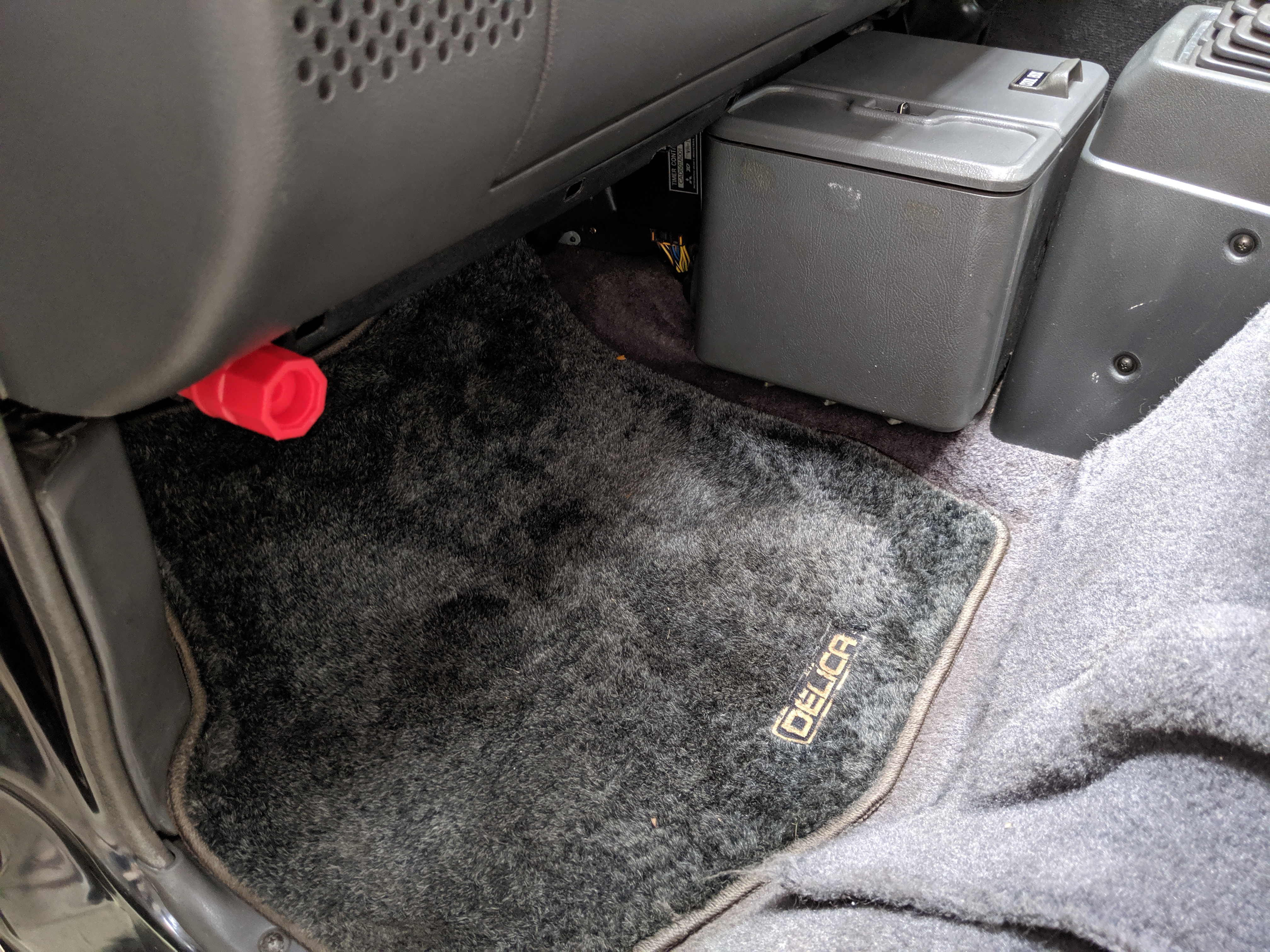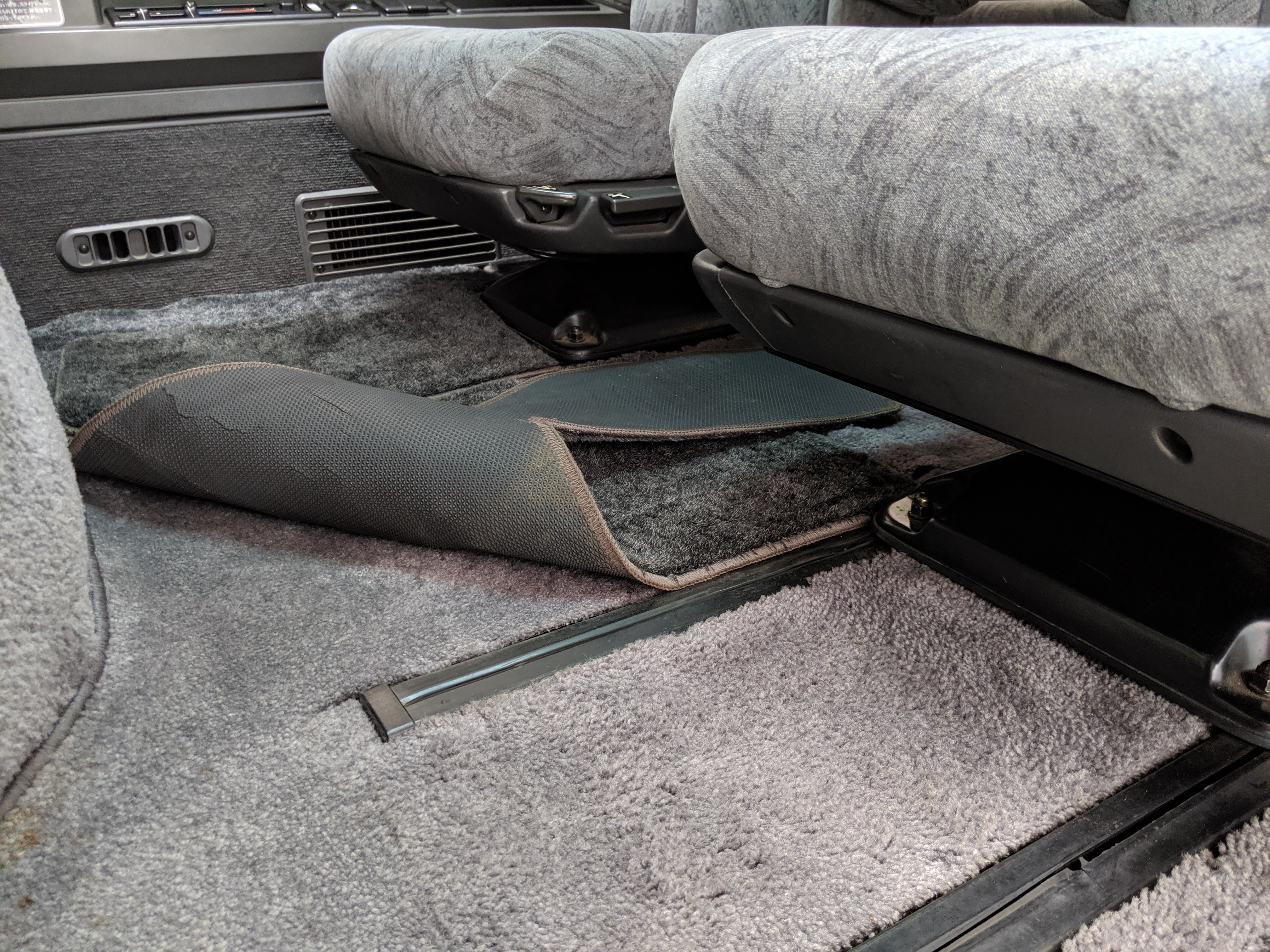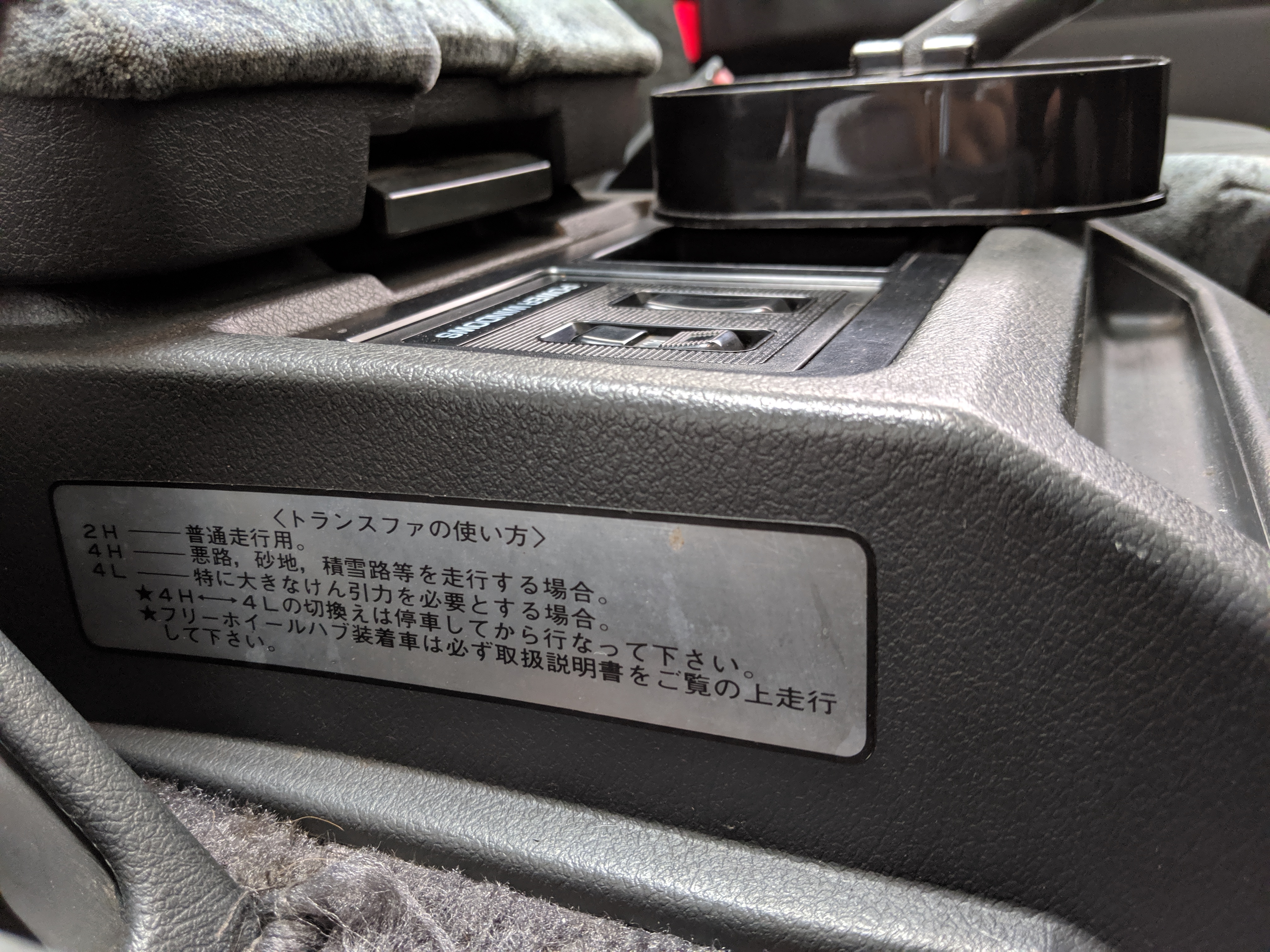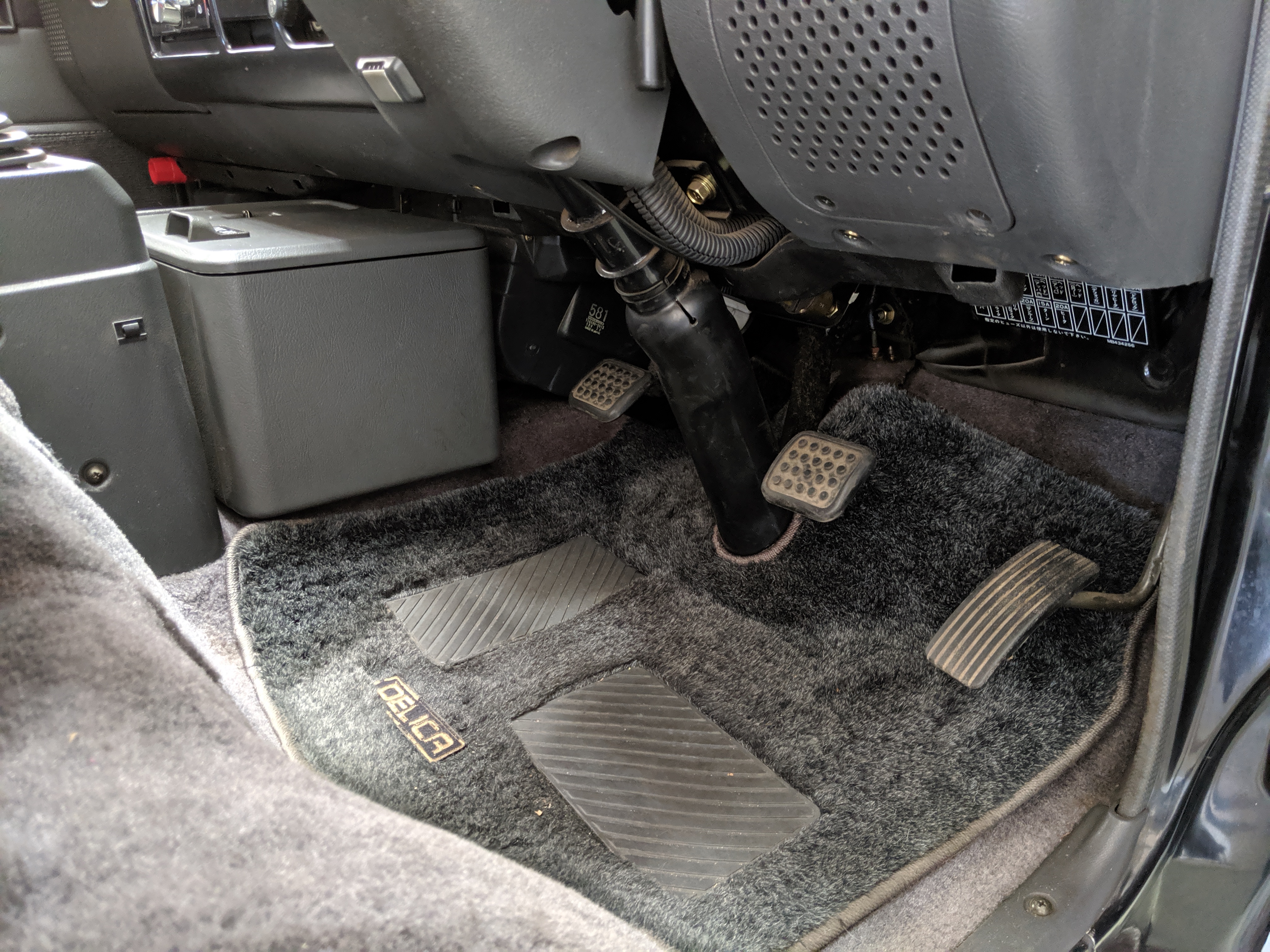 Inside is the good stuff. Thick pile carpeting and even thicker floor mats with Chamonix-style seats throughout. Everything is where it should be, save for they center pod that usually goes on the dashboard that includes an interior and exterior thermometer and inclinometer. Previous owner had a (poorly installed) TV installed there, though the vehicle included the OEM inclinometer pod. We had to have that shipped separately, and it is included with the purchase of the van. Besides that, everything is clean, clear and in glorious original condition. Gauge cluster says it all, with an odometer showing under 86,000 total kms, translating to an absurdly low 54,000 miles. In the center starting at the bottom you’ve got the functioning COOL BOX, which can both heat and cool its contents and also make ice. Above that is the HVAC controls, including excellent functional air conditioning and heat. The original double-din OEM headunit will also be included (it is in the same shipment as the inclinometer) though a Pioneer unit is installed at the moment, giving you a CD player, USB and AUX input. Above the rearview mirror and dome lights are controls for the rear Crystal Lite Roof shade controls with a manual sunroof just for the driver and front passenger. The glove box contains the original Delica user’s manual.