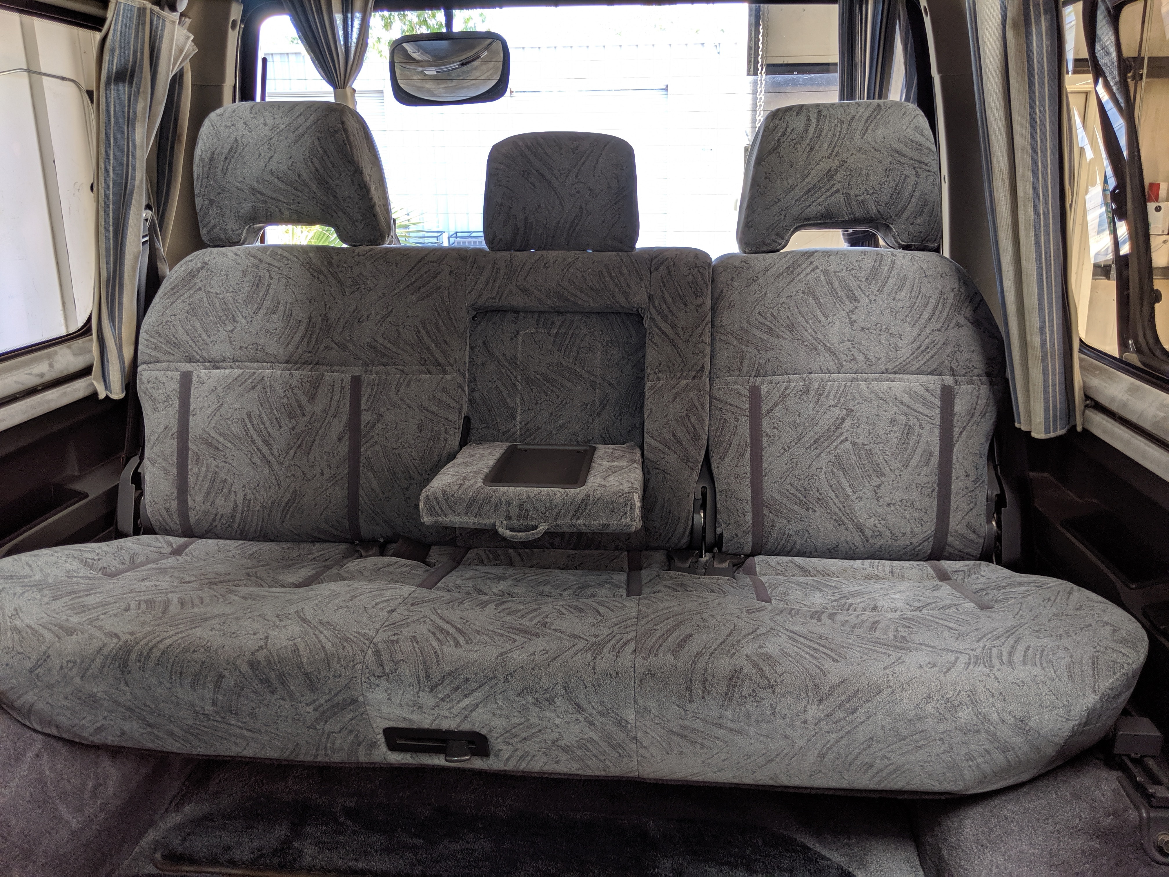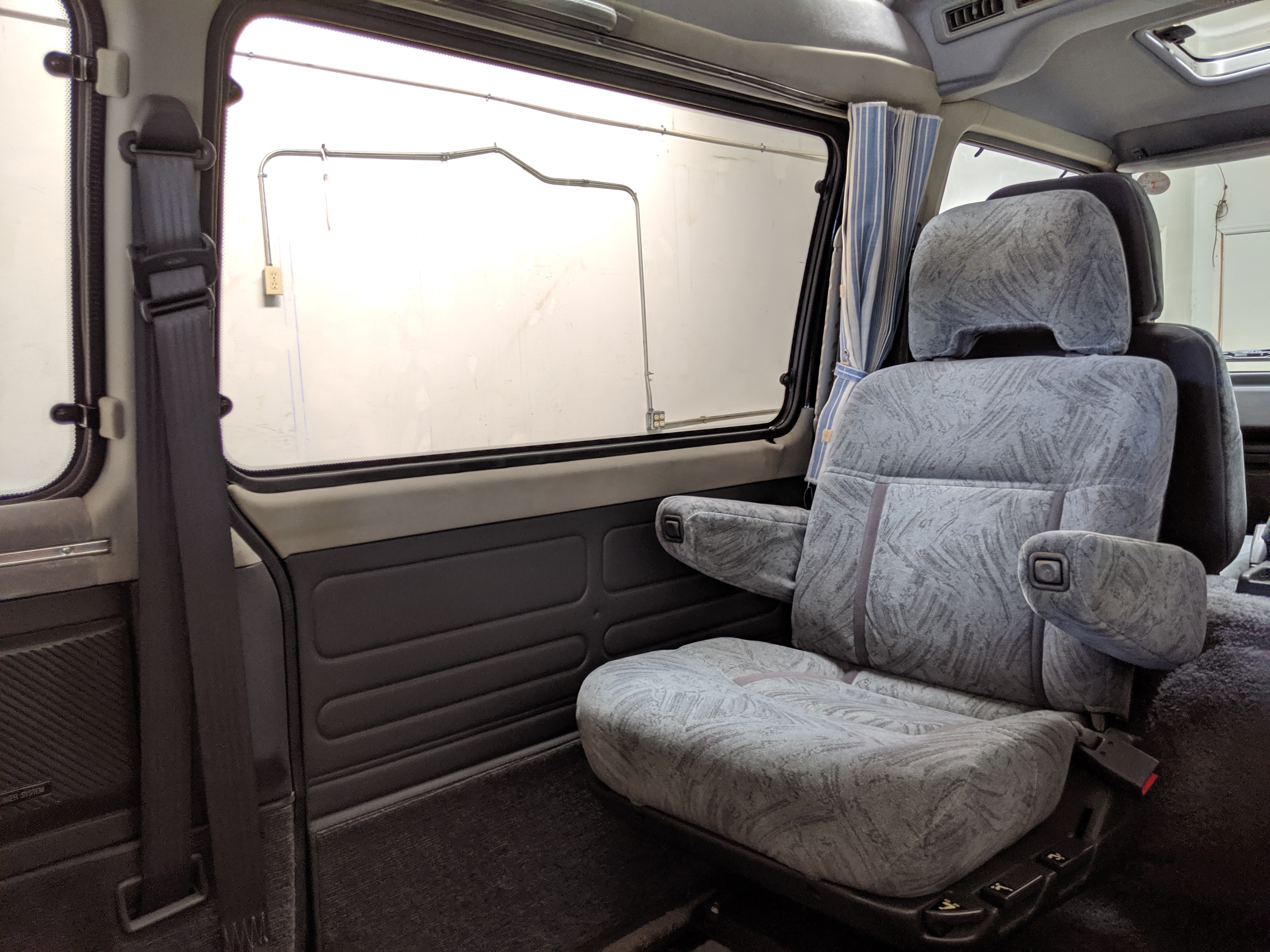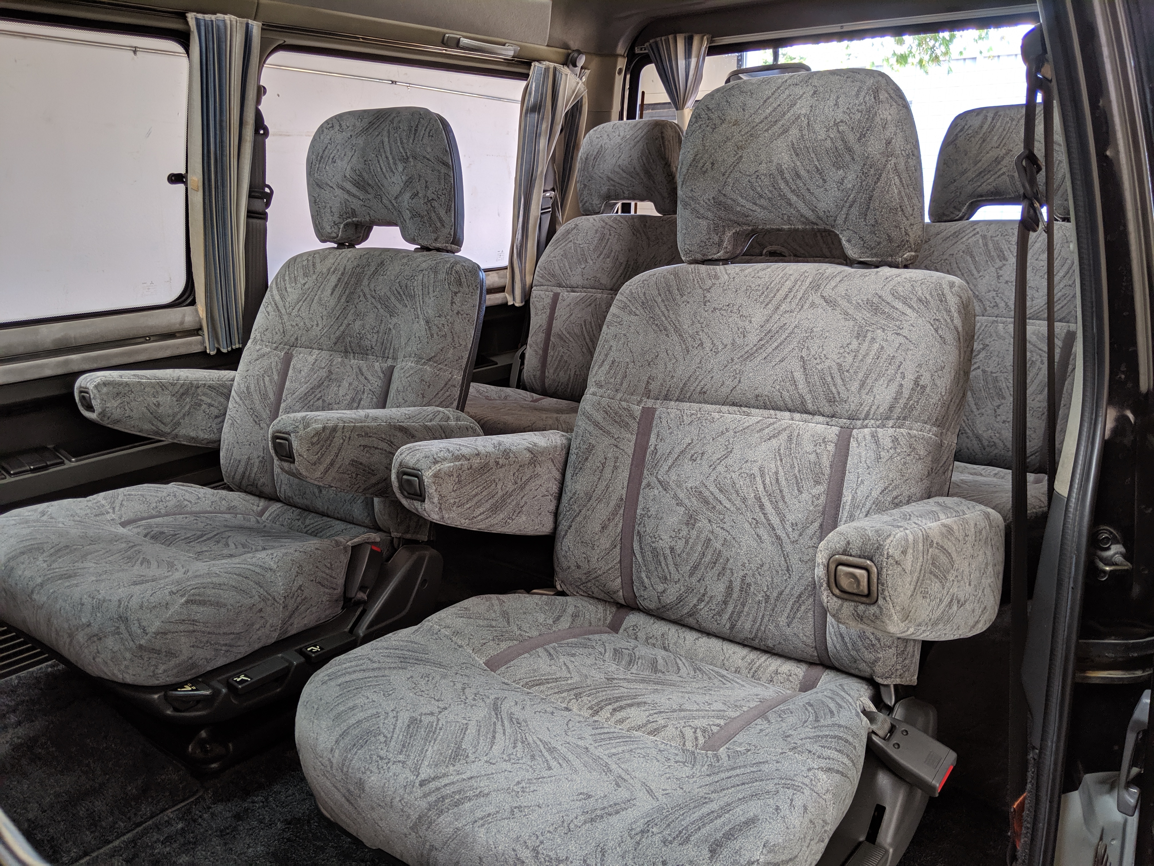 In back is the real place to be, with two spinning captain’s chairs in the same luscious fabric as the front, which can be spun around 360 degrees locking at various points, though it should be noted that in order to use the shoulder belts you must be facing forward. These two chairs can also slide forward and backward along the floor. The rear bench seat is donned in the familiar fabric pattern and has a center armrest. On the right wall opposite the sliding door is the rear controls for the rear heater and AC unit. Controls are also located for the driver up front. All the original floor mats are included and are way softer than floor mats should be for any vehicle. In the rear cargo area is a little bonus in the form of a plastic tray embossed with ‘MITSUBISHI’. Above in the roof is the defining characteristic of high-trim Delicas, the Crystal Lite Roof. 4 large curved glass panels give a excellent view of the sky while driving. Each shade can be individually opened or closed, or be toggled all at once. Rear vents and a large overhead fluorescent light show up here as well. Please note that the left front rear shade is ‘sticky’, the reason is the cable that drives the shade is damaged a bit meaning it can close all the way but will need to be helped along to open back up. Completing the aesthetic is curtains that can be drawn over all the exterior rear windows. You’d be hard pressed to find a newer, lower mileage, manual transmission Super Exceed. These L300 Delicas have the following they do for a reason, if you’d like to jump in you couldn’t do better than this 1994 Delica.