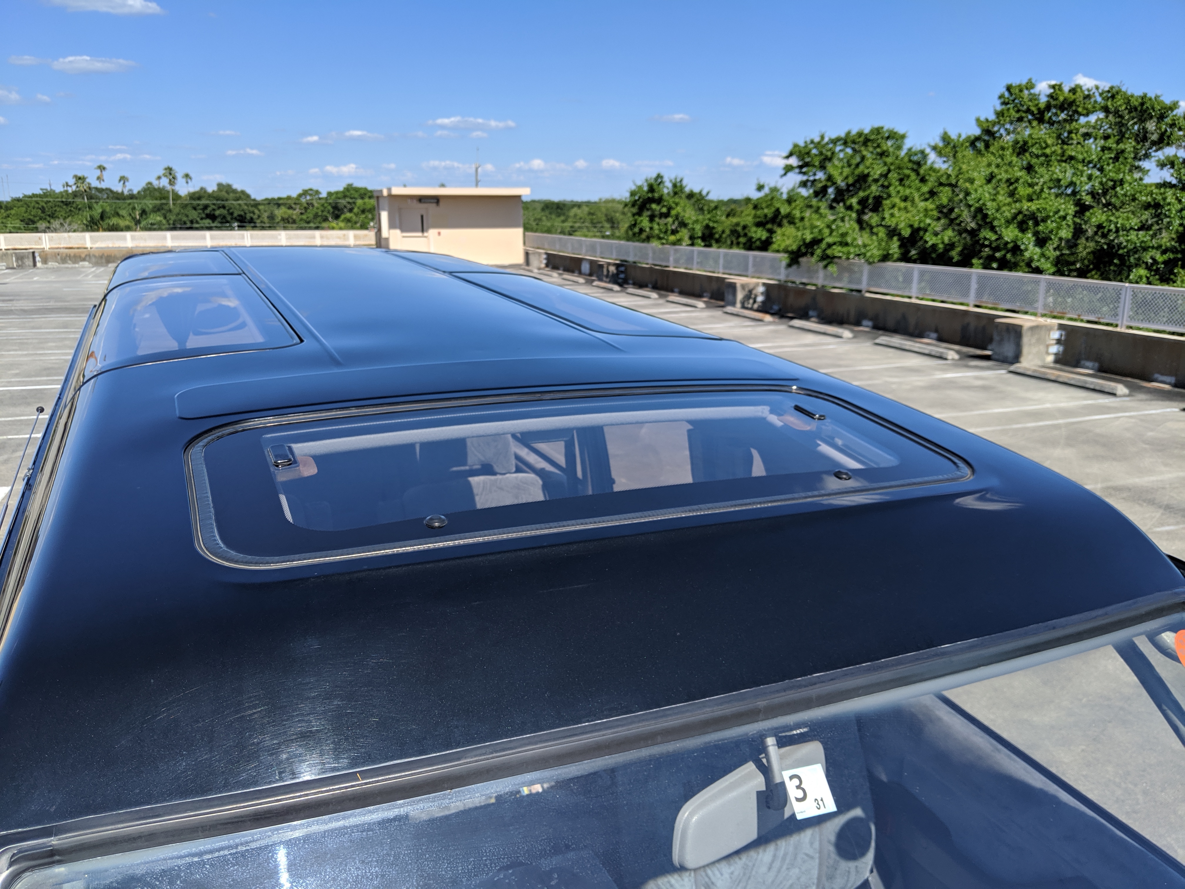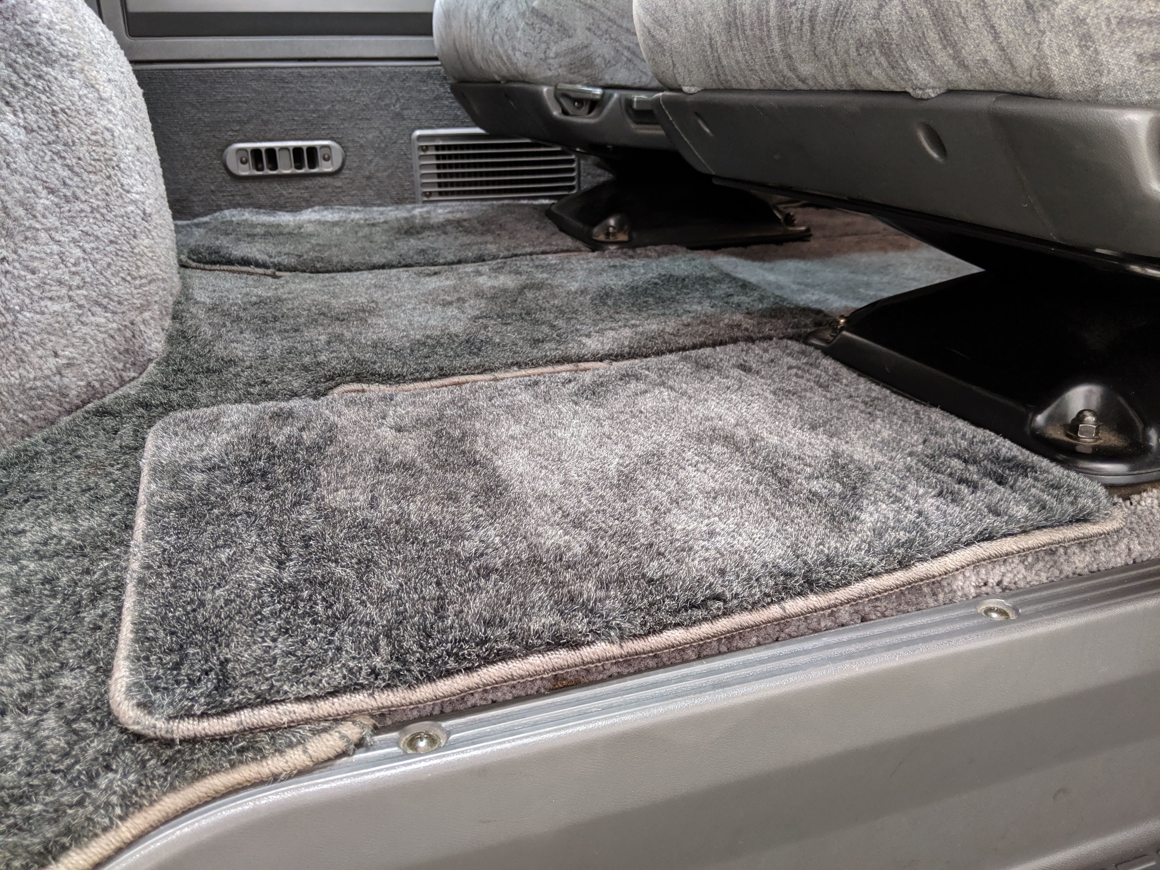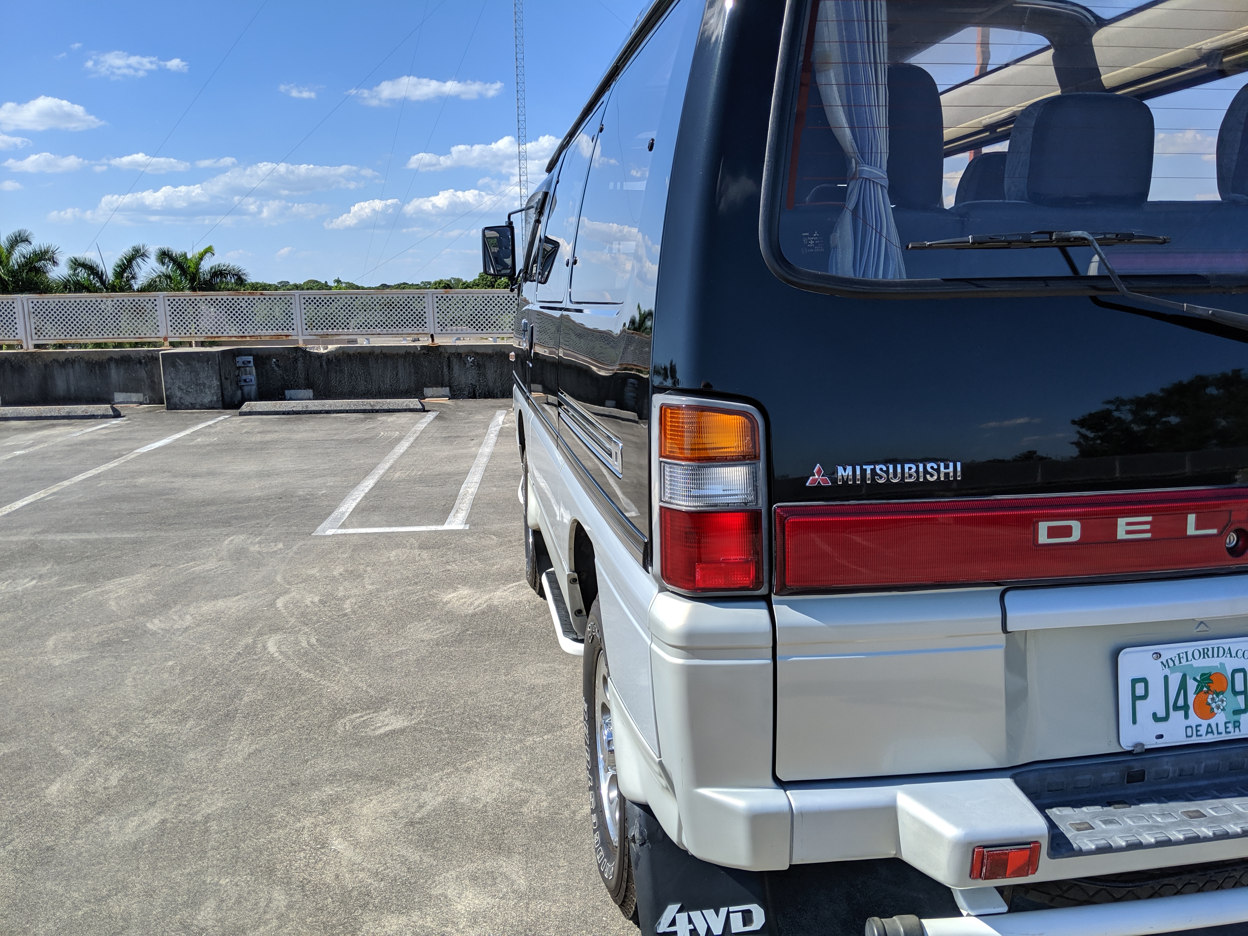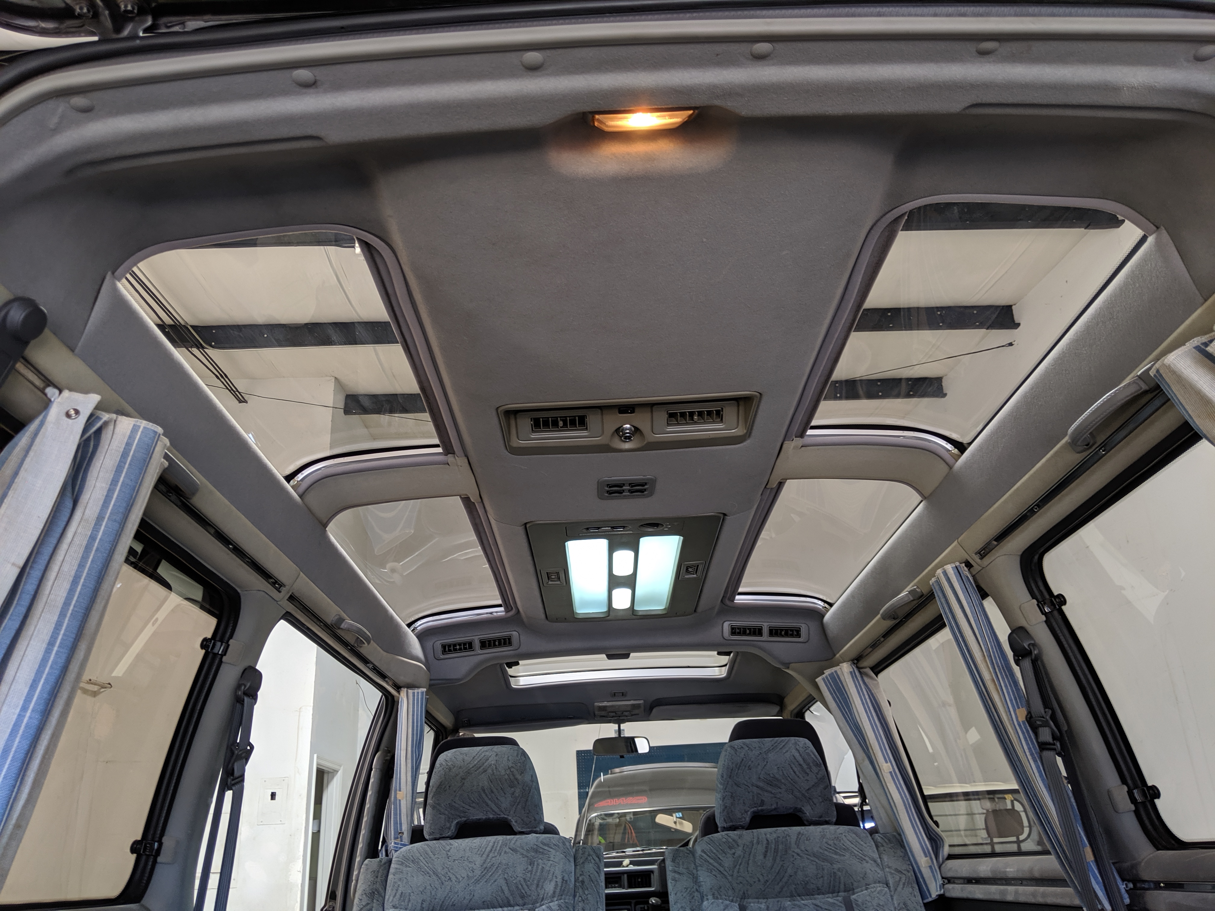 In back is the real place to be, with two spinning captain’s chairs in the same luscious fabric as the front, which can be spun around 360 degrees locking at various points, though it should be noted that in order to use the shoulder belts you must be facing forward. These two chairs can also slide forward and backward along the floor. The rear bench seat is donned in the familiar fabric pattern and has a center armrest. On the right wall opposite the sliding door is the rear controls for the rear heater and AC unit. Controls are also located for the driver up front. All the original floor mats are included and are way softer than floor mats should be for any vehicle. In the rear cargo area is a little bonus in the form of a plastic tray embossed with ‘MITSUBISHI’. Above in the roof is the defining characteristic of high-trim Delicas, the Crystal Lite Roof. 4 large curved glass panels give a excellent view of the sky while driving. Each shade can be individually opened or closed, or be toggled all at once. Rear vents and a large overhead fluorescent light show up here as well. Please note that the left front rear shade is ‘sticky’, the reason is the cable that drives the shade is damaged a bit meaning it can close all the way but will need to be helped along to open back up. Completing the aesthetic is curtains that can be drawn over all the exterior rear windows. You’d be hard pressed to find a newer, lower mileage, manual transmission Super Exceed. These L300 Delicas have the following they do for a reason, if you’d like to jump in you couldn’t do better than this 1994 Delica.