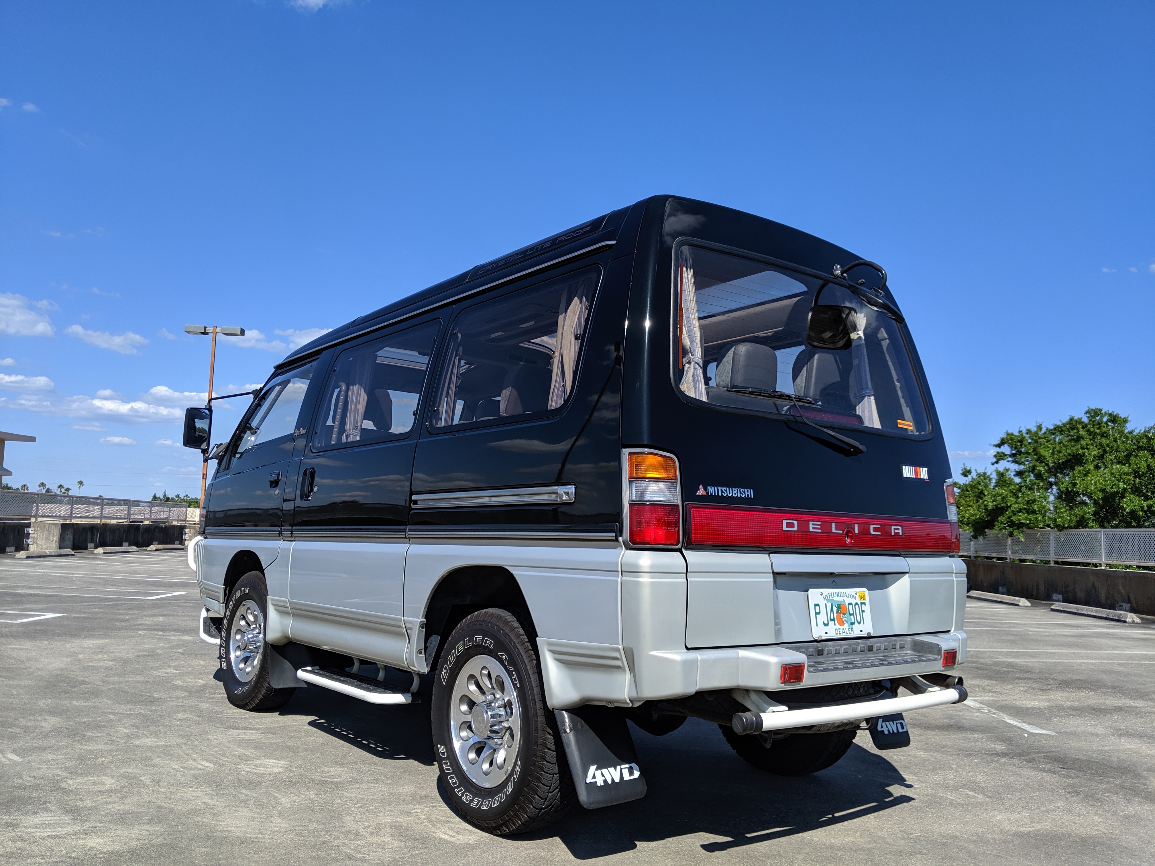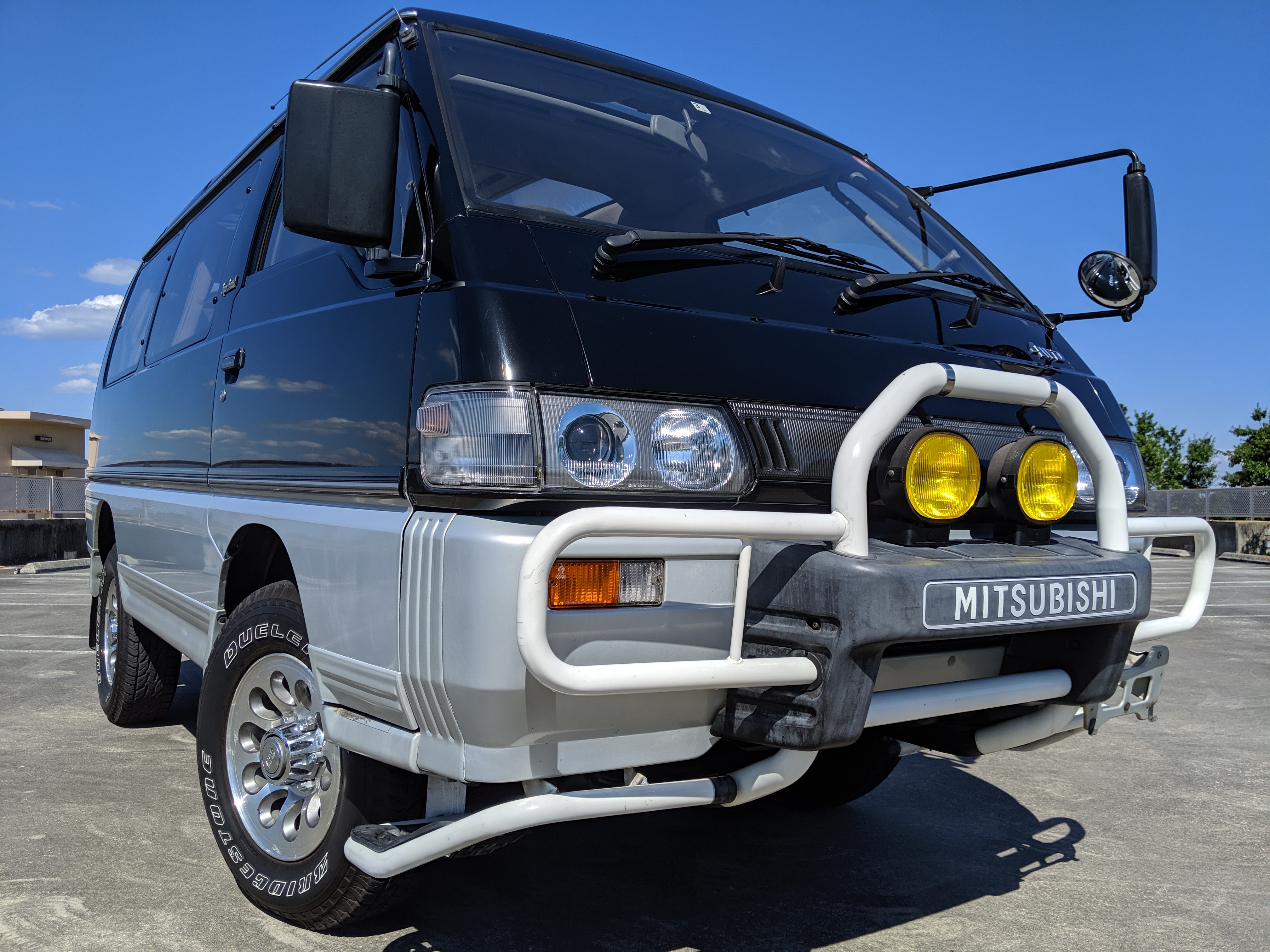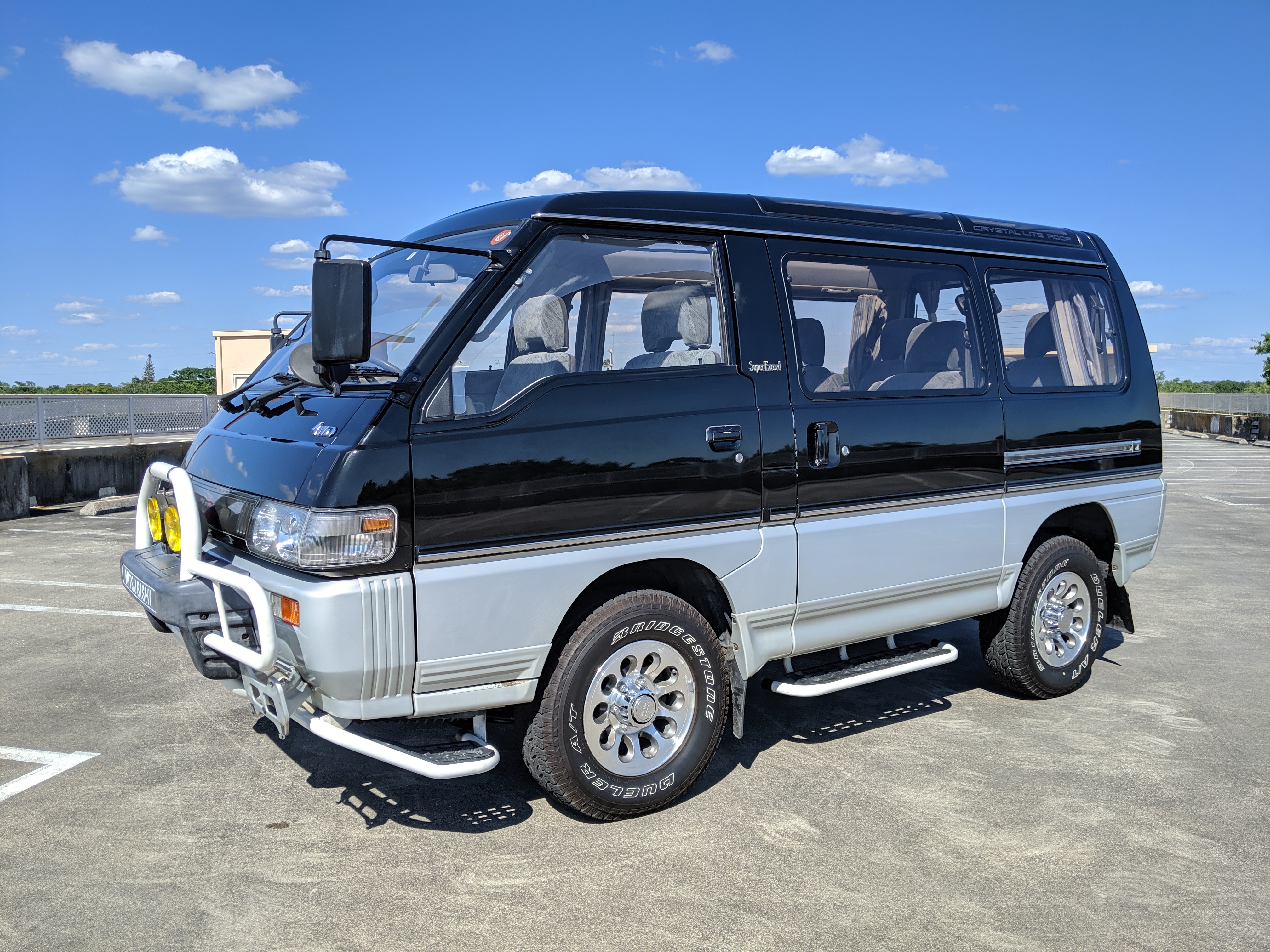 This Delica wears two tone paint, slightly sparkly black on top and silver along the bottom. Factory bull bar, side step and rear bumper bar are in excellent condition. Original wheels with their included center caps are in good shape as are the tires that wrap them. Flaws and blemishes are few for a vehicle 25 years old. A small bubble is forming just under the rear glass. Front door handles do show a poor attempt to paint. All glass is clean and clear. Underside is exceptionally clean as the skid plates show no damage or wear. To say this was never taken offroad wouldn’t be surprising, but it’s almost like it was never driven at all! On the back you get a cool ‘Ralli Art Club Style’ sticker.