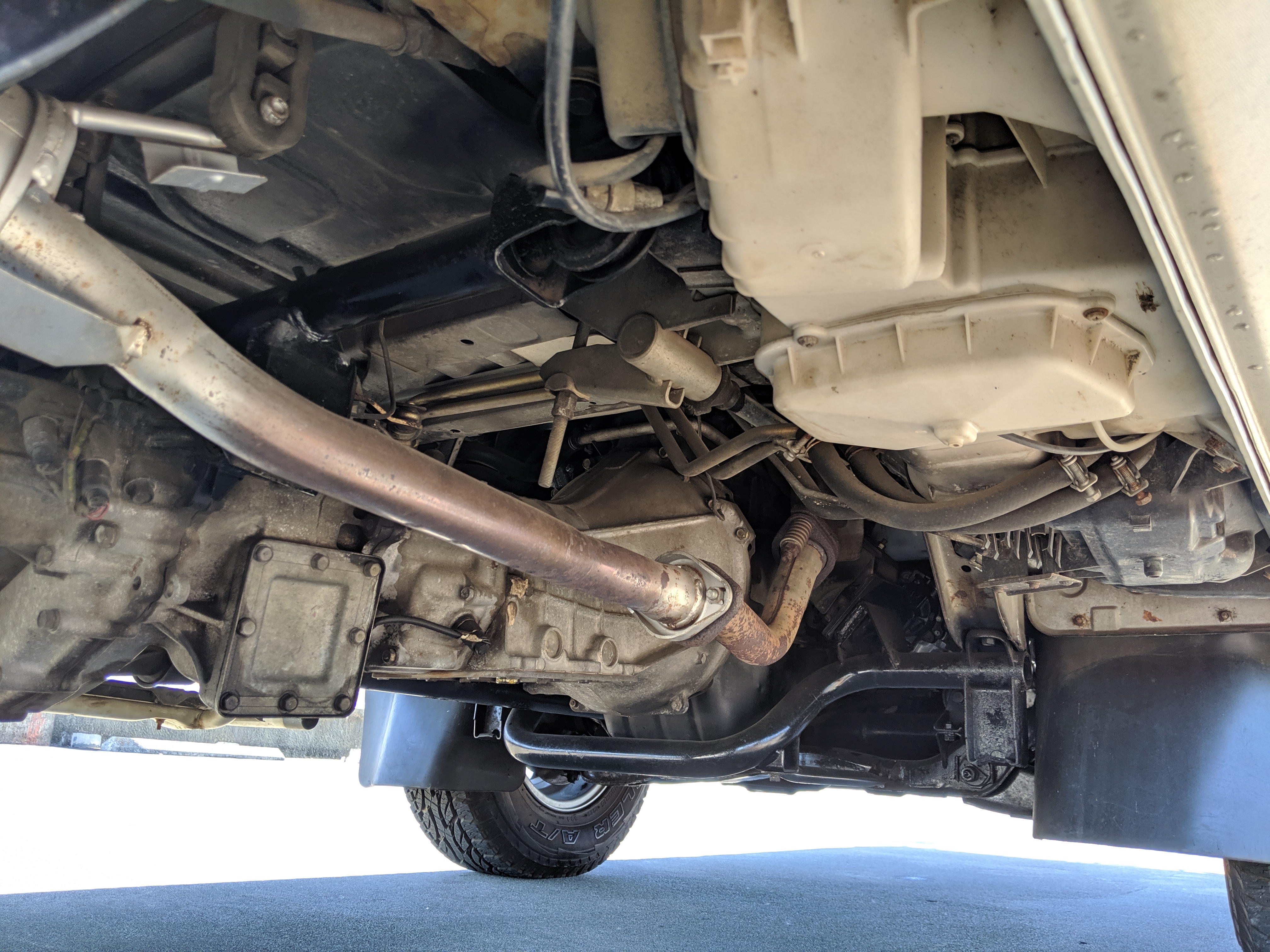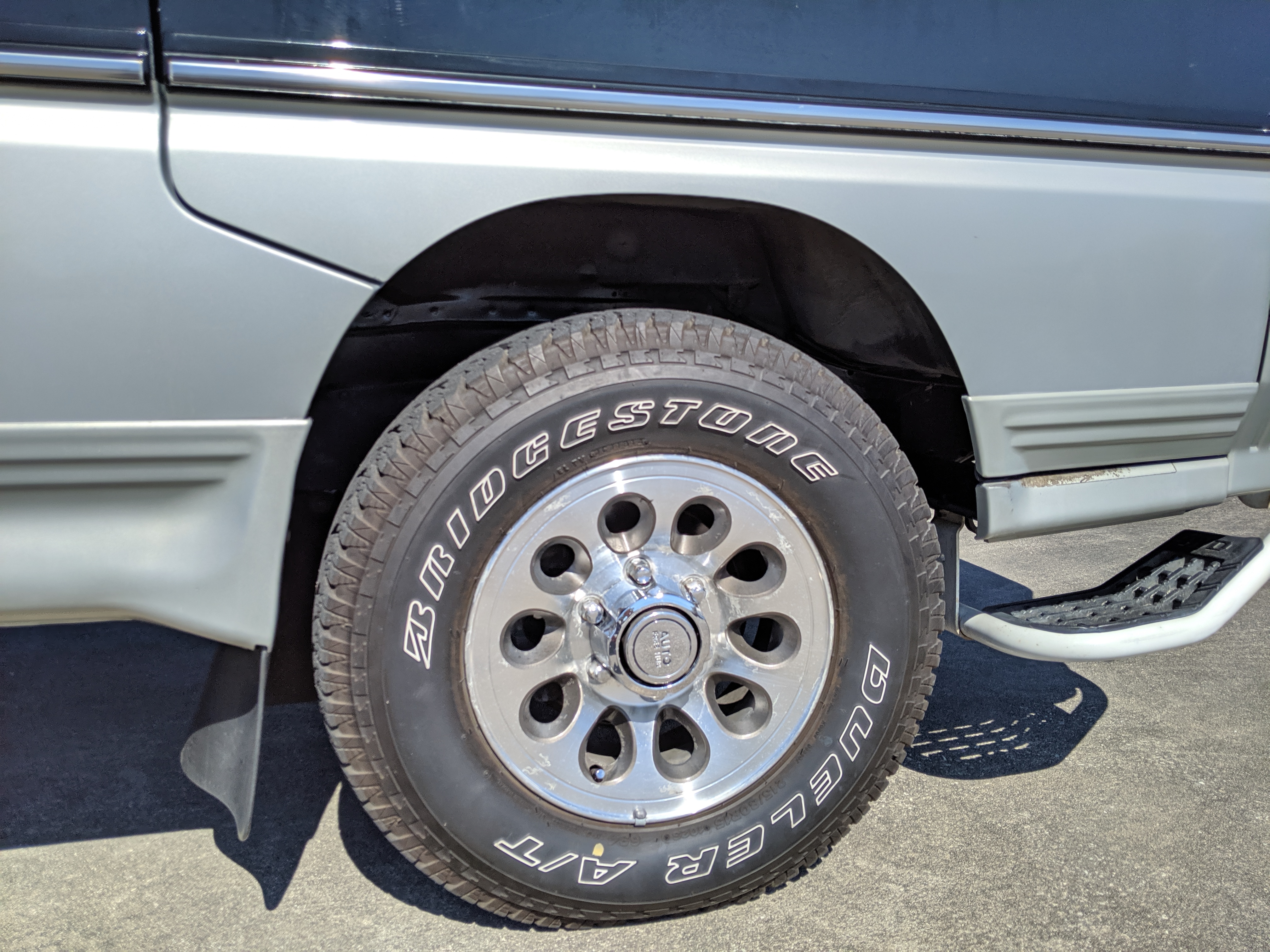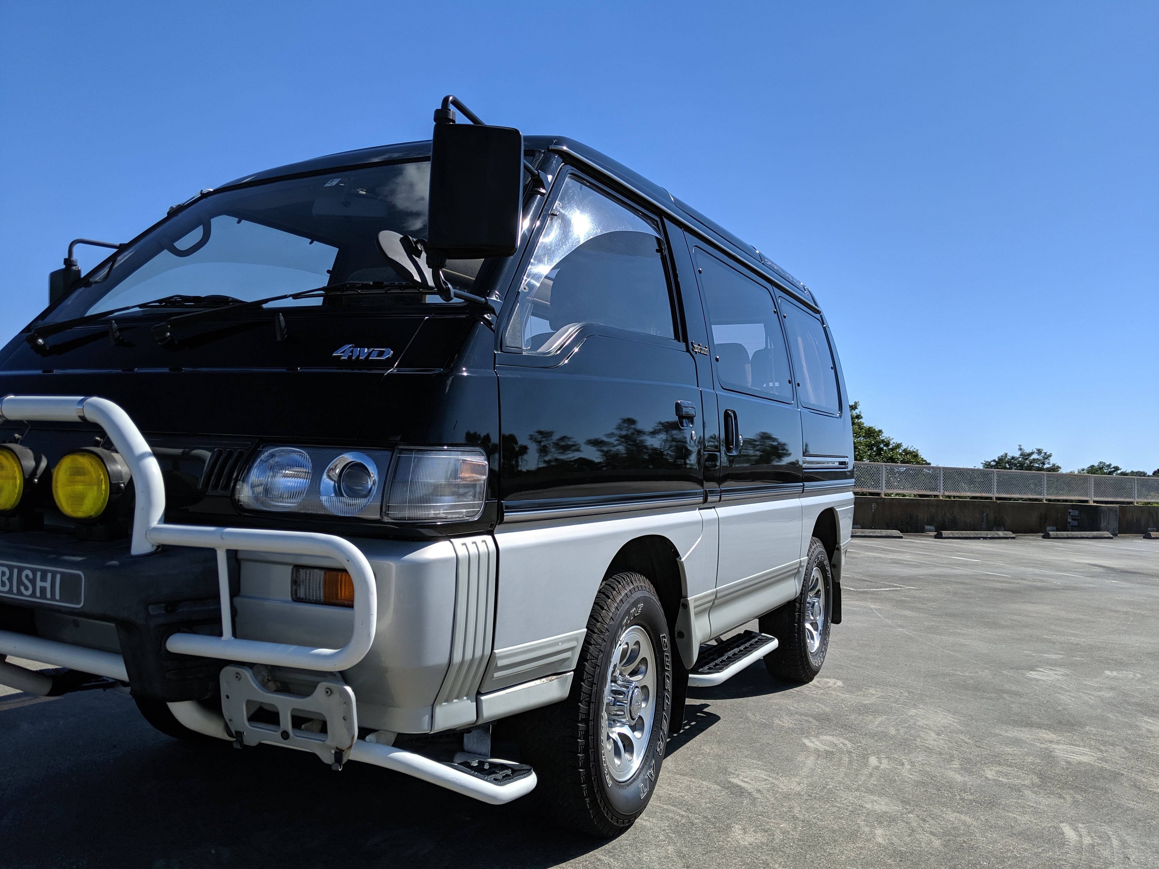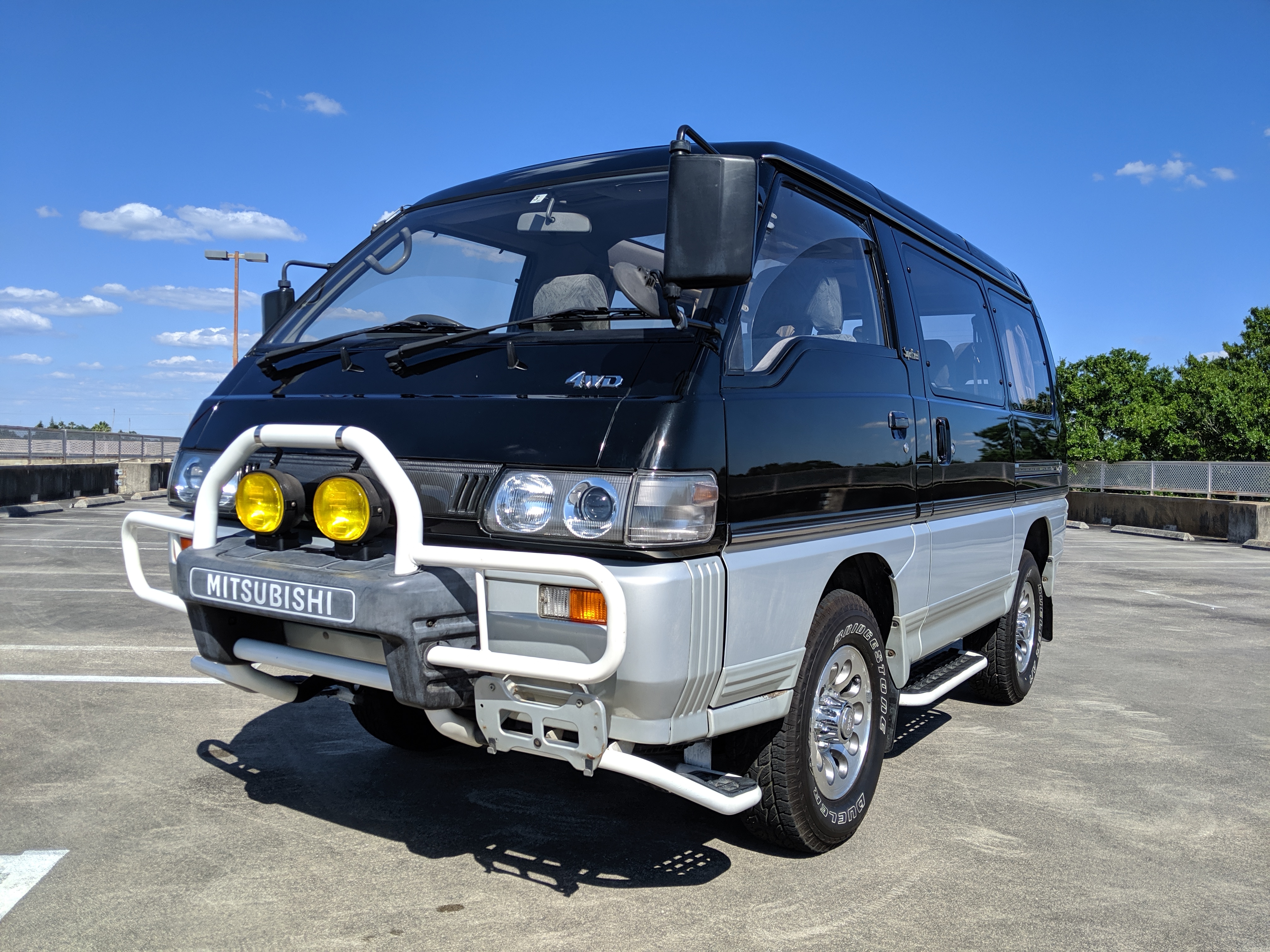 This Delica wears two tone paint, slightly sparkly black on top and silver along the bottom. Factory bull bar, side step and rear bumper bar are in excellent condition. Original wheels with their included center caps are in good shape as are the tires that wrap them. Flaws and blemishes are few for a vehicle 25 years old. A small bubble is forming just under the rear glass. Front door handles do show a poor attempt to paint. All glass is clean and clear. Underside is exceptionally clean as the skid plates show no damage or wear. To say this was never taken offroad wouldn’t be surprising, but it’s almost like it was never driven at all! On the back you get a cool ‘Ralli Art Club Style’ sticker.