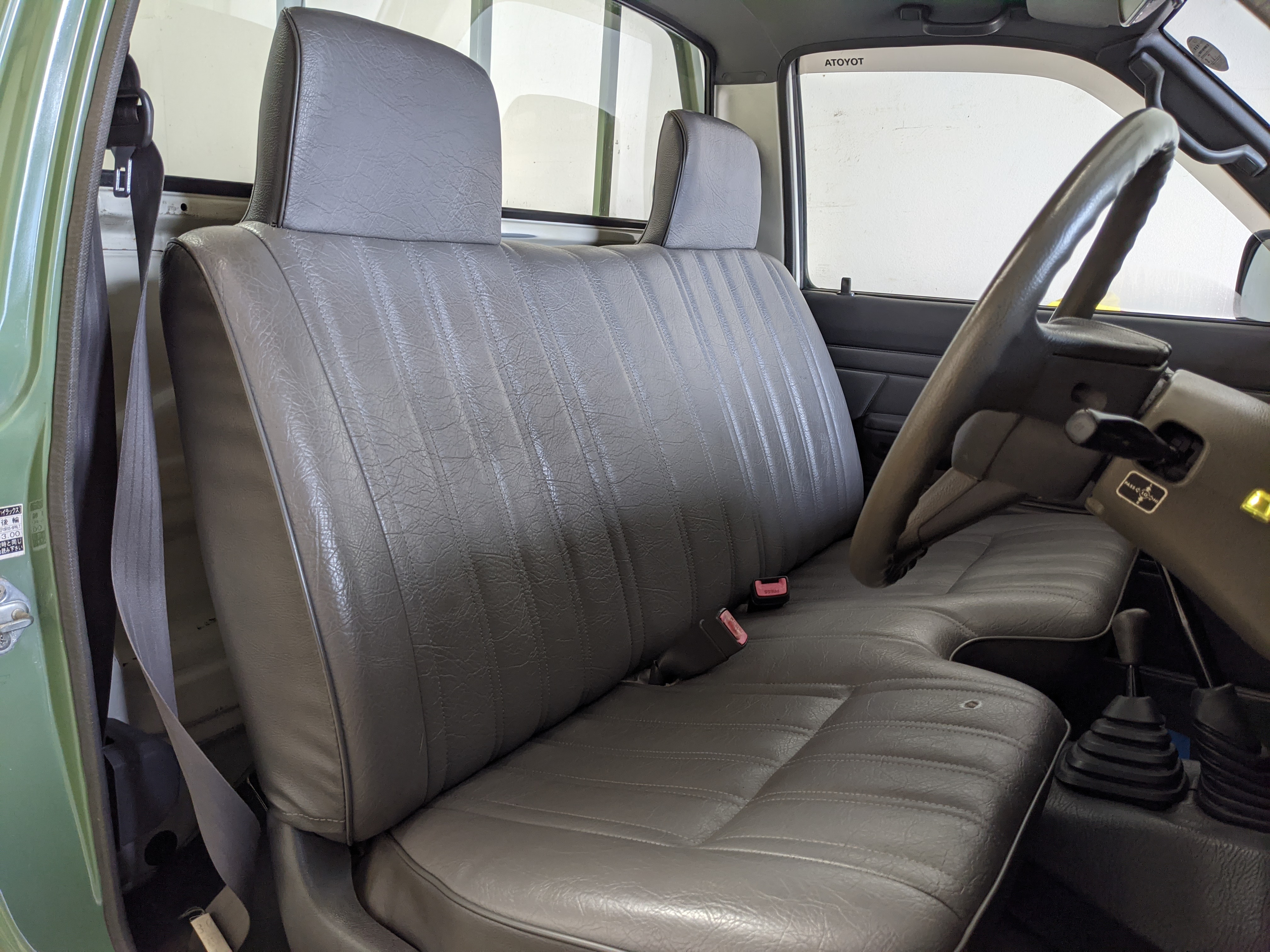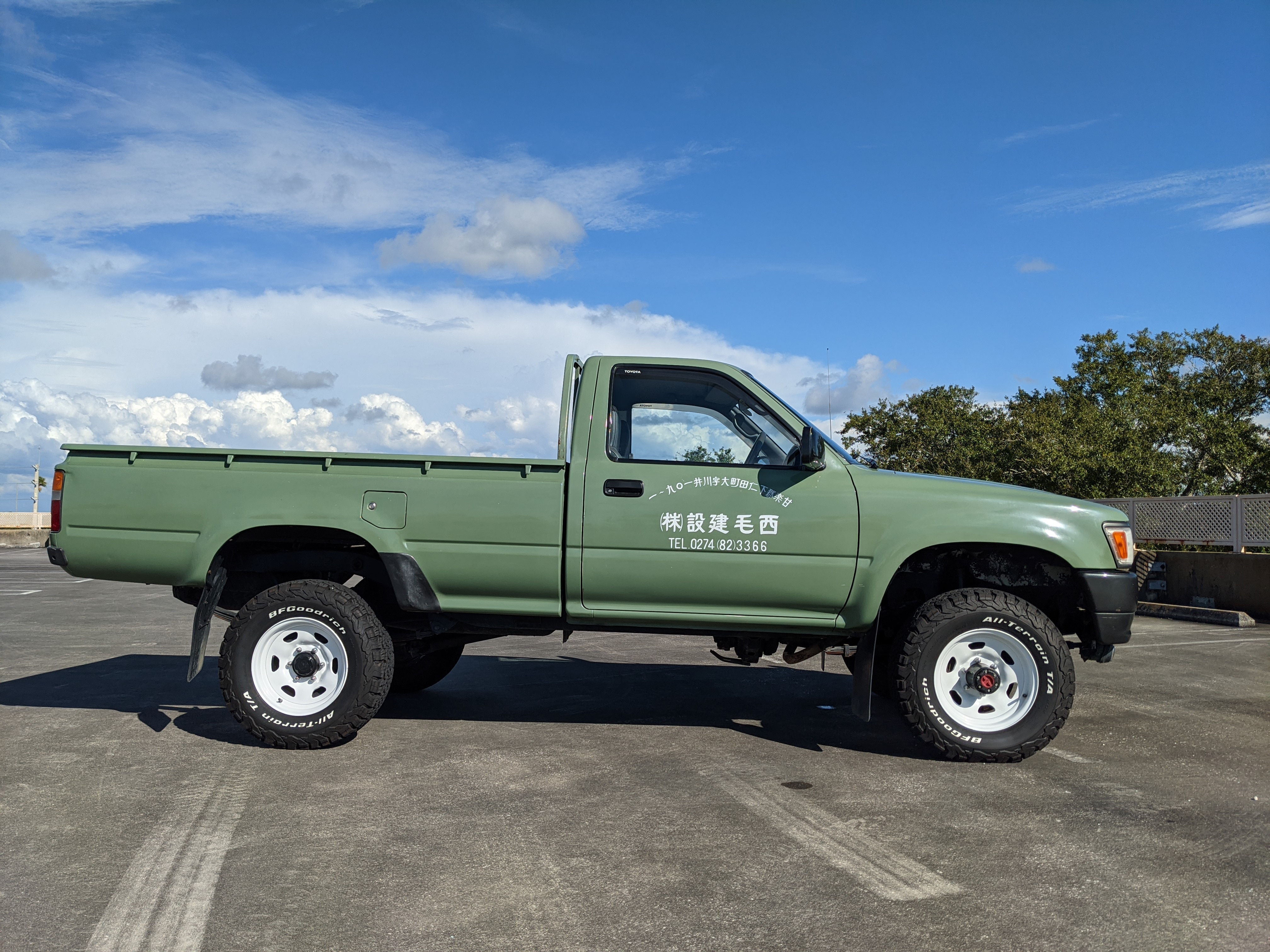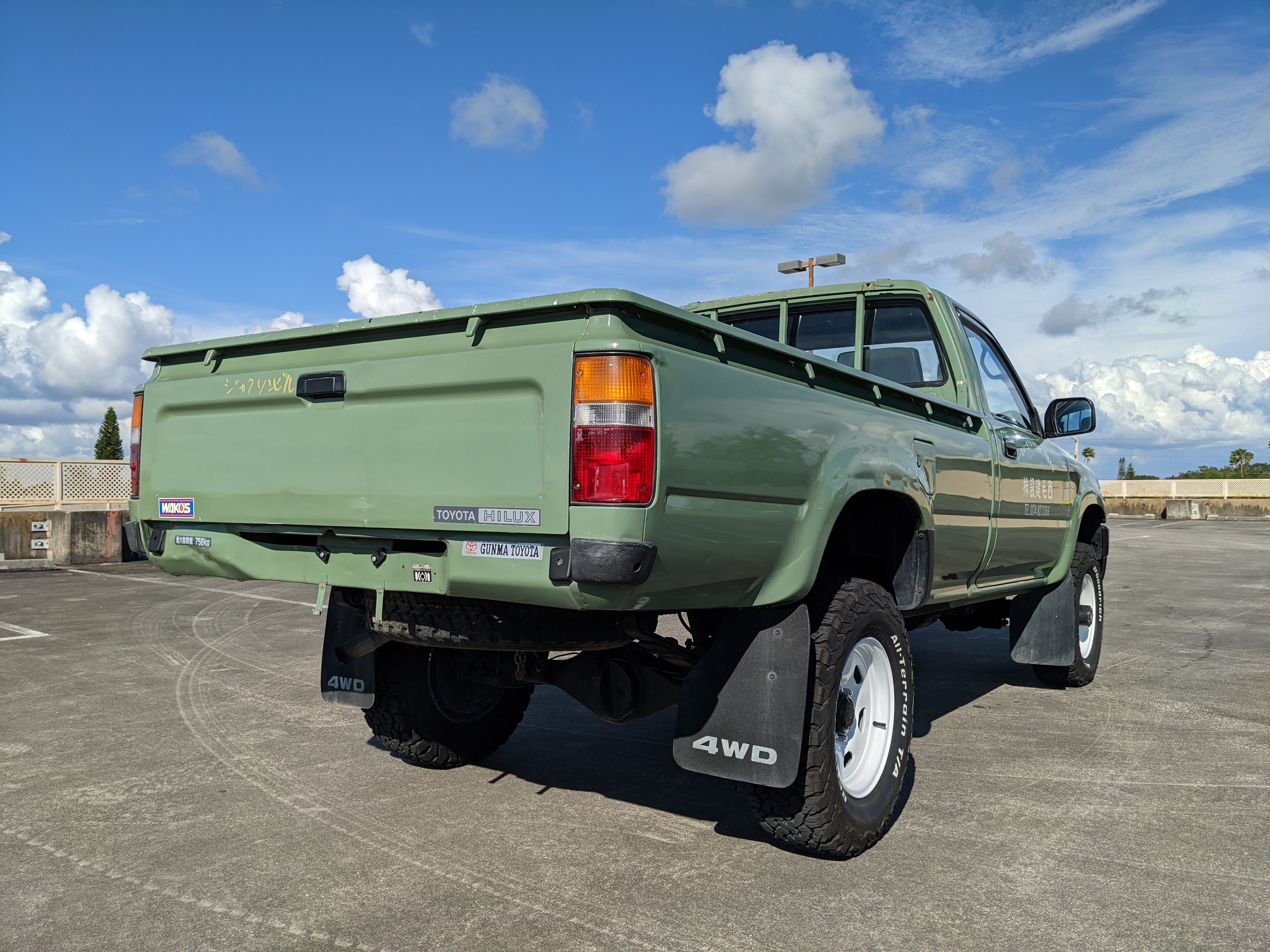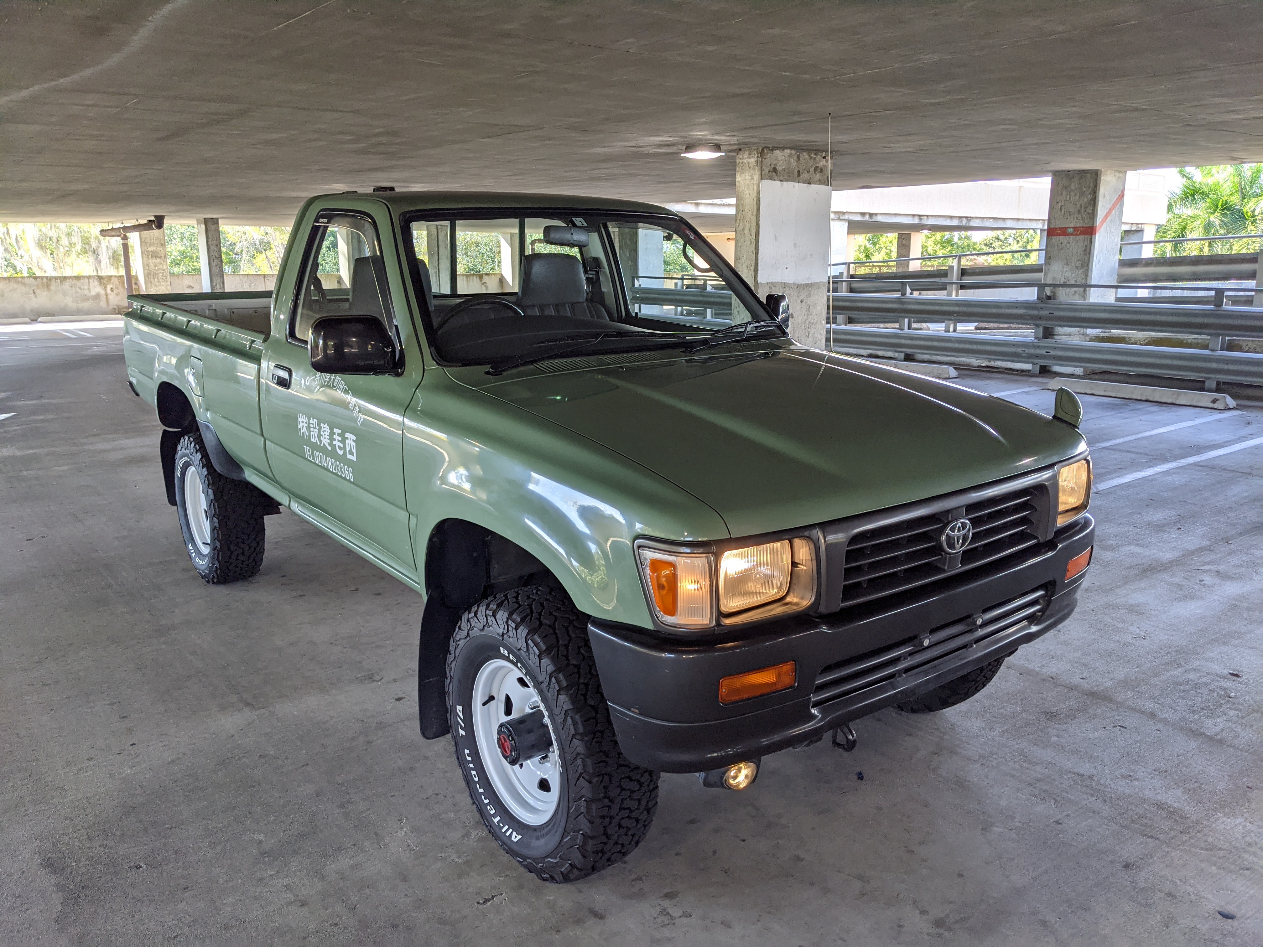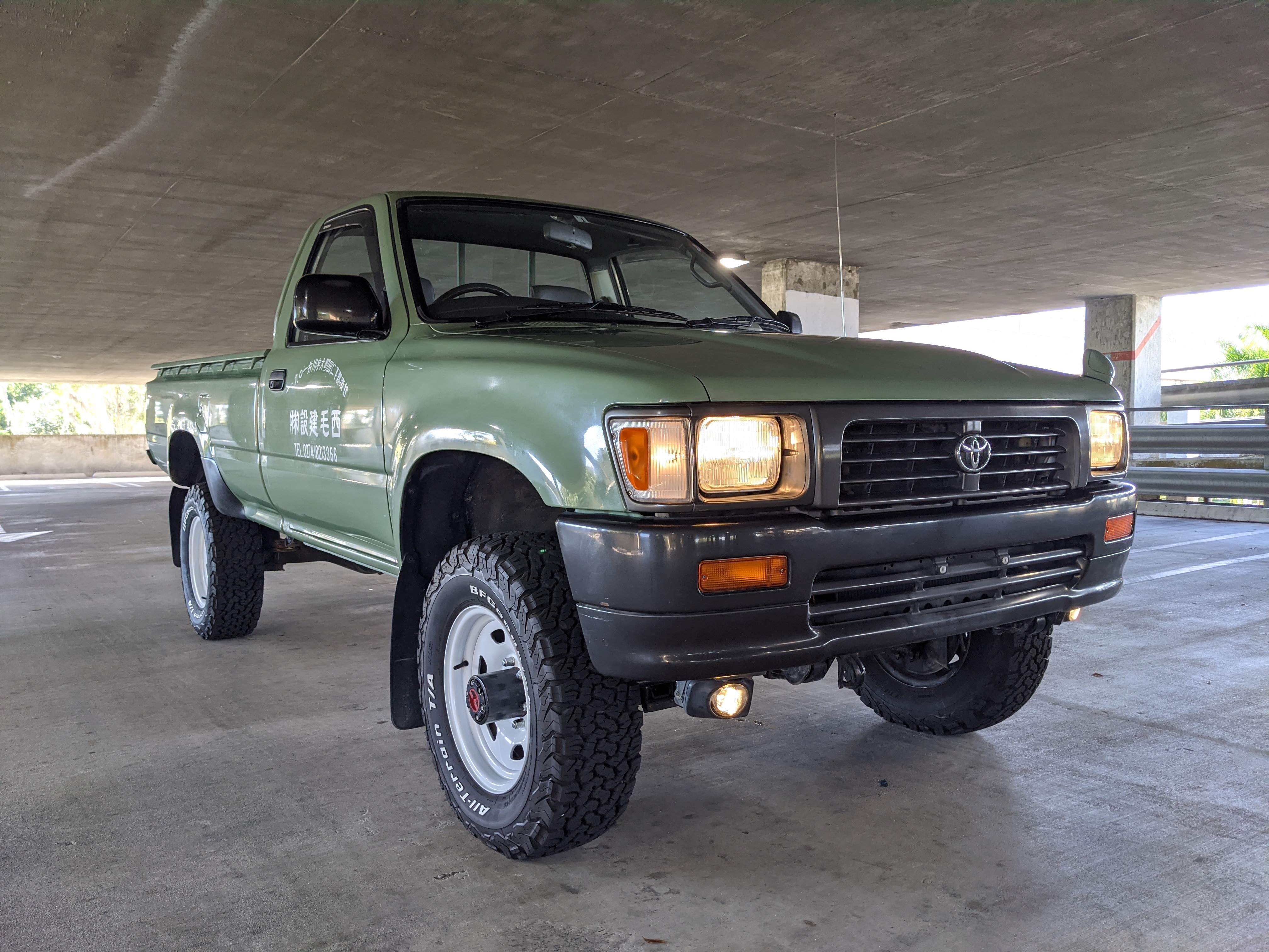 The hand-painted signs on either door are for “Nishige Construction”, as the ultimate purpose of this Hilux was to haul ‘HIGH PRESSURE GAS’ in a tank that was mounted in the bed. The tank has since been removed. As this truck was bought as a fleet vehicle it was originally white, but painted this forest-service green and put into service upon purchase. It does have various scratches and dents as would be common for a 26 year old work truck, but has been lovingly maintained otherwise. Pictures speak for themselves as to the condition. Everything is functional, everything works, and this beautiful rig will take you wherever you need to go, be it highways or where you don’t even have a vague suggestion of ‘road’.