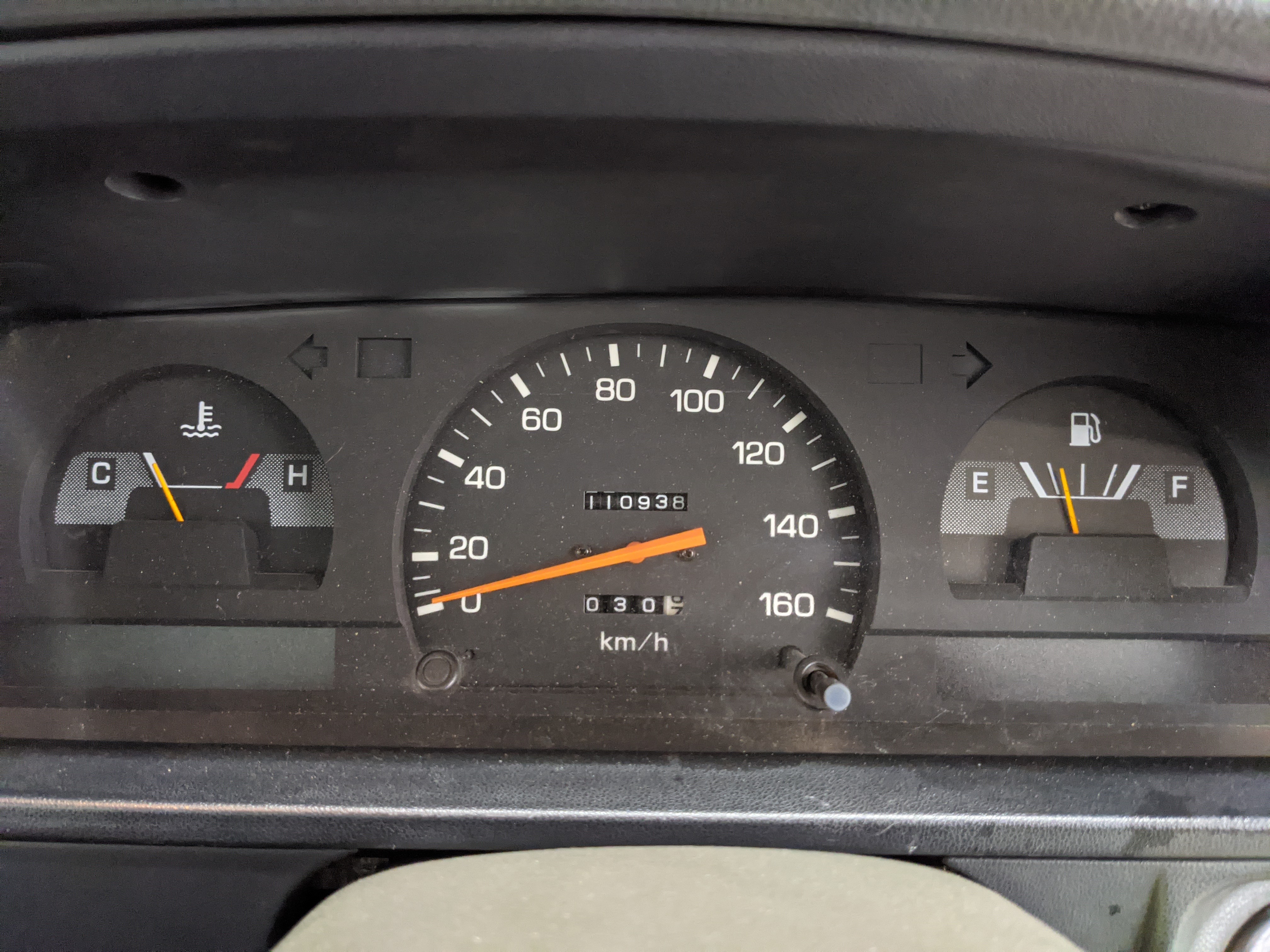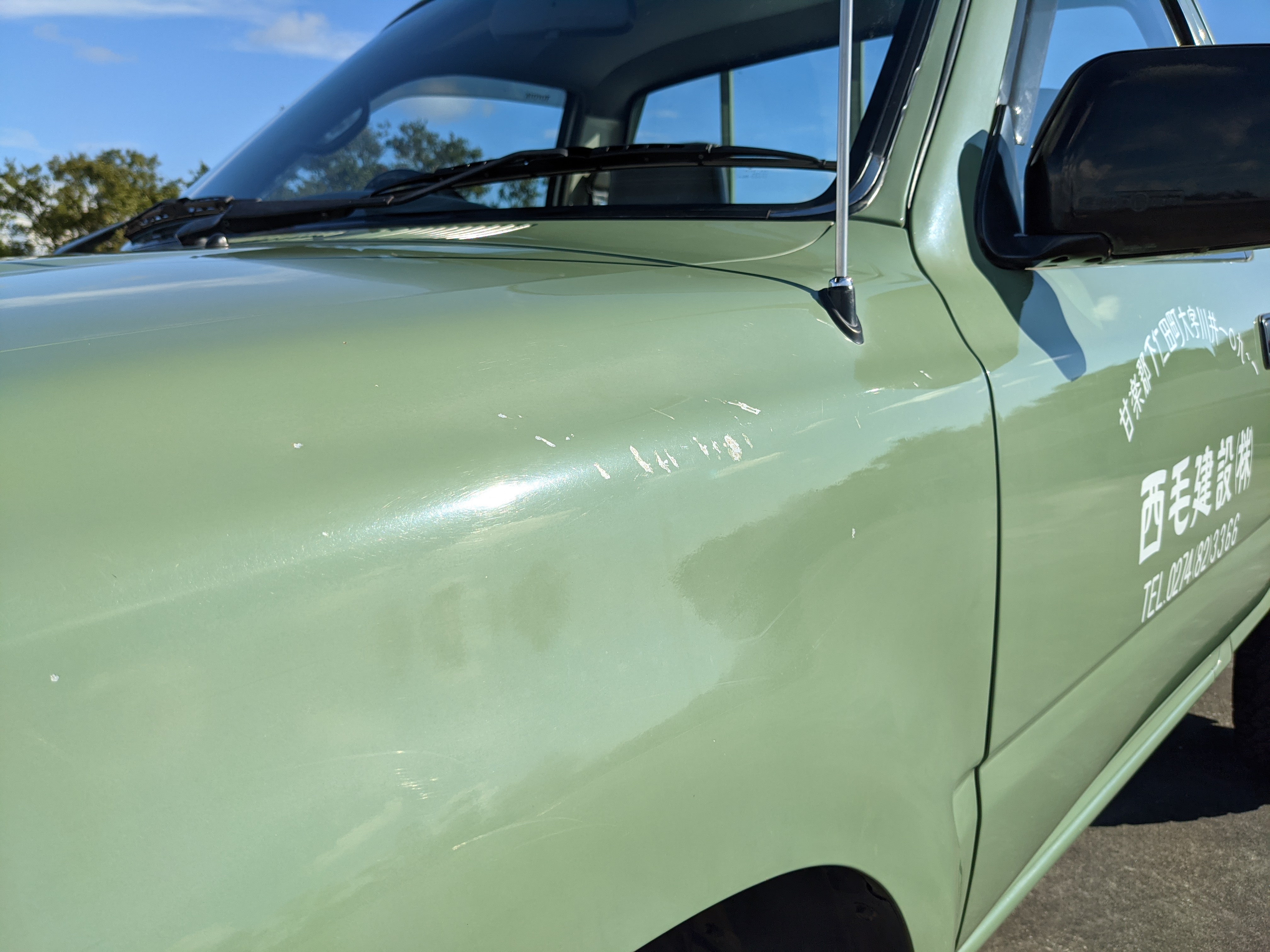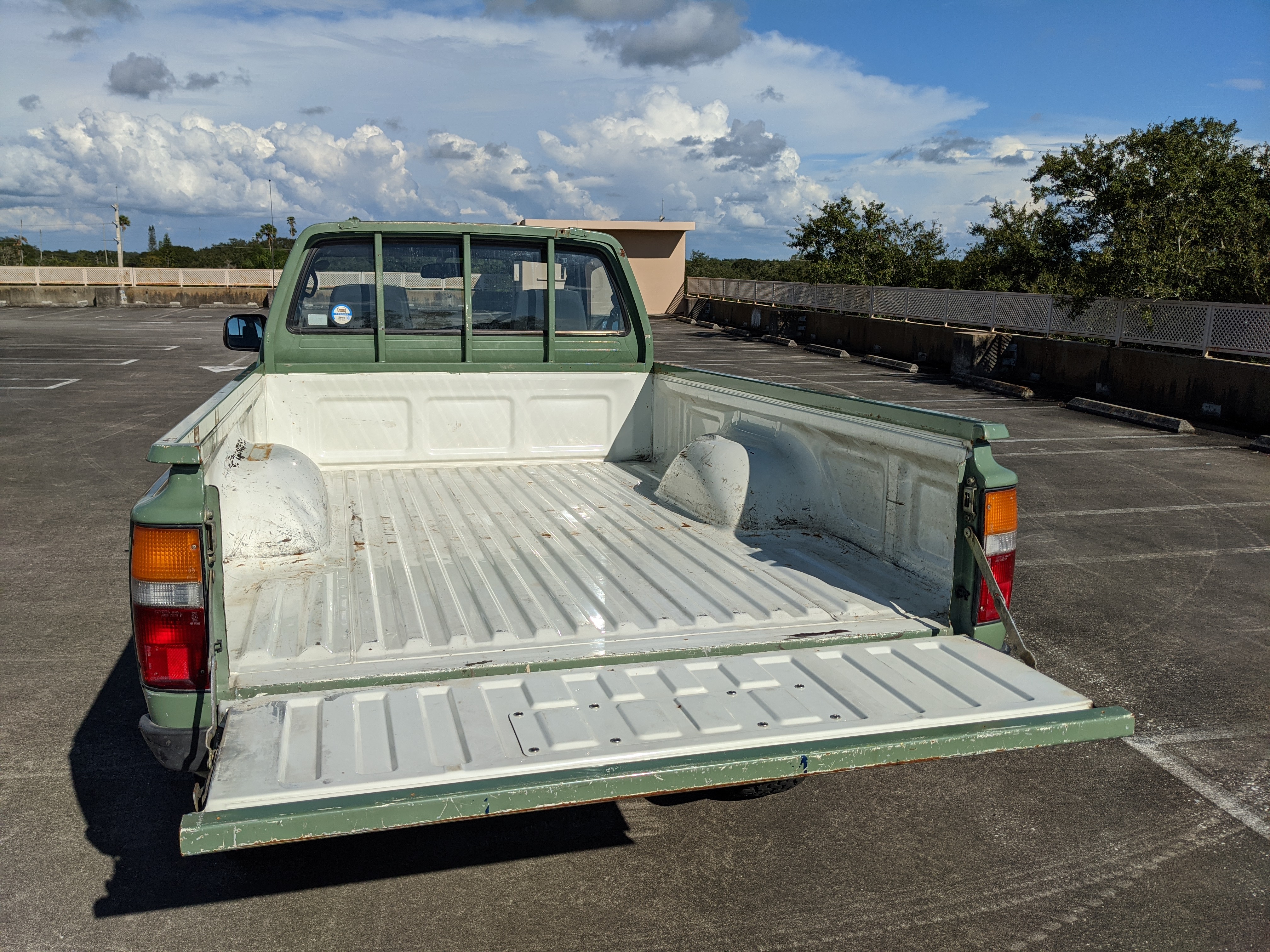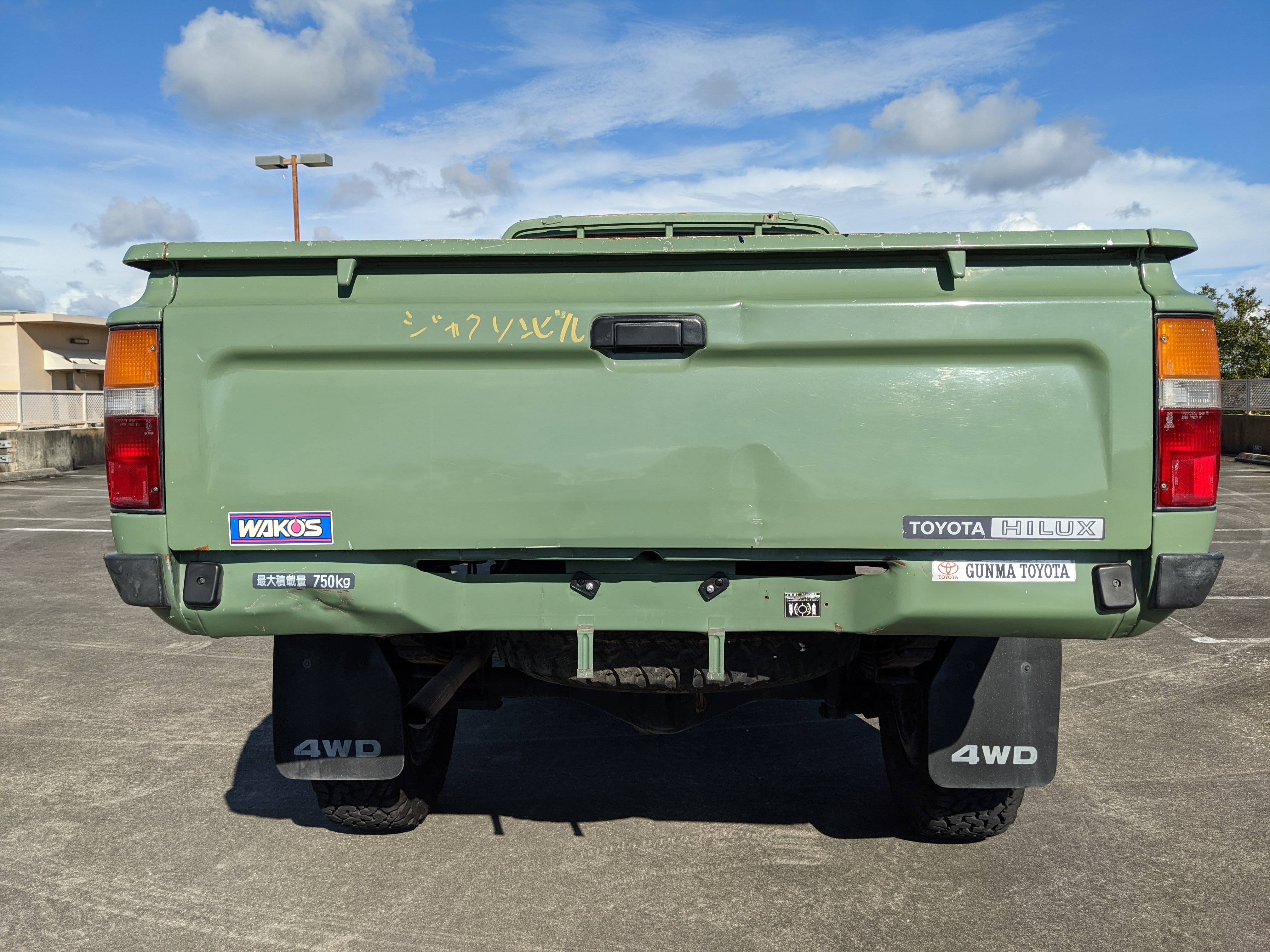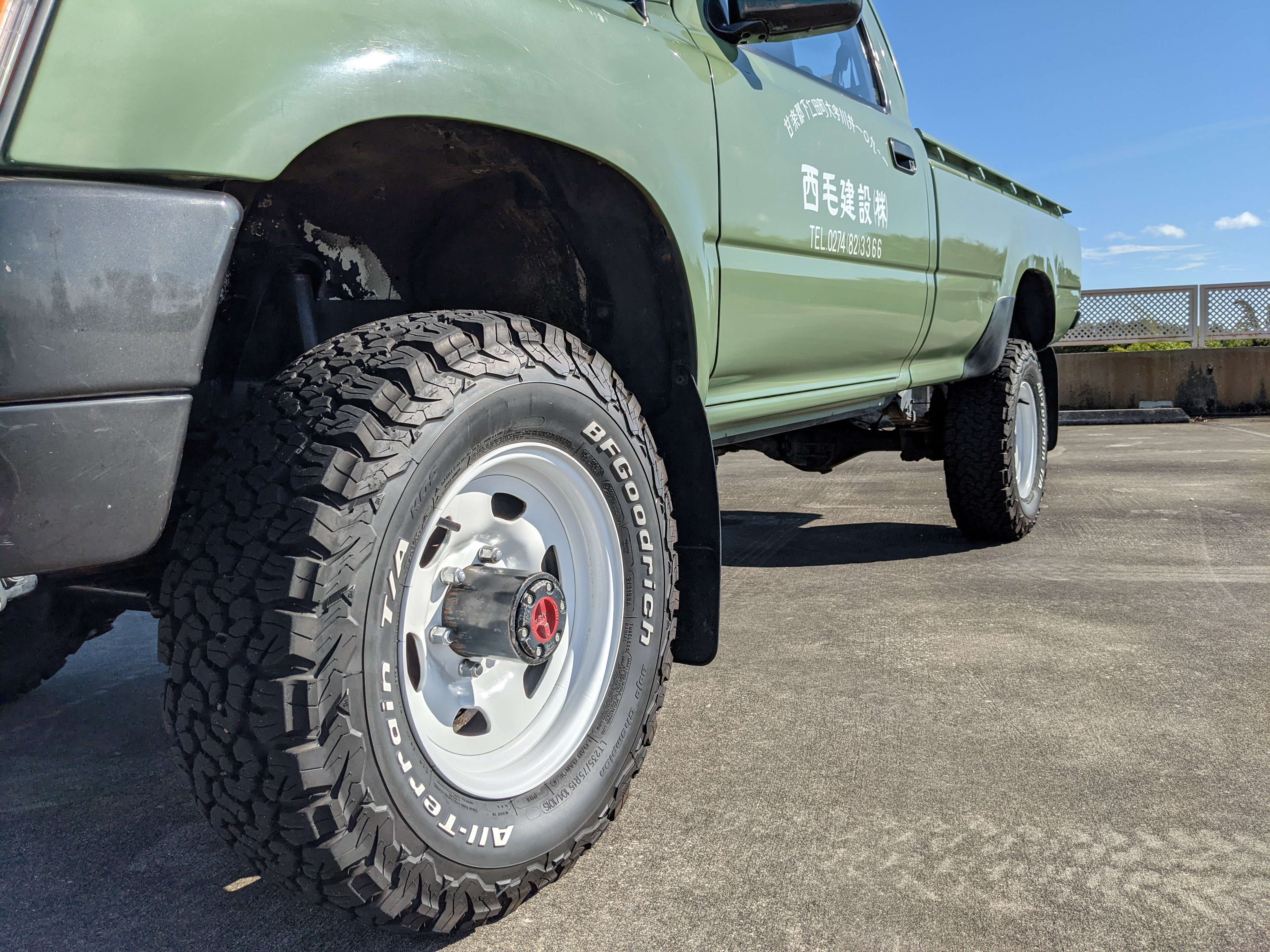 The hand-painted signs on either door are for “Nishige Construction”, as the ultimate purpose of this Hilux was to haul ‘HIGH PRESSURE GAS’ in a tank that was mounted in the bed. The tank has since been removed. As this truck was bought as a fleet vehicle it was originally white, but painted this forest-service green and put into service upon purchase. It does have various scratches and dents as would be common for a 26 year old work truck, but has been lovingly maintained otherwise. Pictures speak for themselves as to the condition. Everything is functional, everything works, and this beautiful rig will take you wherever you need to go, be it highways or where you don’t even have a vague suggestion of ‘road’.