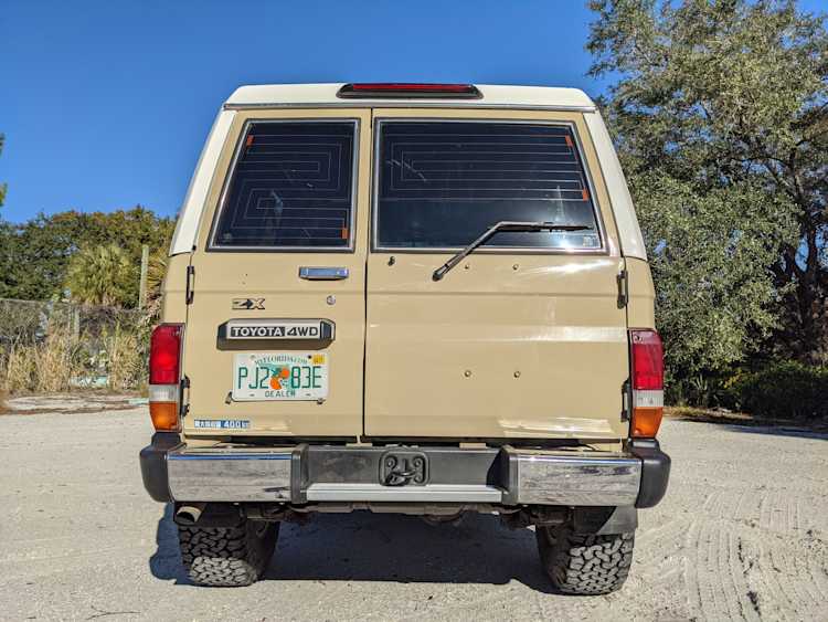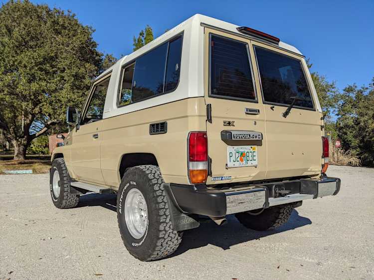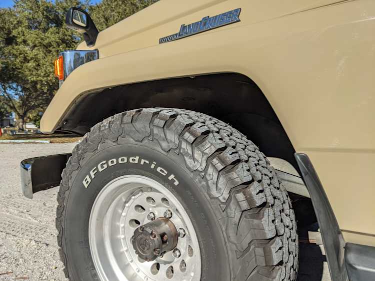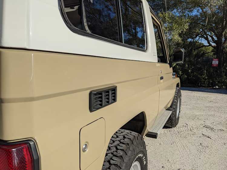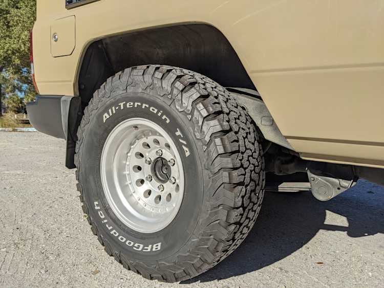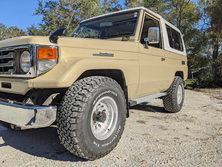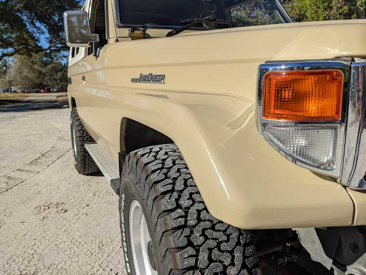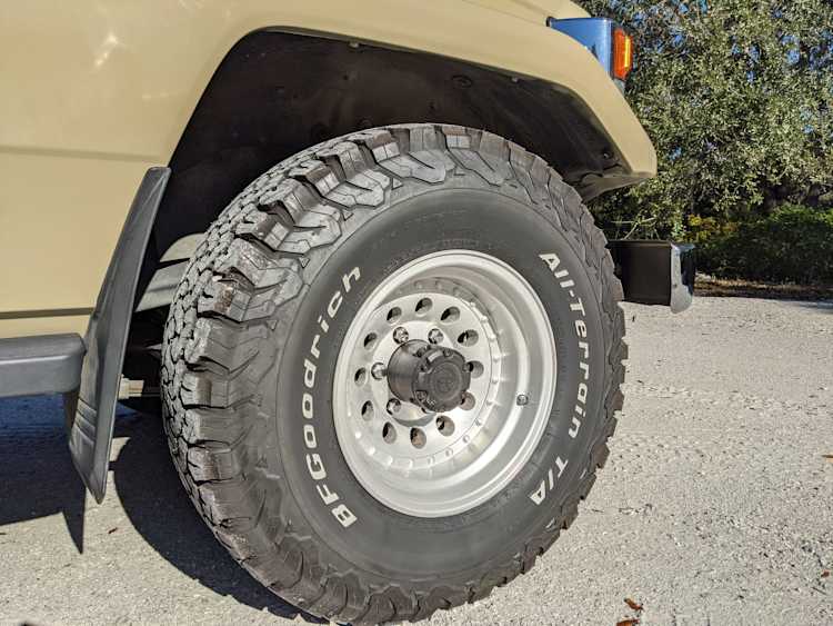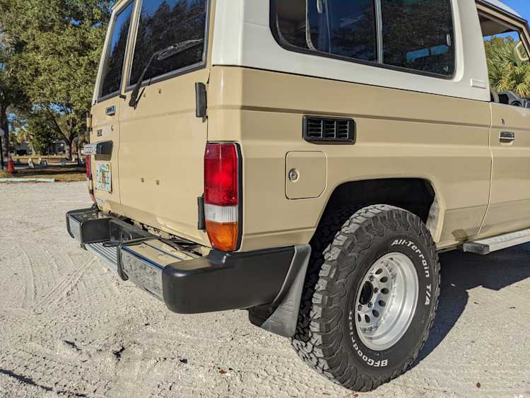 Desert tan on this narrow body model with a bright white FRP top gives a great contrast against most ‘always mad grrr’ designs that SUVs of this type typically wear these days. No dents or dings in the body work either, just straight, clean edges. Spare tire cover has been removed for an even more minimalist look. Aftermarket aluminum wheels are wrapped in brand new 32 inch BF Goodrich KO2s, white letters out.