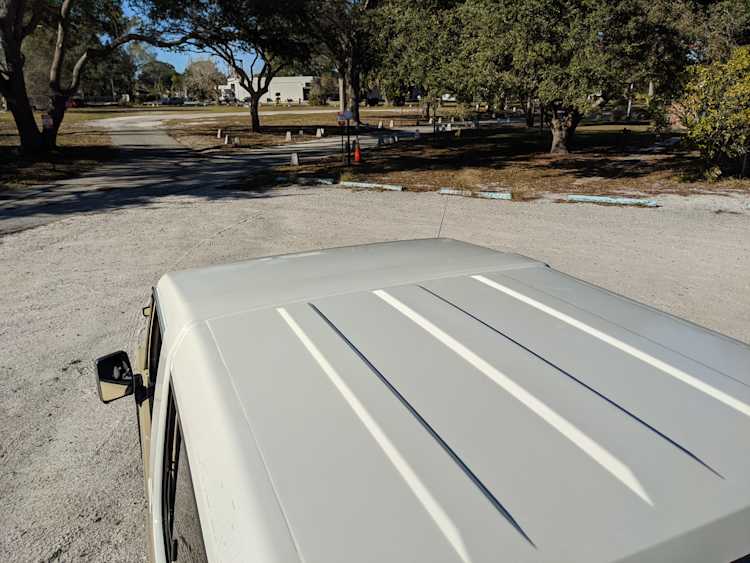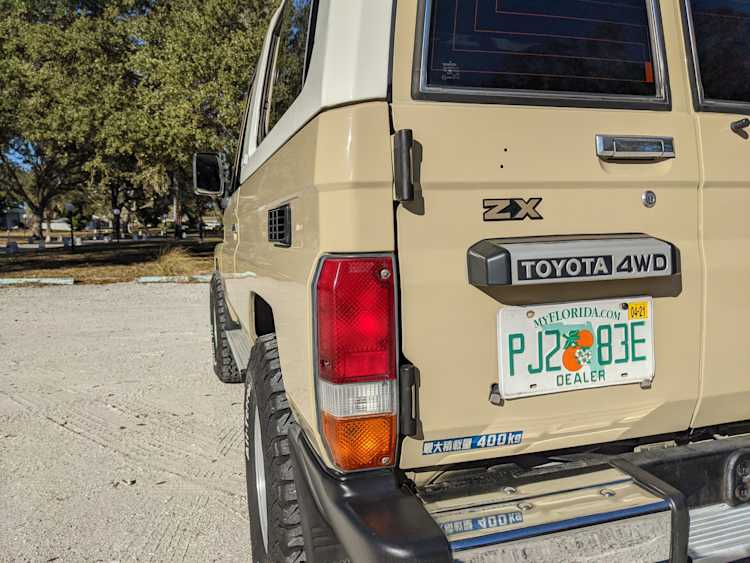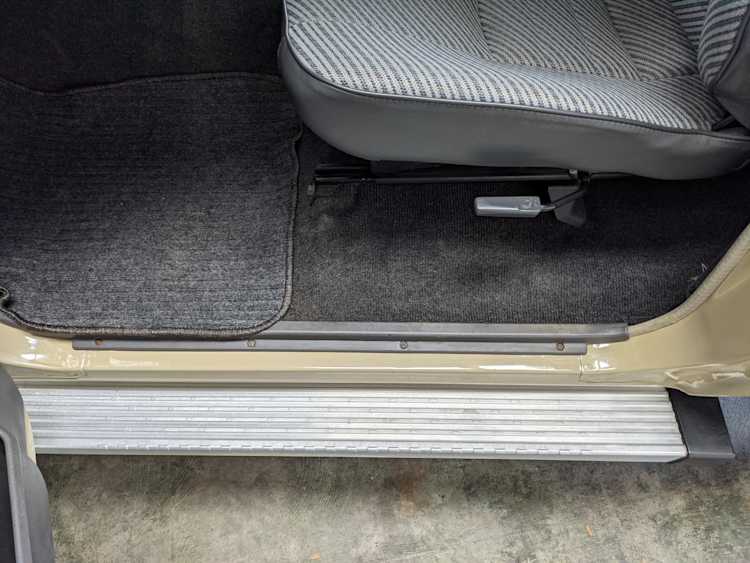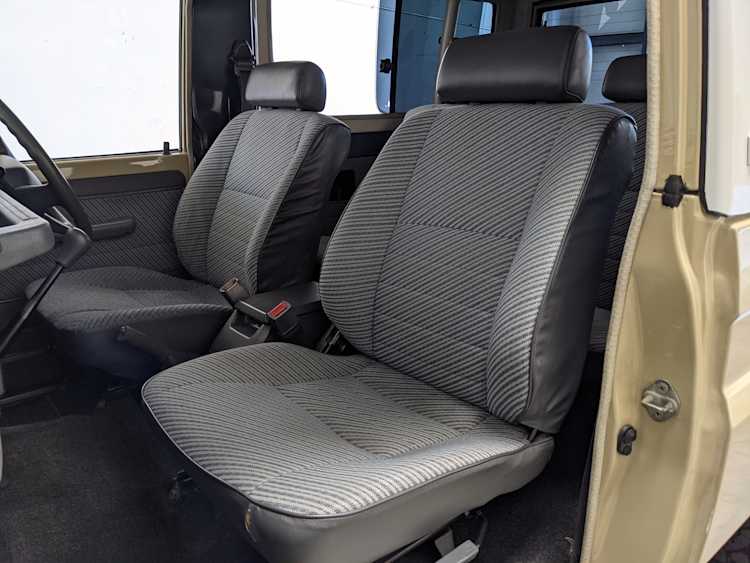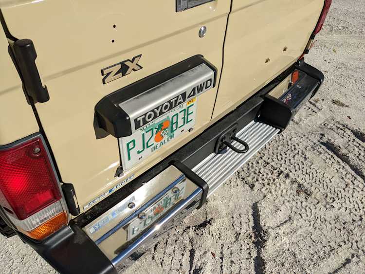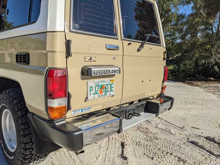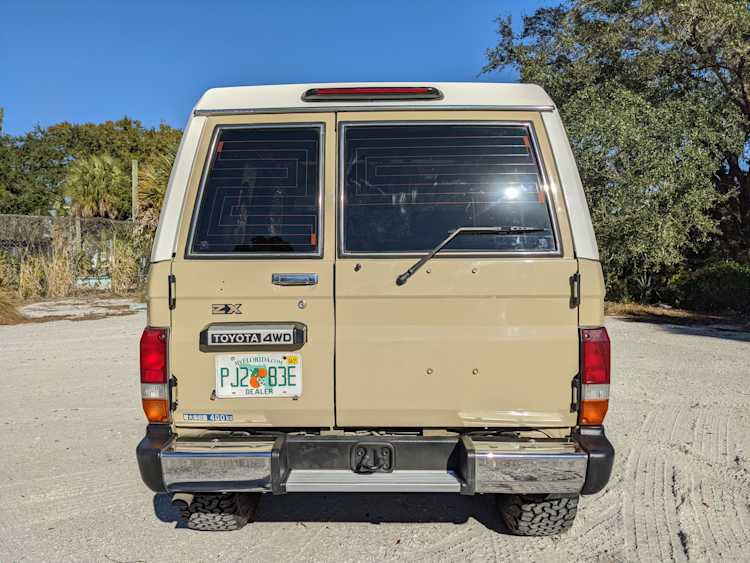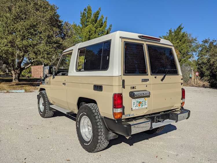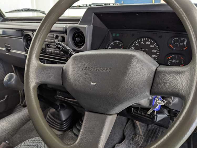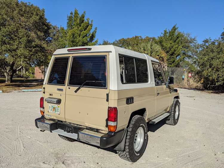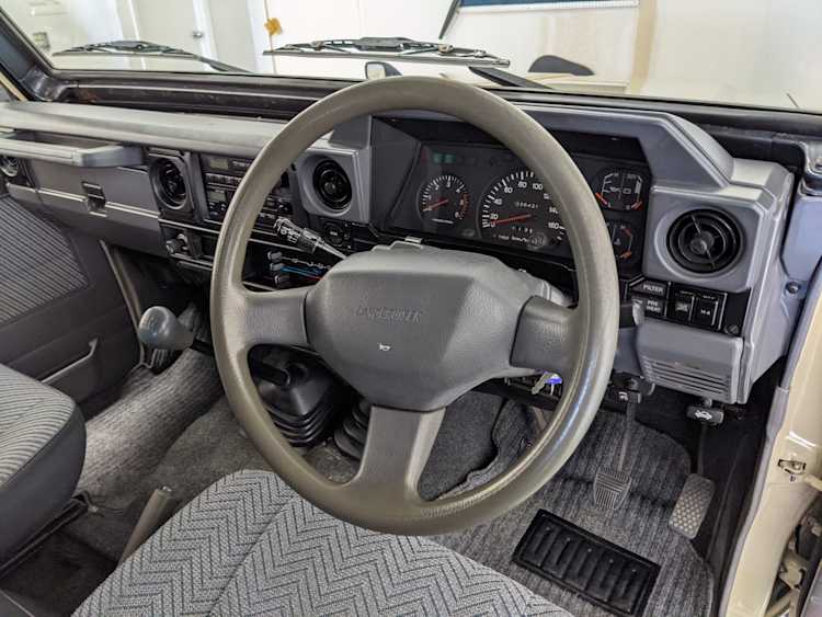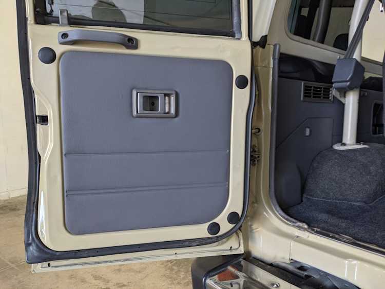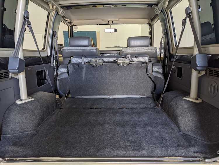 Interior is clear, comfortable and functional. Three pedals by your feet and a tall 5 speed lever sticking out of the transmission tunnel is arguably what makes this Cruiser even more special. Original head unit sits above the AC and heat controls. The air conditioning works perfectly. Down by the base of the transmission lever is your low-range selector for 4WD. The FRP Cruisers end up with a significant extra amount of room behind the rear seats compared to a true short-wheelbase model. Factory original roll bar sticks off the rear wheel wells to make up for the fact that the FRP top can be removed.