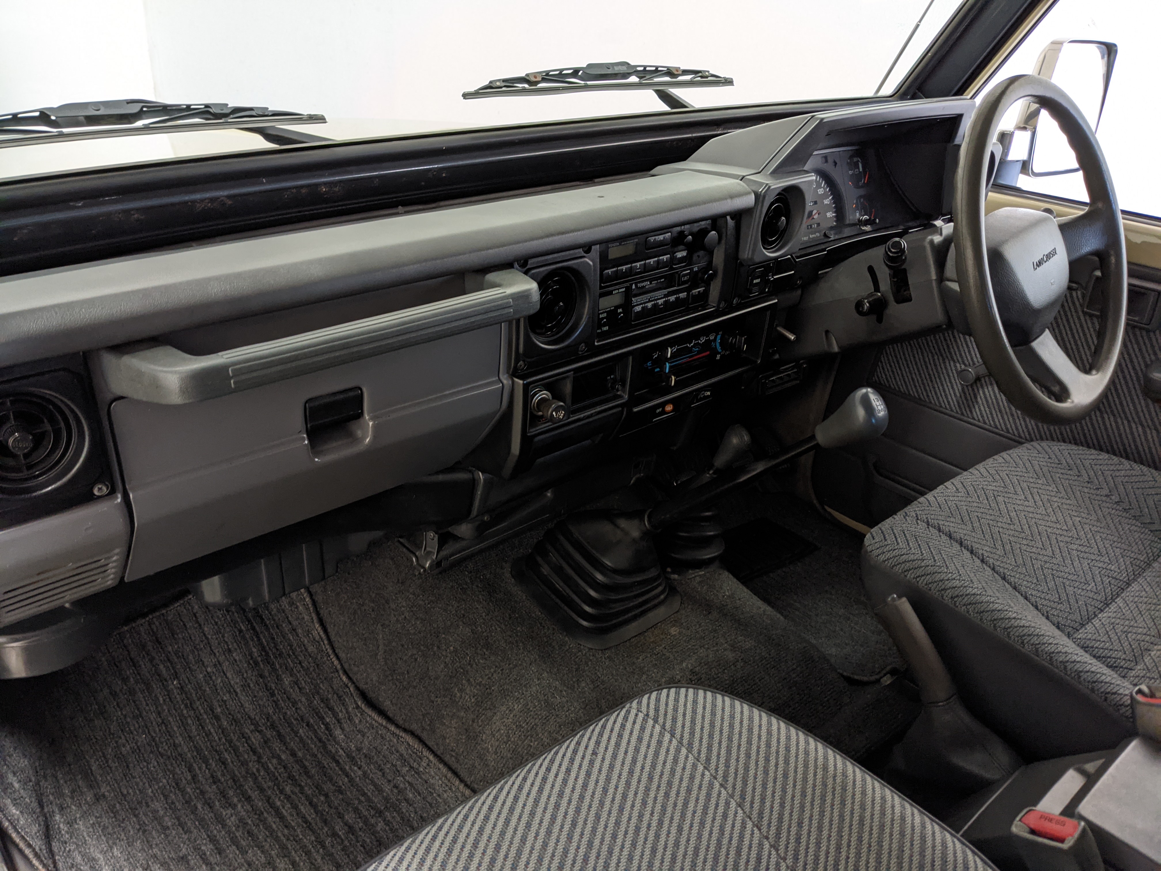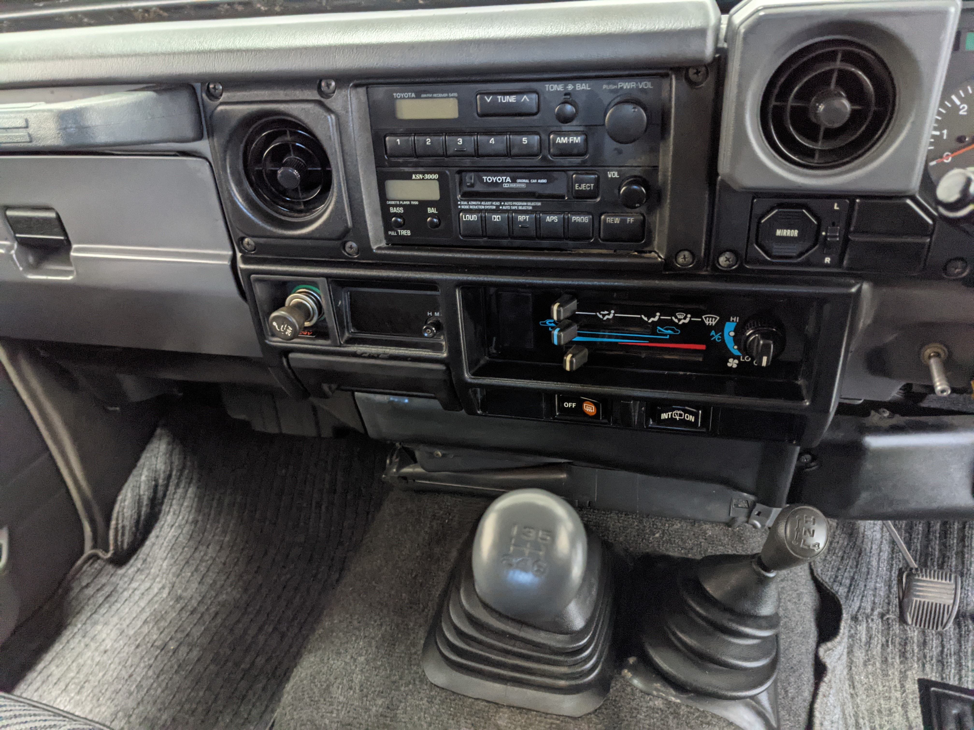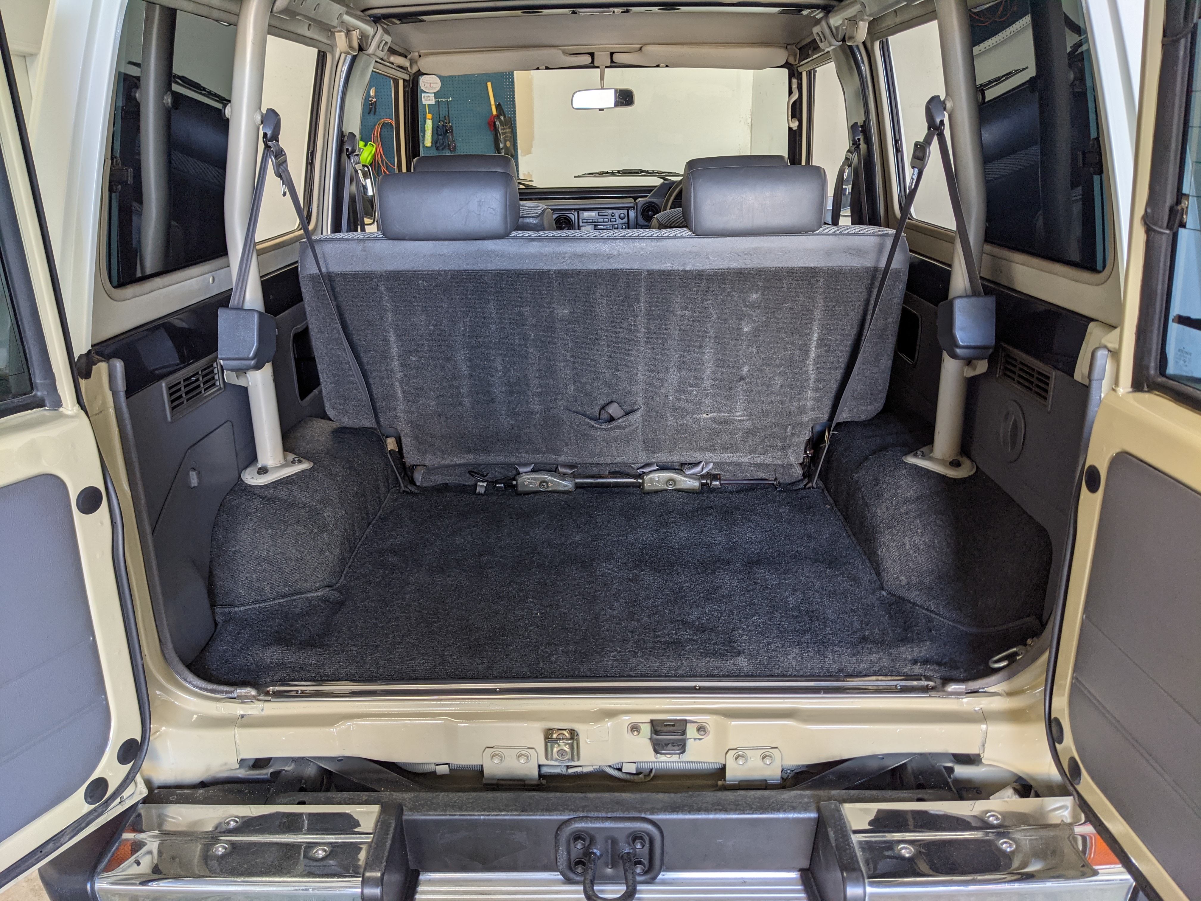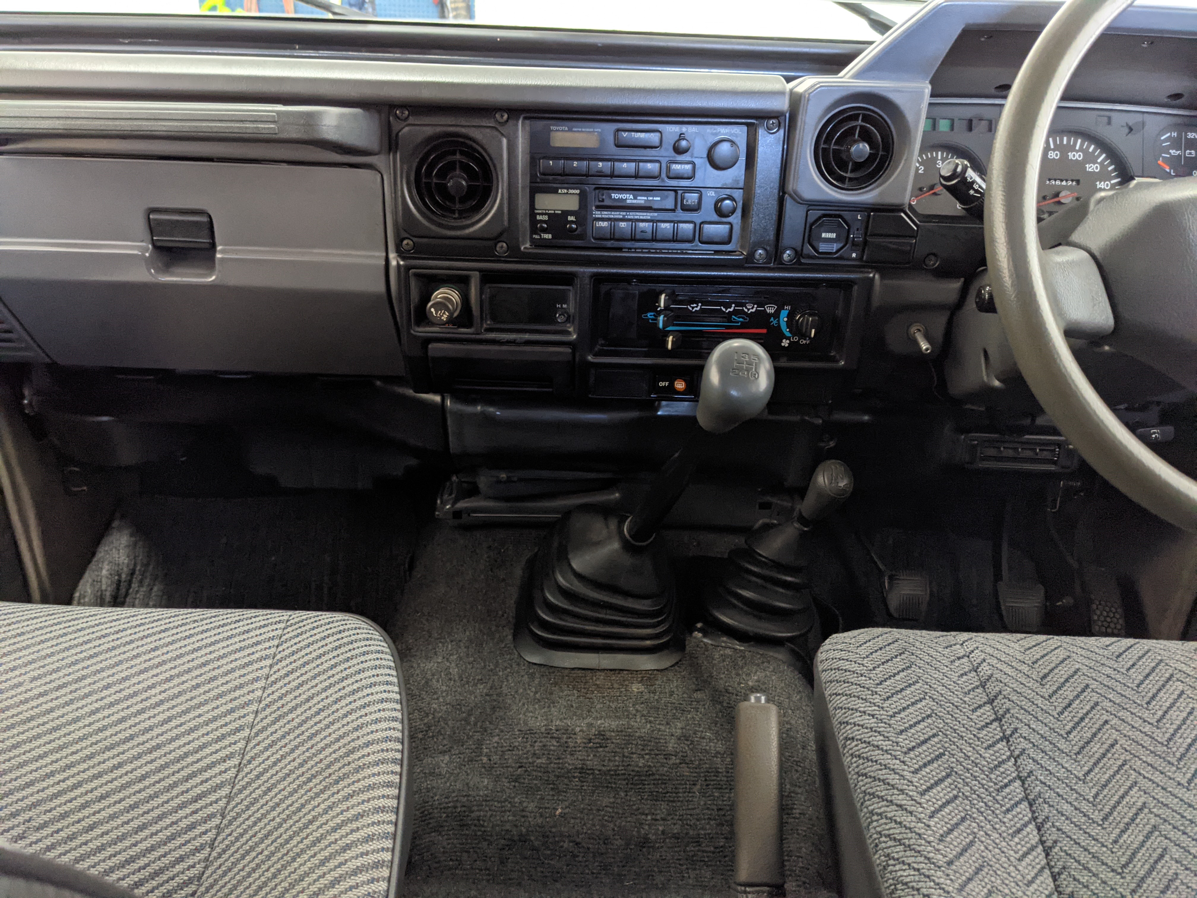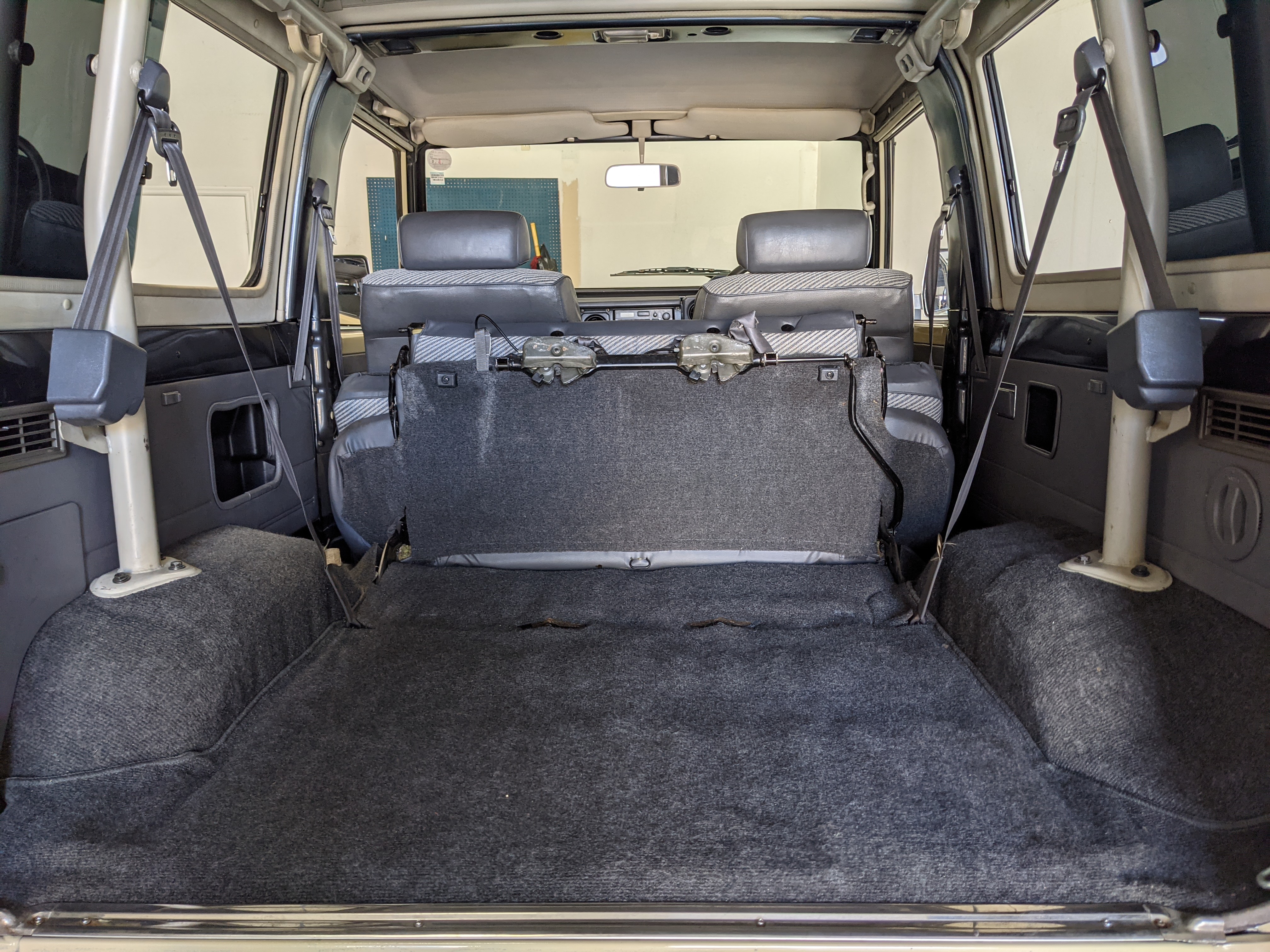 Interior is clear, comfortable and functional. Three pedals by your feet and a tall 5 speed lever sticking out of the transmission tunnel is arguably what makes this Cruiser even more special. Original head unit sits above the AC and heat controls. The air conditioning works perfectly. Down by the base of the transmission lever is your low-range selector for 4WD. The FRP Cruisers end up with a significant extra amount of room behind the rear seats compared to a true short-wheelbase model. Factory original roll bar sticks off the rear wheel wells to make up for the fact that the FRP top can be removed.