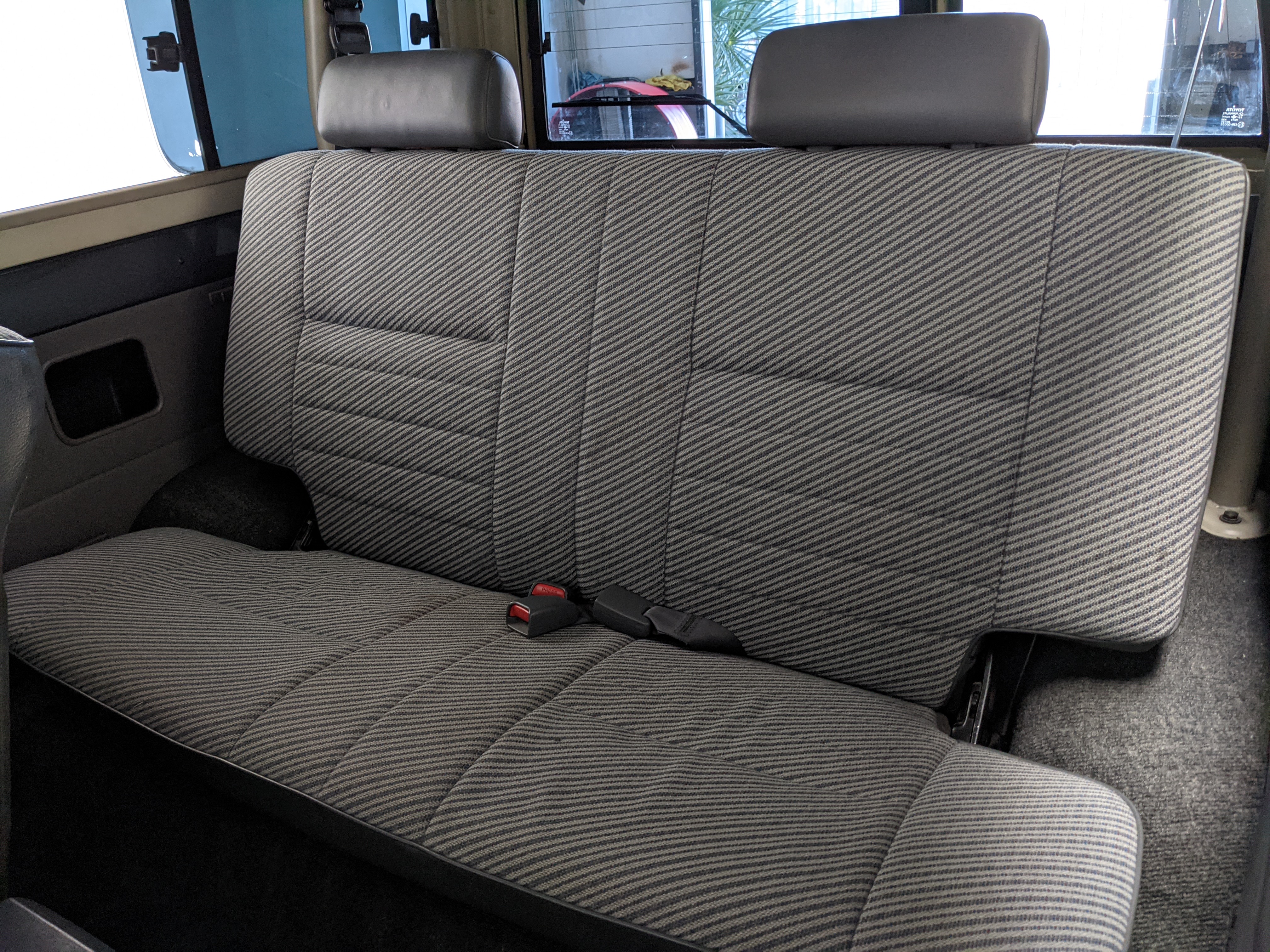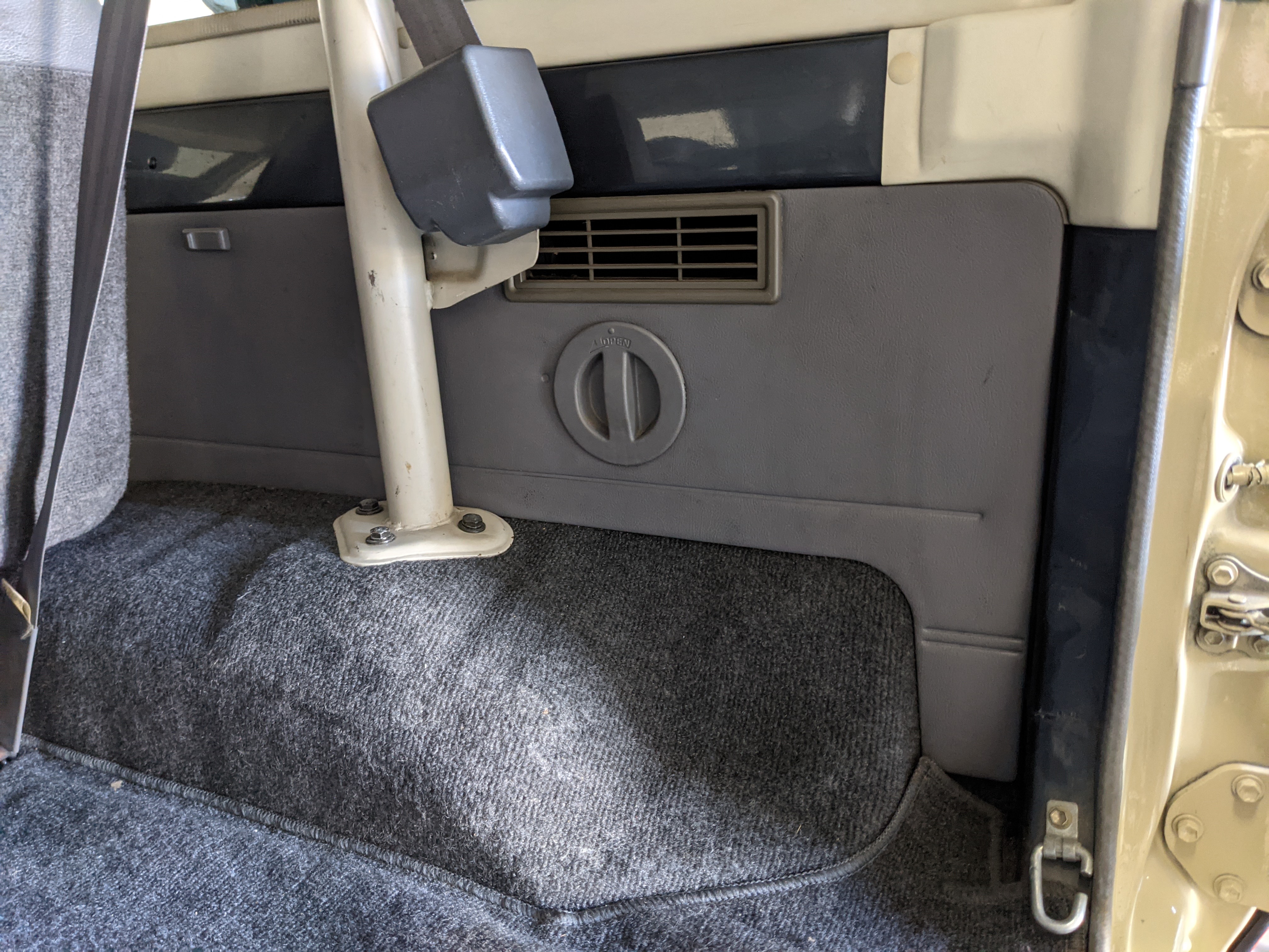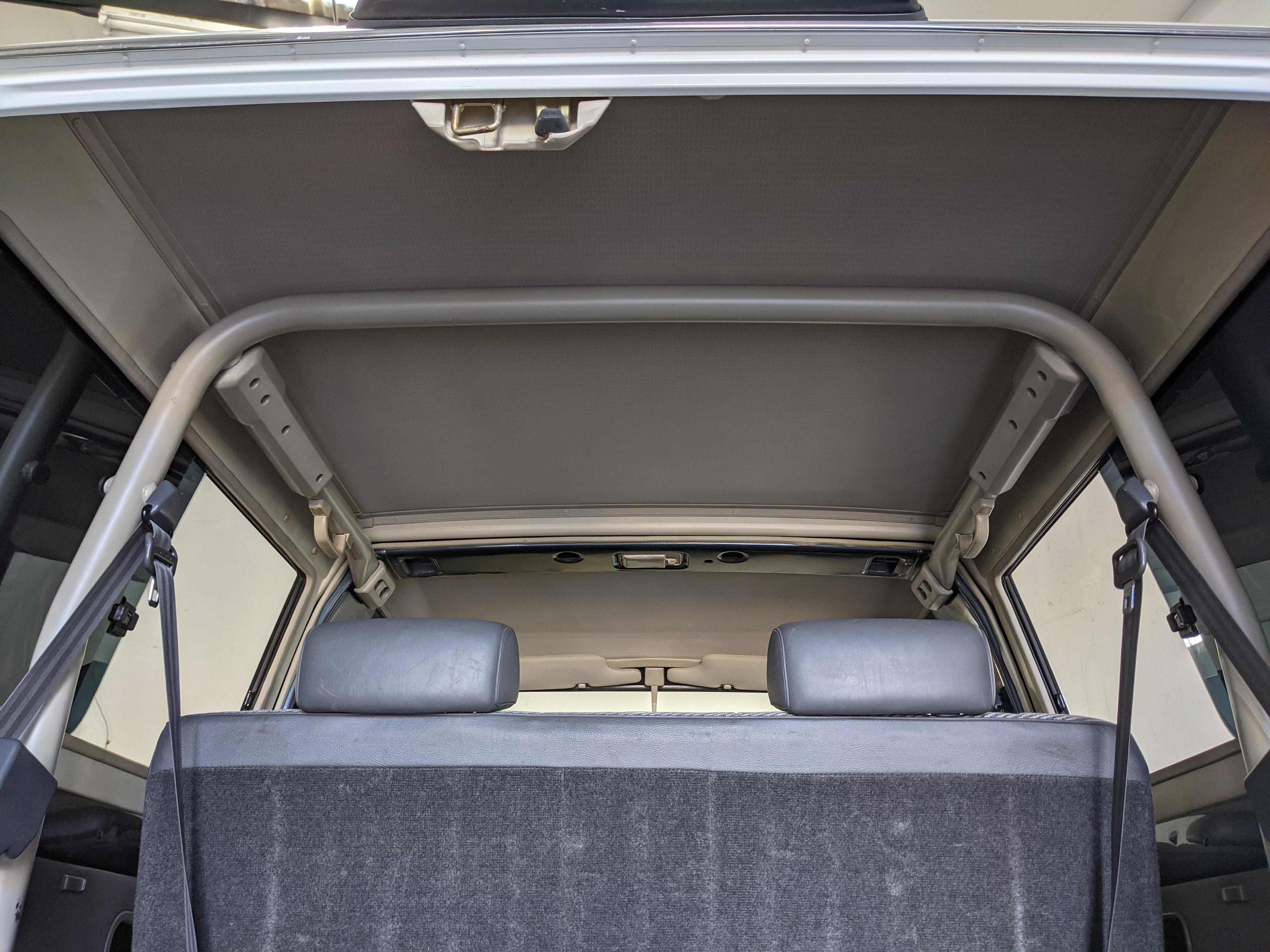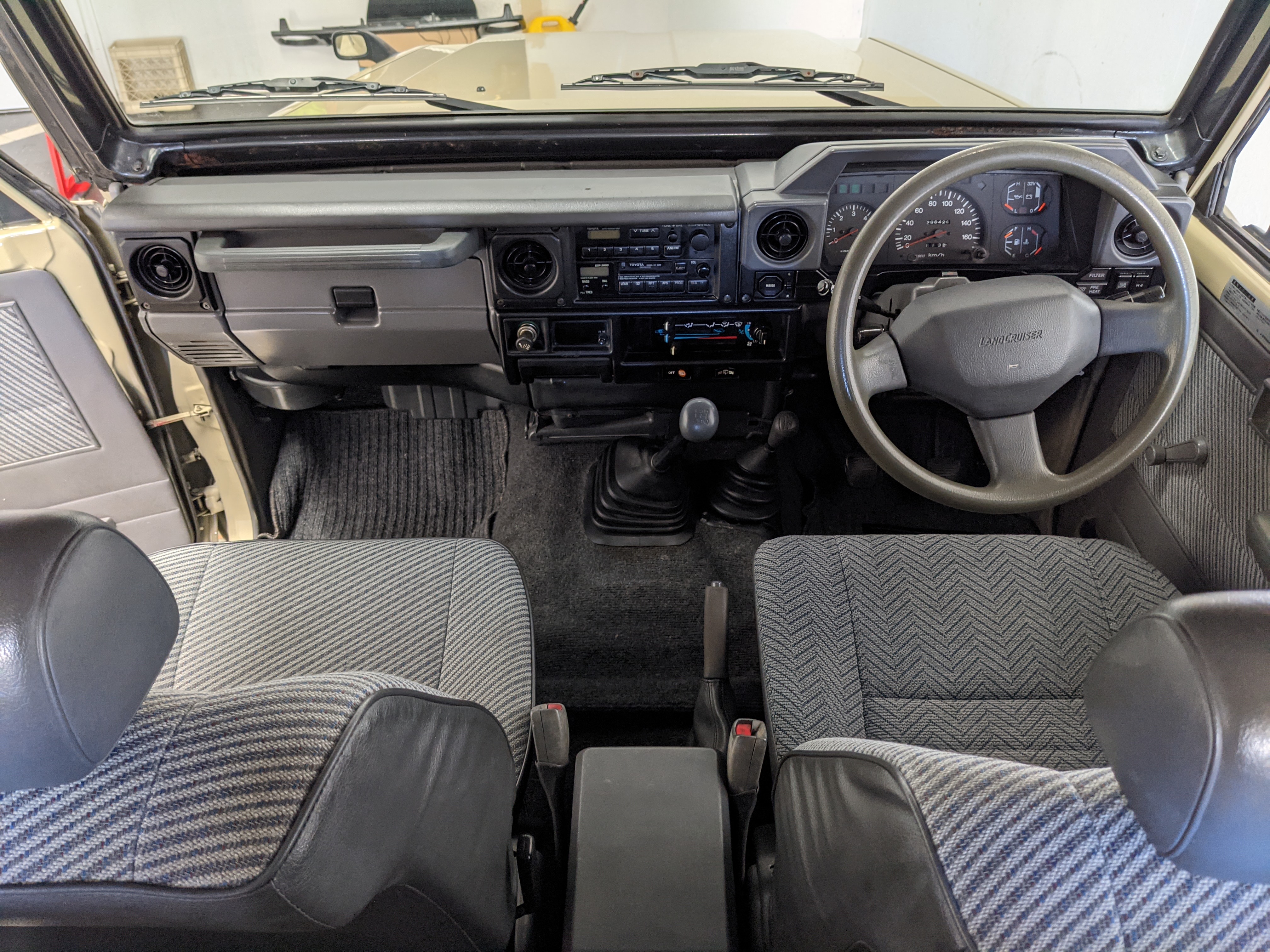 Interior is clear, comfortable and functional. Three pedals by your feet and a tall 5 speed lever sticking out of the transmission tunnel is arguably what makes this Cruiser even more special. Original head unit sits above the AC and heat controls. The air conditioning works perfectly. Down by the base of the transmission lever is your low-range selector for 4WD. The FRP Cruisers end up with a significant extra amount of room behind the rear seats compared to a true short-wheelbase model. Factory original roll bar sticks off the rear wheel wells to make up for the fact that the FRP top can be removed.