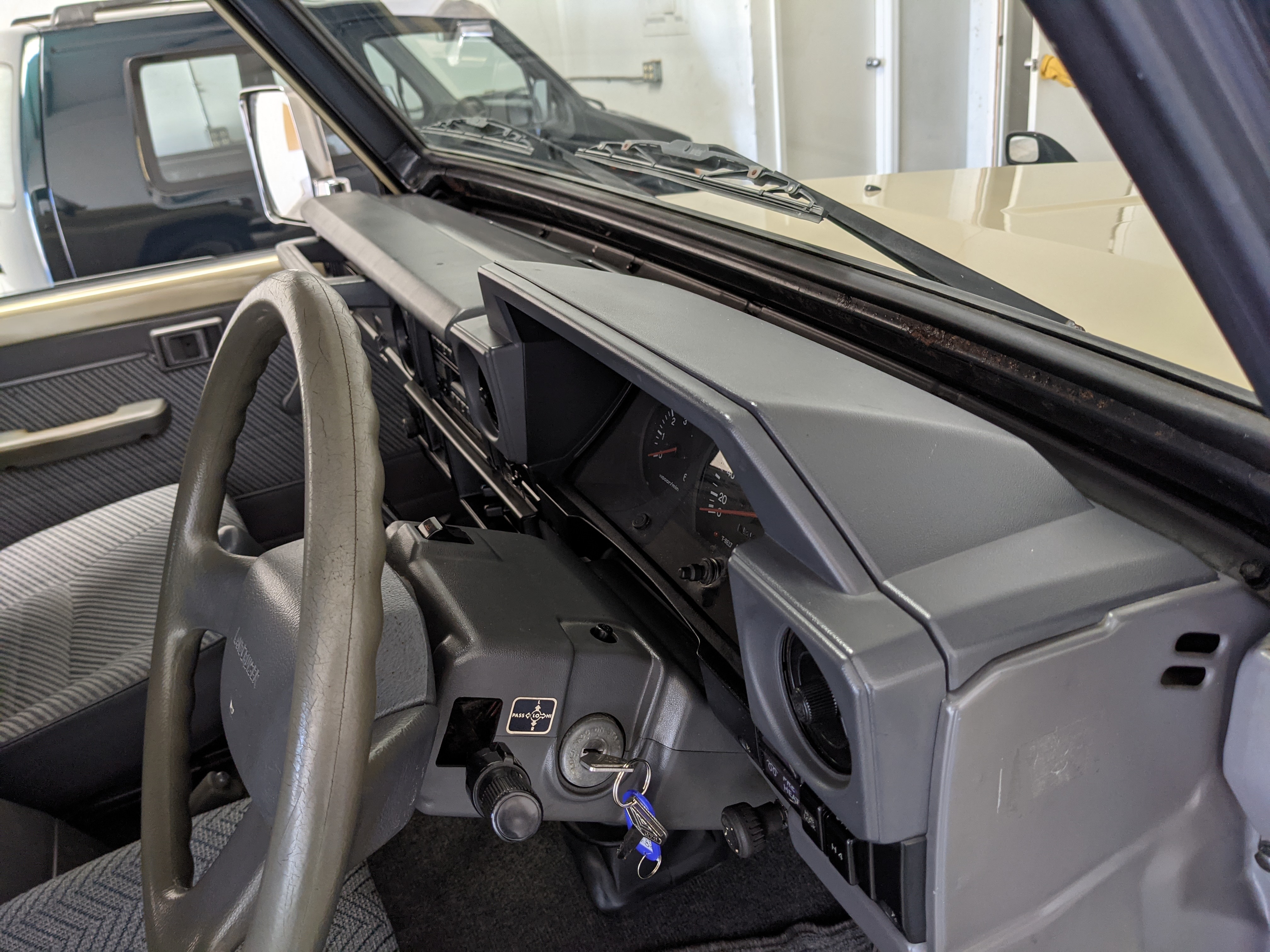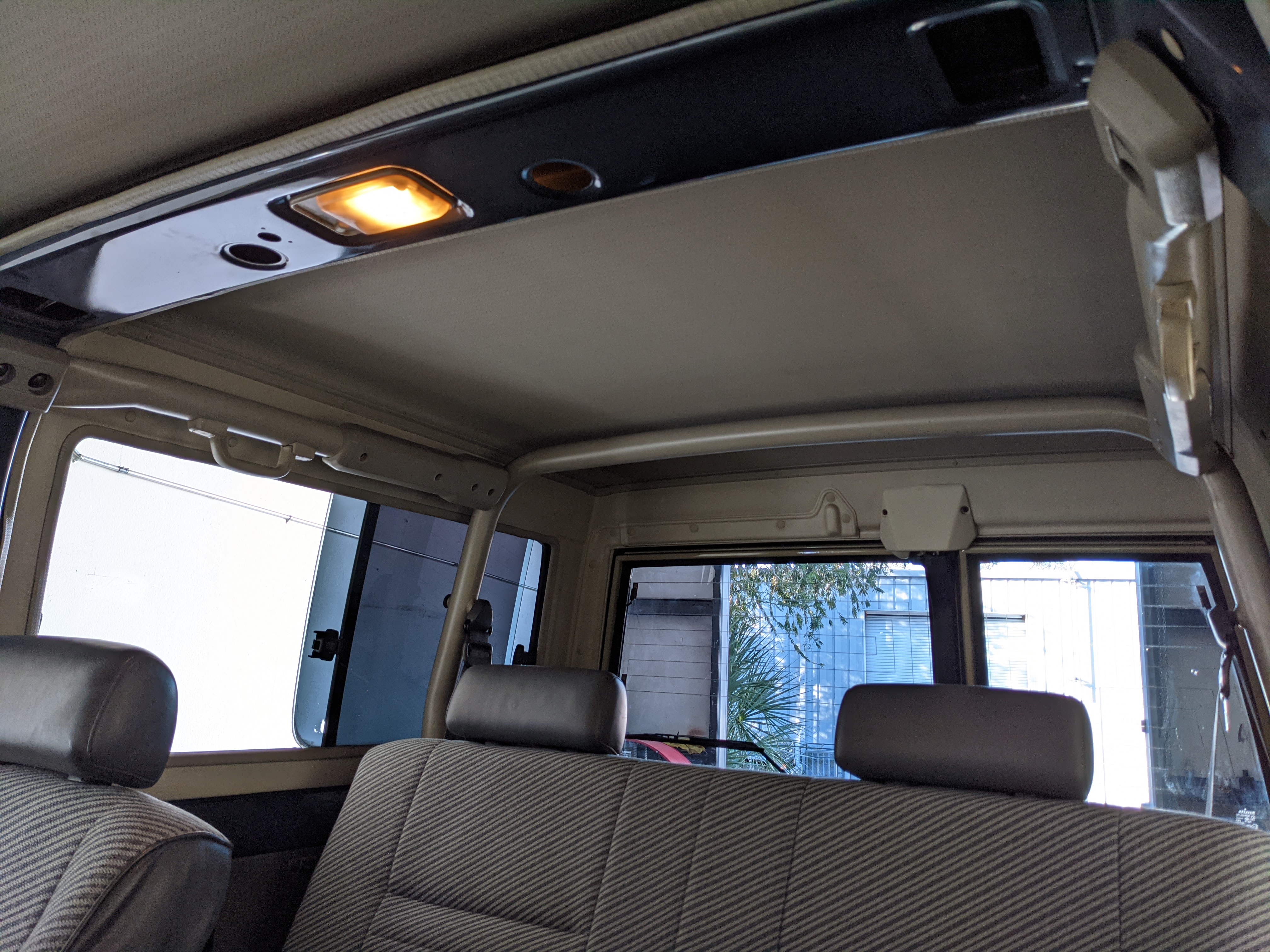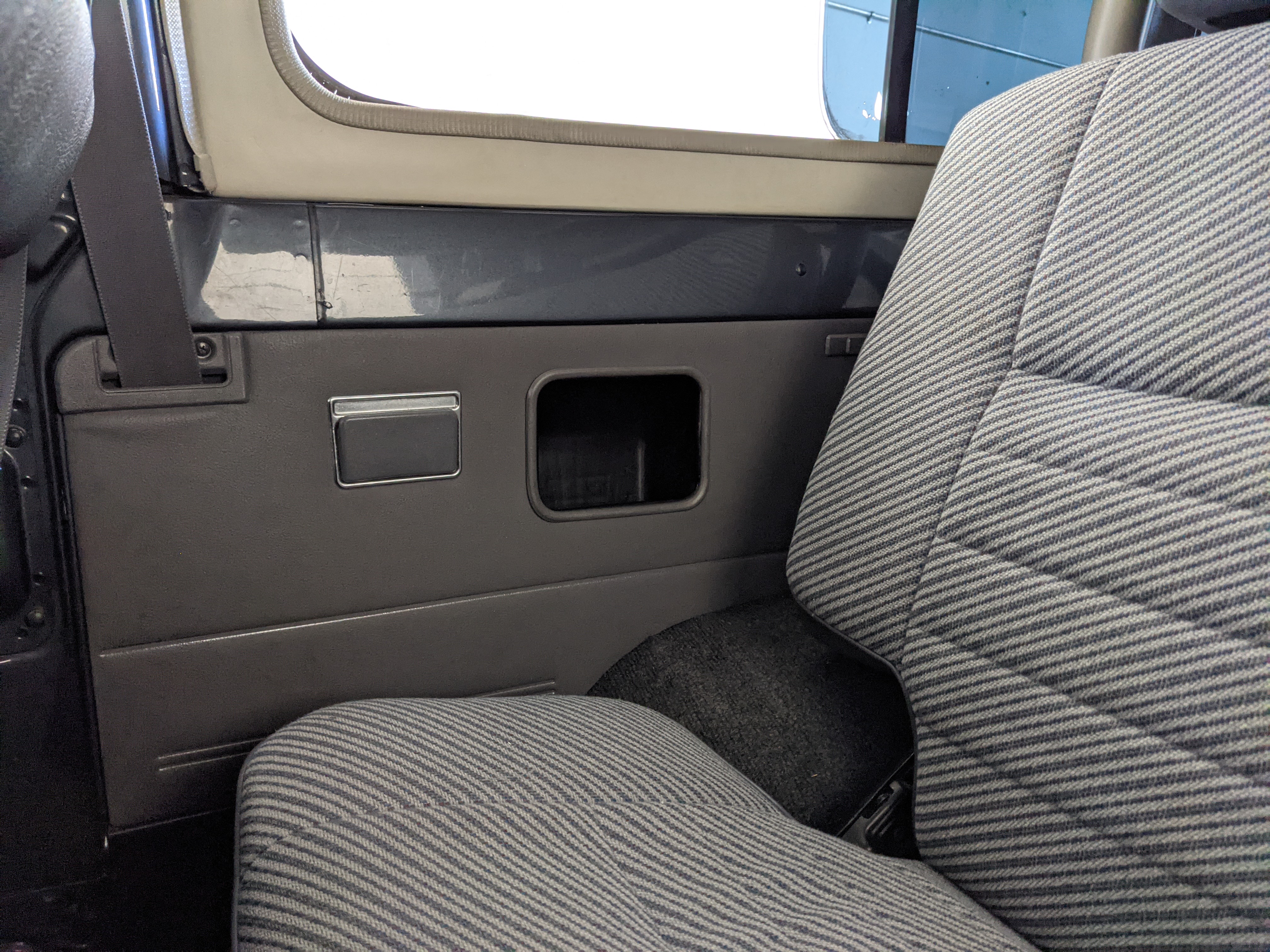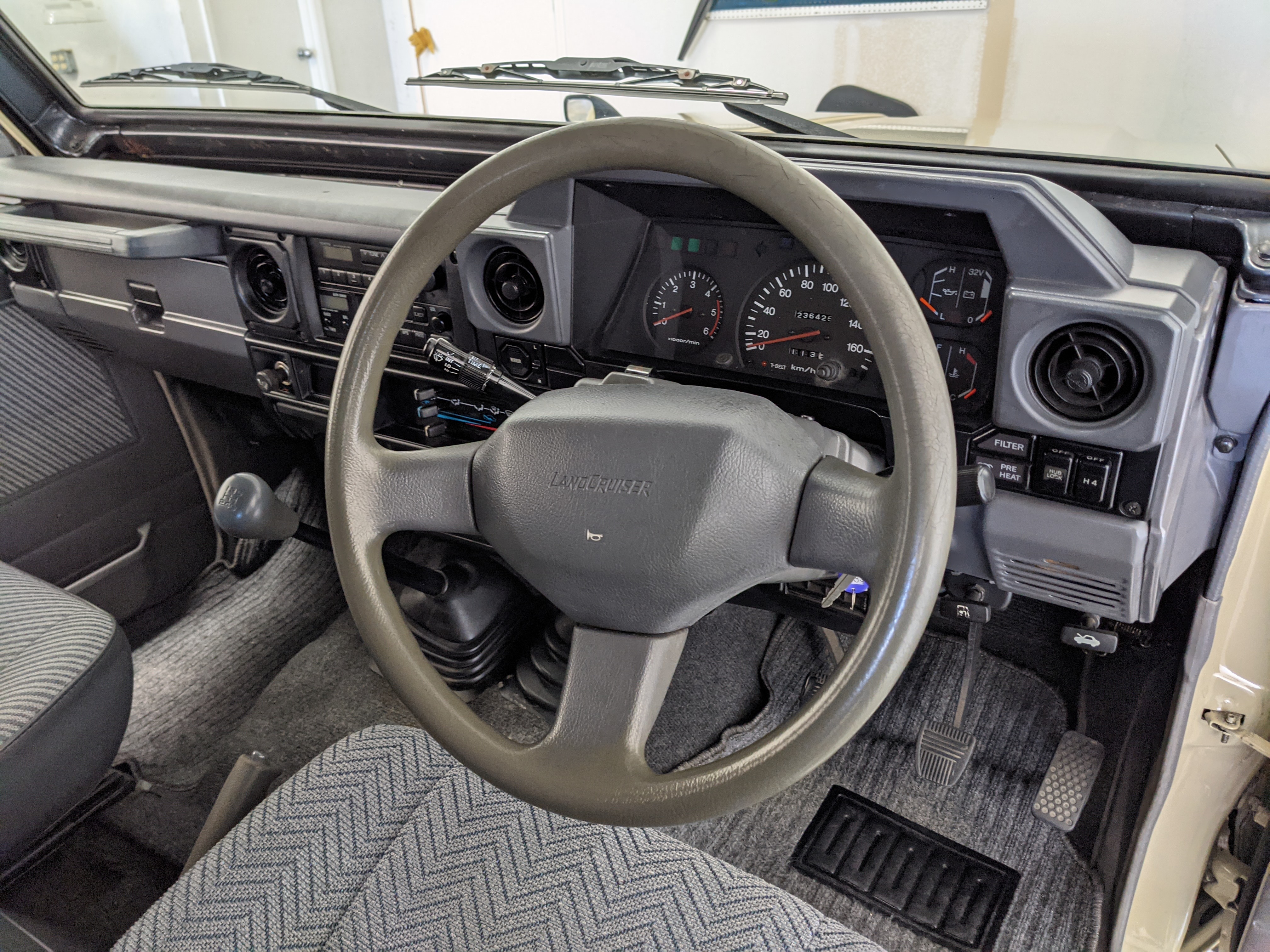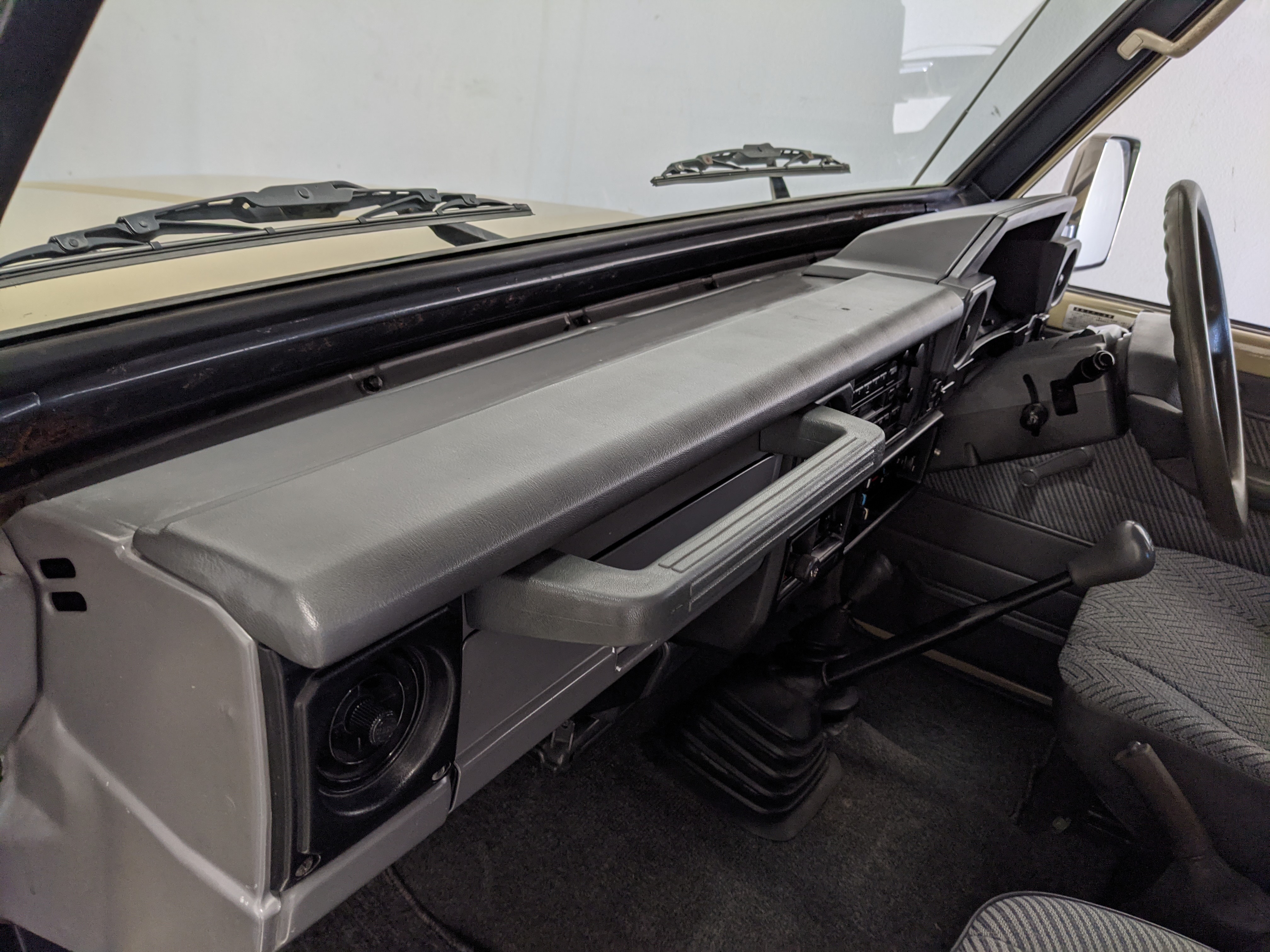 Interior is clear, comfortable and functional. Three pedals by your feet and a tall 5 speed lever sticking out of the transmission tunnel is arguably what makes this Cruiser even more special. Original head unit sits above the AC and heat controls. The air conditioning works perfectly. Down by the base of the transmission lever is your low-range selector for 4WD. The FRP Cruisers end up with a significant extra amount of room behind the rear seats compared to a true short-wheelbase model. Factory original roll bar sticks off the rear wheel wells to make up for the fact that the FRP top can be removed.