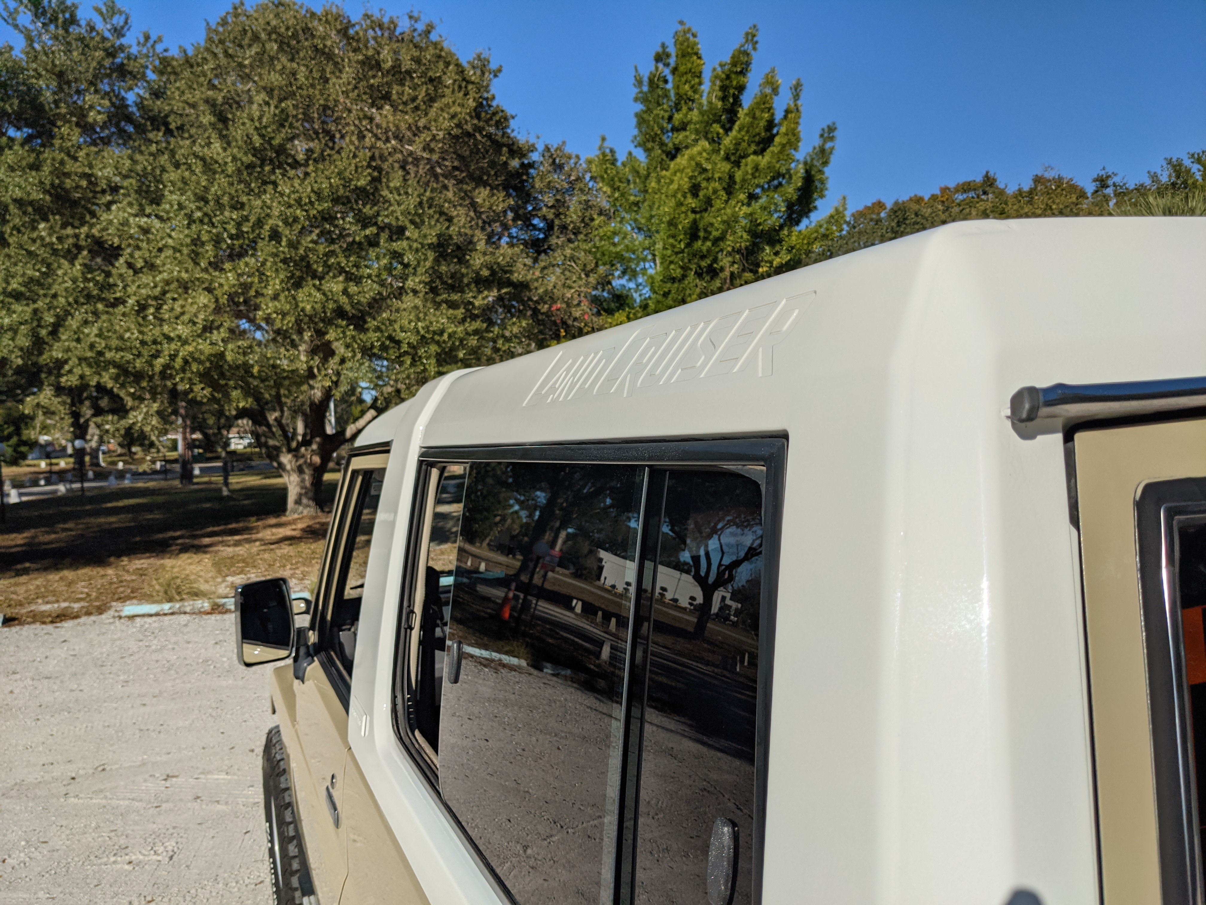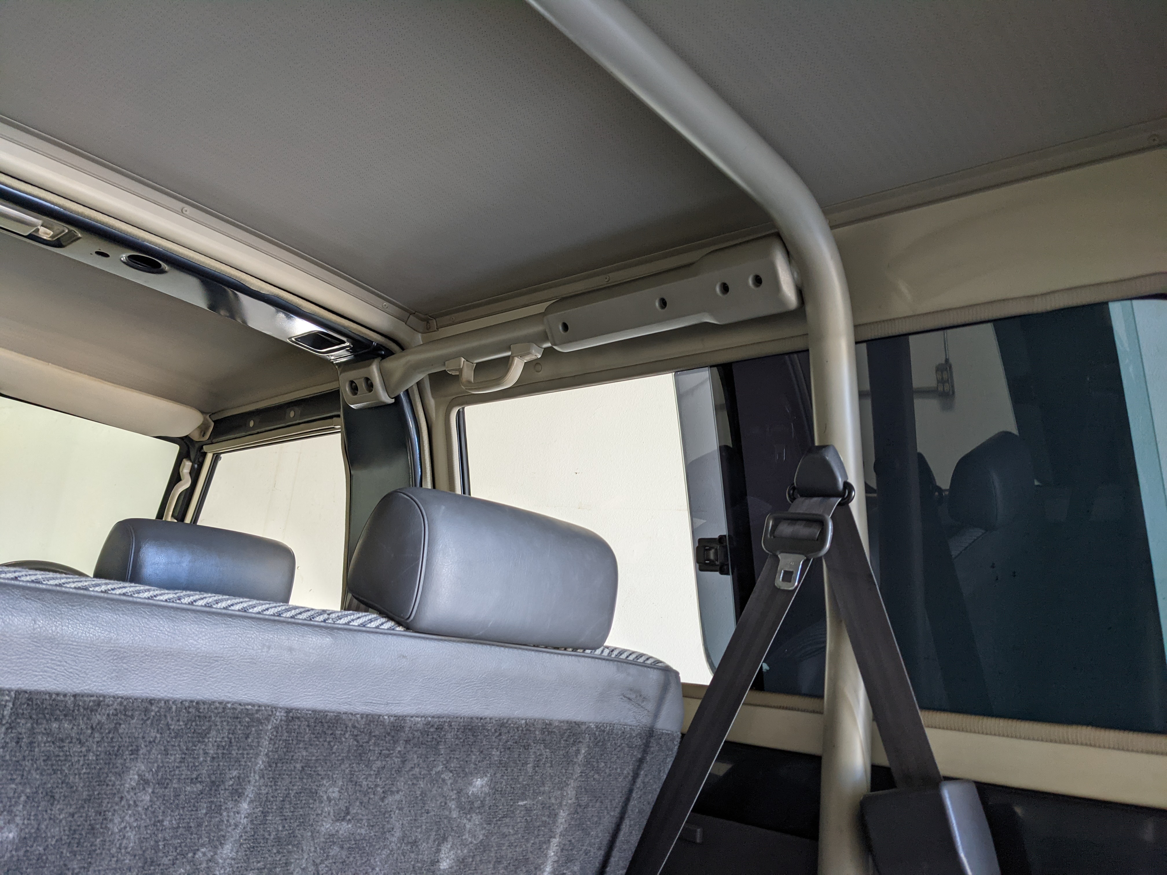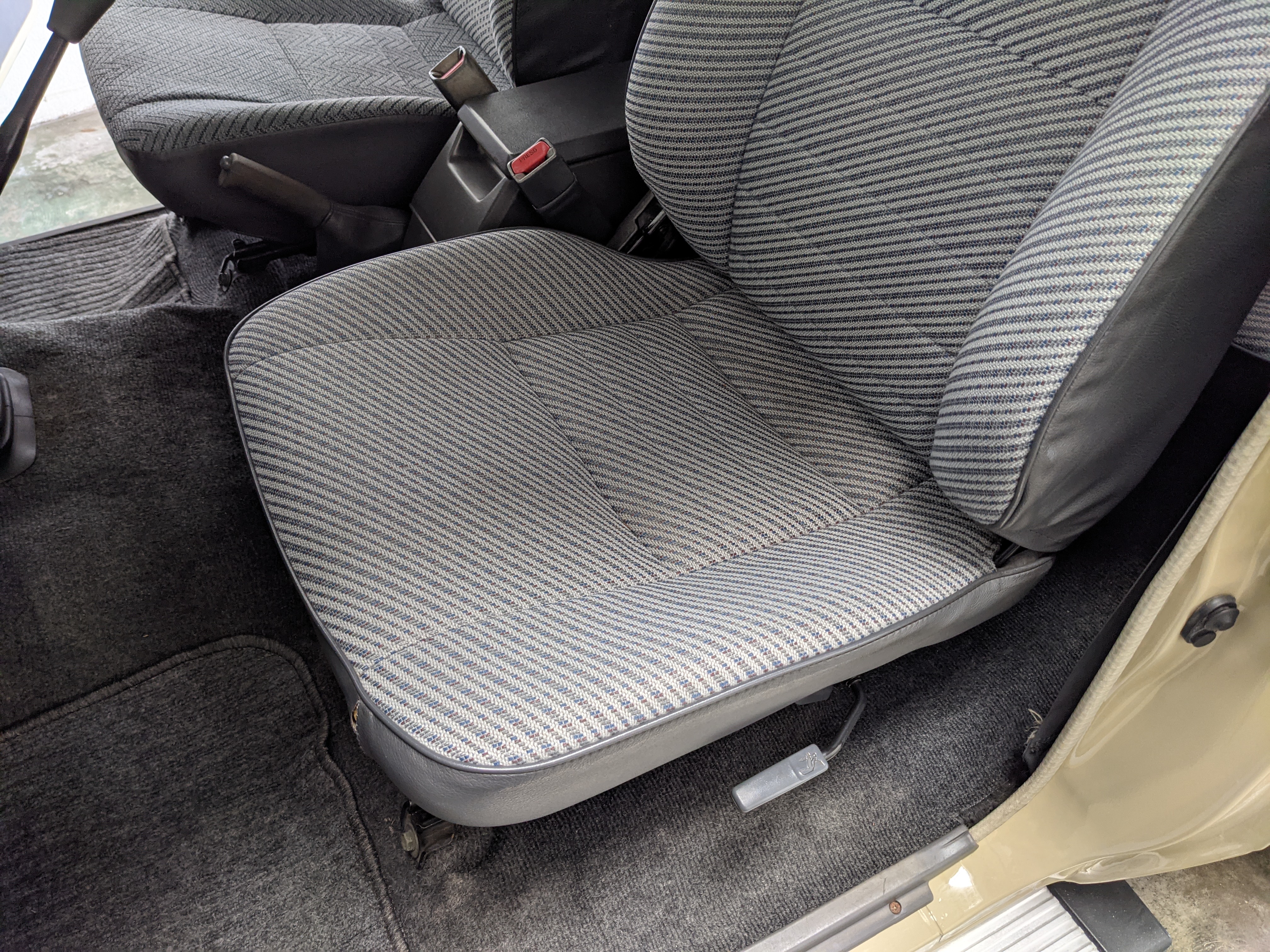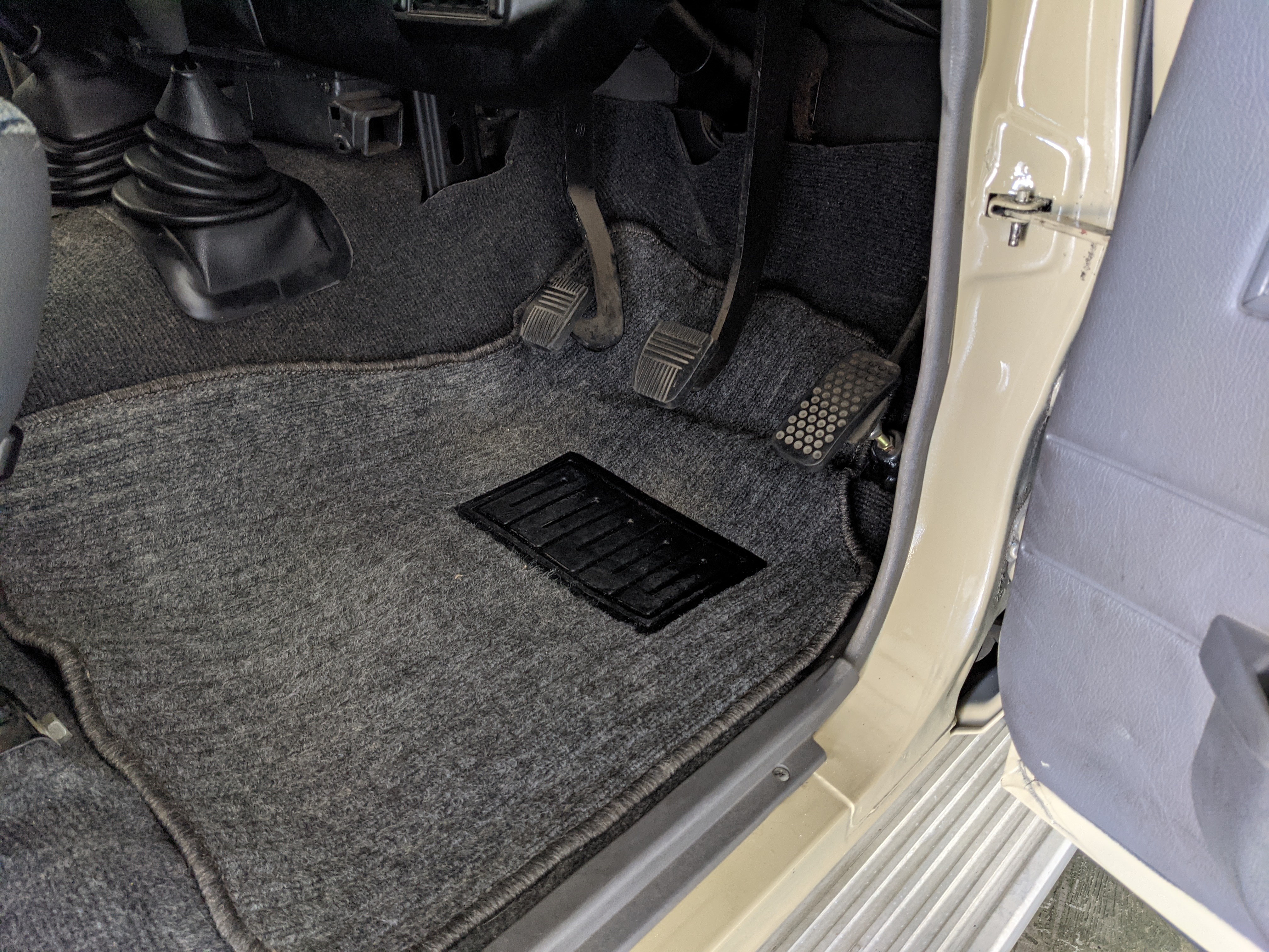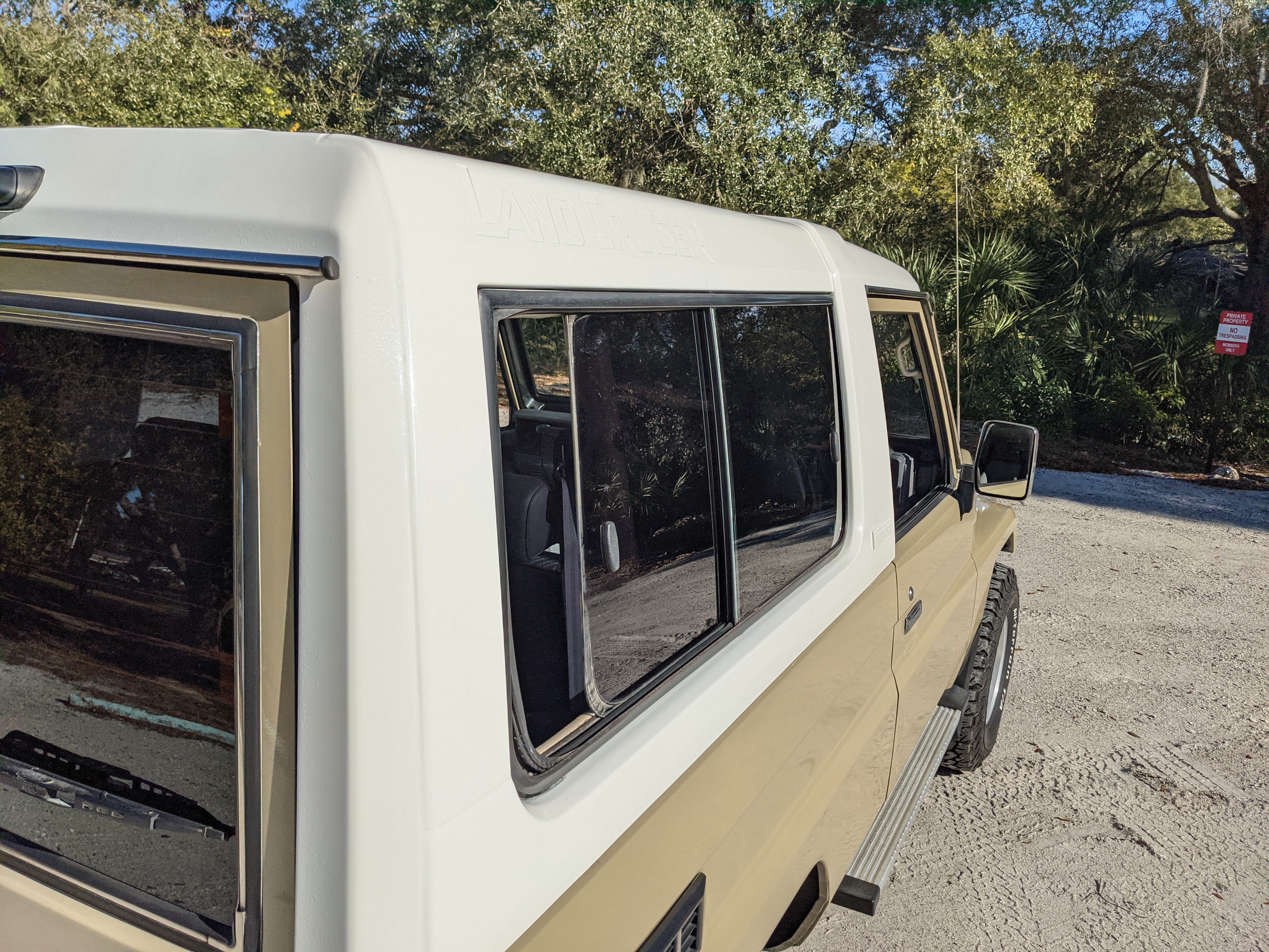 Interior is clear, comfortable and functional. Three pedals by your feet and a tall 5 speed lever sticking out of the transmission tunnel is arguably what makes this Cruiser even more special. Original head unit sits above the AC and heat controls. The air conditioning works perfectly. Down by the base of the transmission lever is your low-range selector for 4WD. The FRP Cruisers end up with a significant extra amount of room behind the rear seats compared to a true short-wheelbase model. Factory original roll bar sticks off the rear wheel wells to make up for the fact that the FRP top can be removed.