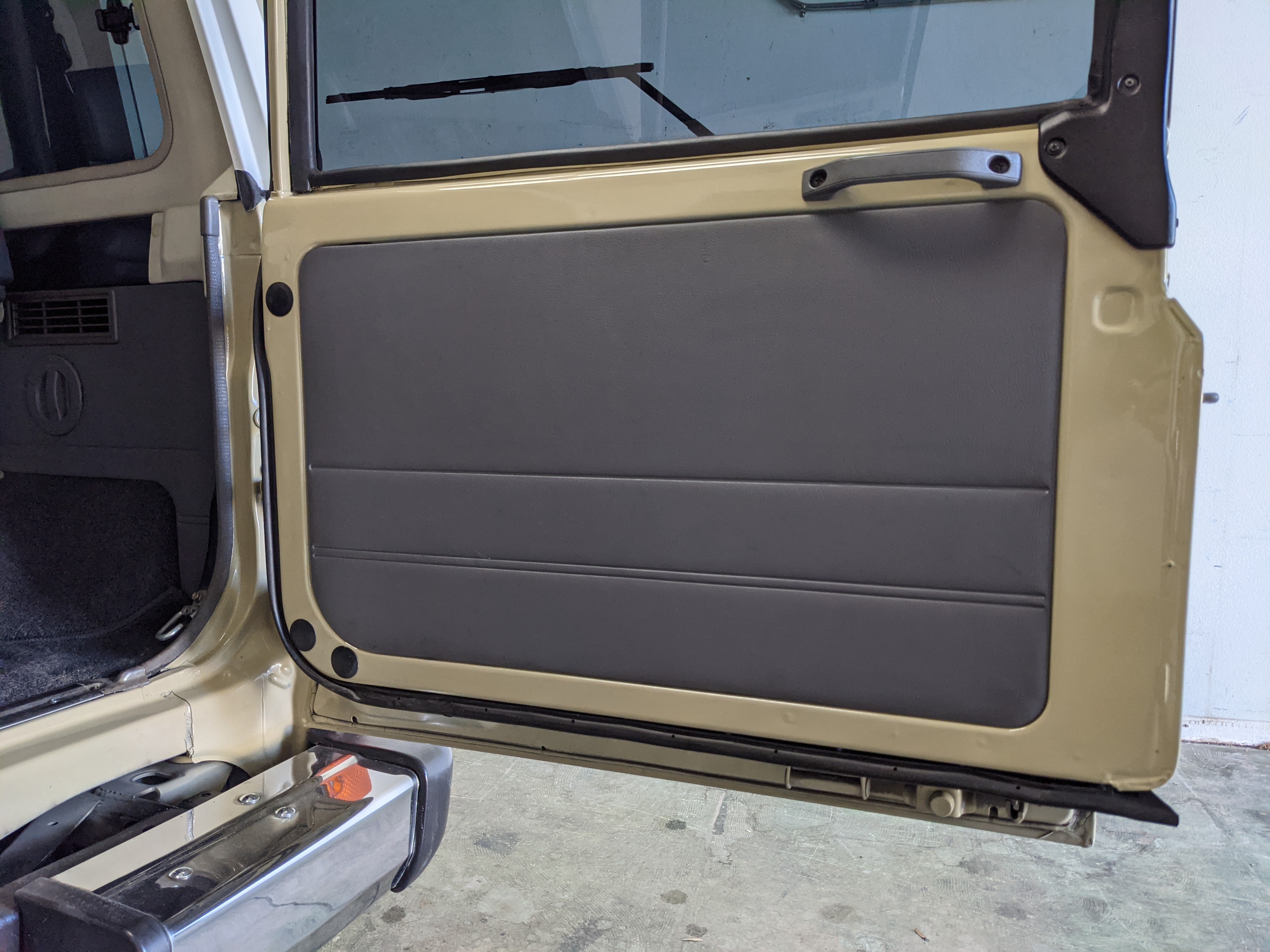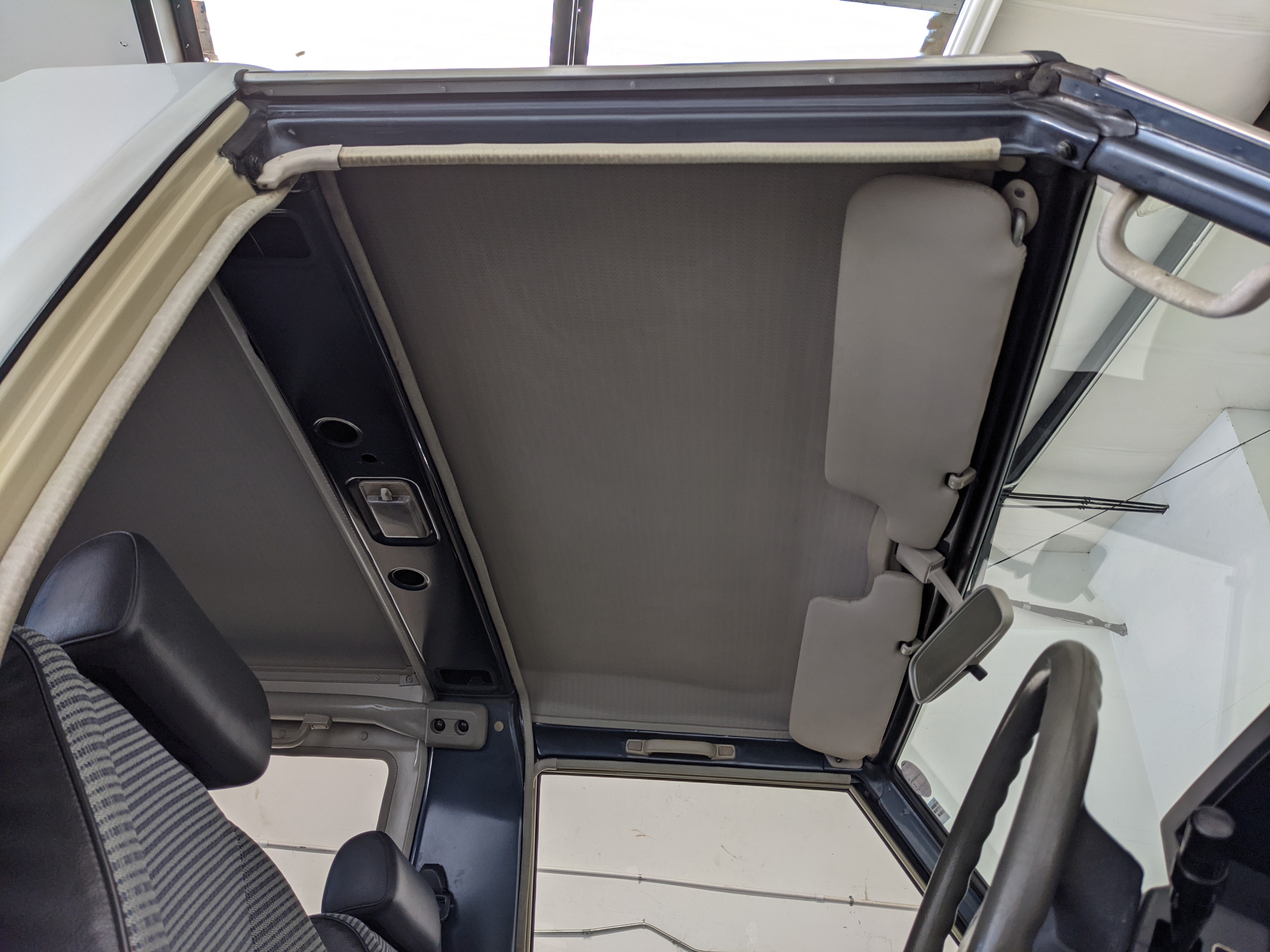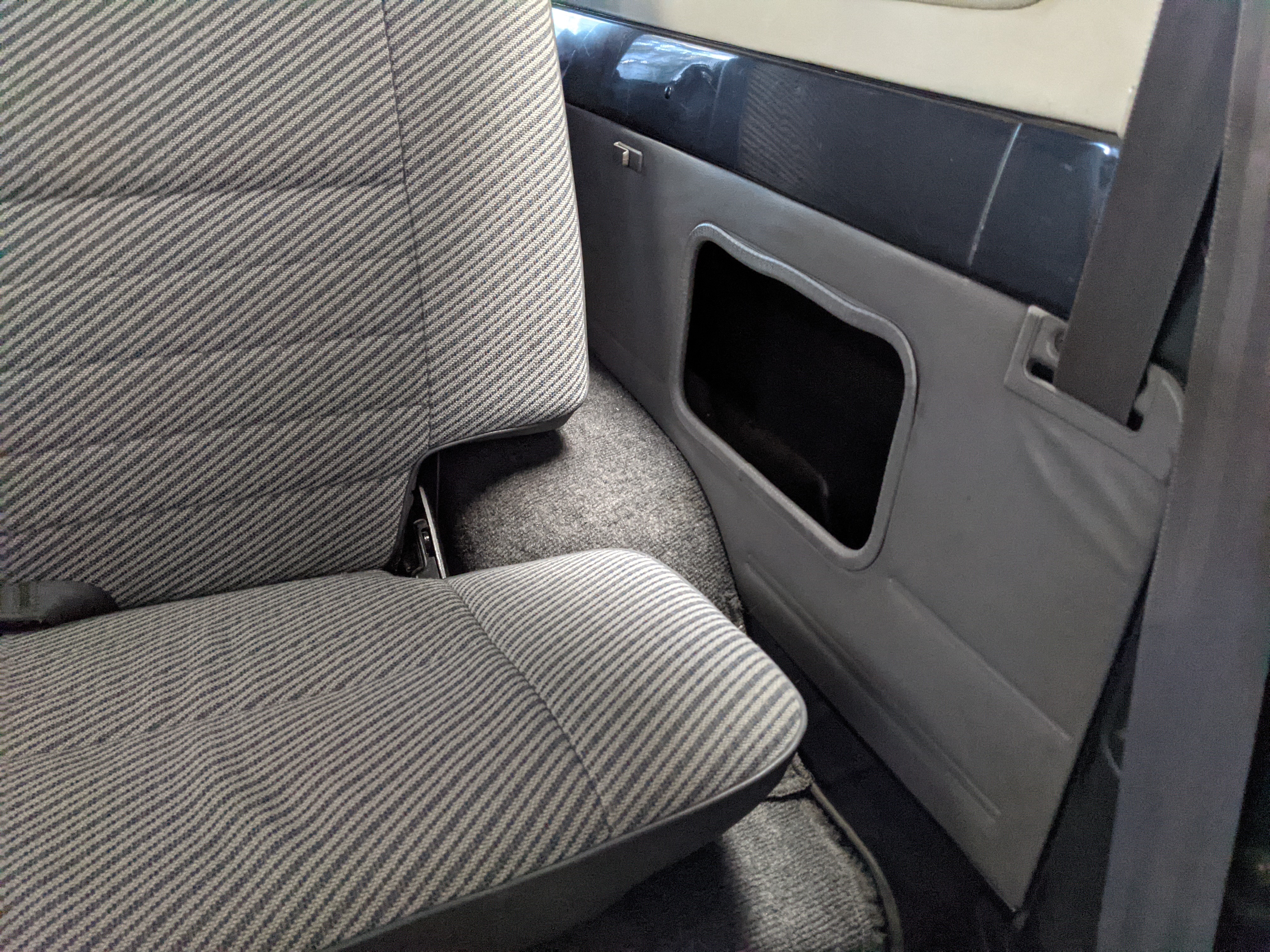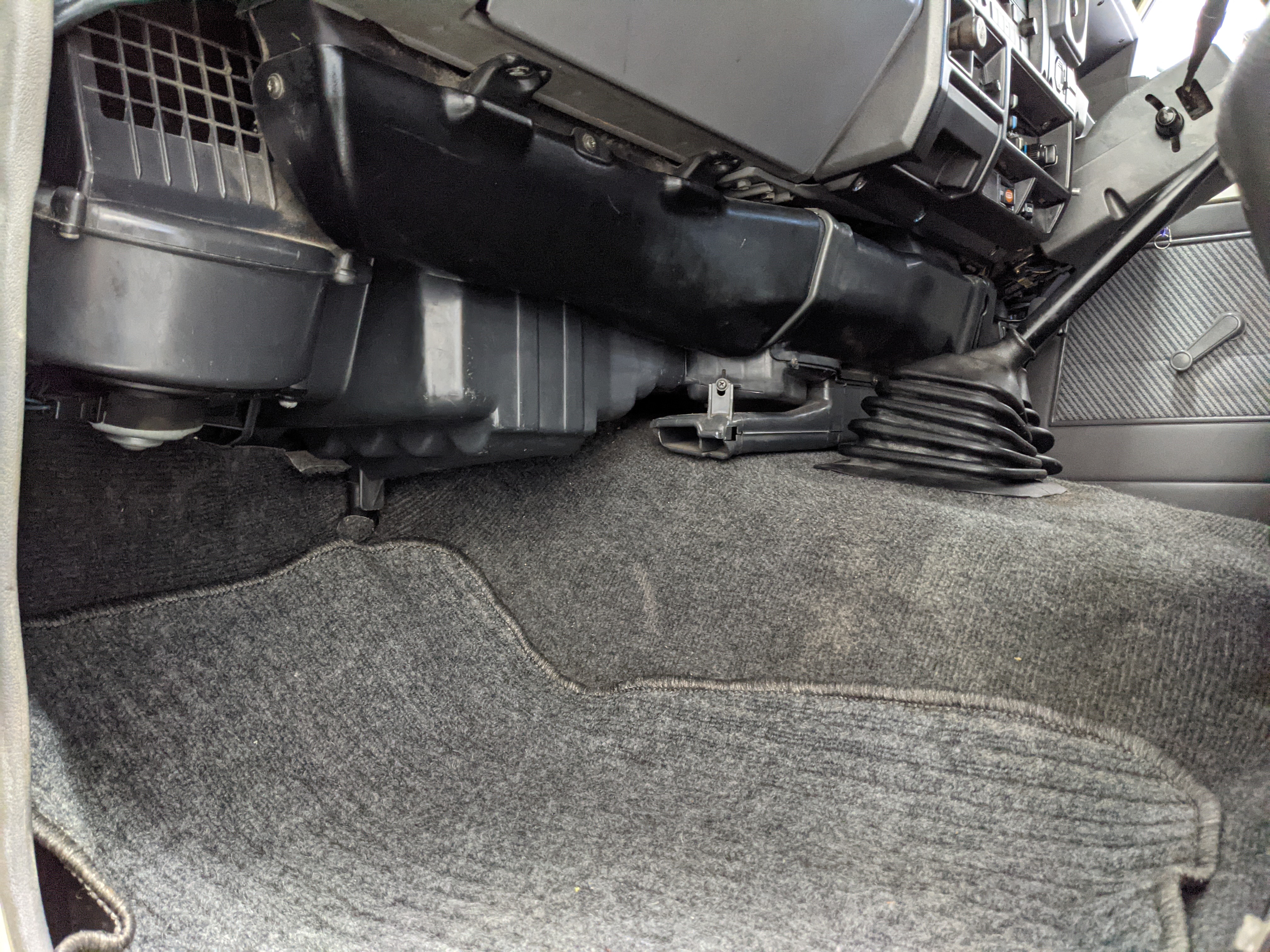 Interior is clear, comfortable and functional. Three pedals by your feet and a tall 5 speed lever sticking out of the transmission tunnel is arguably what makes this Cruiser even more special. Original head unit sits above the AC and heat controls. The air conditioning works perfectly. Down by the base of the transmission lever is your low-range selector for 4WD. The FRP Cruisers end up with a significant extra amount of room behind the rear seats compared to a true short-wheelbase model. Factory original roll bar sticks off the rear wheel wells to make up for the fact that the FRP top can be removed.