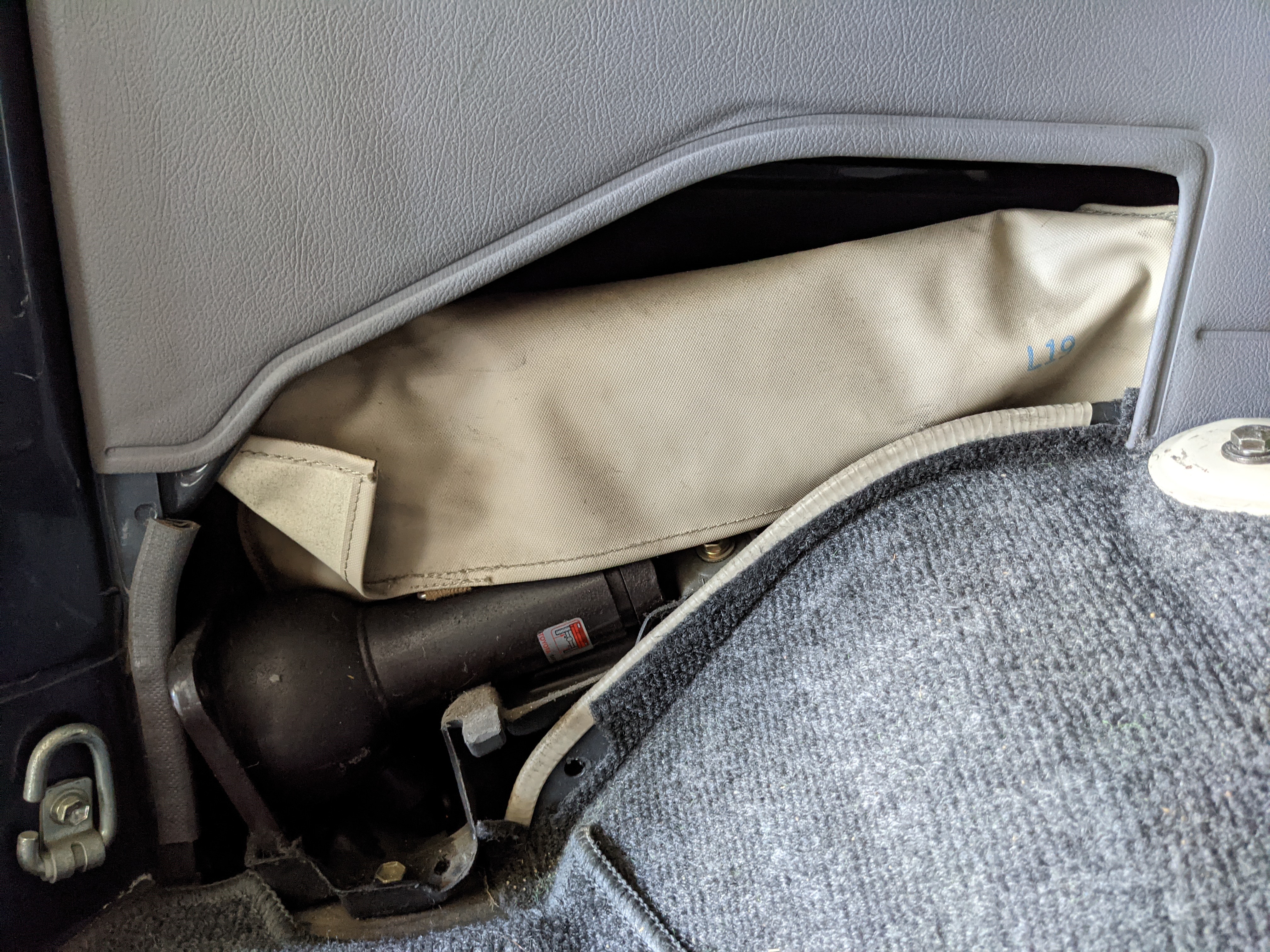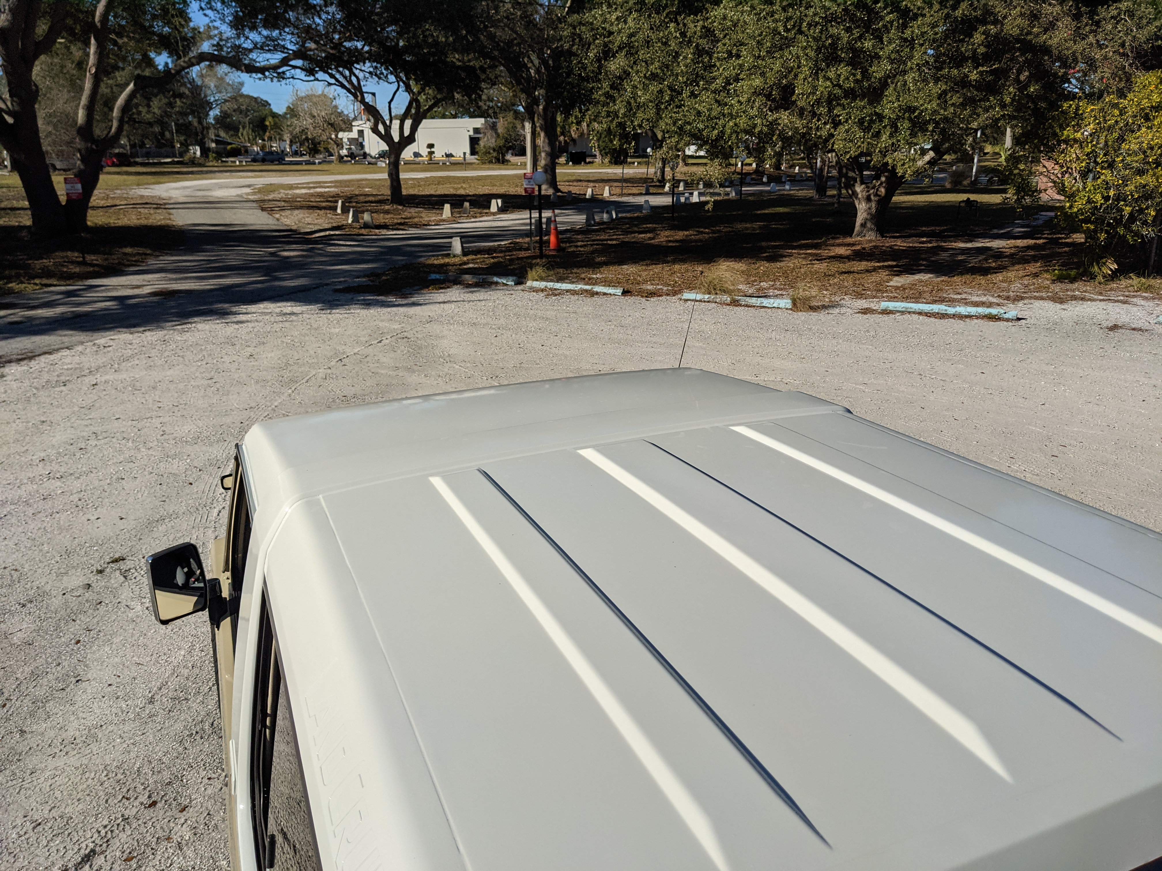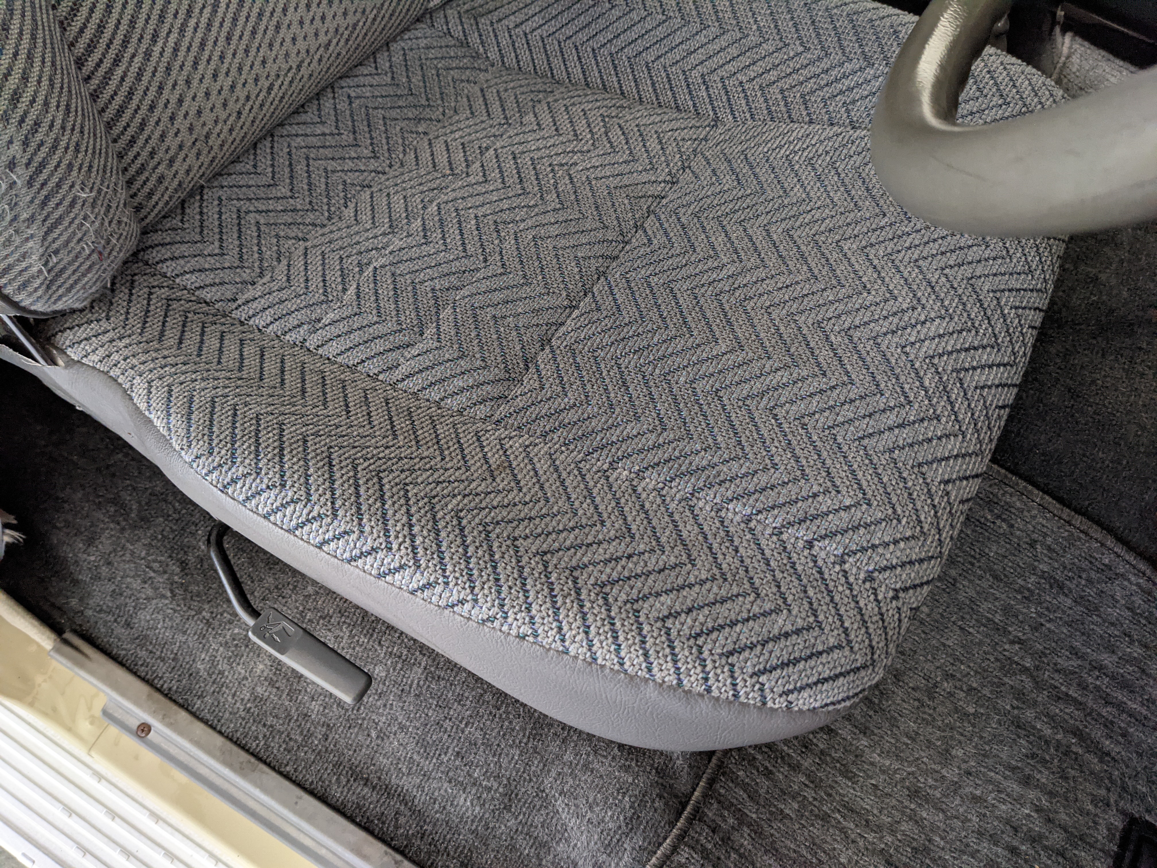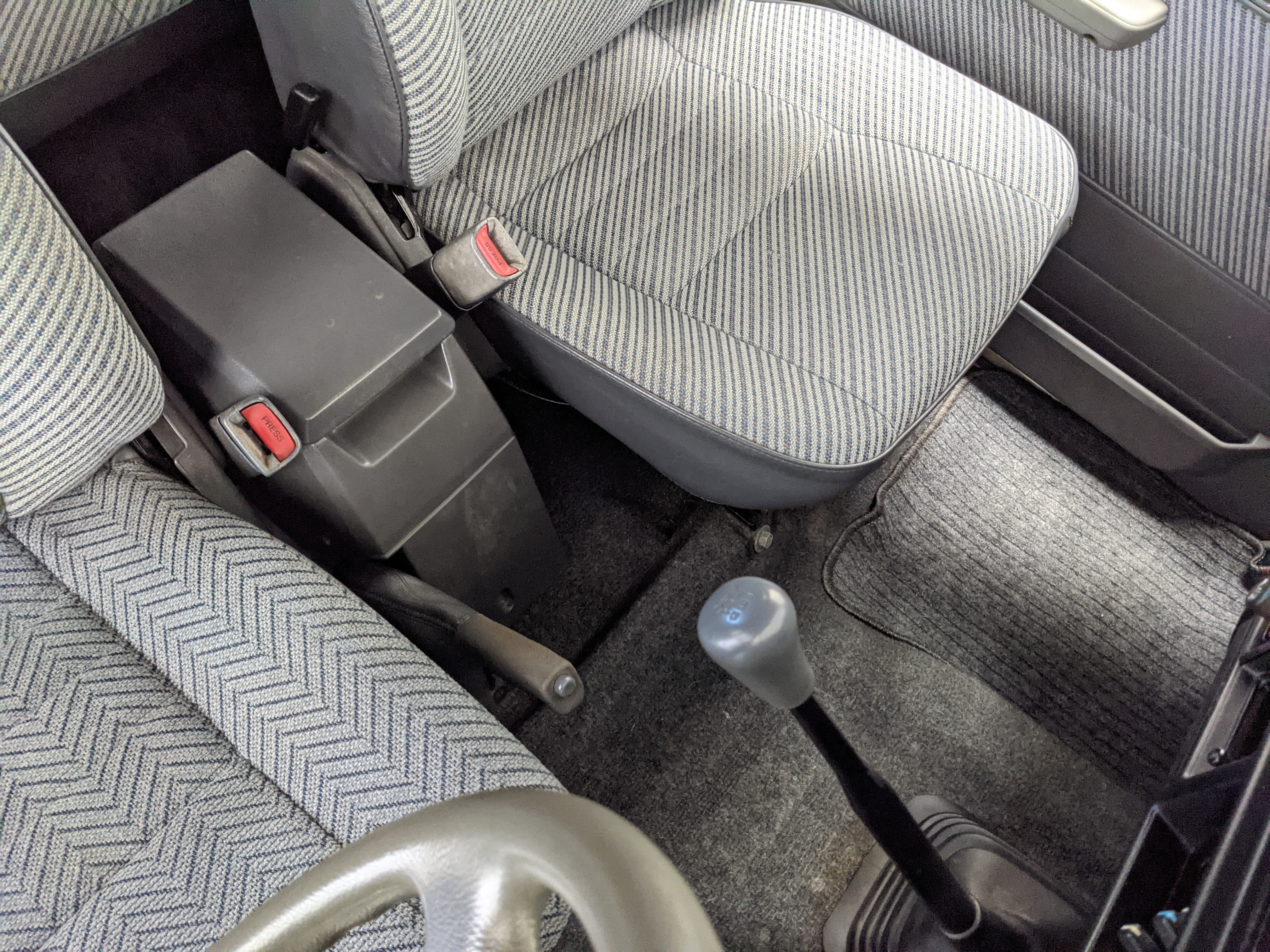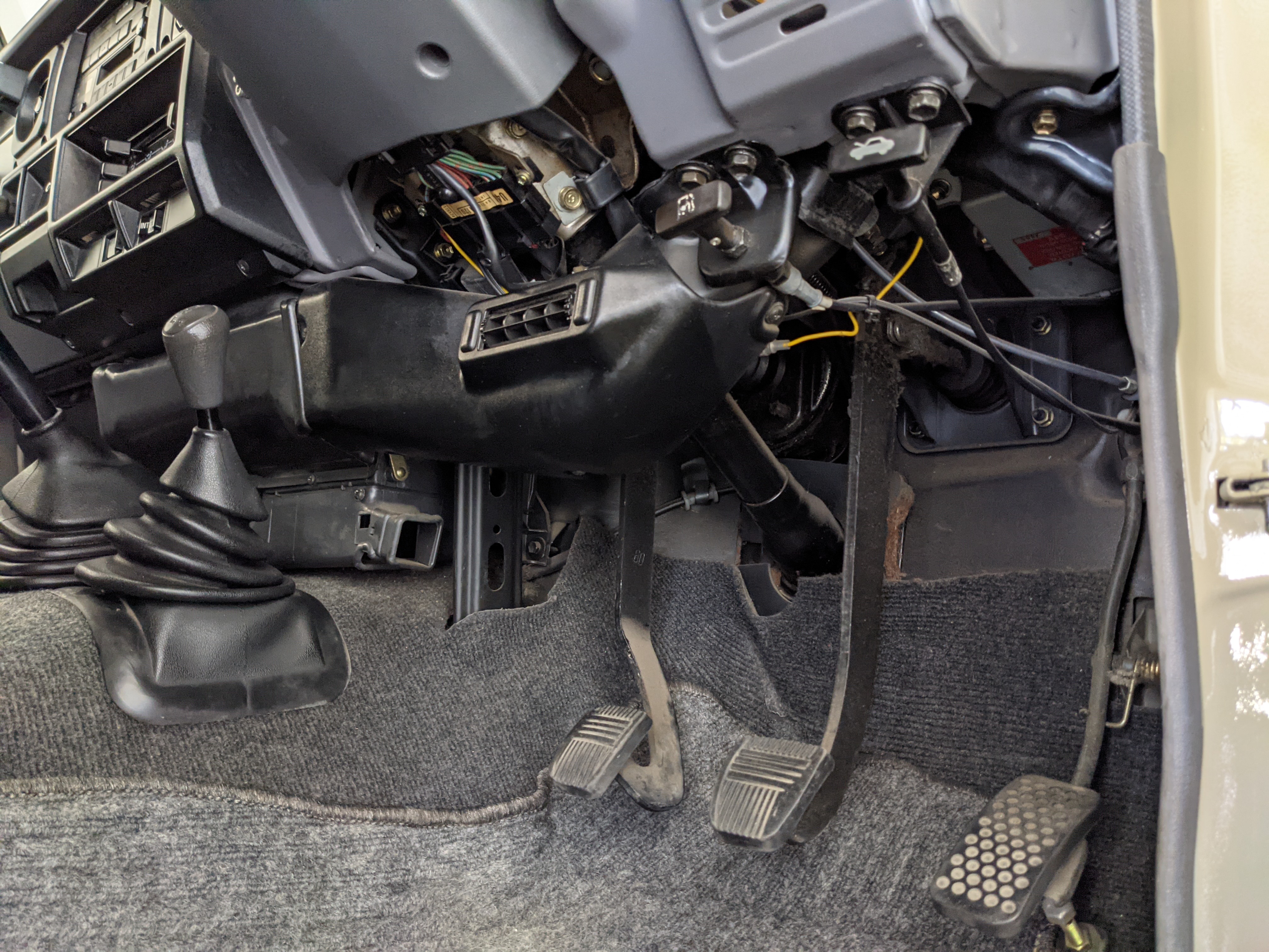 Interior is clear, comfortable and functional. Three pedals by your feet and a tall 5 speed lever sticking out of the transmission tunnel is arguably what makes this Cruiser even more special. Original head unit sits above the AC and heat controls. The air conditioning works perfectly. Down by the base of the transmission lever is your low-range selector for 4WD. The FRP Cruisers end up with a significant extra amount of room behind the rear seats compared to a true short-wheelbase model. Factory original roll bar sticks off the rear wheel wells to make up for the fact that the FRP top can be removed.